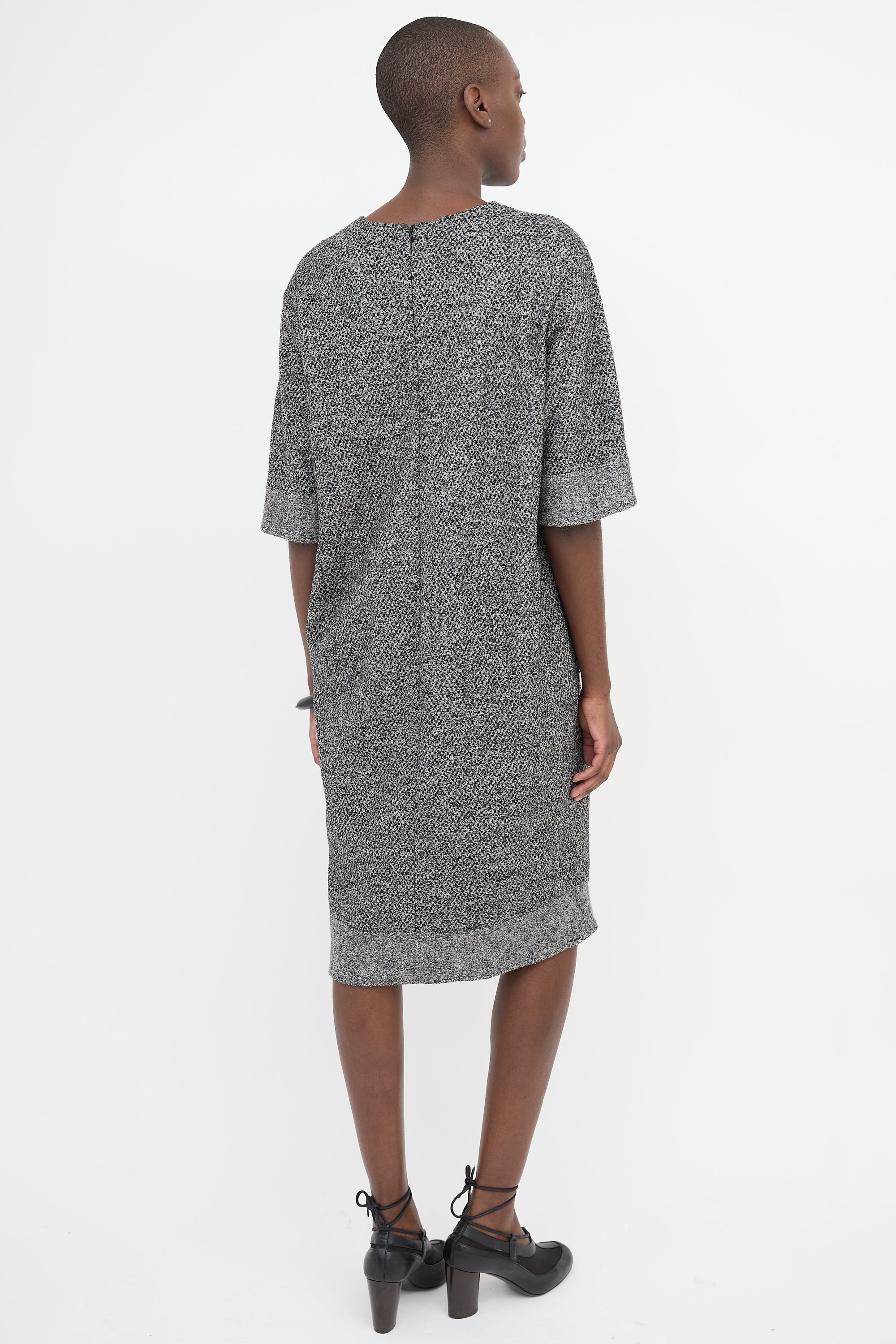 Pre-owned Jil Sander black and white wool boucle dress featuring a round neckline, two inseam pockets at hip, back zip closure, and half sleeves.