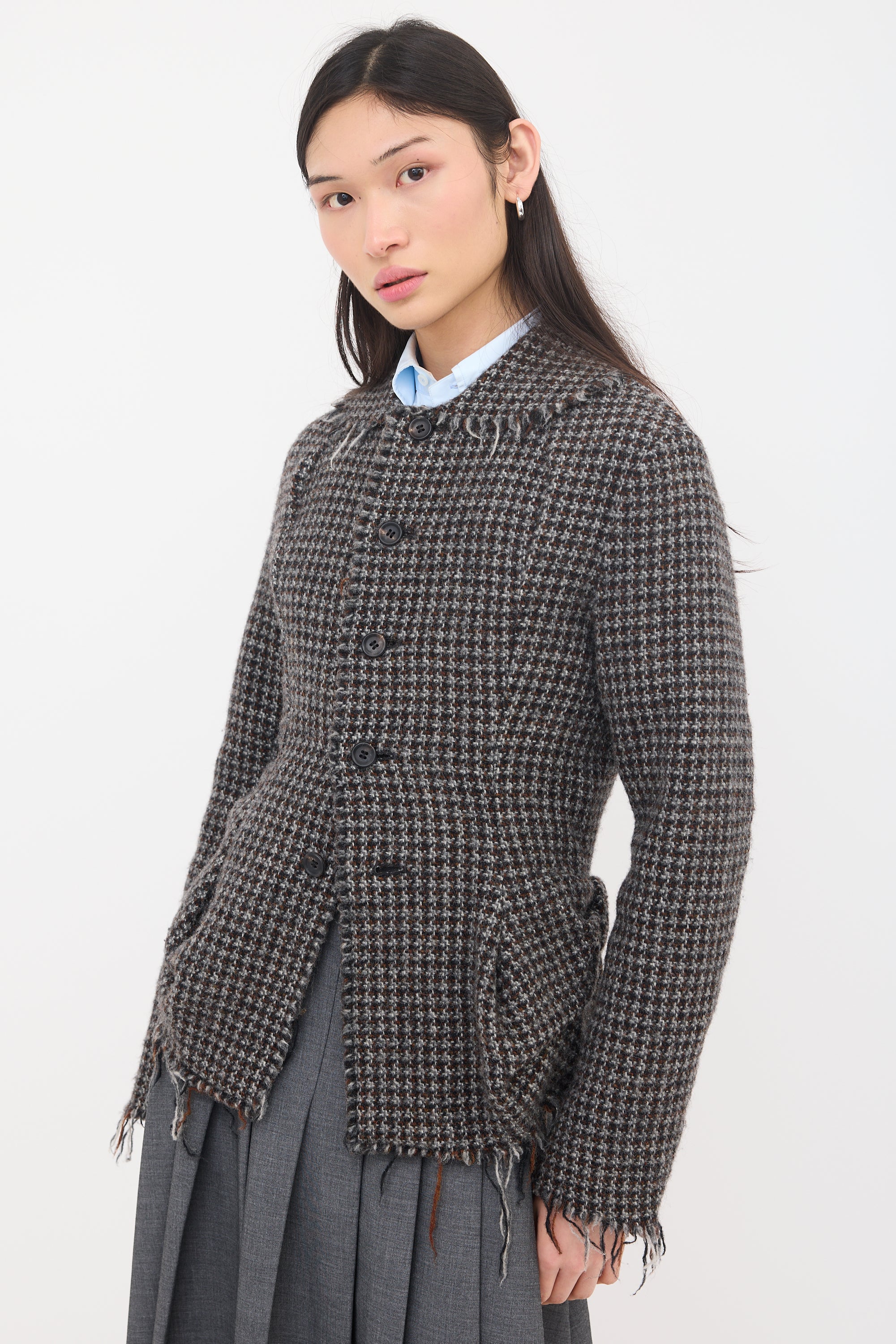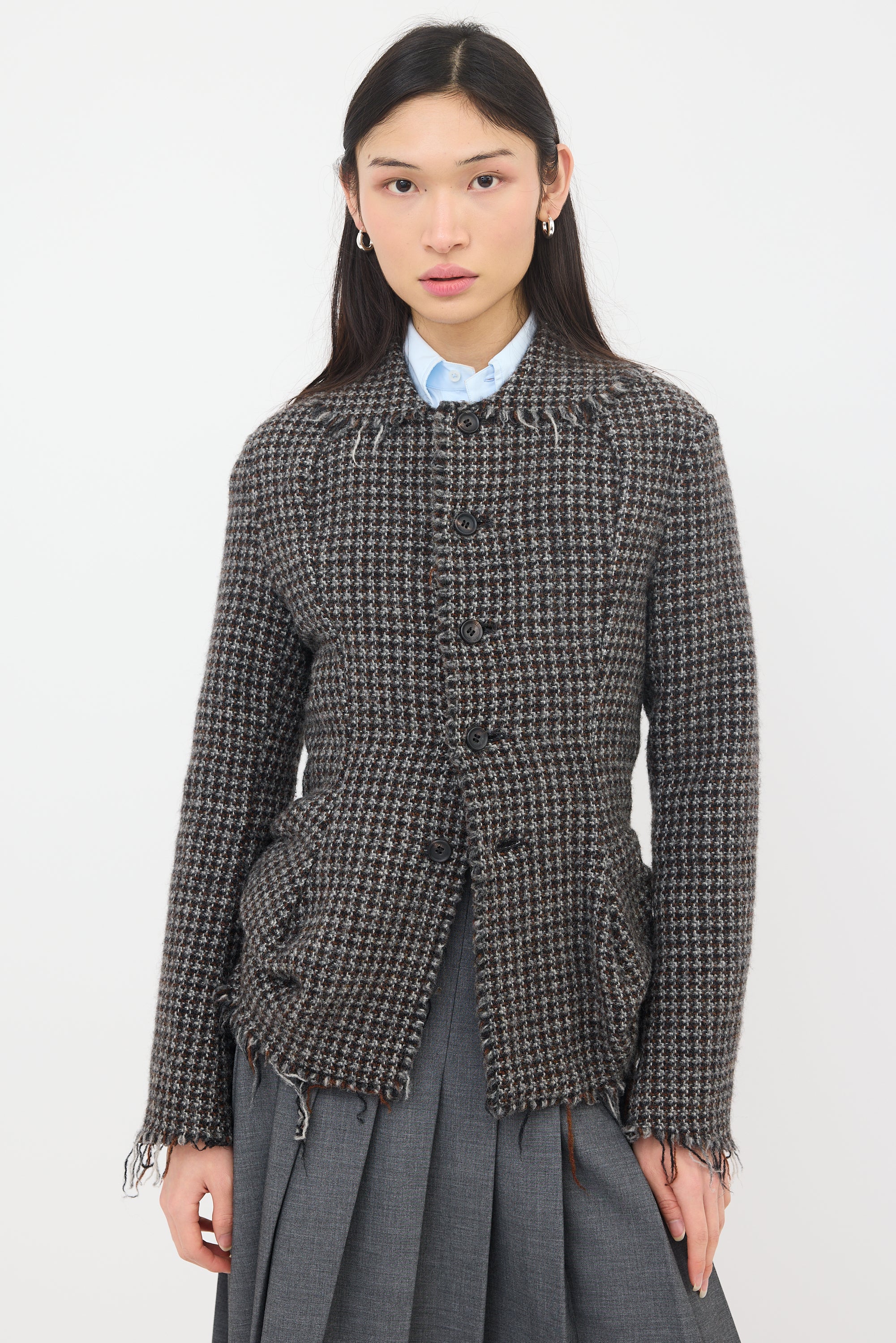 Pre-owned Fall Winter 2003 Junya Watanabe Comme des Garçons brown and grey wool tweed jacket featuring a classic collar with a frayed edge, three button front, large bow detail at each hip, and a frayed edge hem and cuffs. Lined.