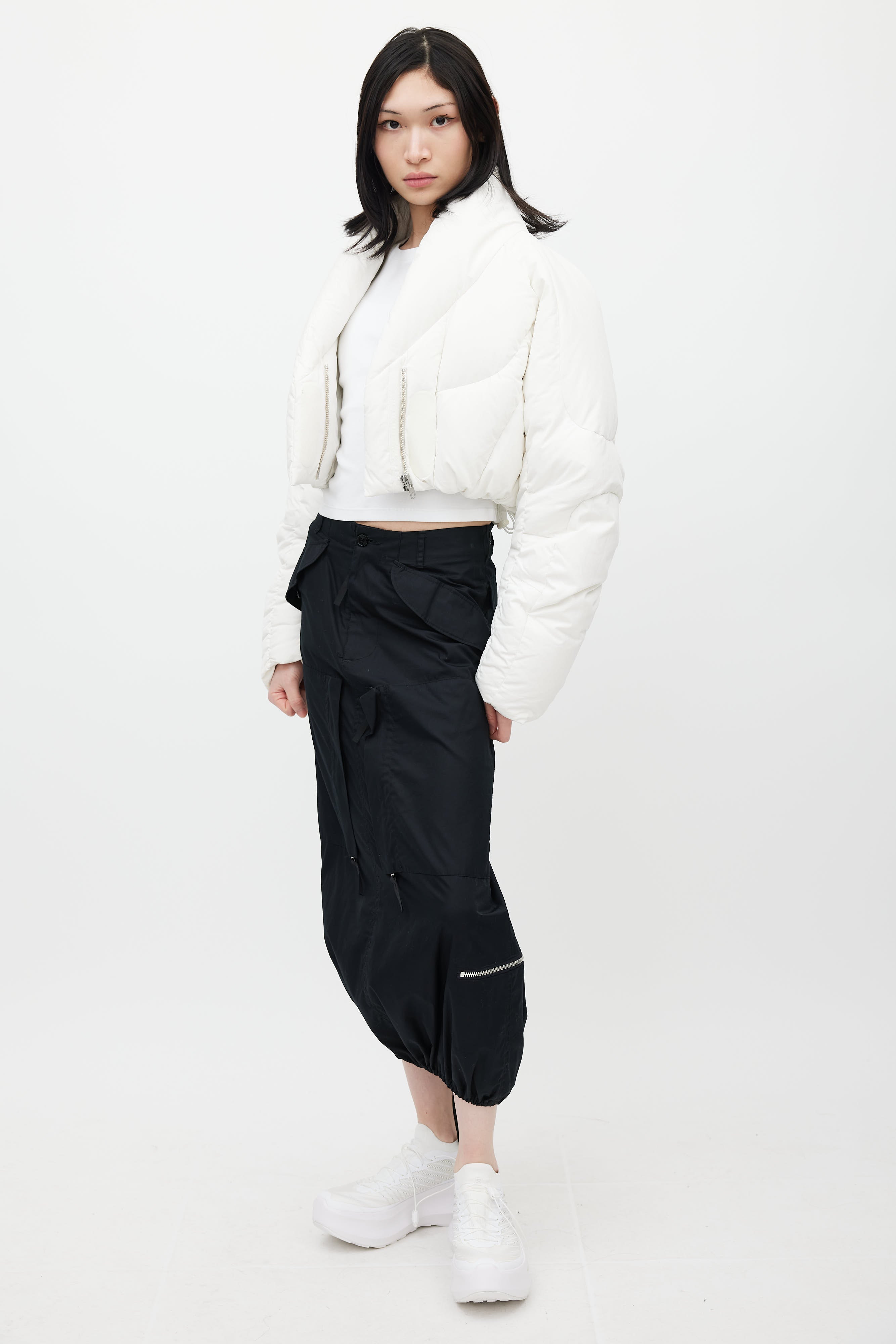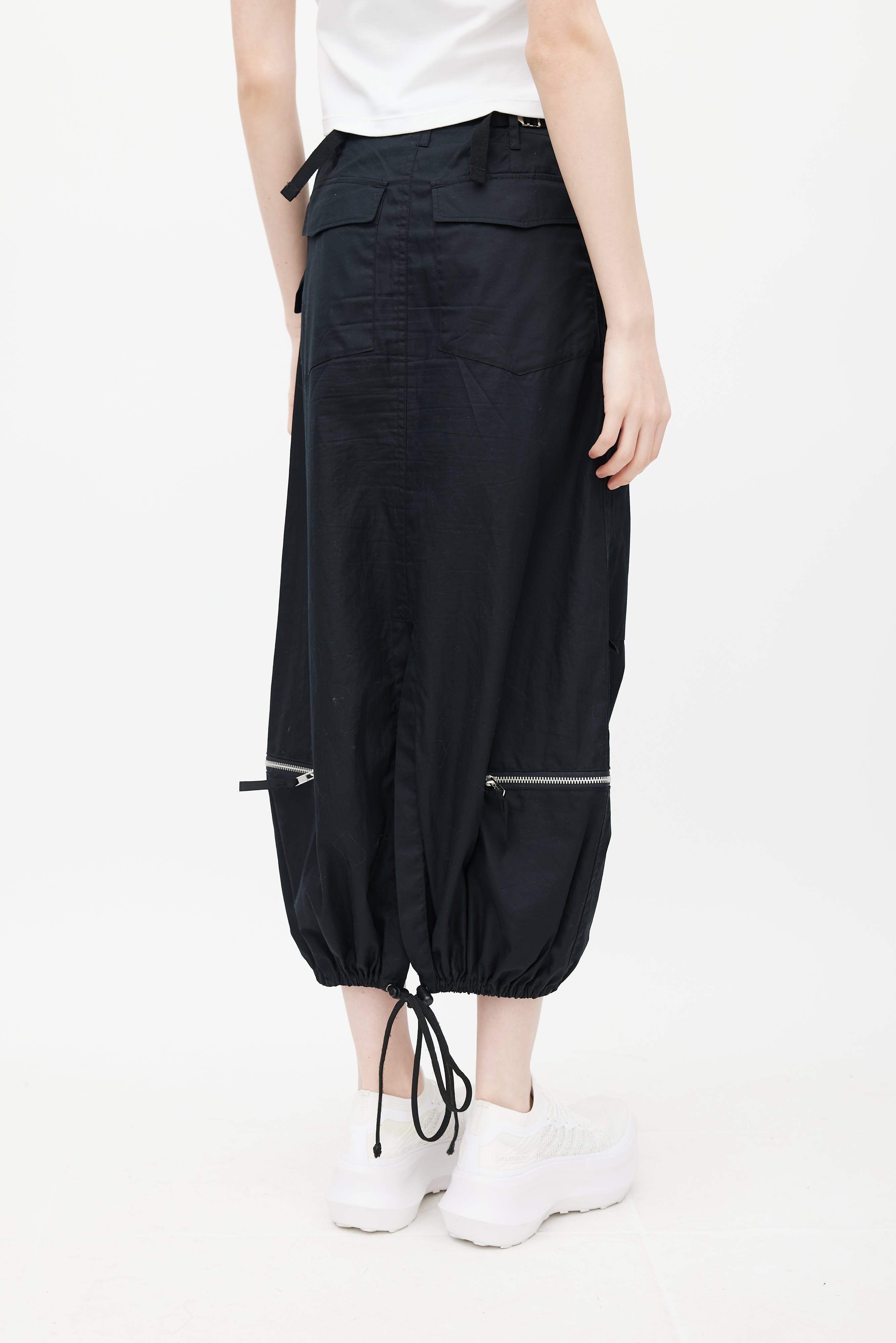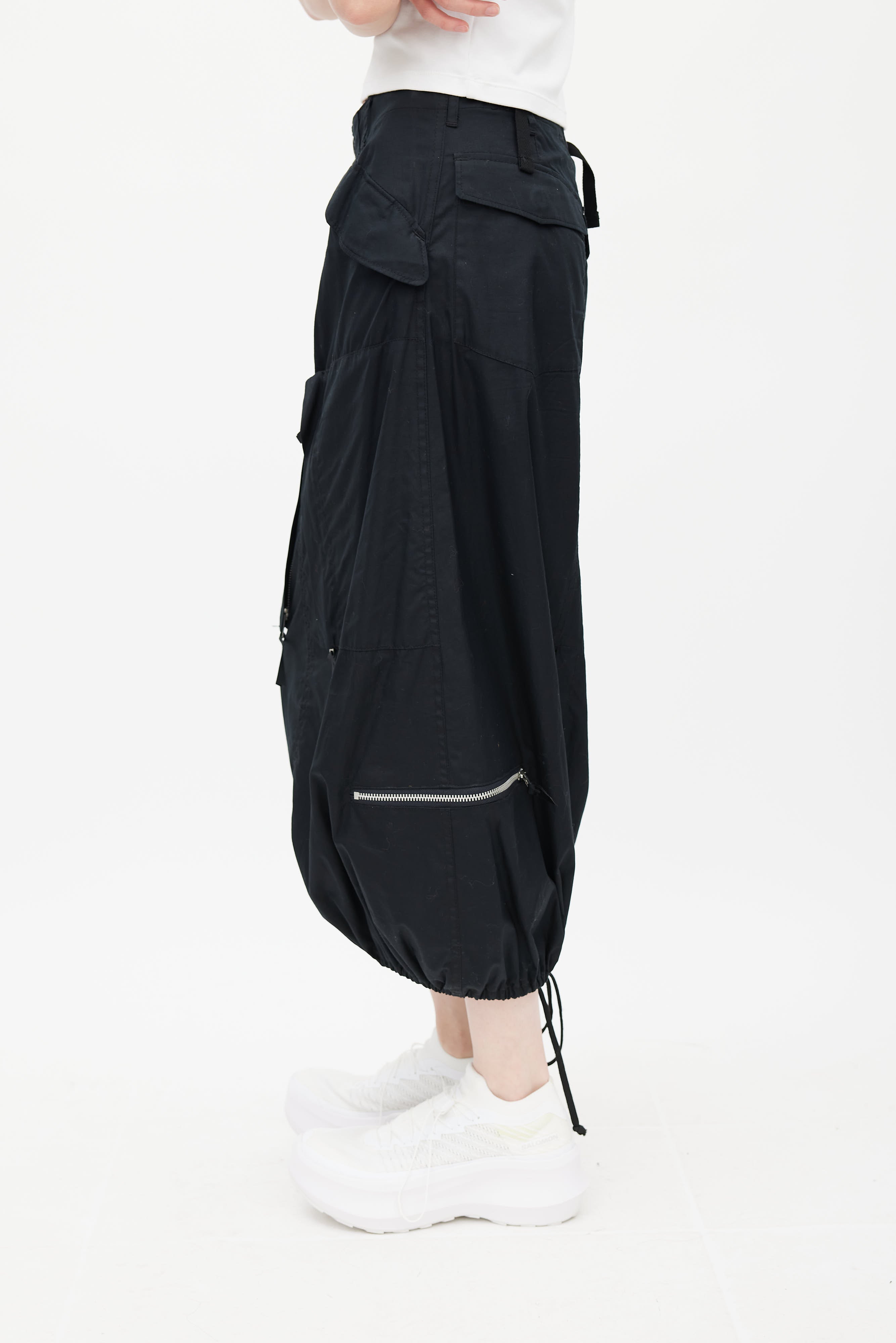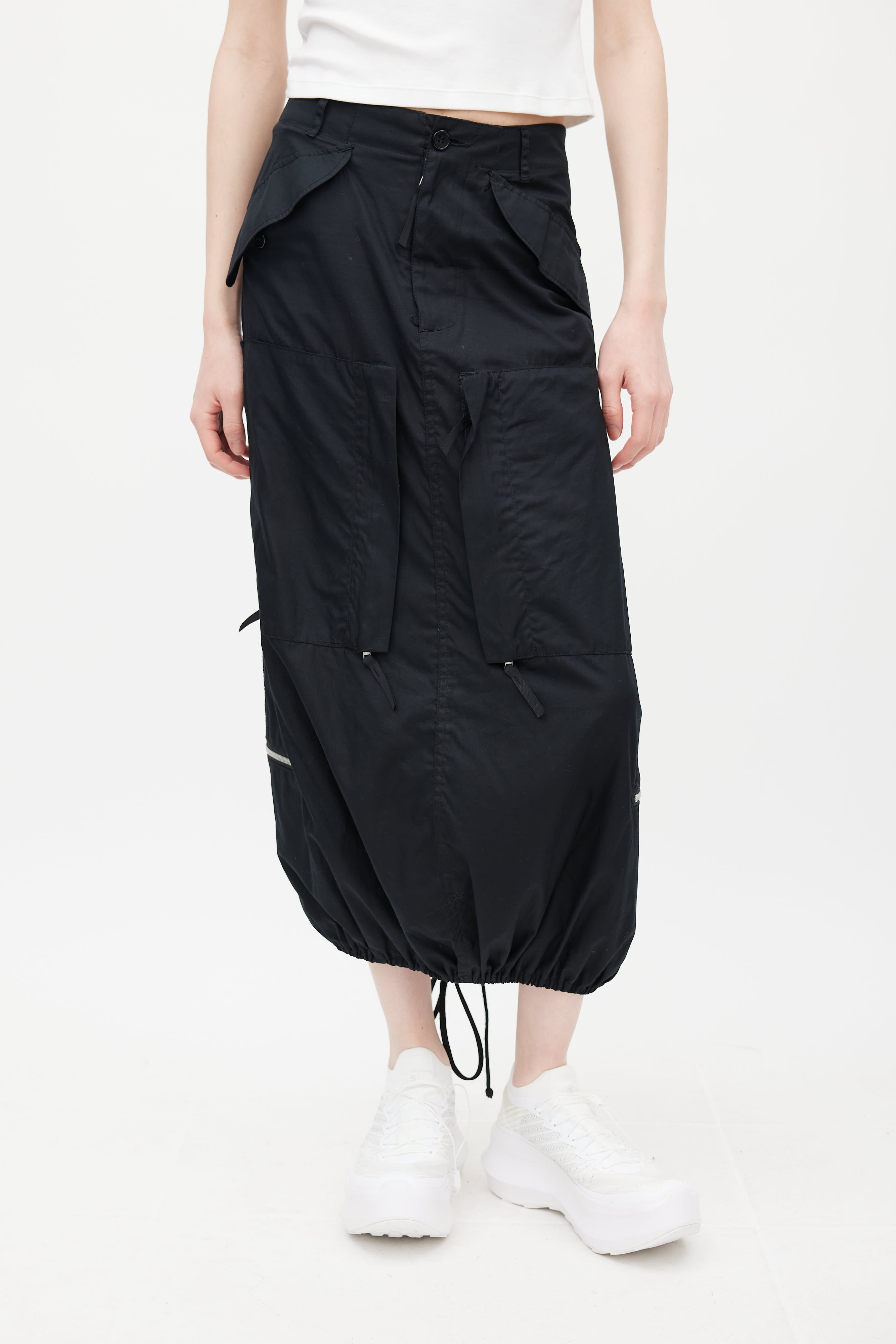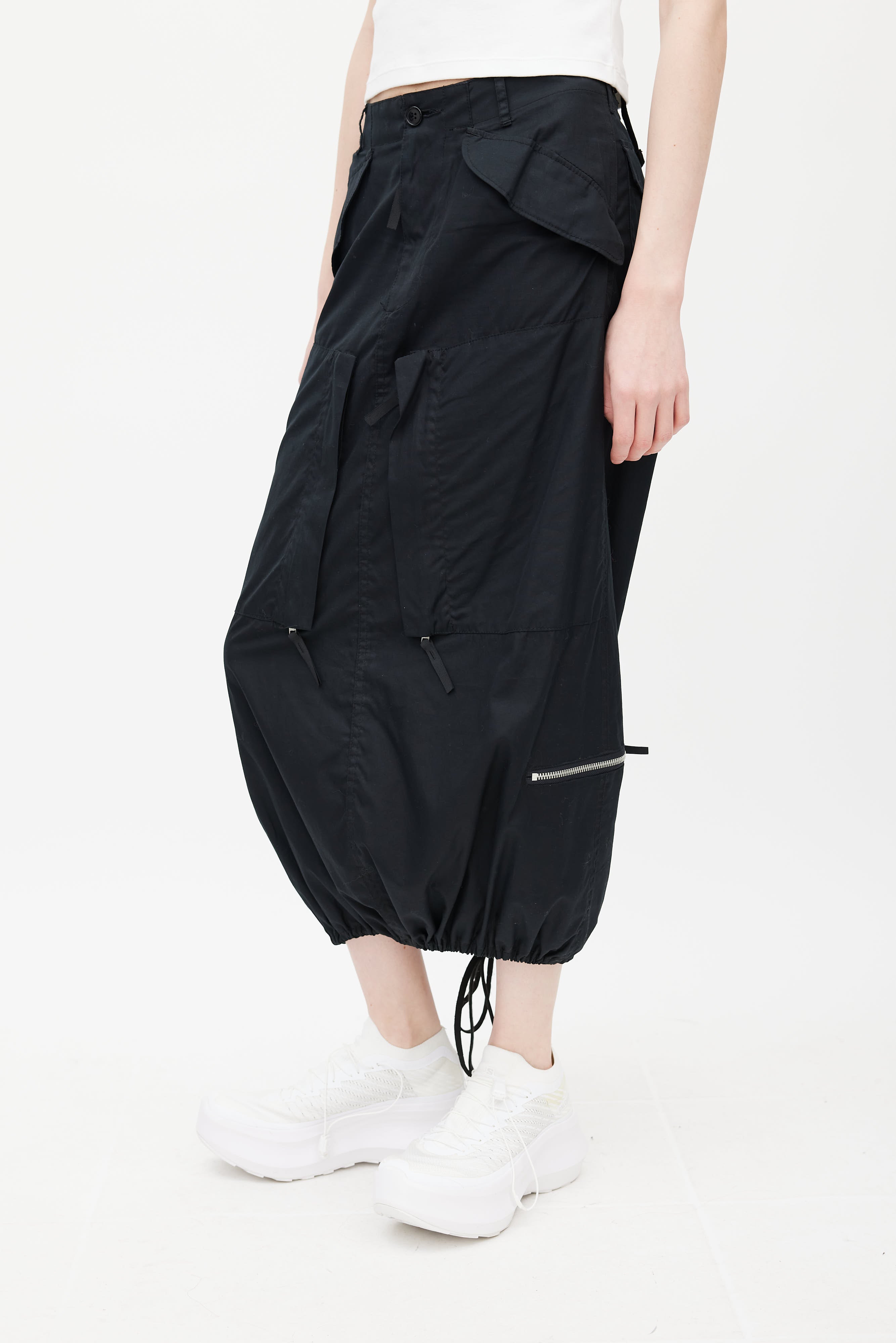 Pre-owned Junya Watanabe black skirt featuring two slip pockets at hip, two flap pockets at back, adjustable straps at waist, two cargo pockets at thigh, drawstring hem, two zip pockets at knee, and zip fly with button closure.