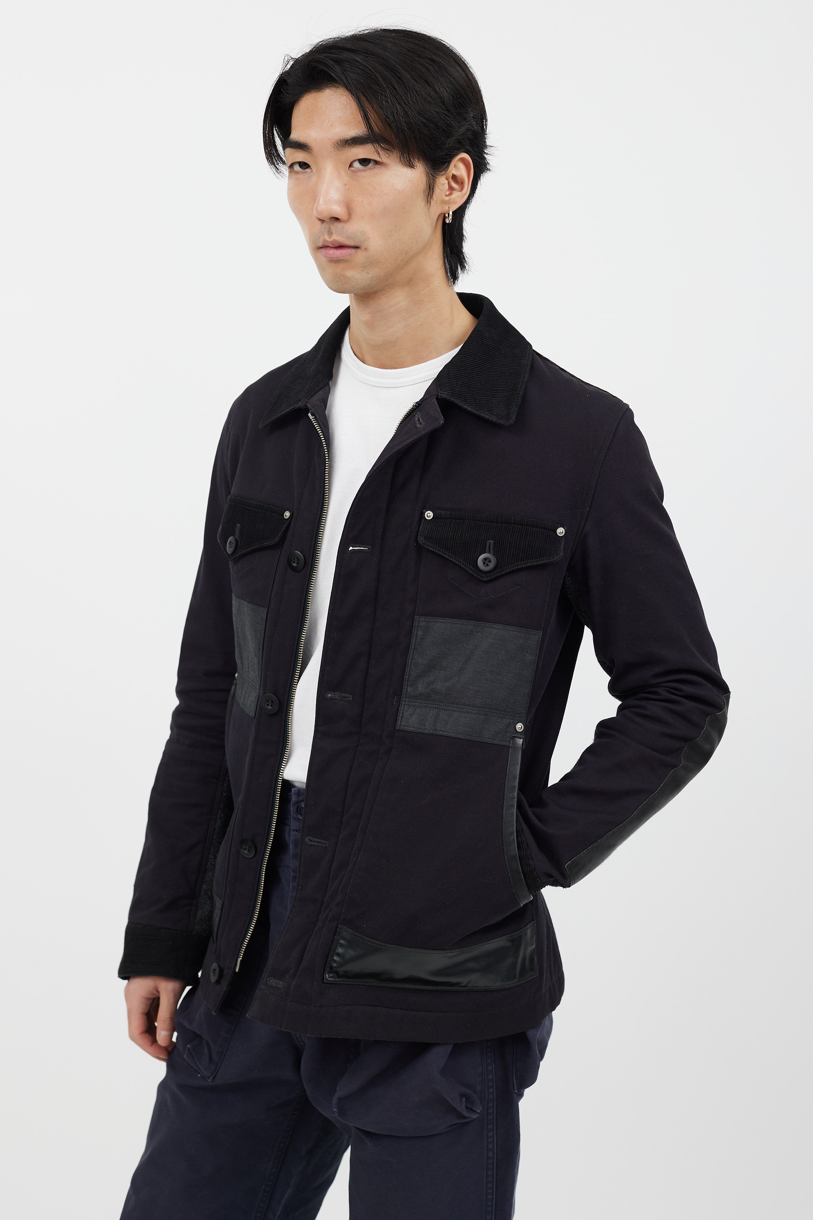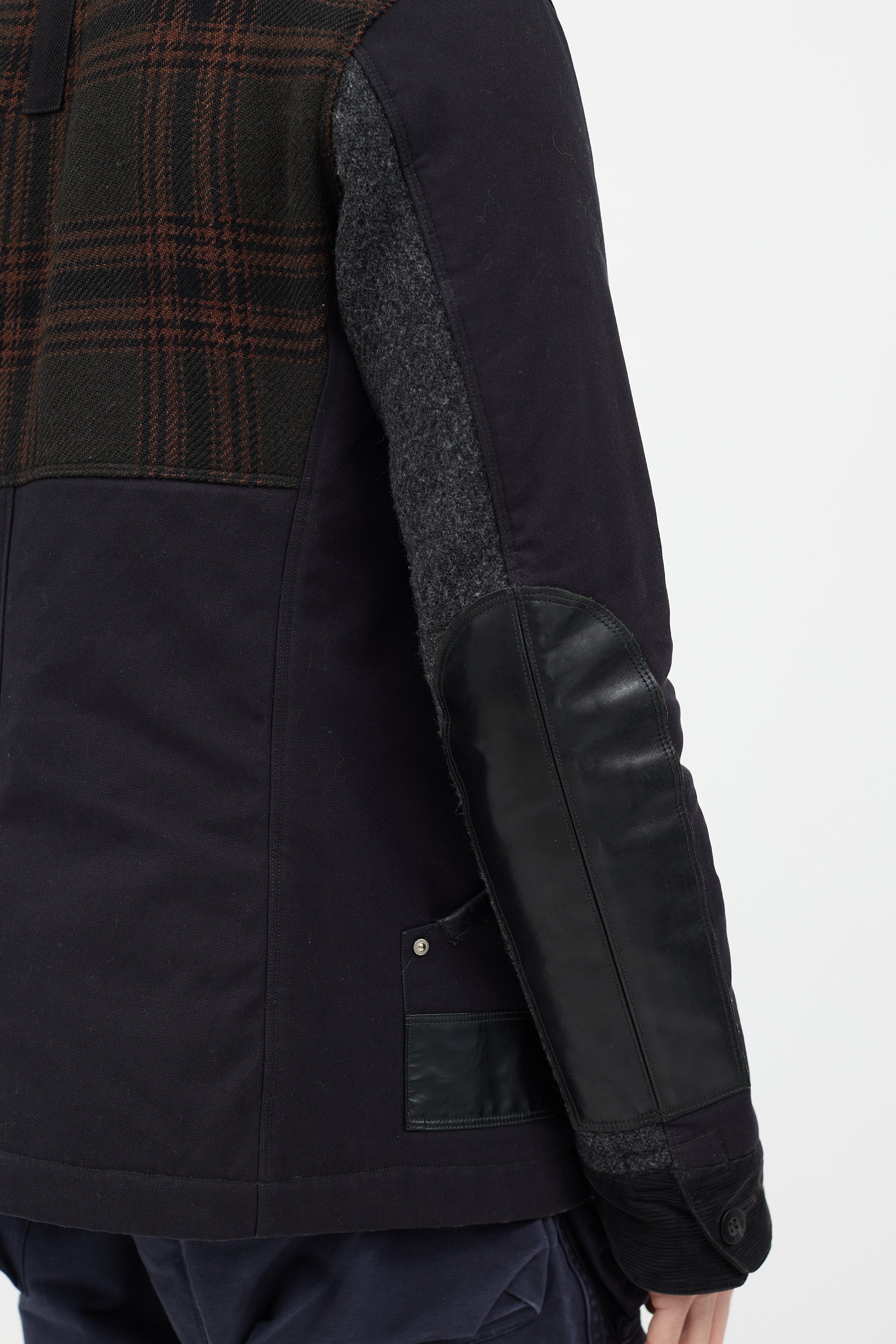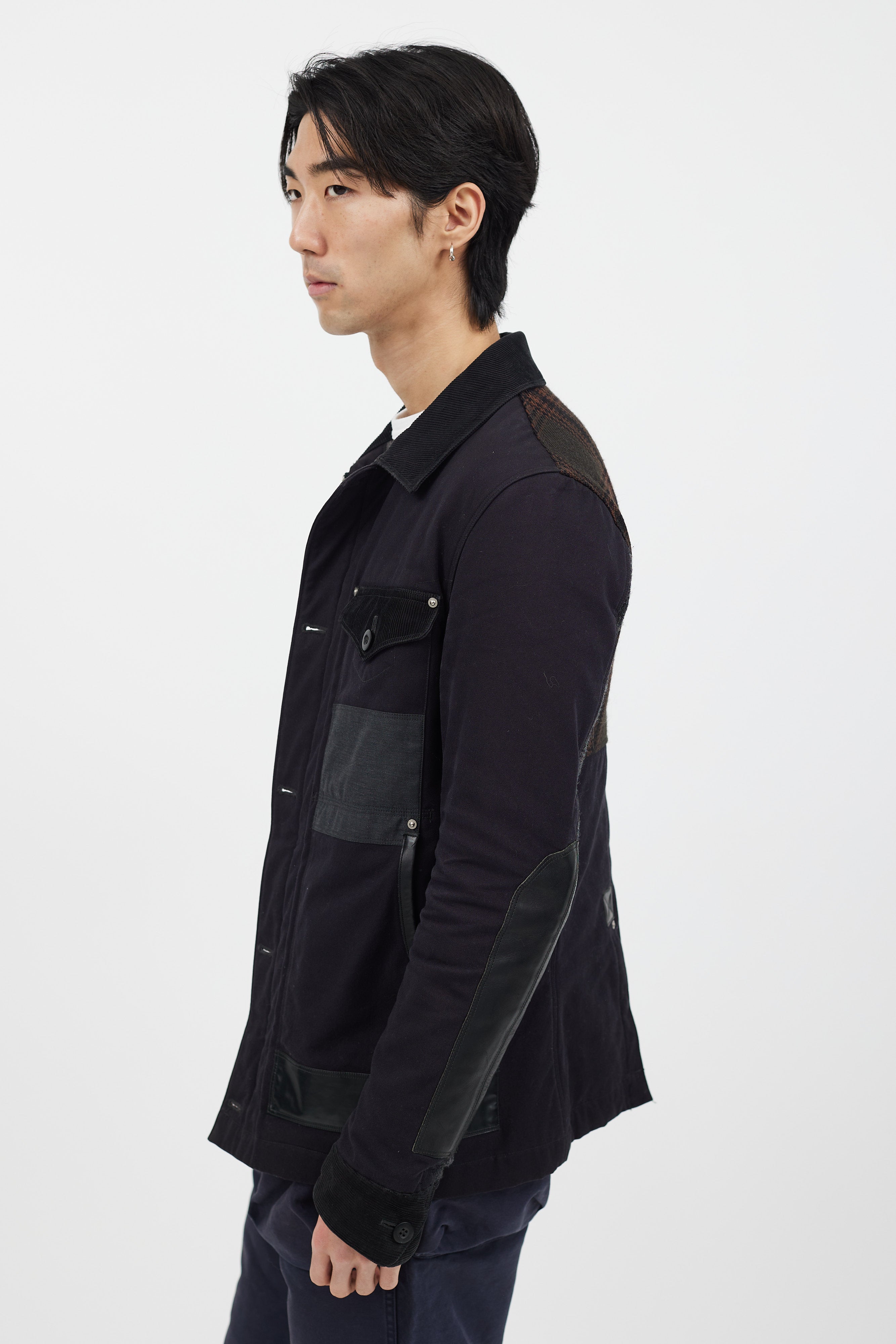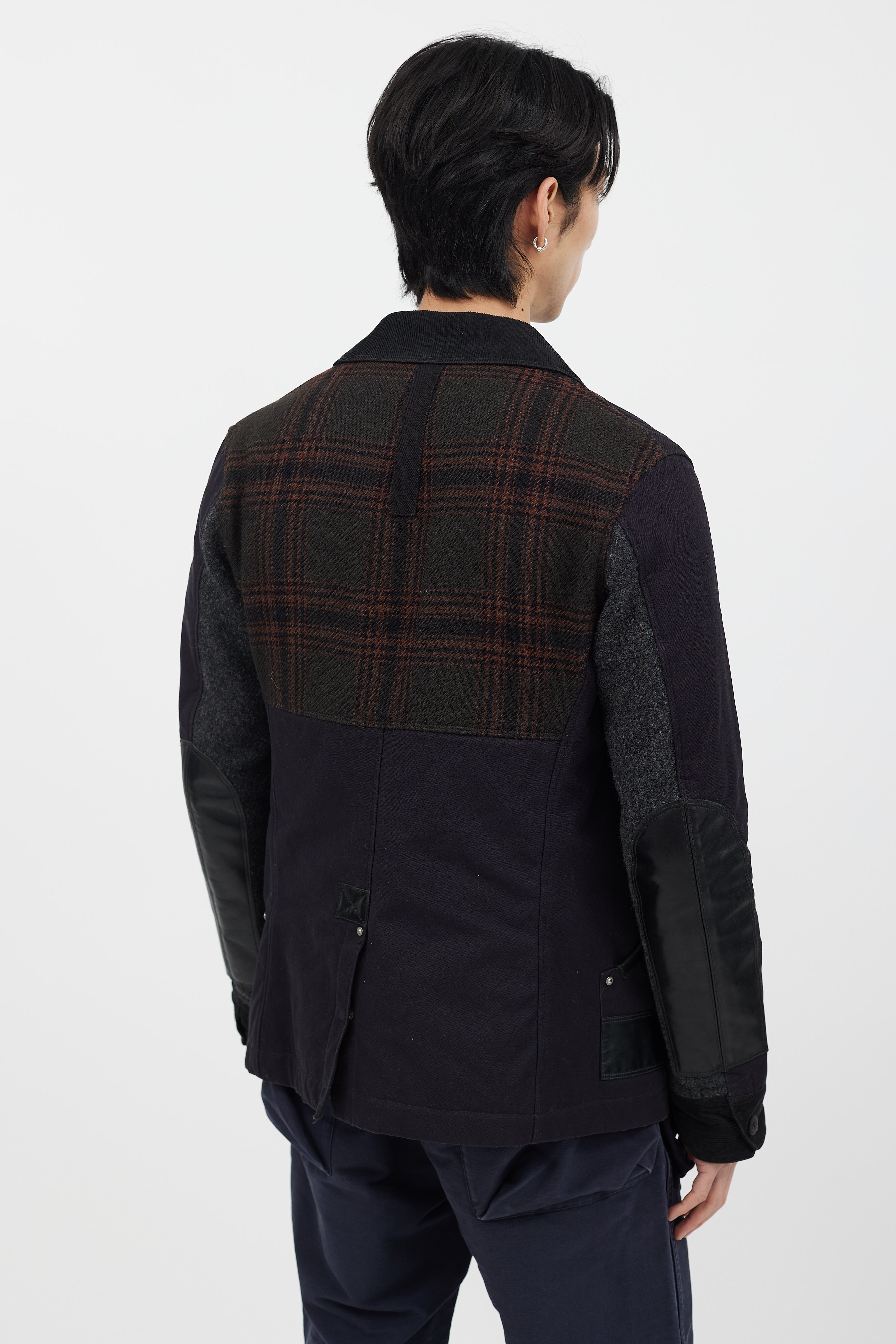Pre-owned Junya Watanabe black corduroy and knit jacket featuring corduroy collar, leather patches at arm, full front zip closure, two slip pockets at waist, two patch pockets at chest, and plaid knit patch at back.