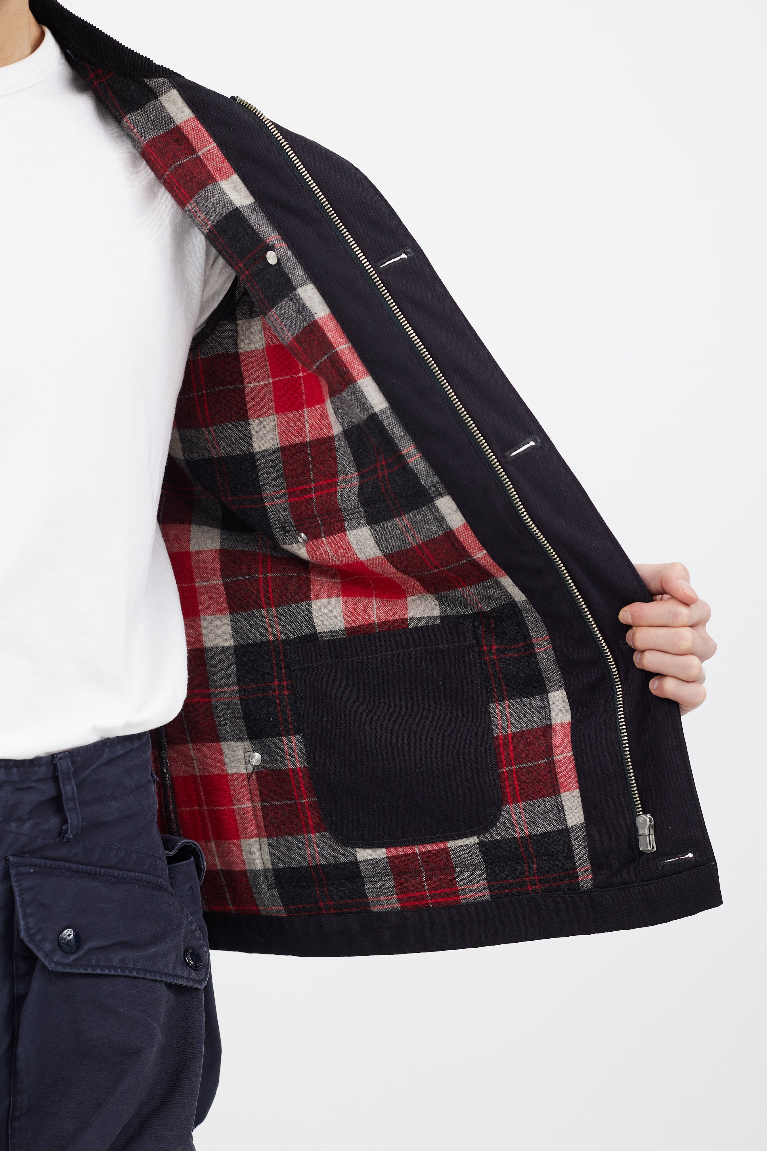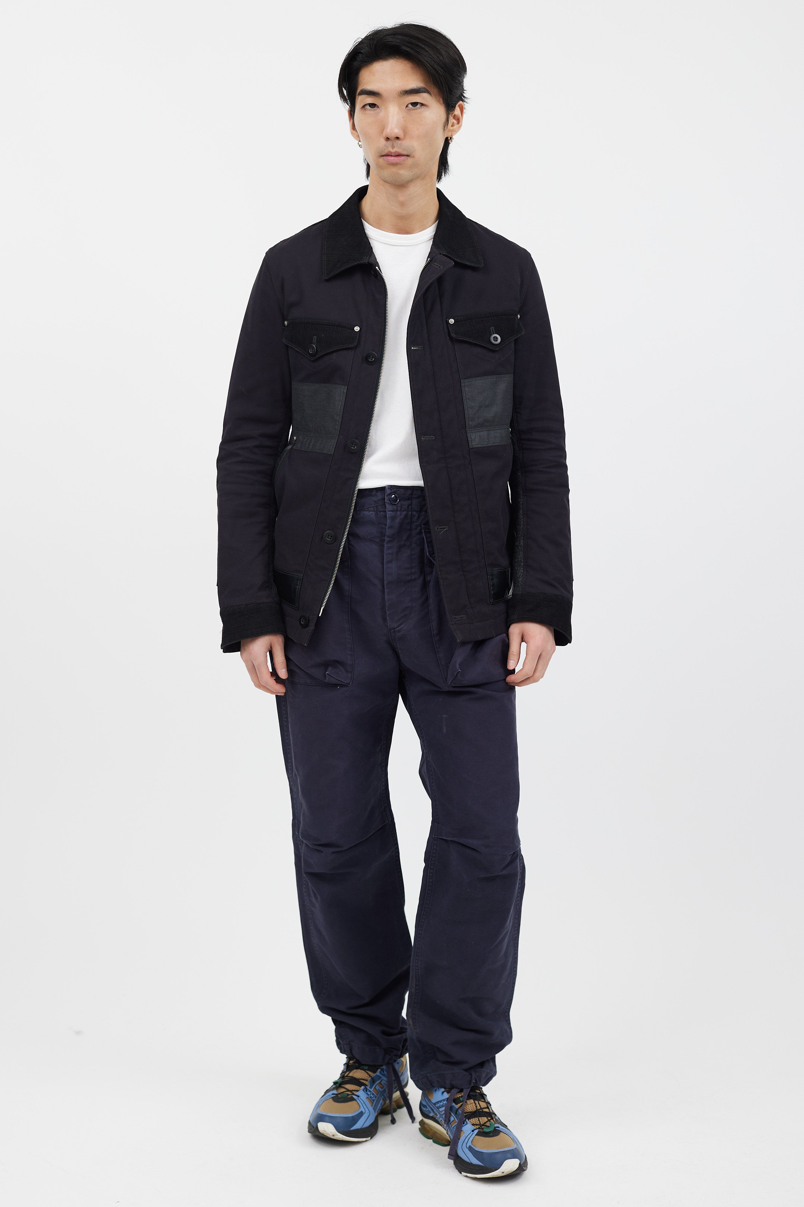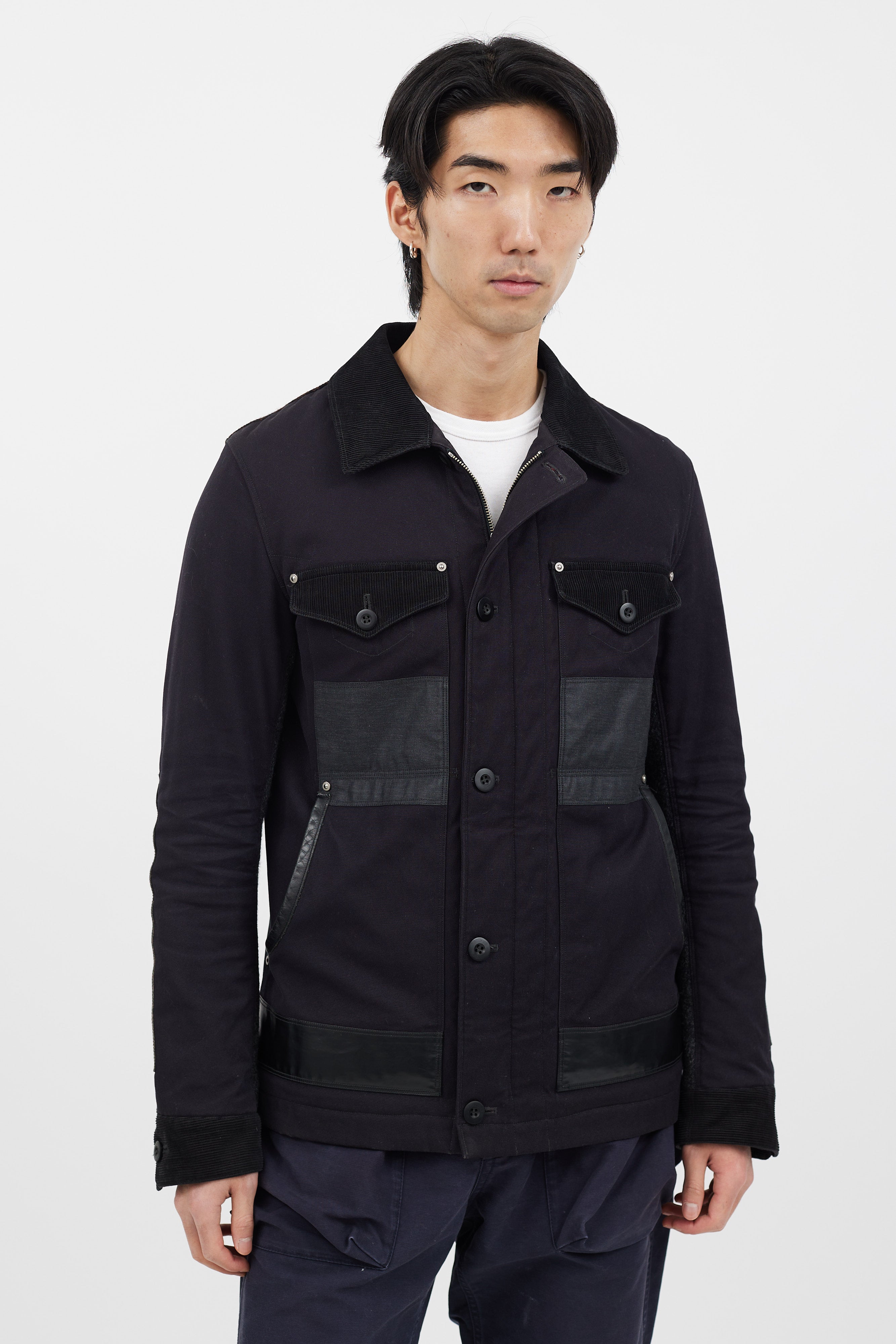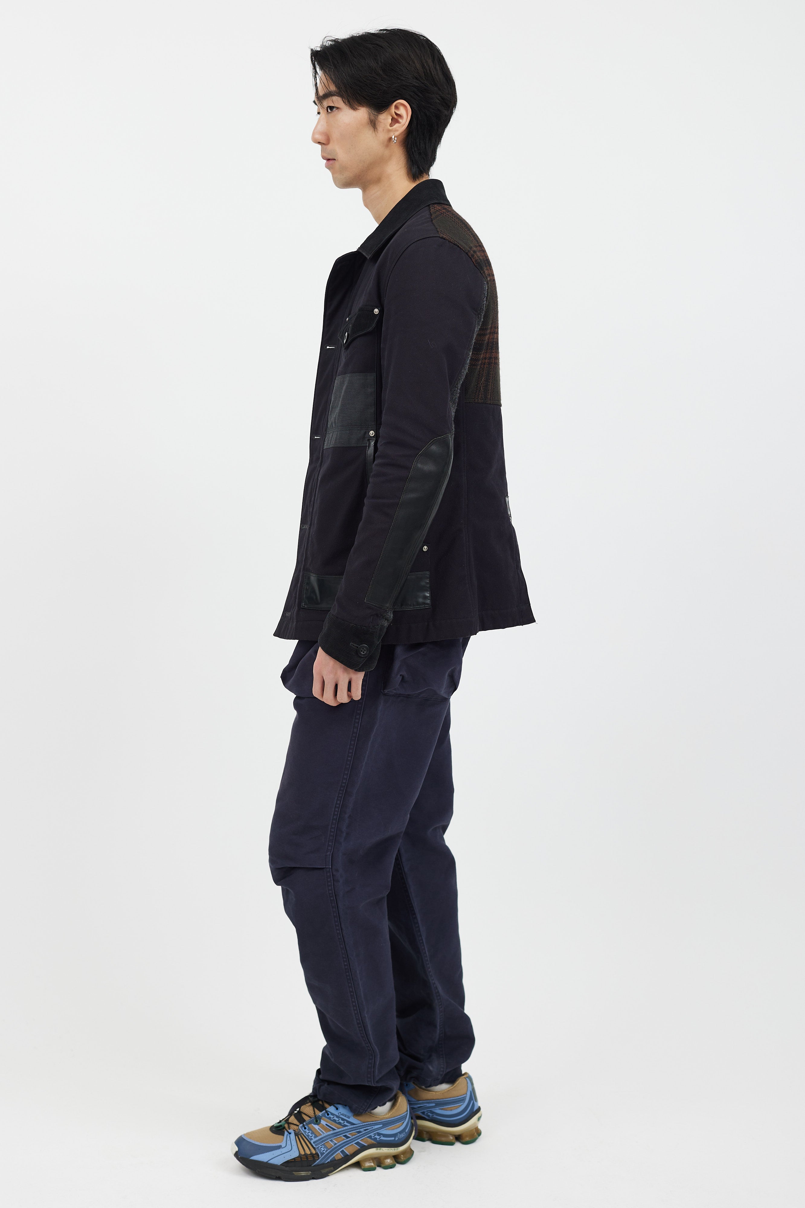 Pre-owned Junya Watanabe black corduroy and knit jacket featuring corduroy collar, leather patches at arm, full front zip closure, two slip pockets at waist, two patch pockets at chest, and plaid knit patch at back.