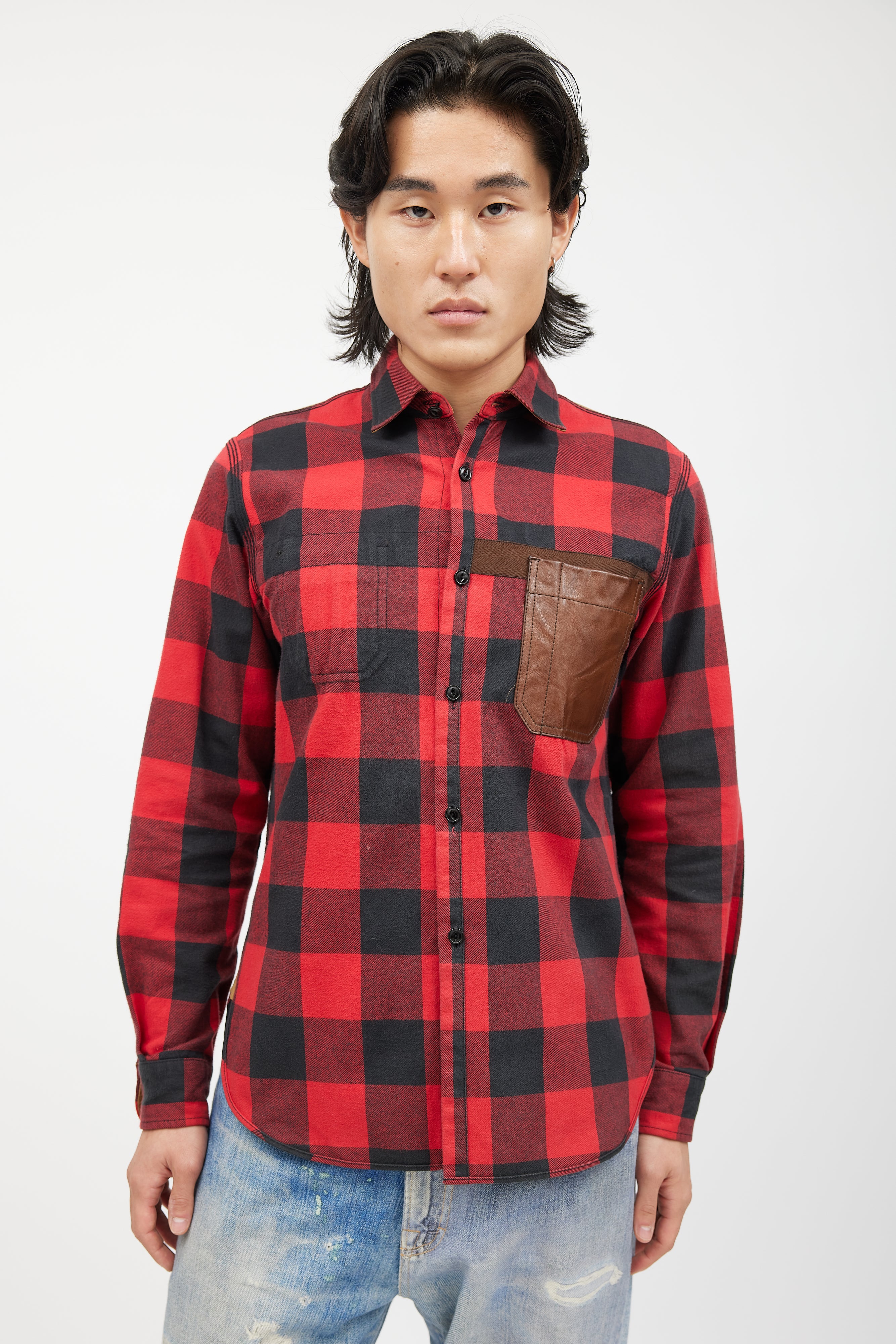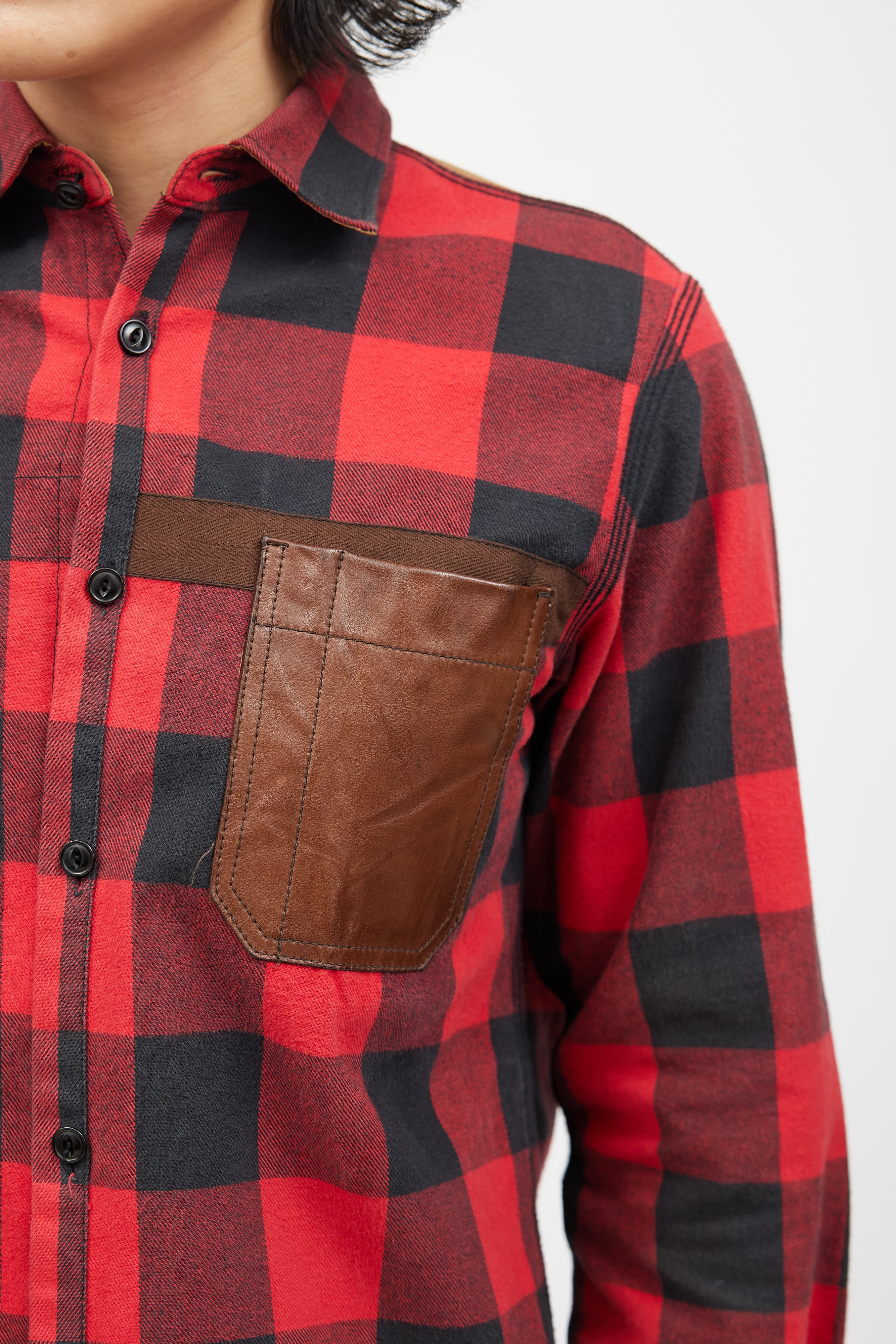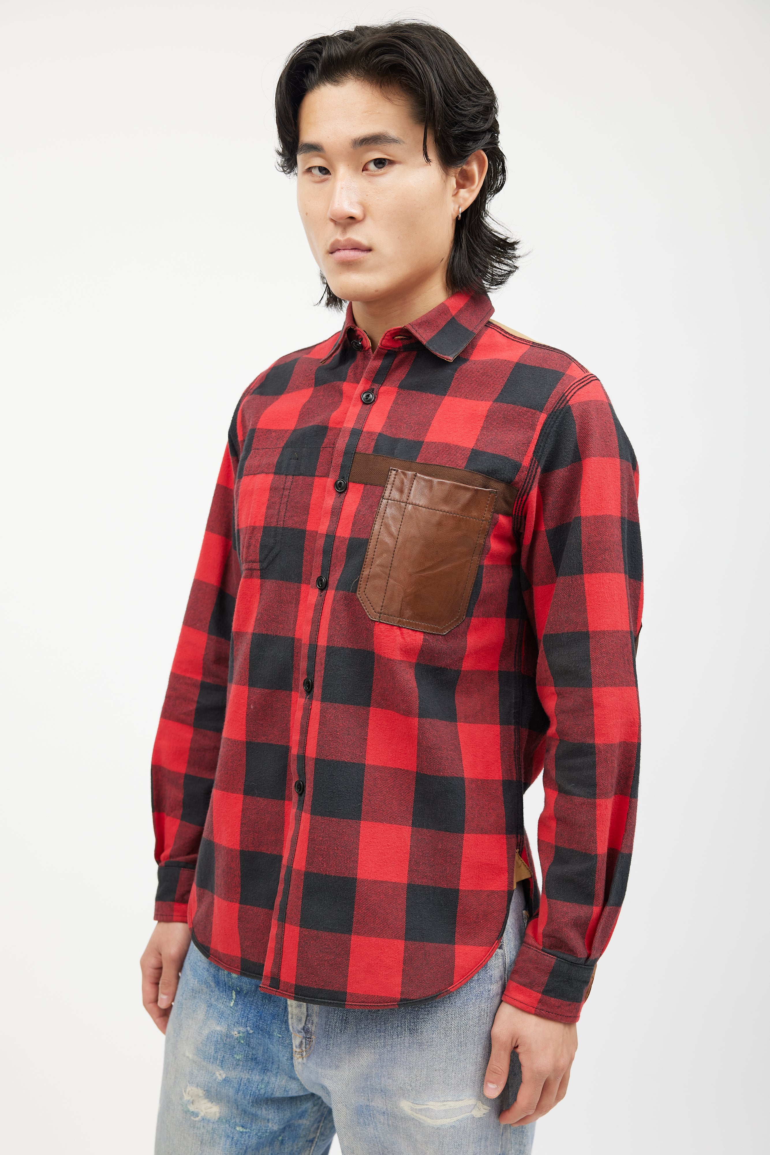 Pre-owned Junya Watanabe red shirt featuring a black plaid pattern throughout, pointed collar, brown leather patch pocket at chest, long sleeves with buttoned cuffs, beige canvas insert at shoulder, and button up closure.