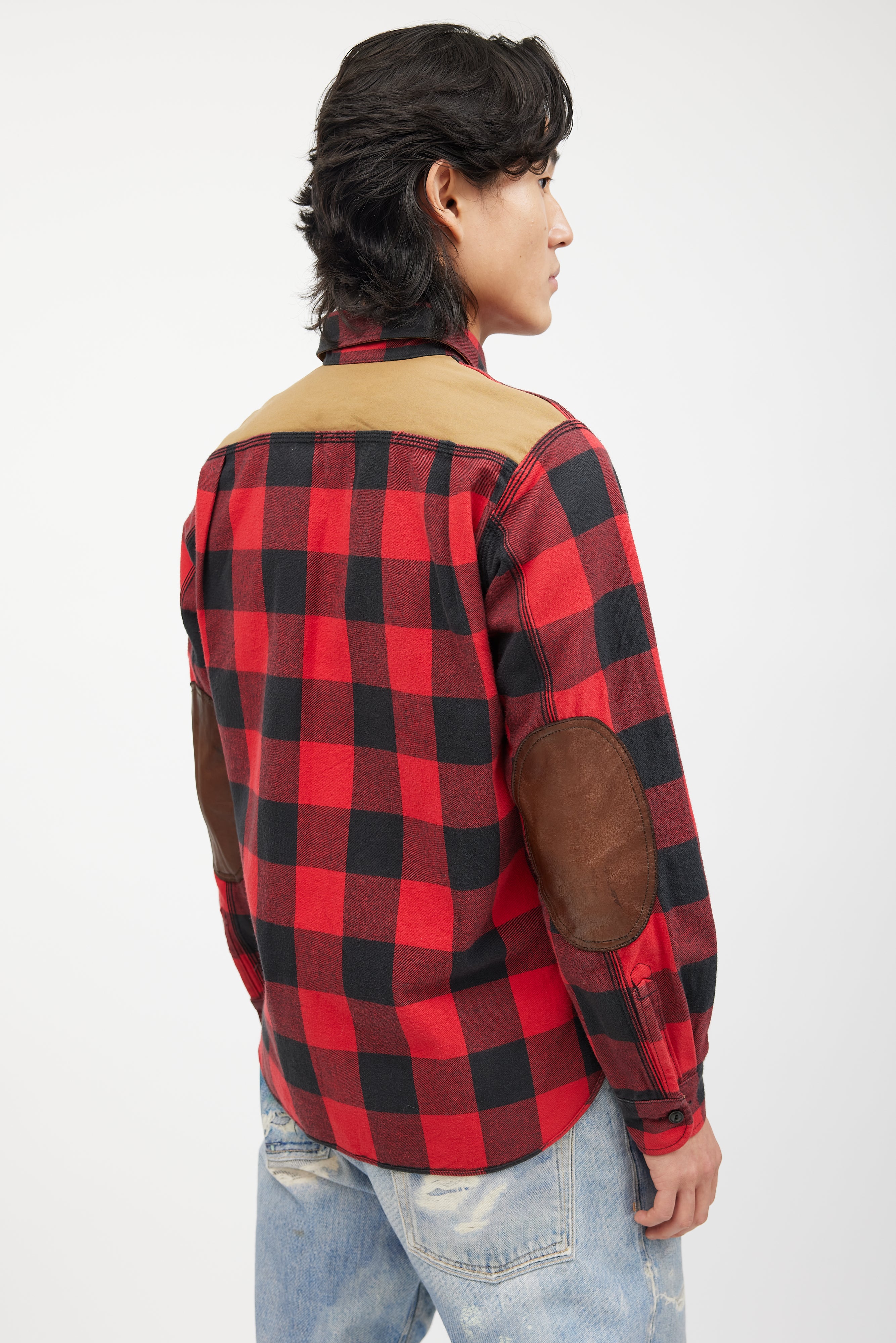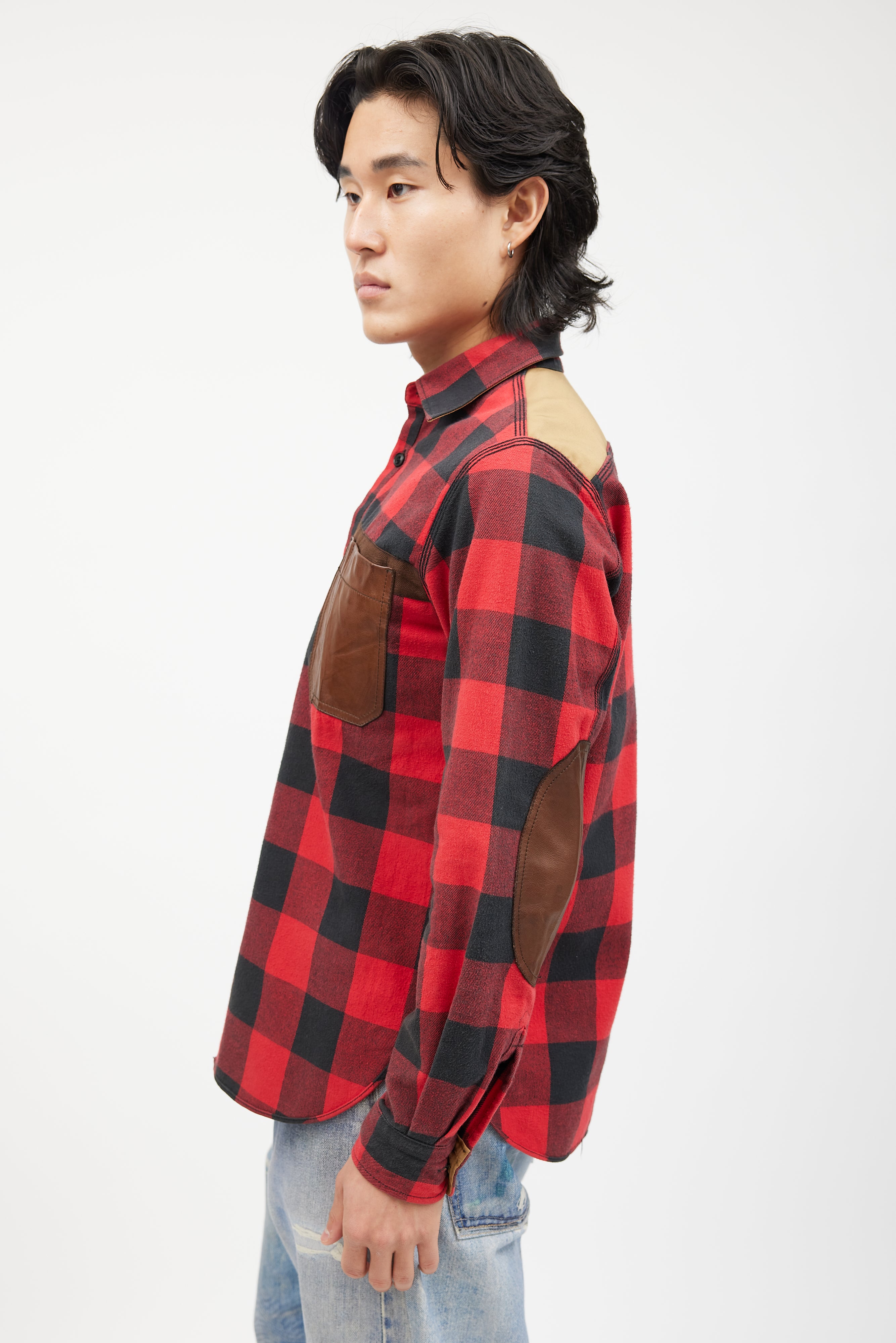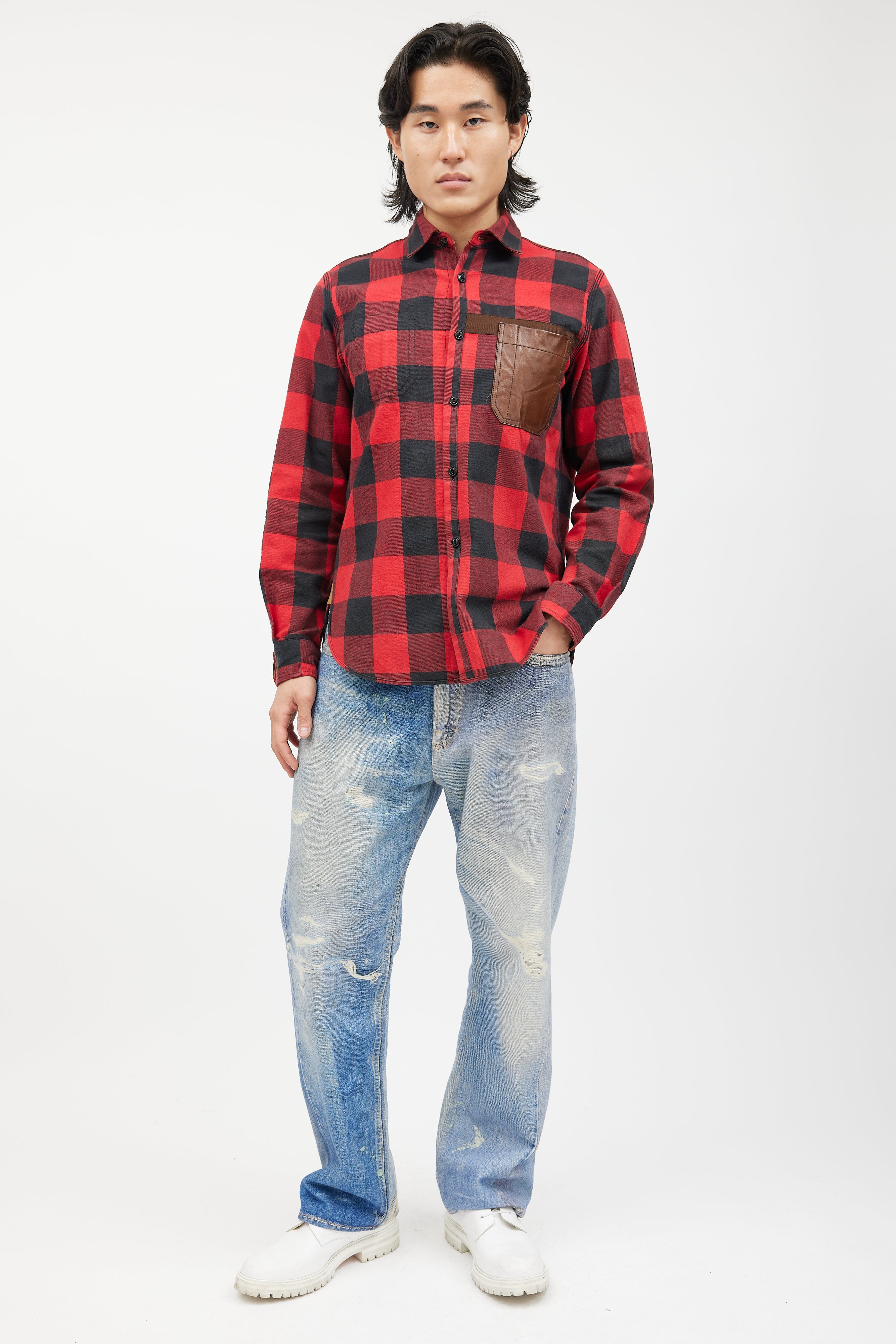 Pre-owned Junya Watanabe red shirt featuring a black plaid pattern throughout, pointed collar, brown leather patch pocket at chest, long sleeves with buttoned cuffs, beige canvas insert at shoulder, and button up closure.