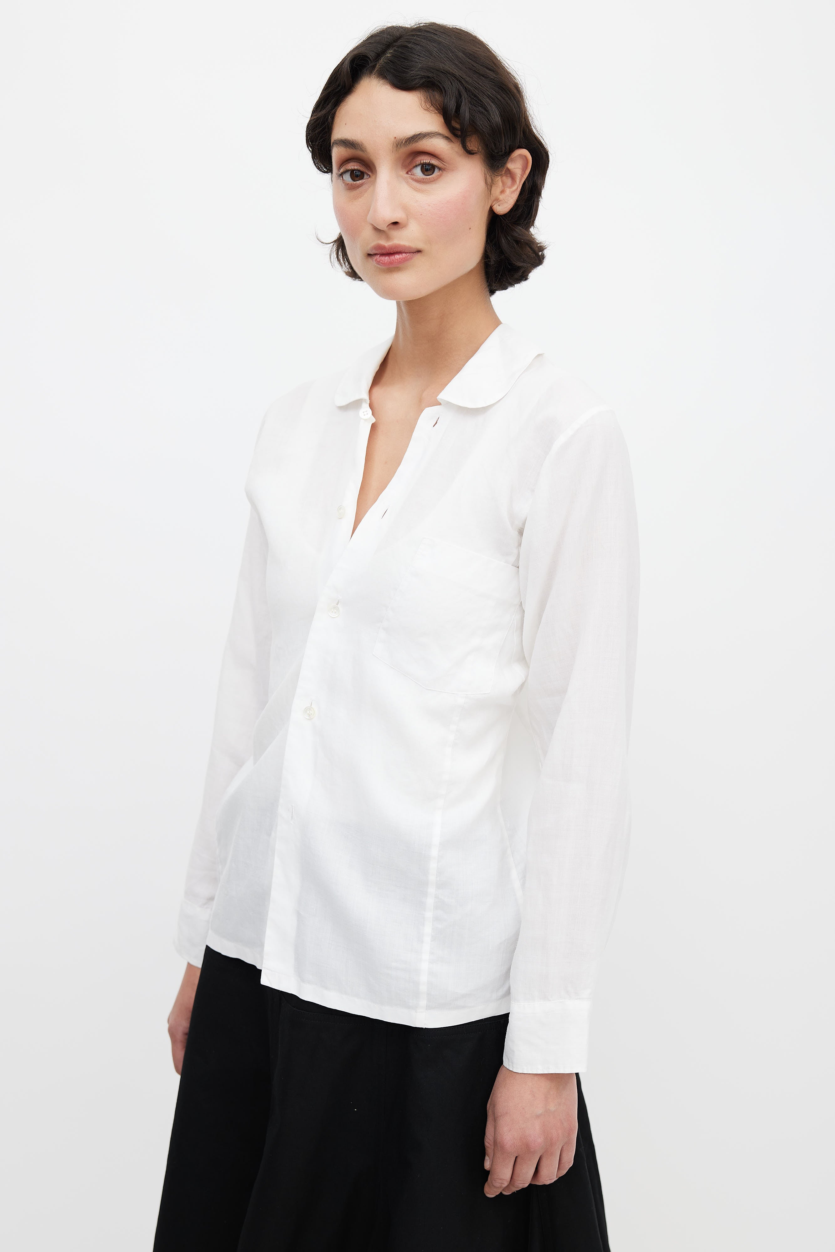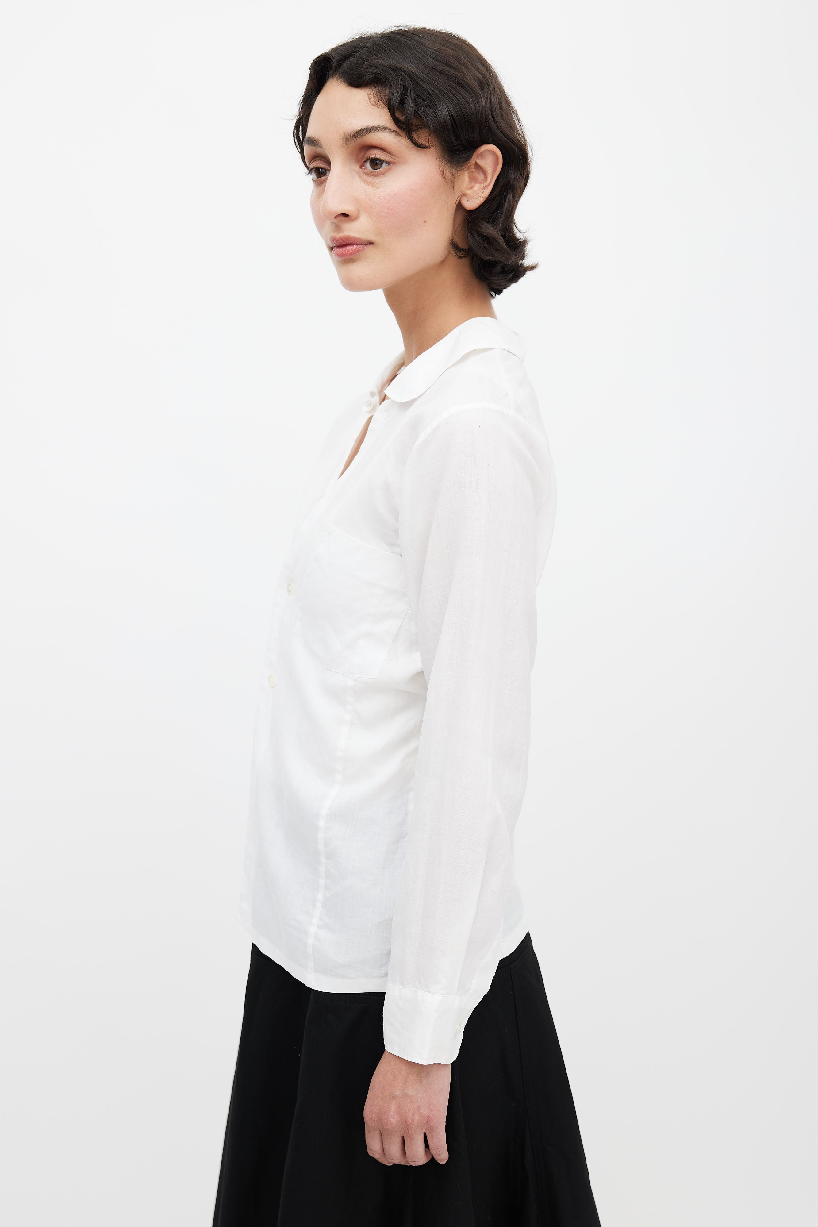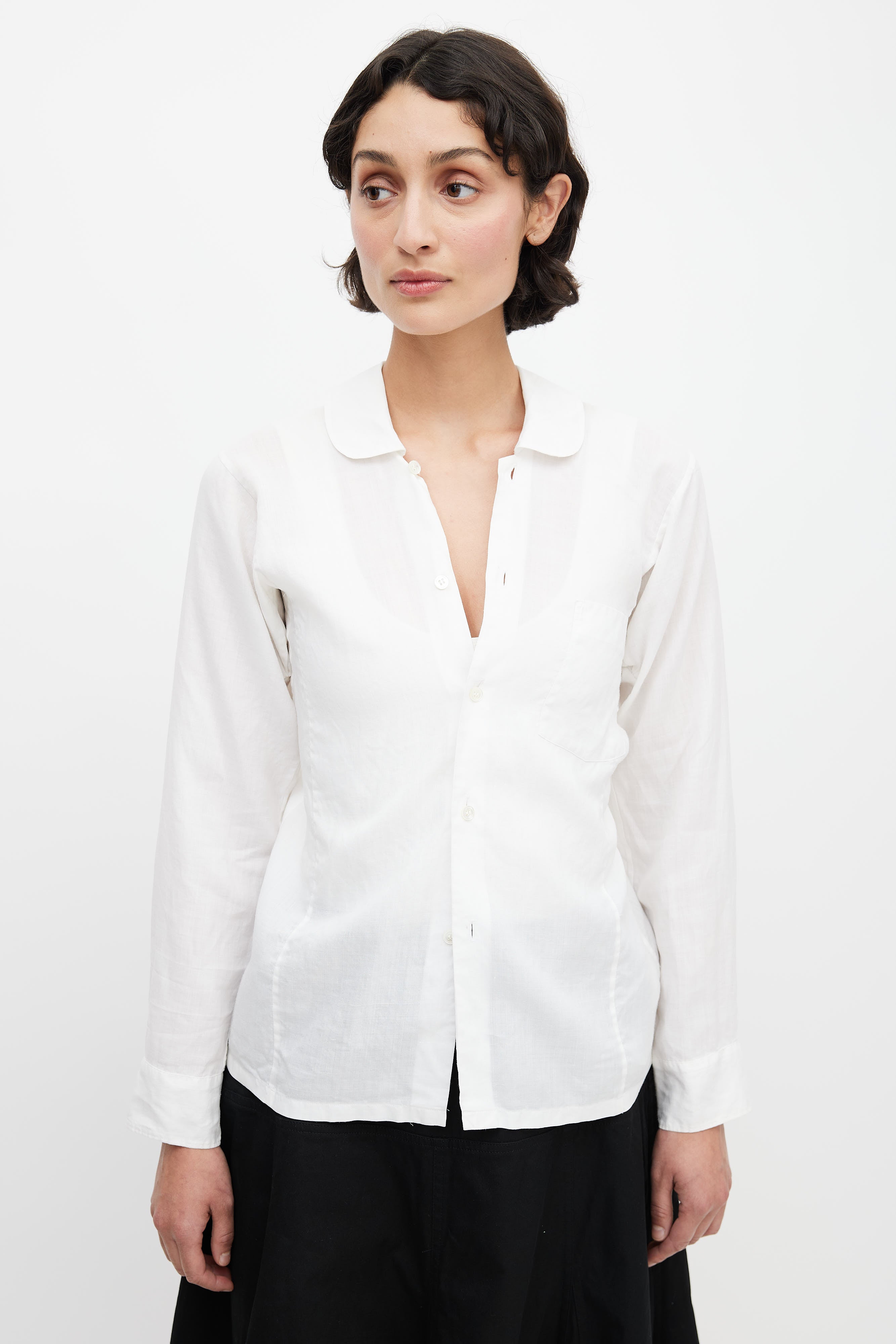 Pre-owned Junya Watanabe white linen shirt featuring a peter pan collar, long sleeves with buttoned cuffs, one patch pocket at chest, and button up front.