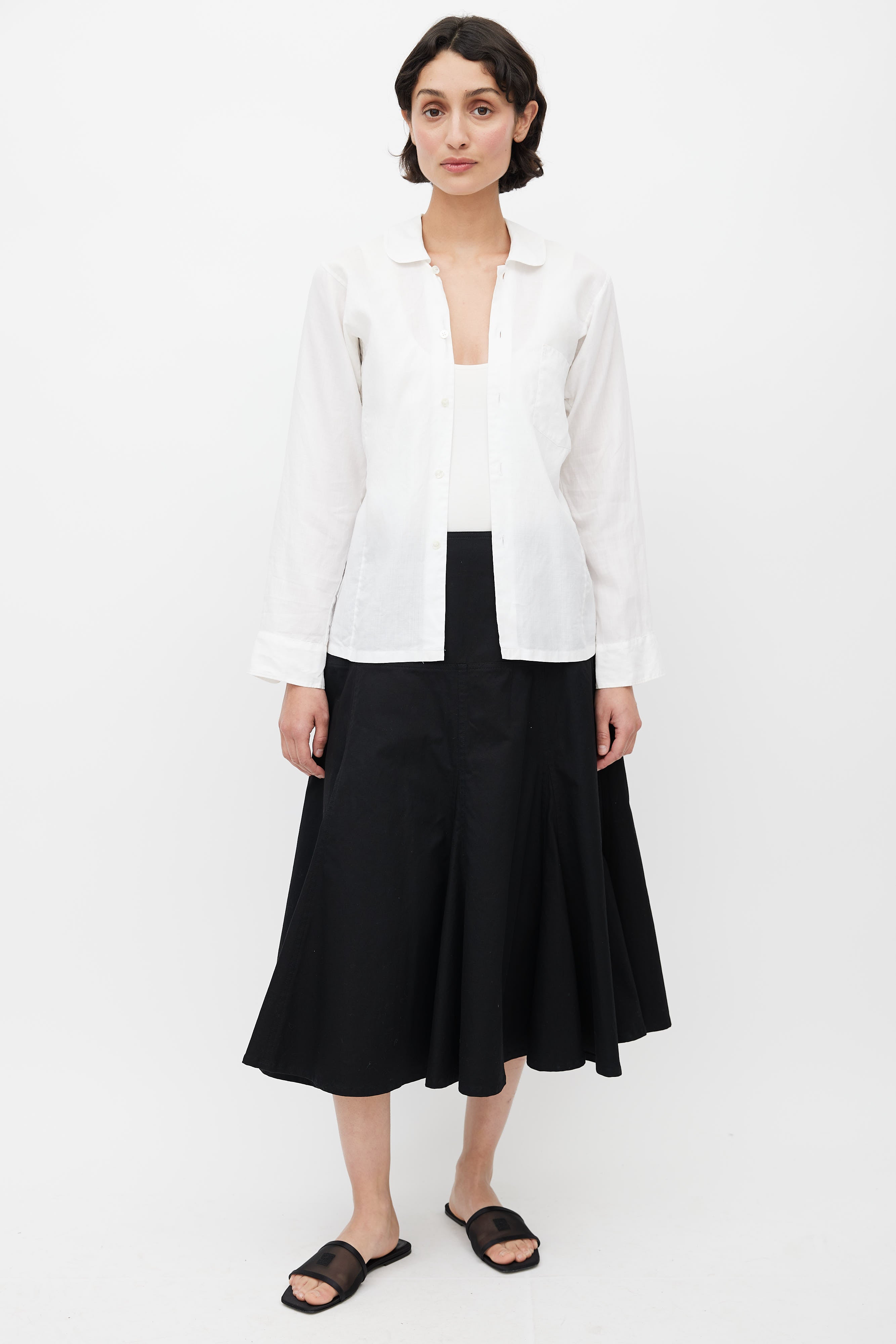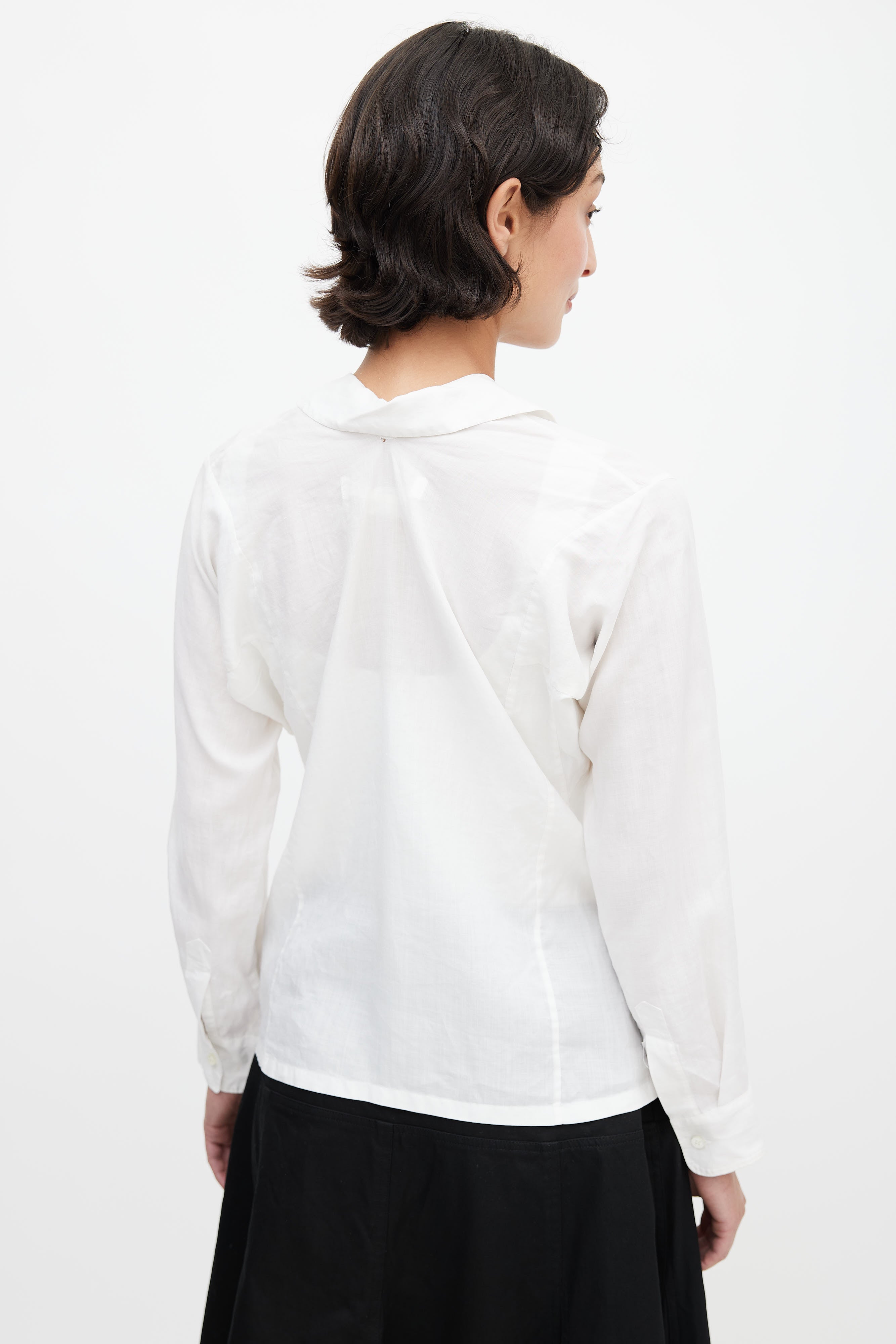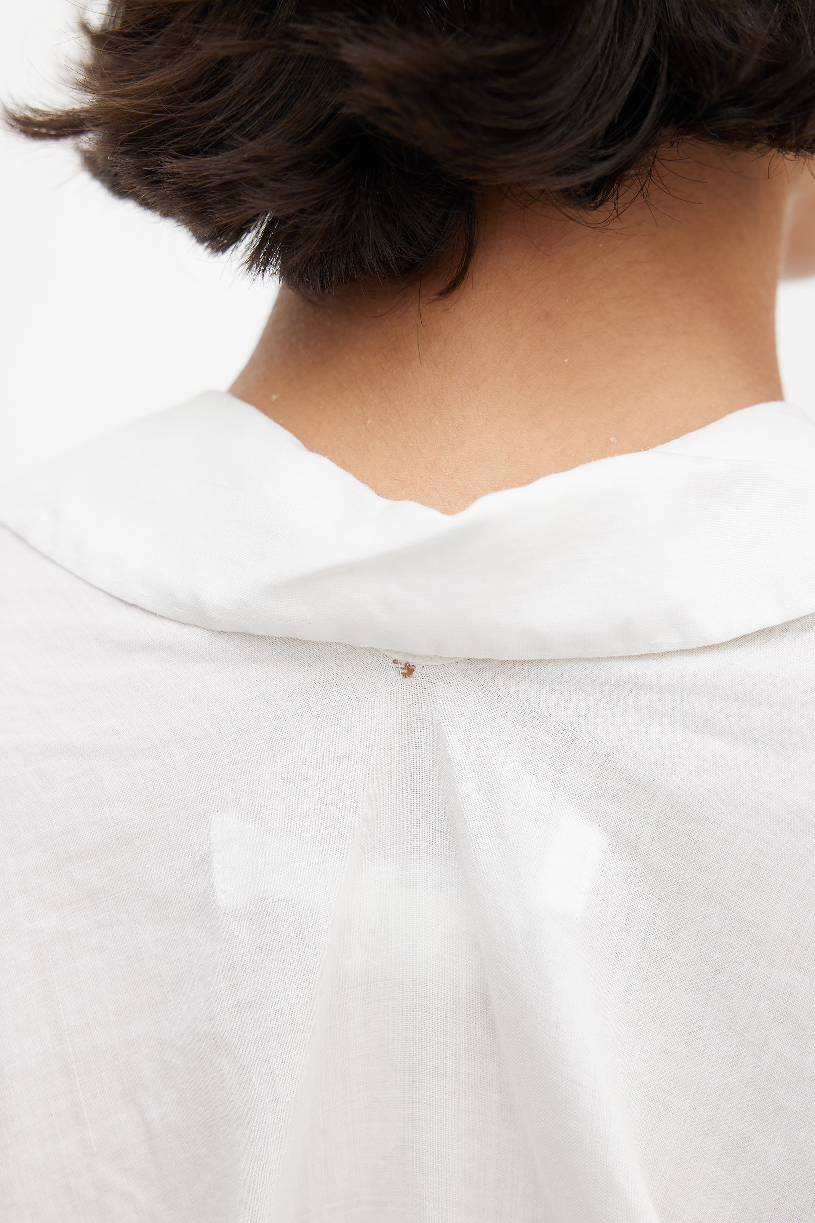 Pre-owned Junya Watanabe white linen shirt featuring a peter pan collar, long sleeves with buttoned cuffs, one patch pocket at chest, and button up front.
