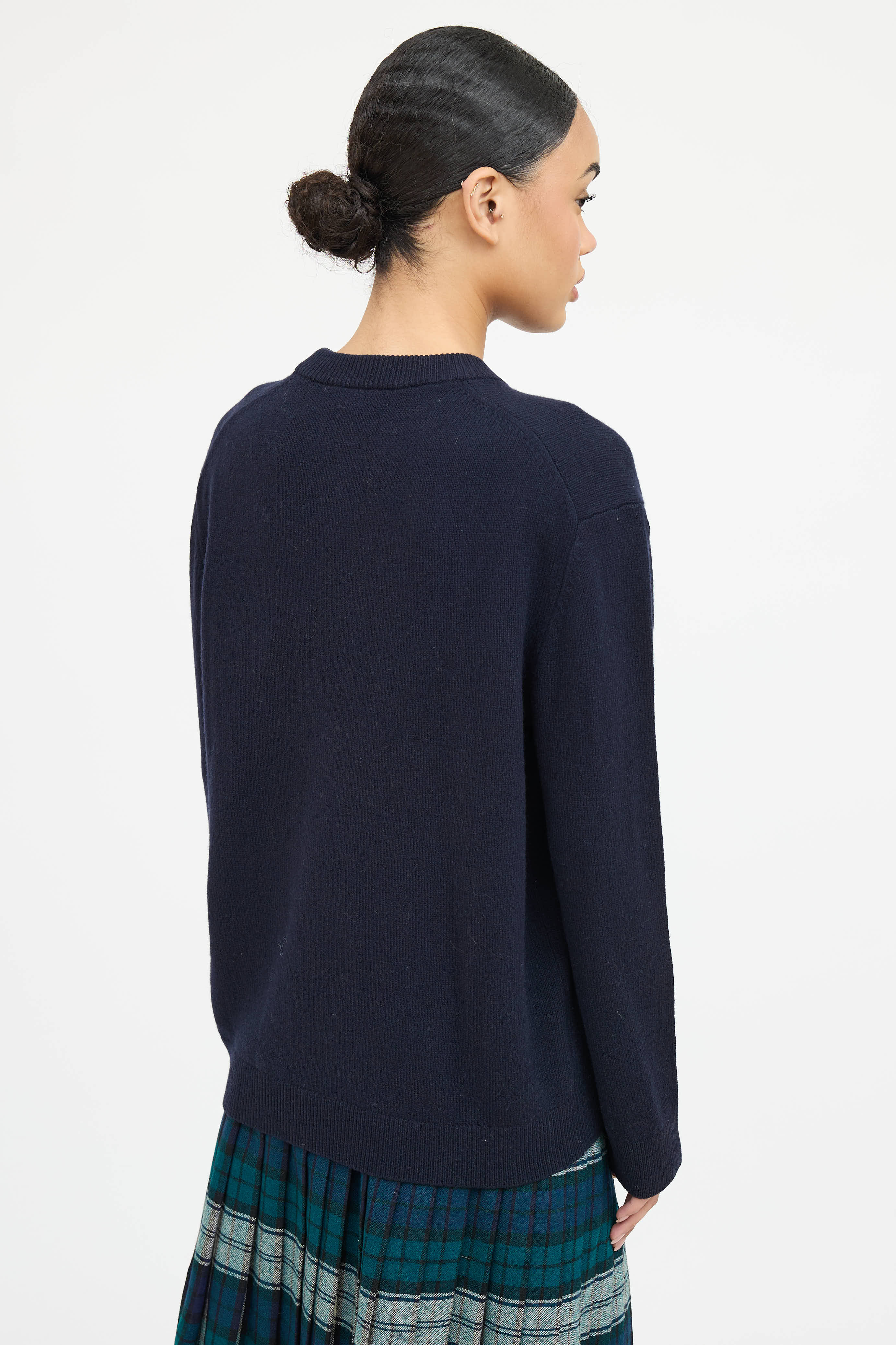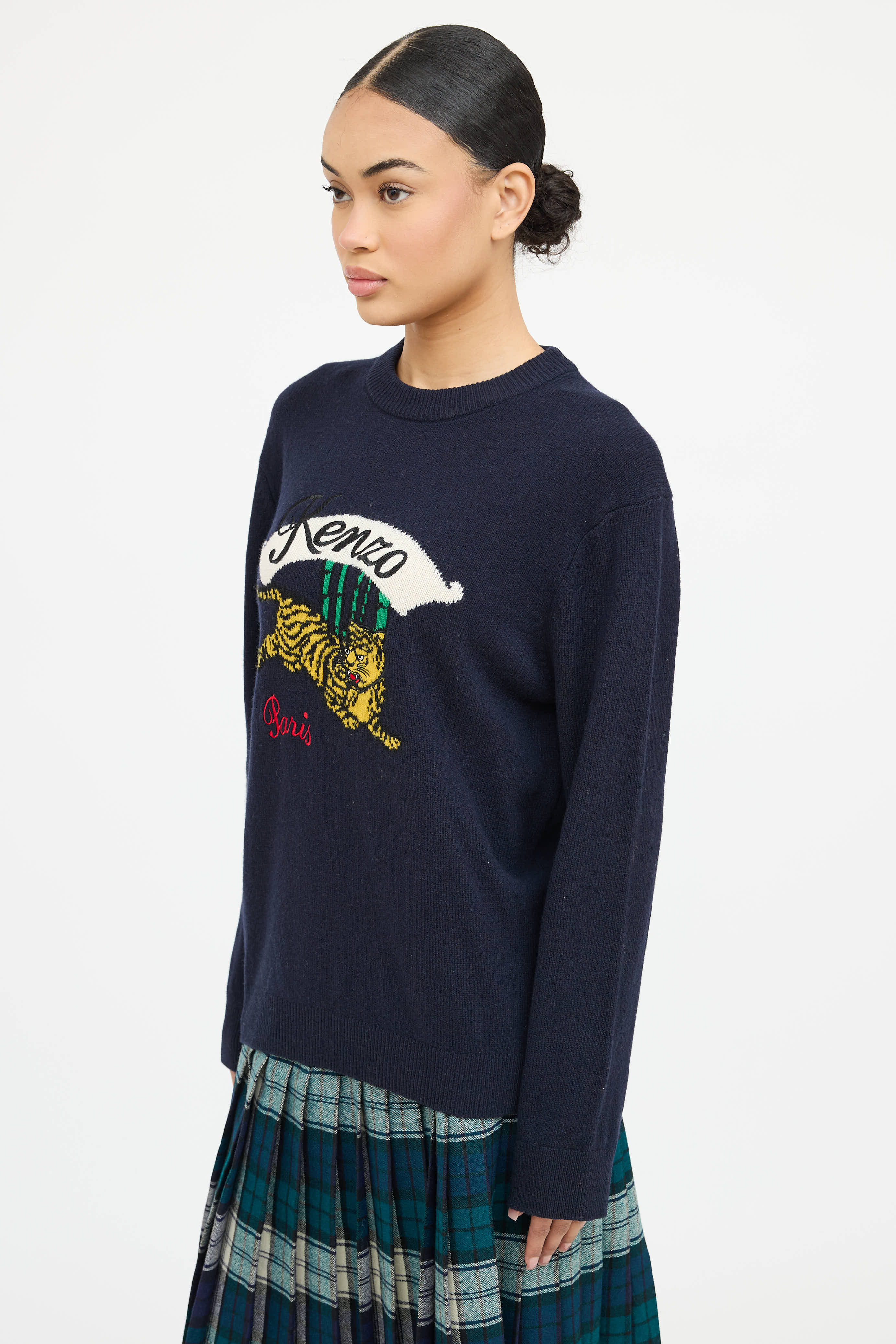 Pre-owned Kenzo navy long sleeve sweater featuring crew neckline, logo graphic at front, and ribbed trims.