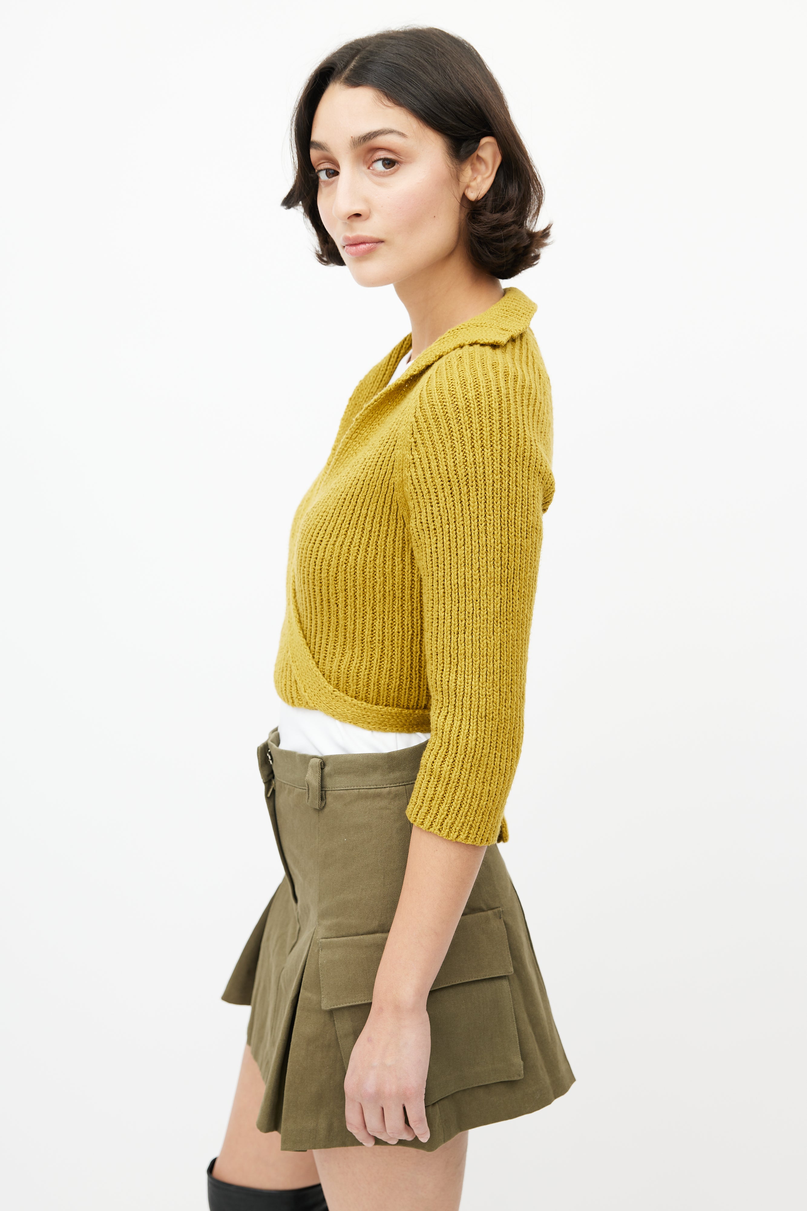 Pre-owned Rachel Comey yellow knit cardigan featuring a stand collar, three quarter length sleeves, cropped fit, and wrap front closure.