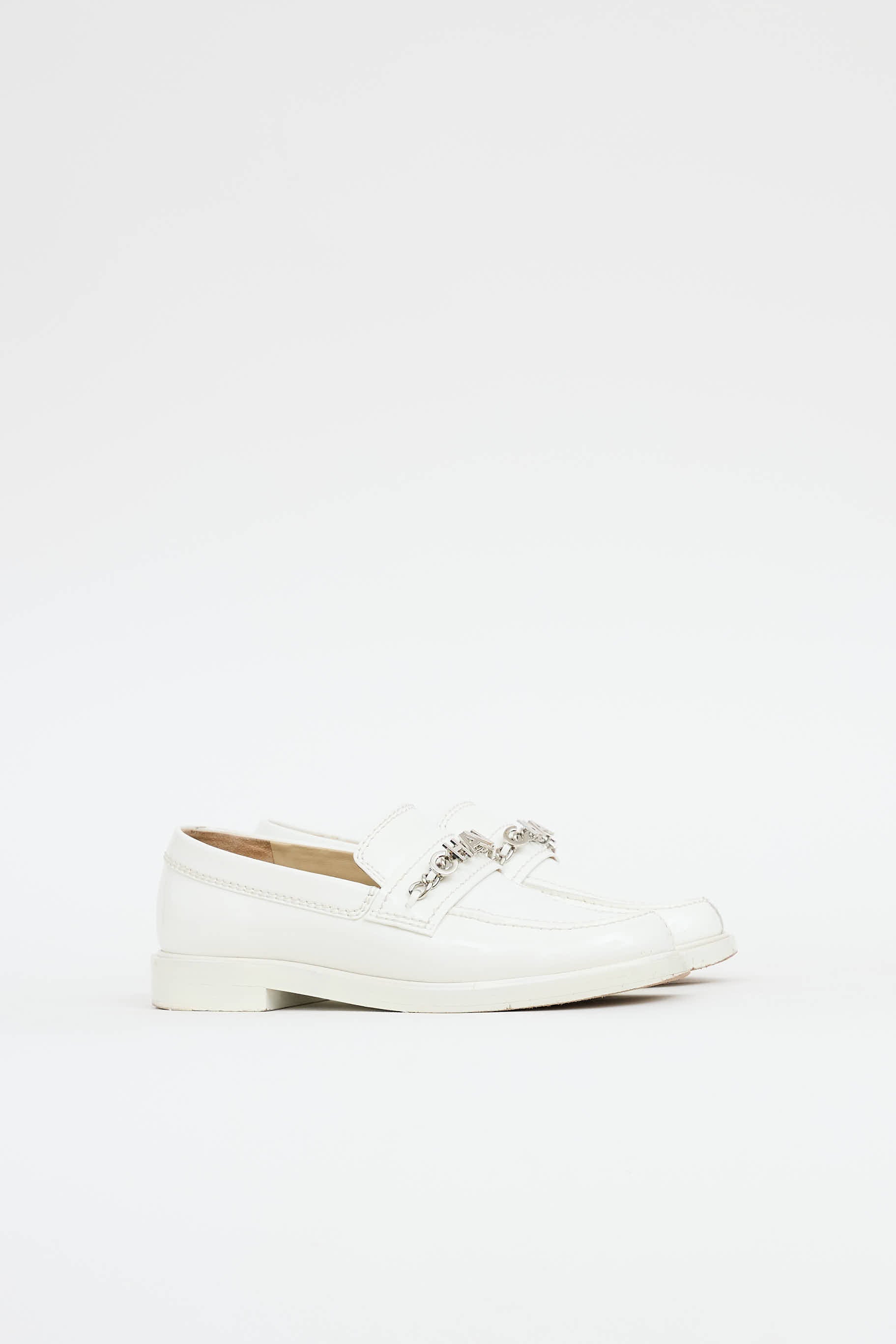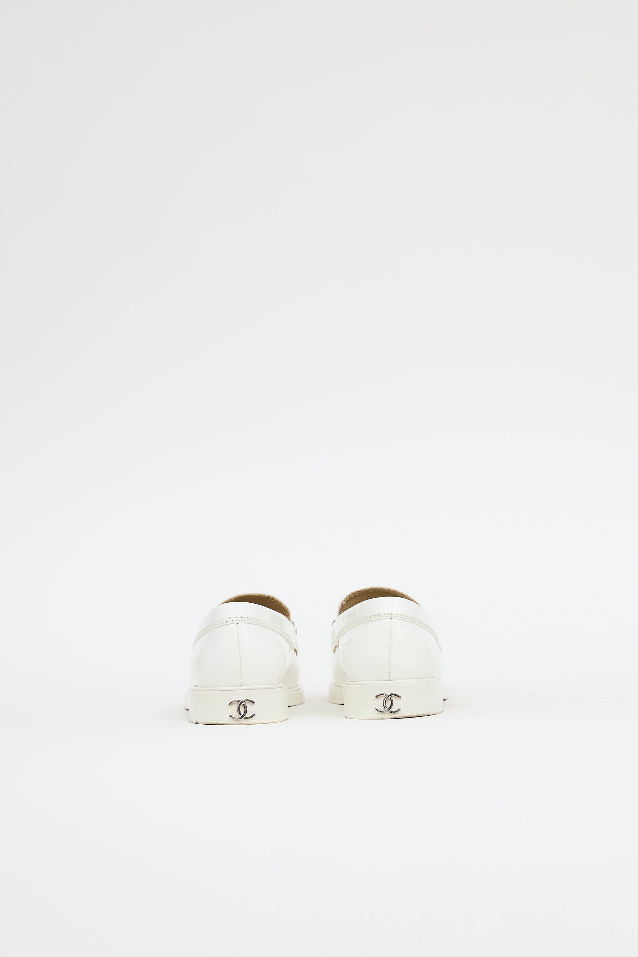Pre-owned Chanel 2022 Cruise white patent leather loafers featuring rounded toe, silver tone logo and chain link at vamp, slip on entry, and silver tone CC logo at back of heel.