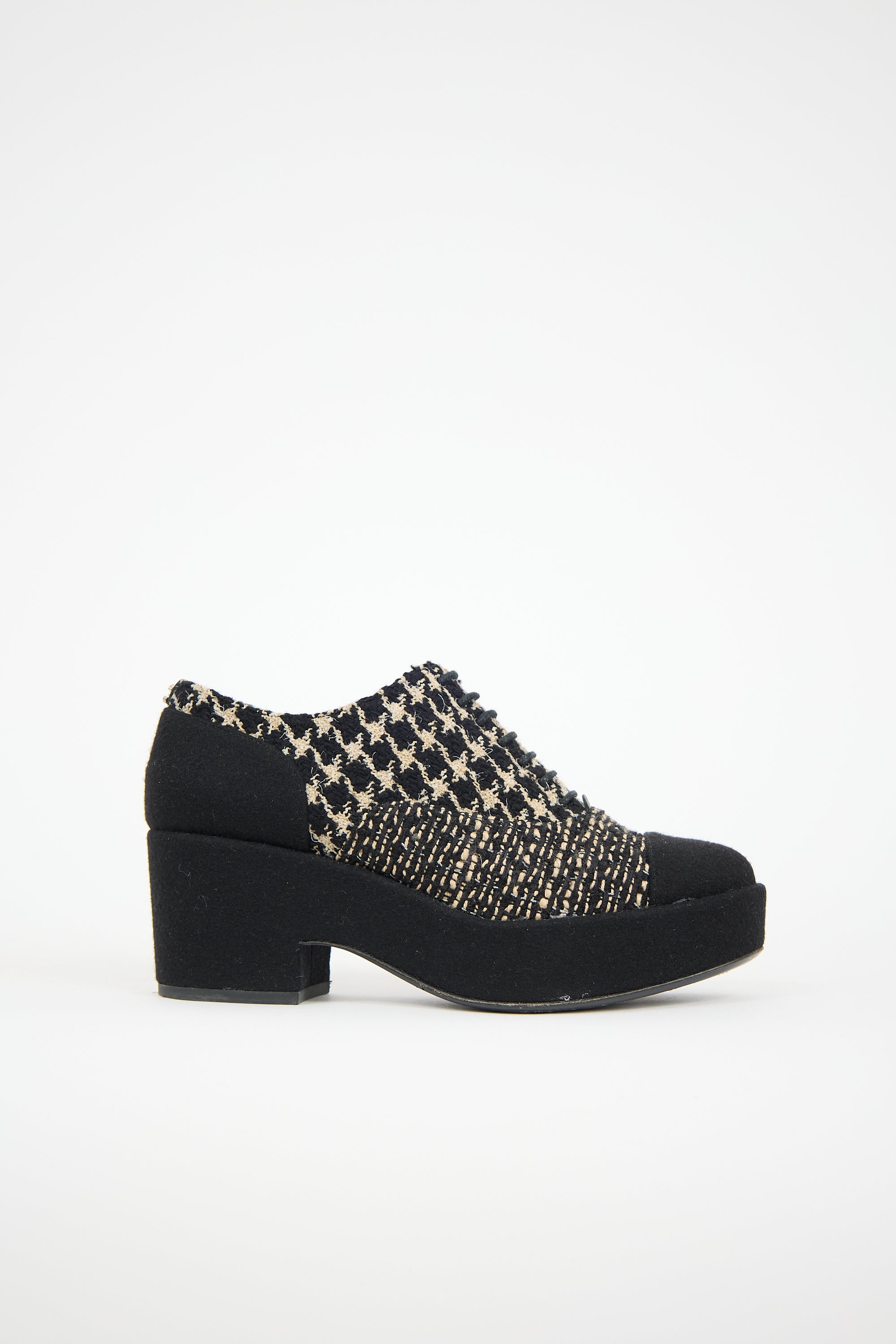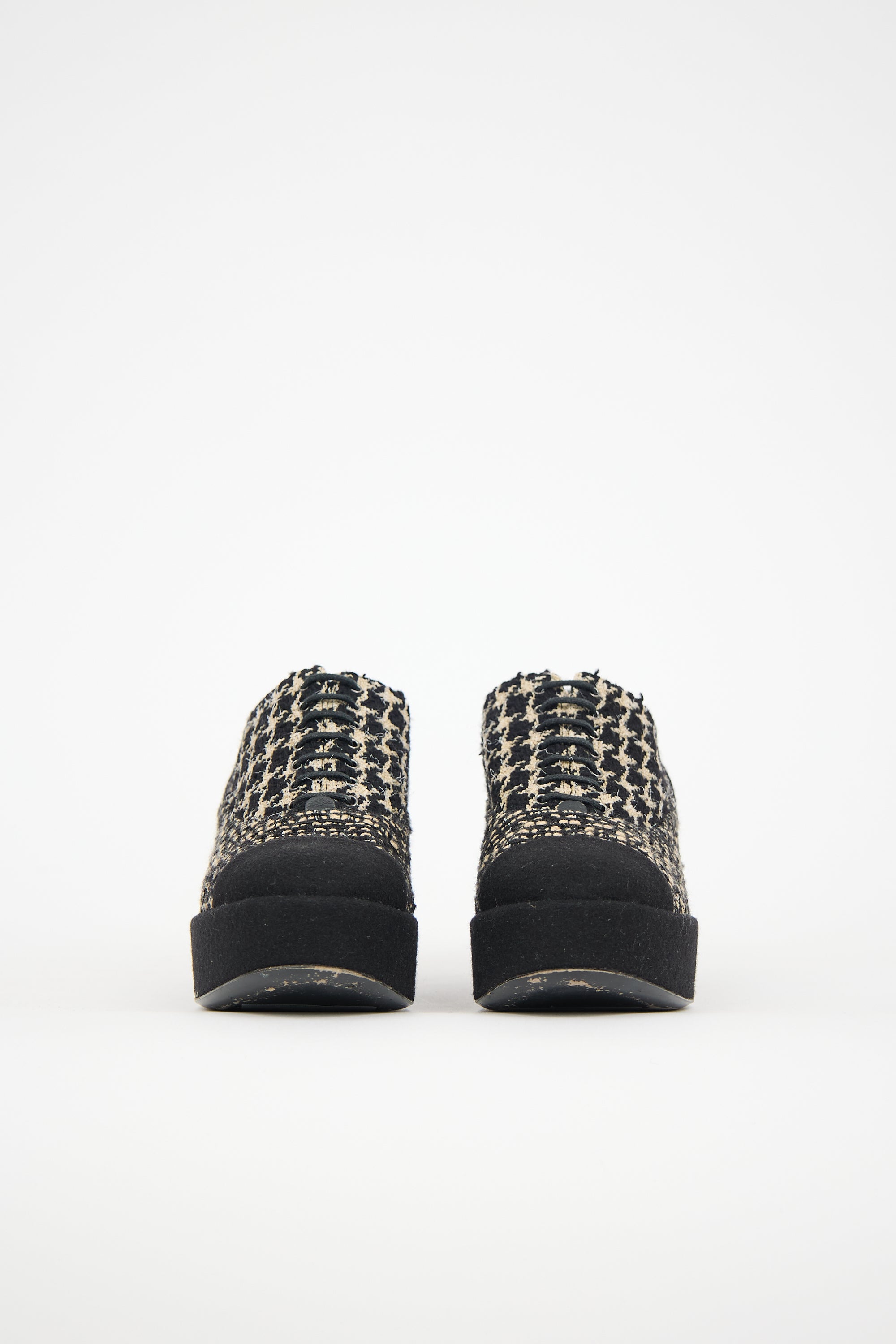 Pre-owned Chanel black and cream tweed oxfords featuring a rounded cap toe, mixed tweed and houndstooth uppers, lace up front, silver tone CC hardware at counter, and a felt covered platform and heel. Comes with original dust bag.