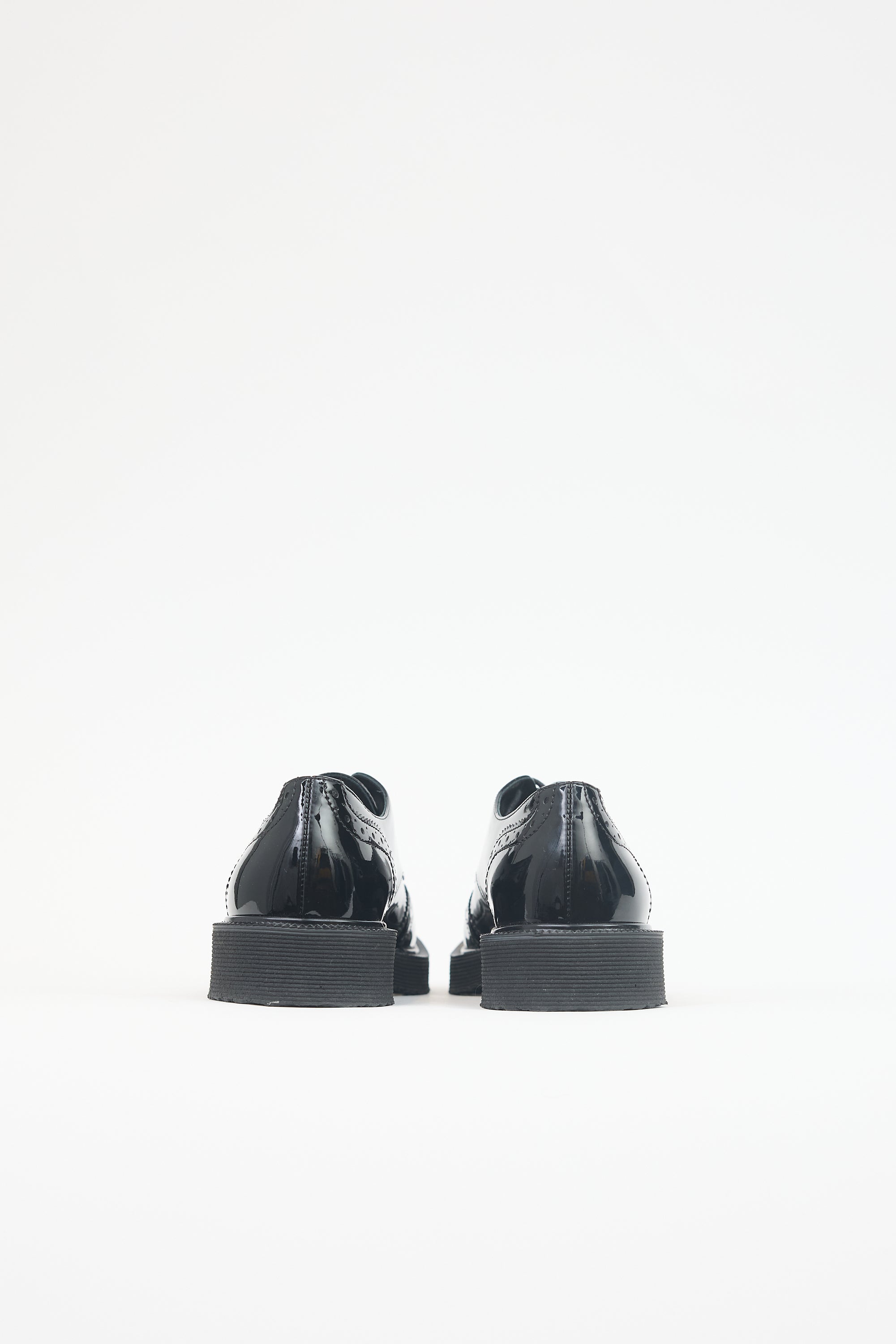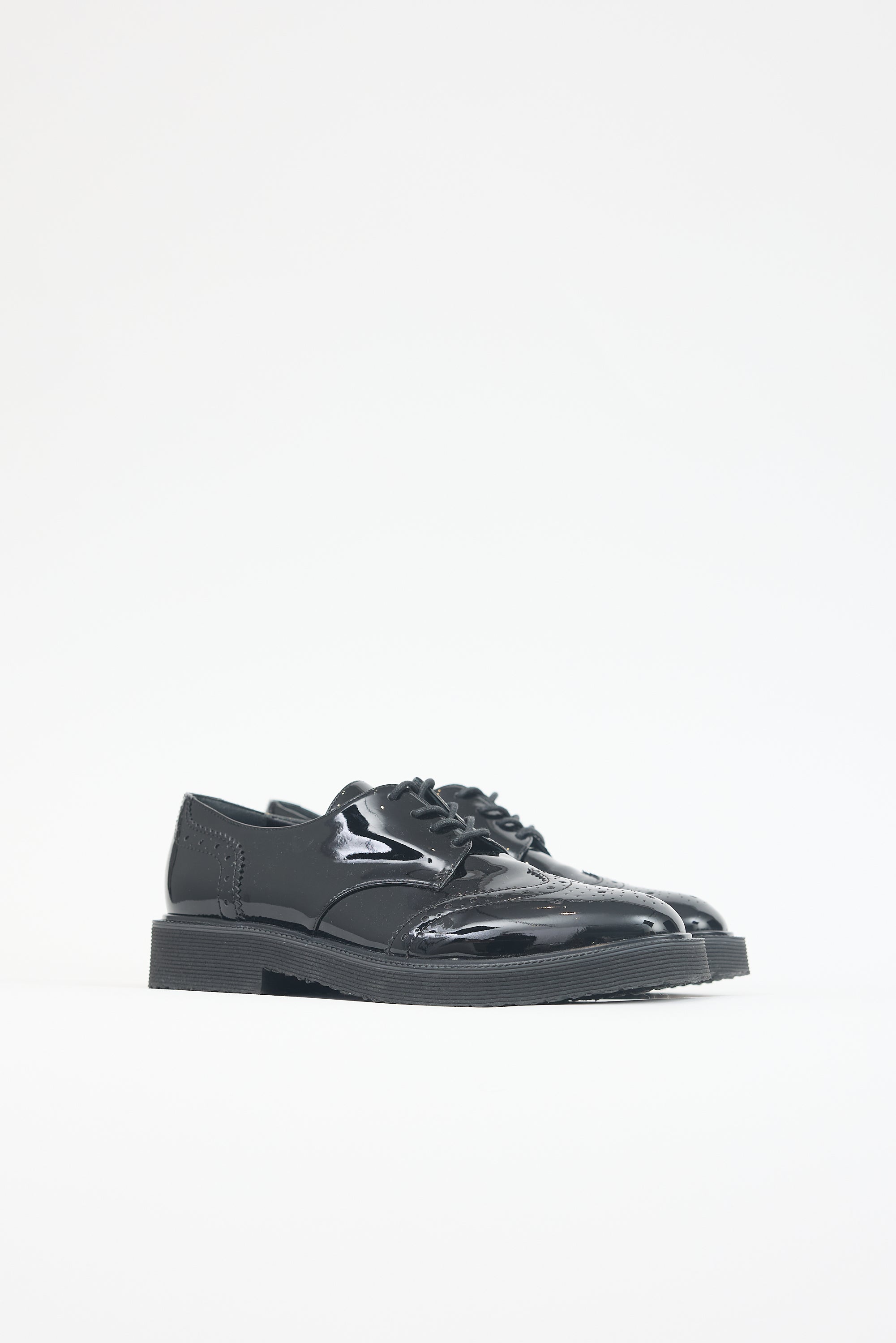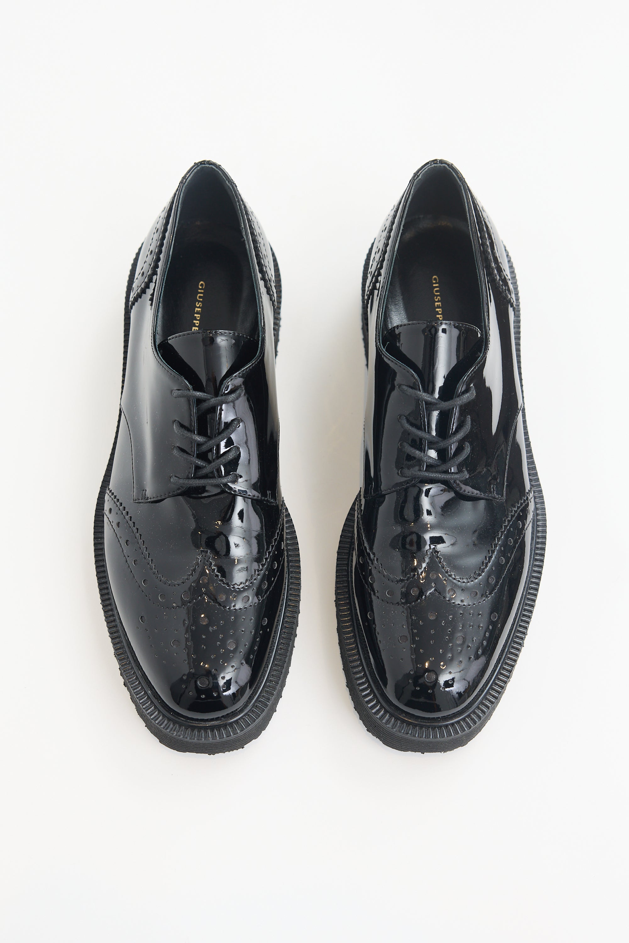 Pre-owned Giuseppe Zanotti black patent leather Hilary derby featuring an almond toe, brogue design, lace up vamp, and textured foam rubber sole.