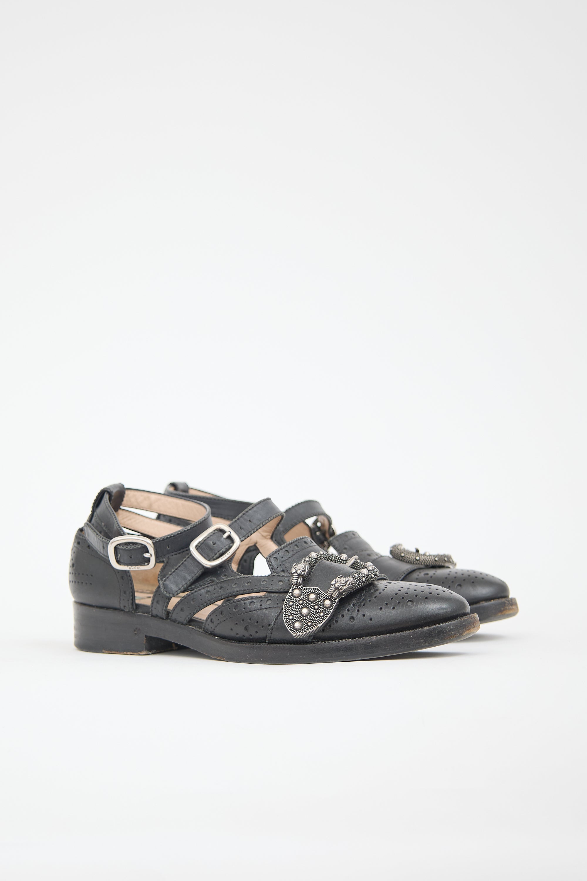 Pre-owned Gucci black leather Queercore loafers featuring rounded toe, perforated brogue upper, vamp strap with gunmetal feline head motif buckle, adjustable instep and ankle straps, and gold tone embroidered bee at counter.
