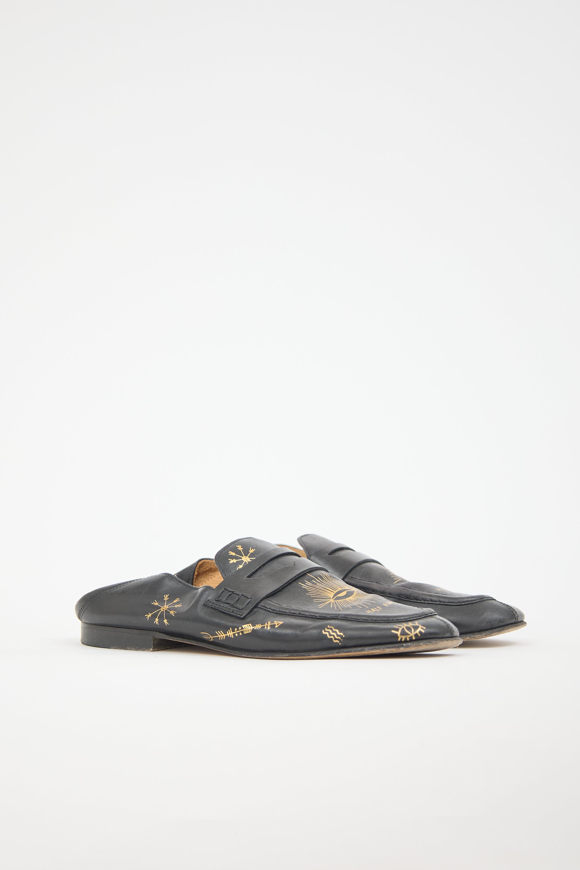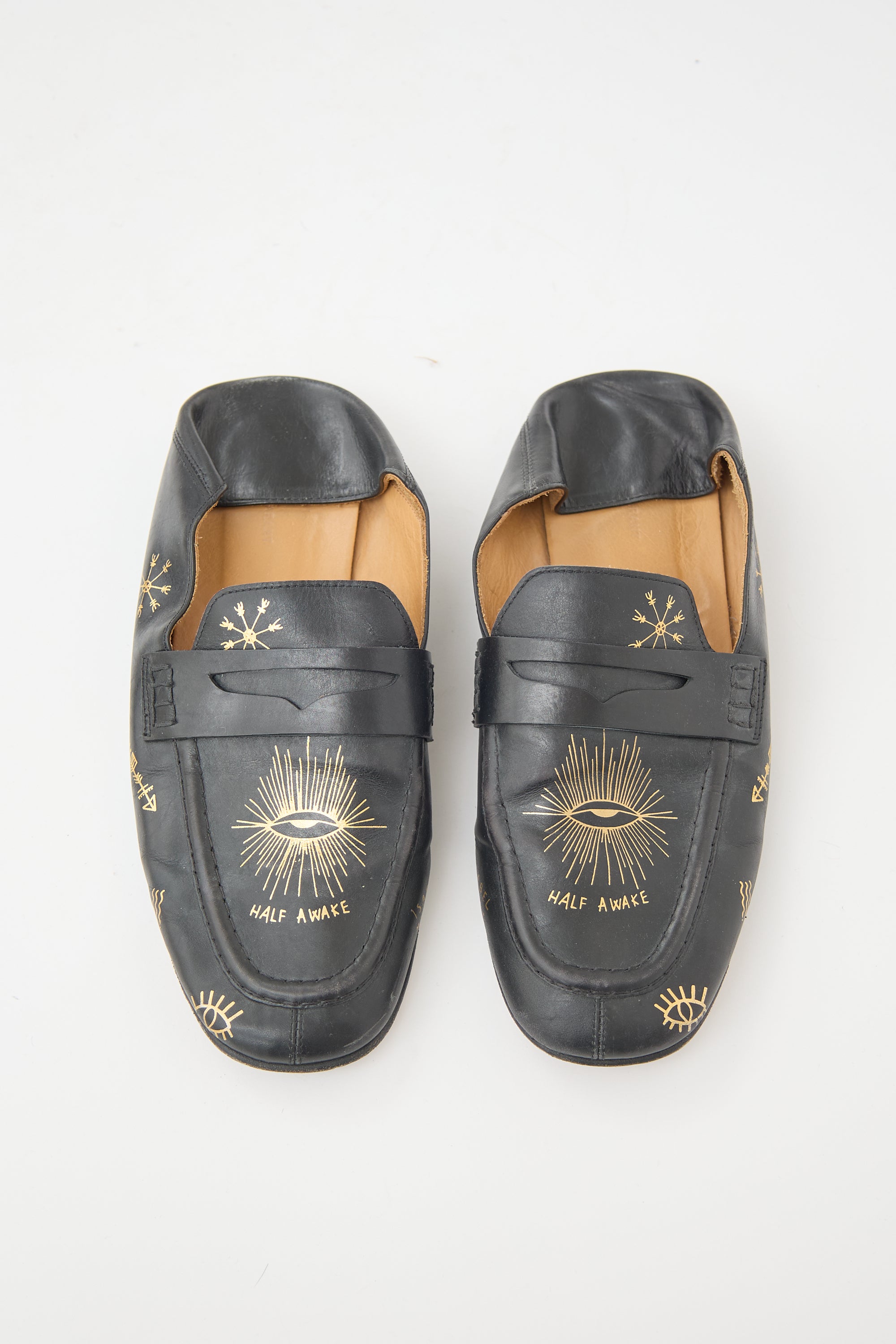 Pre-owned Isabel Marant black leather Fezzy loafers featuring a gold script and symbol print, rounded moc toe, cutout strap at vamp, convertible counter, and slip on entry.