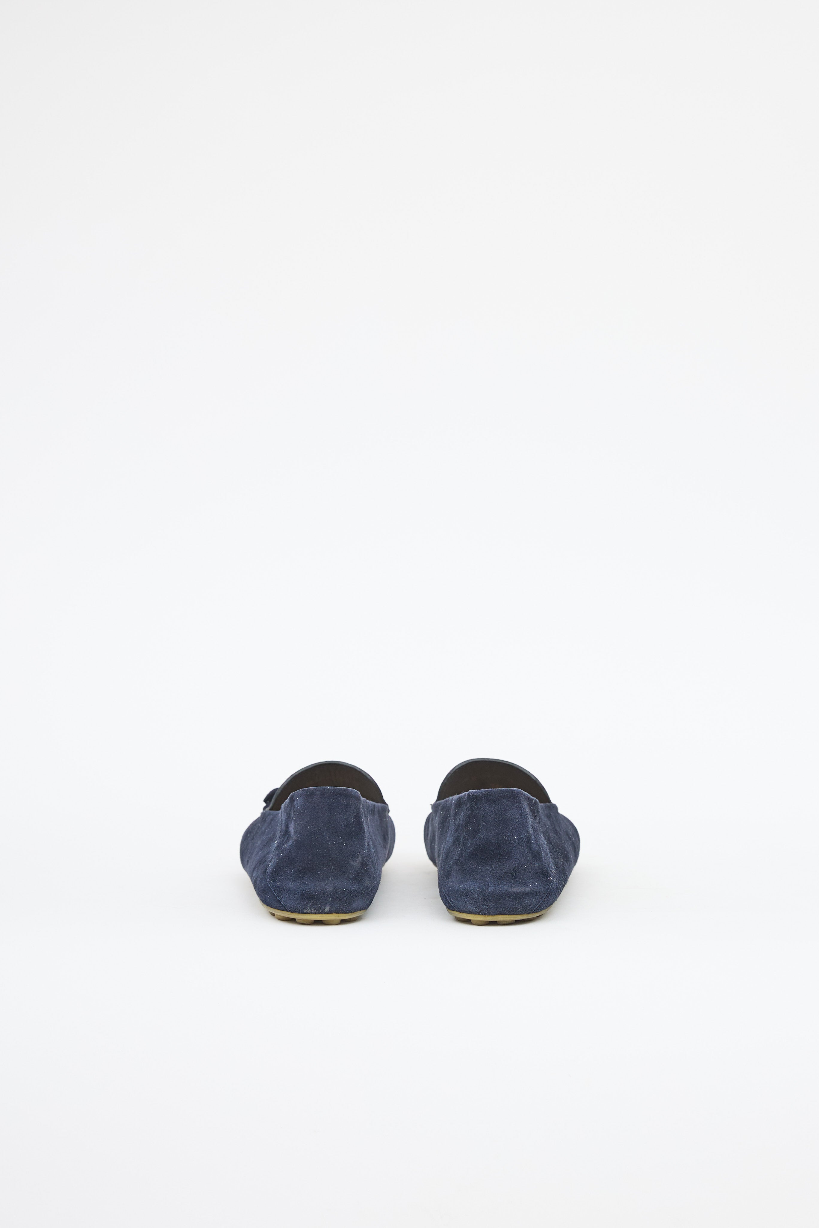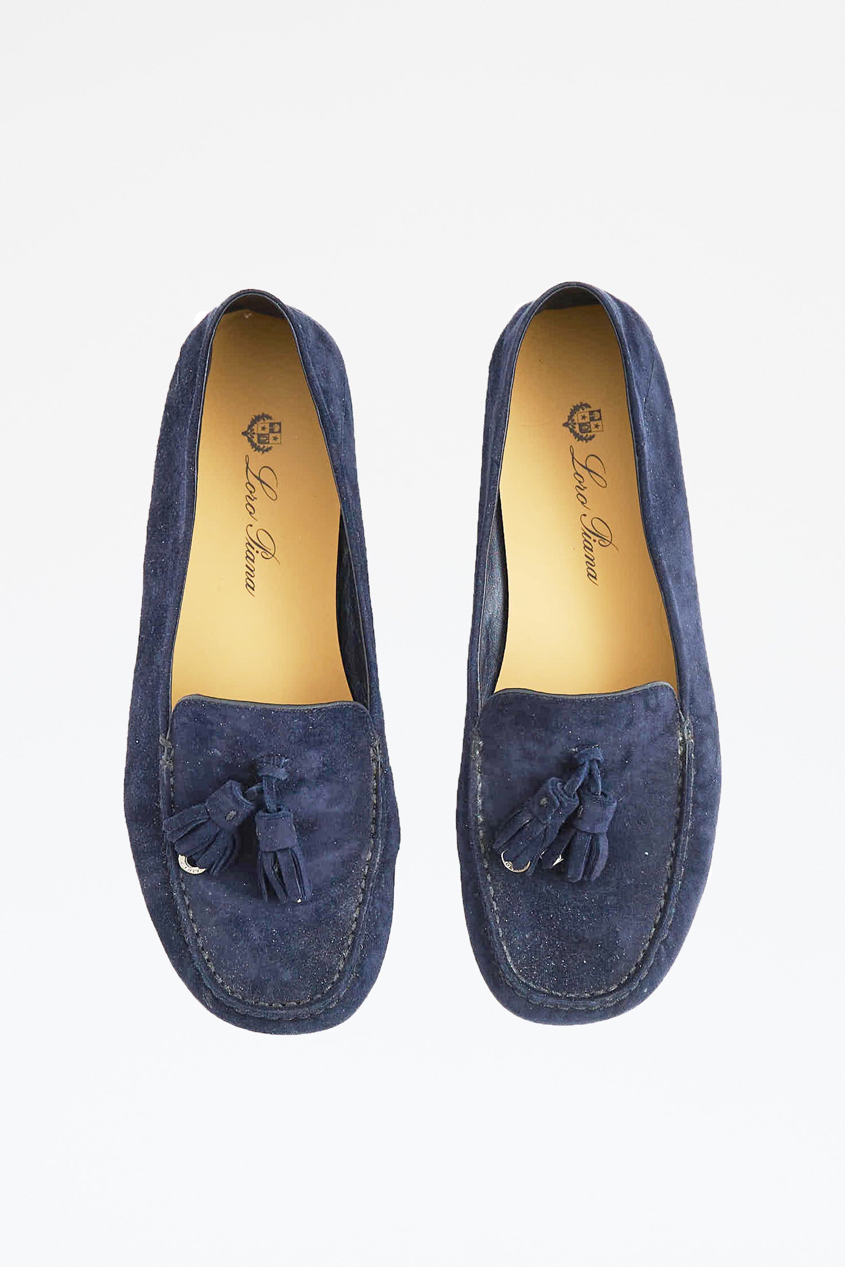 Pre-owned Loro Piana navy suede walk loafer featuring square toe, notched topline, tassel at vamp, and pebbled outsole.