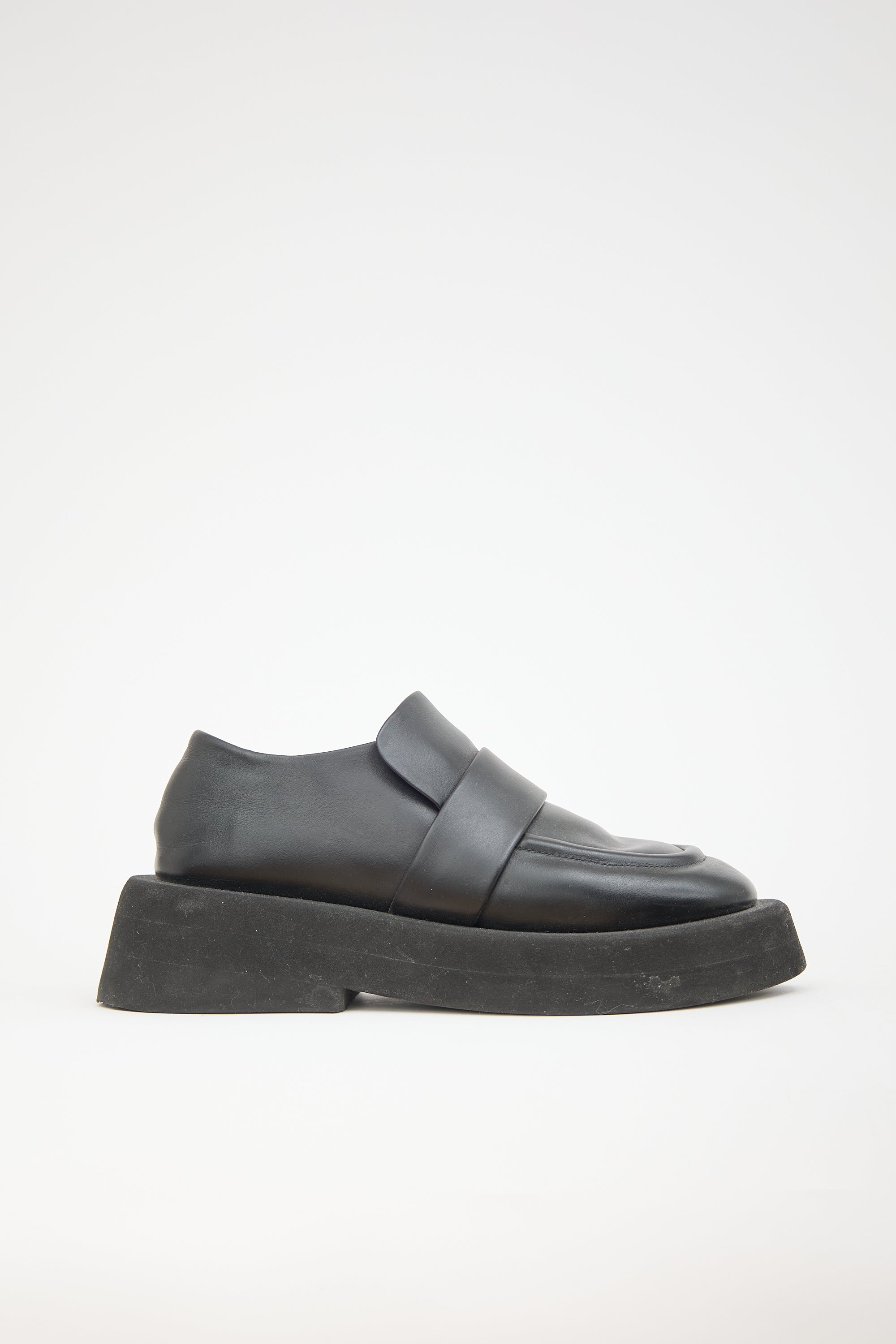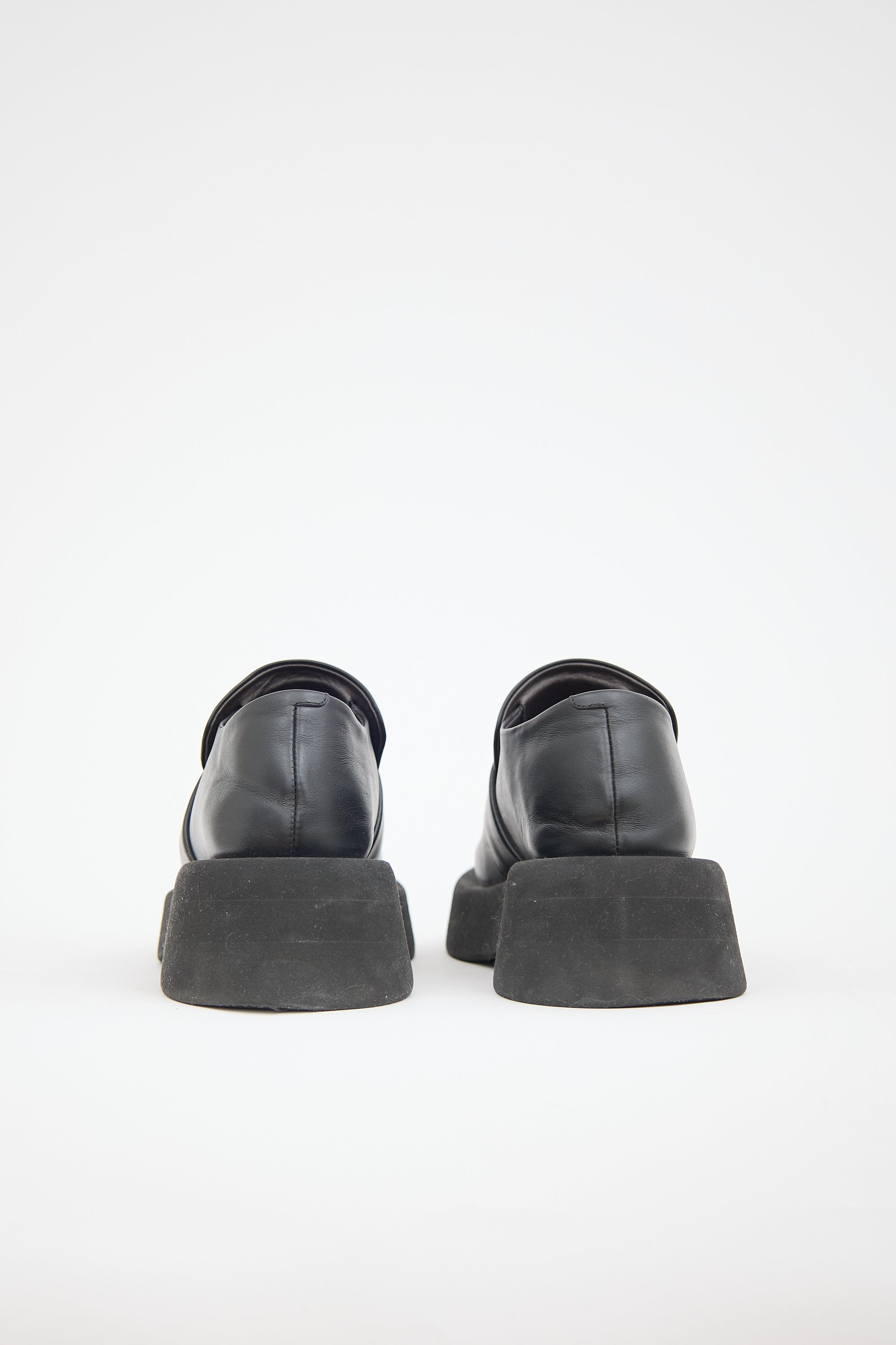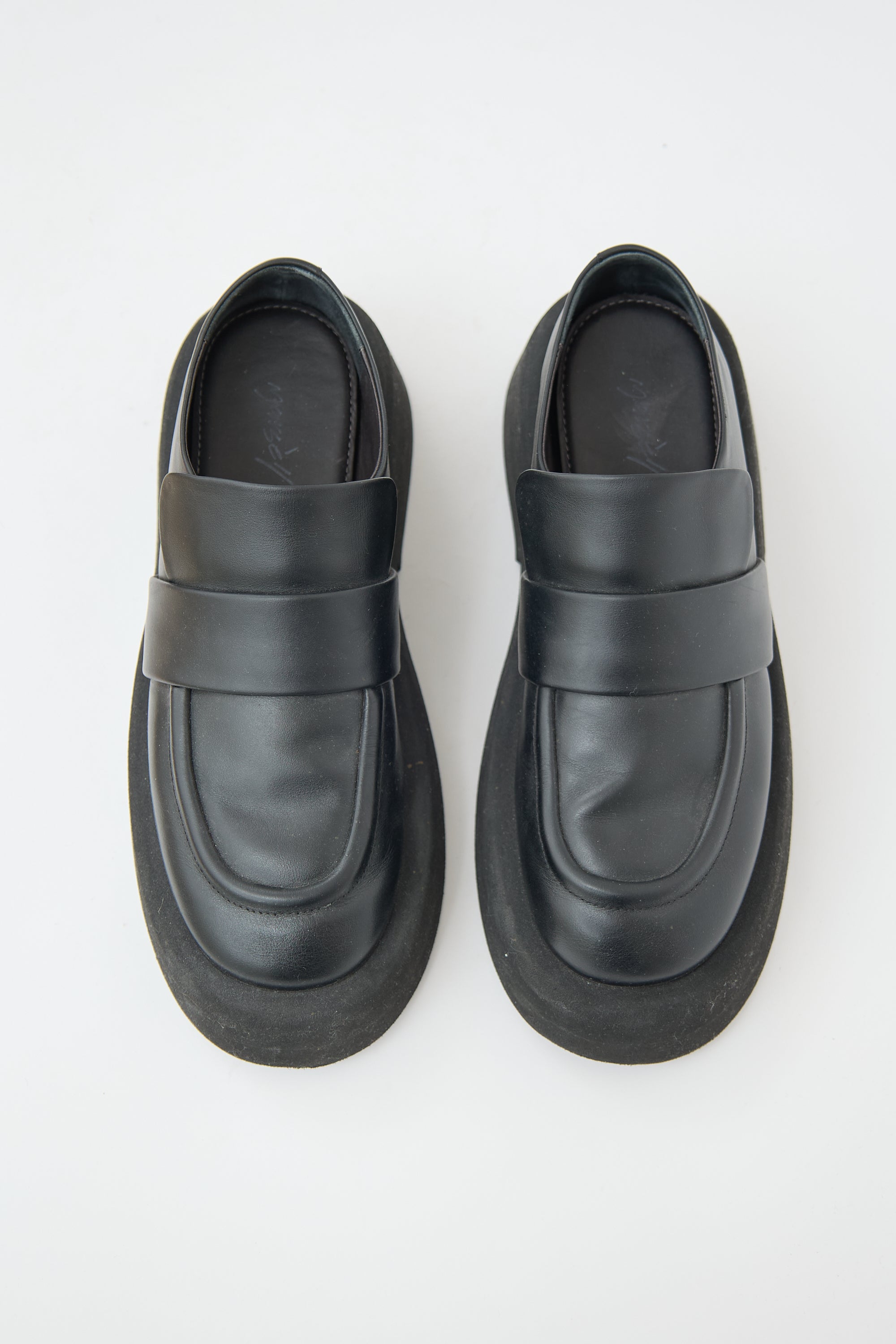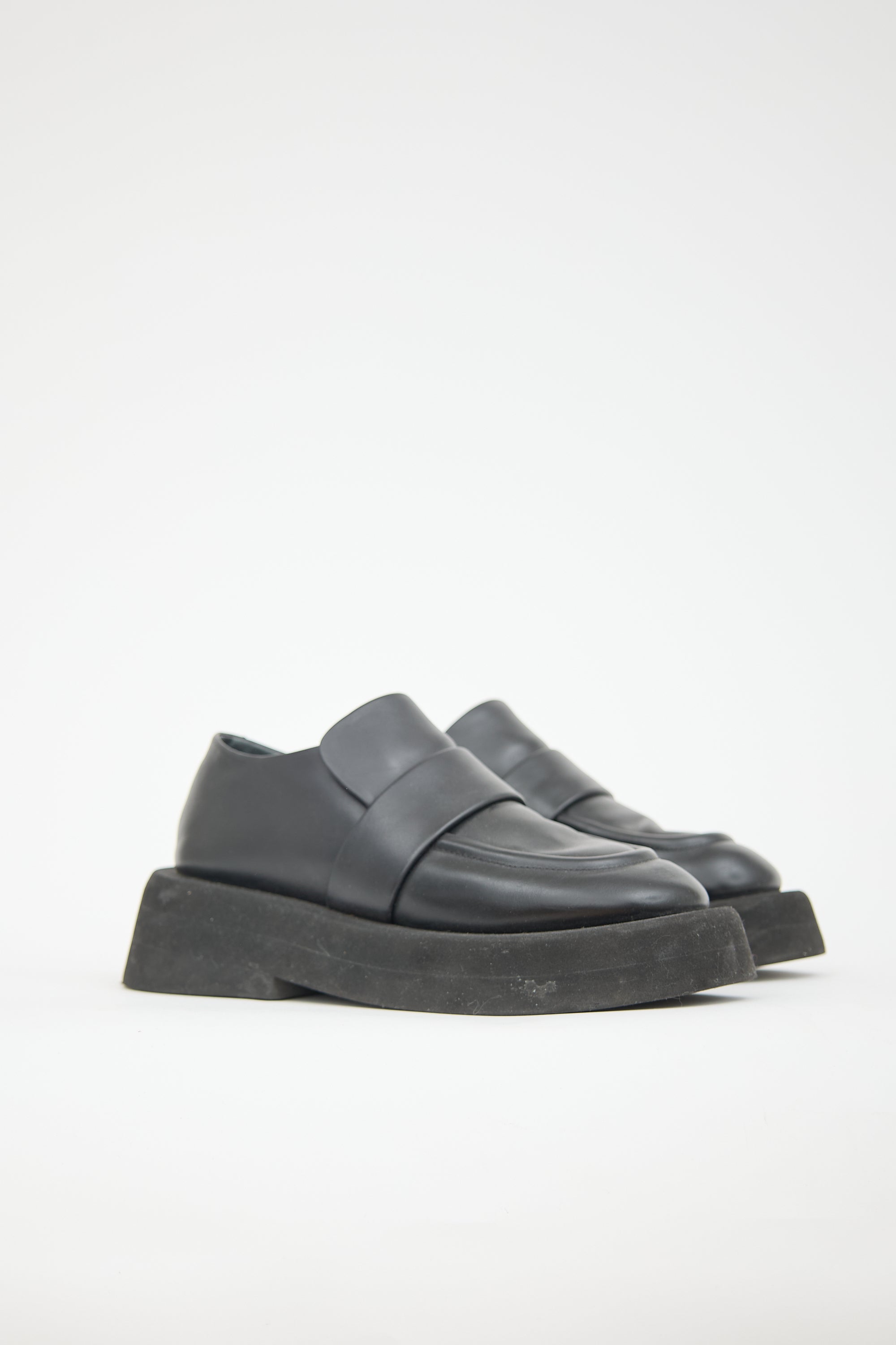 Pre-owned Marsèll black leather Gomellone loafers featuring a rounded moc toe, strap at vamp, foam rubber platform sole, and slip on entry.