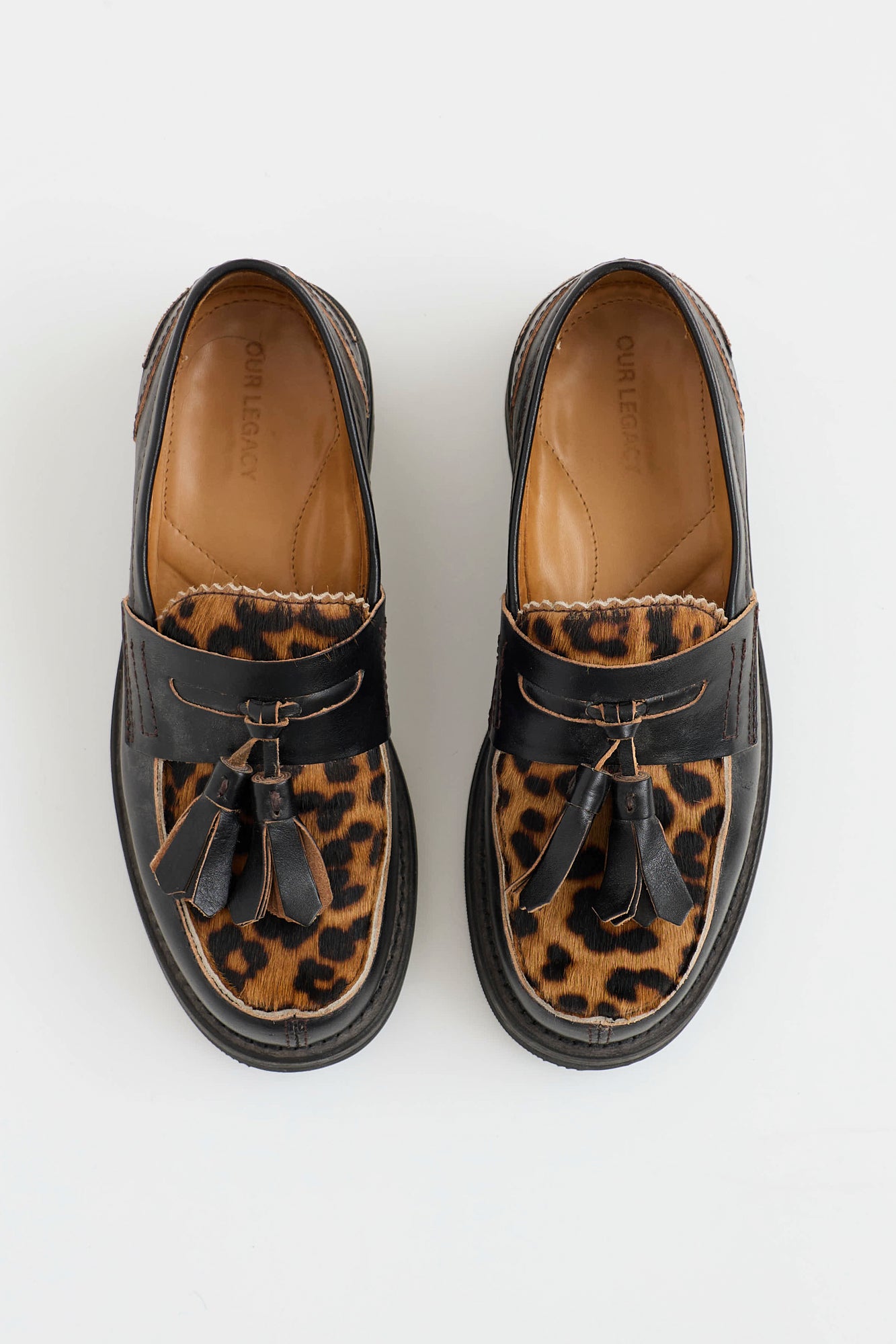 Pre-owned Our Legacy Honky Tonk loafers featuring a rounded toe, slip on entry, leather uppers, leopard pony hair panel, penny strap with tassle details, and a stacked heel.