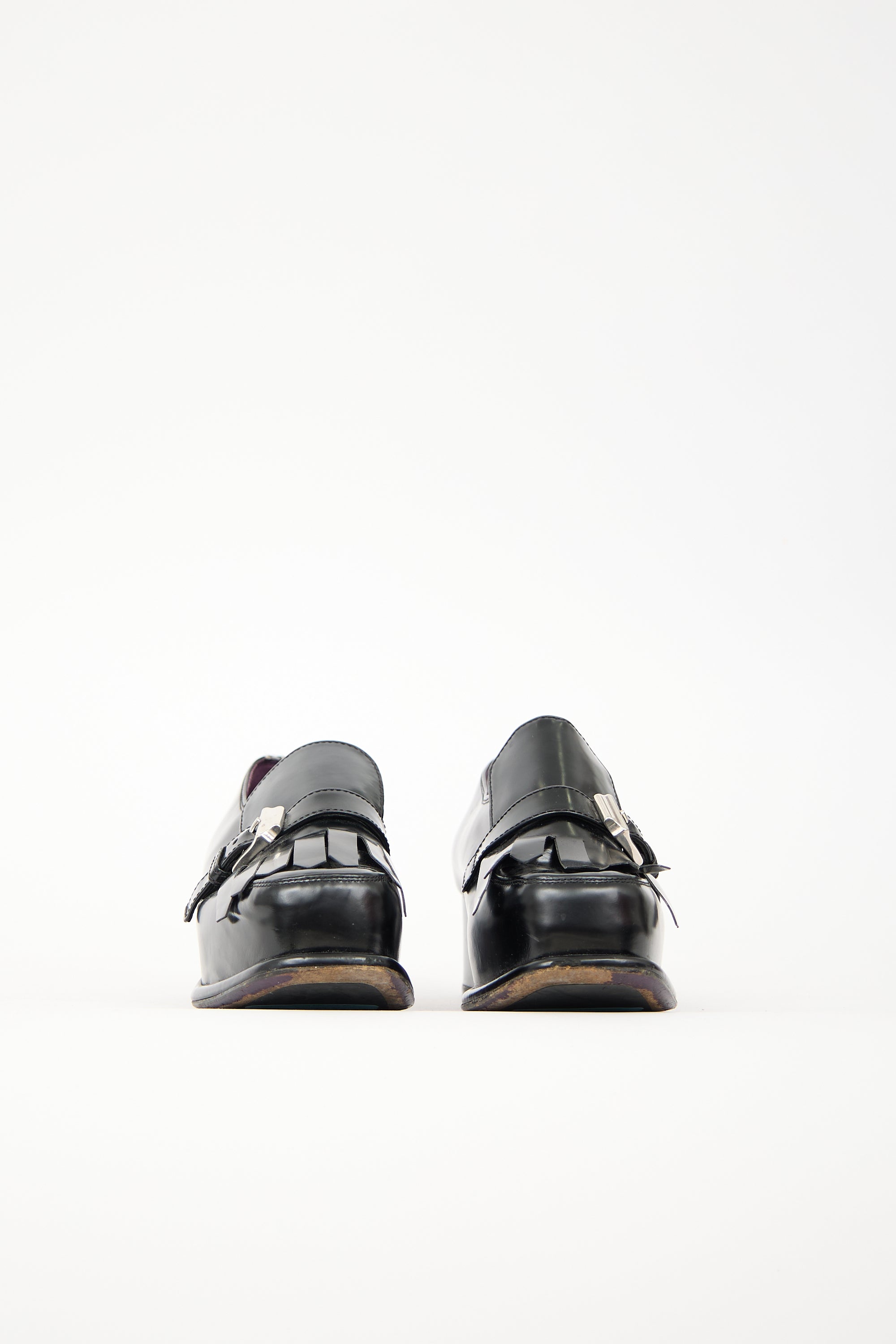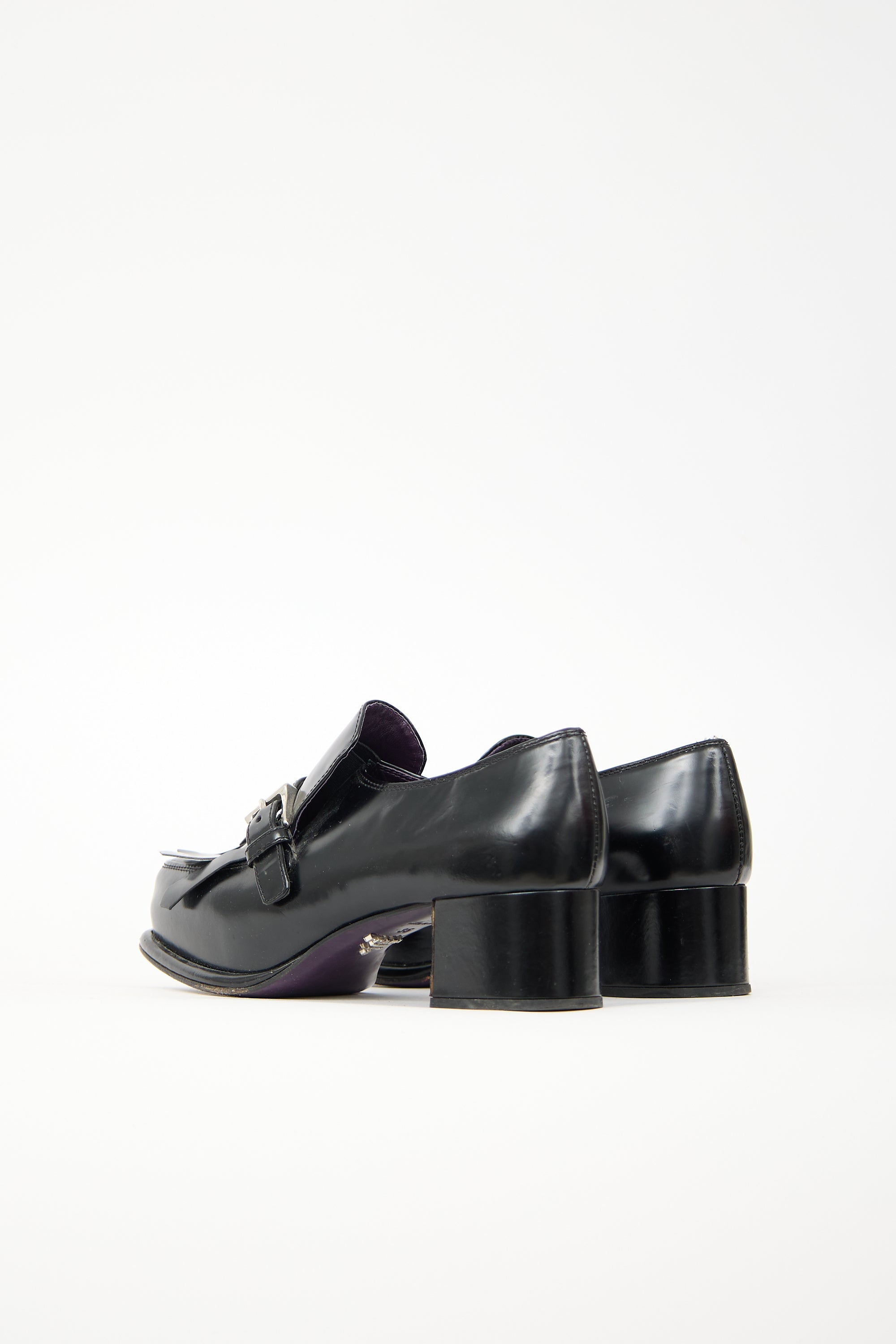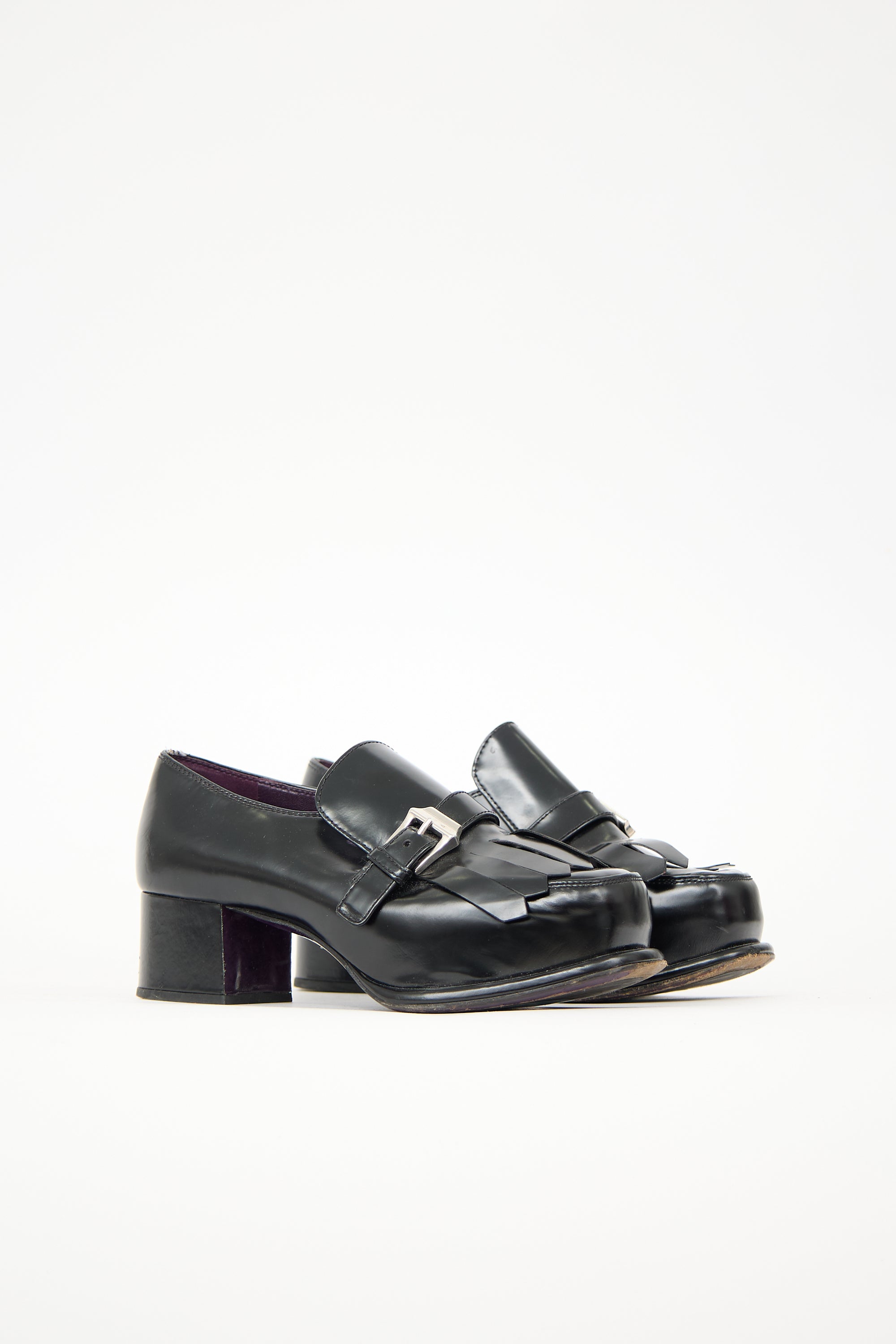 Pre-owned Prada black leather heeled loafers featuring square tie, kiltie fringe with buckled strap at vamp, slip on entry, and covered block heel.