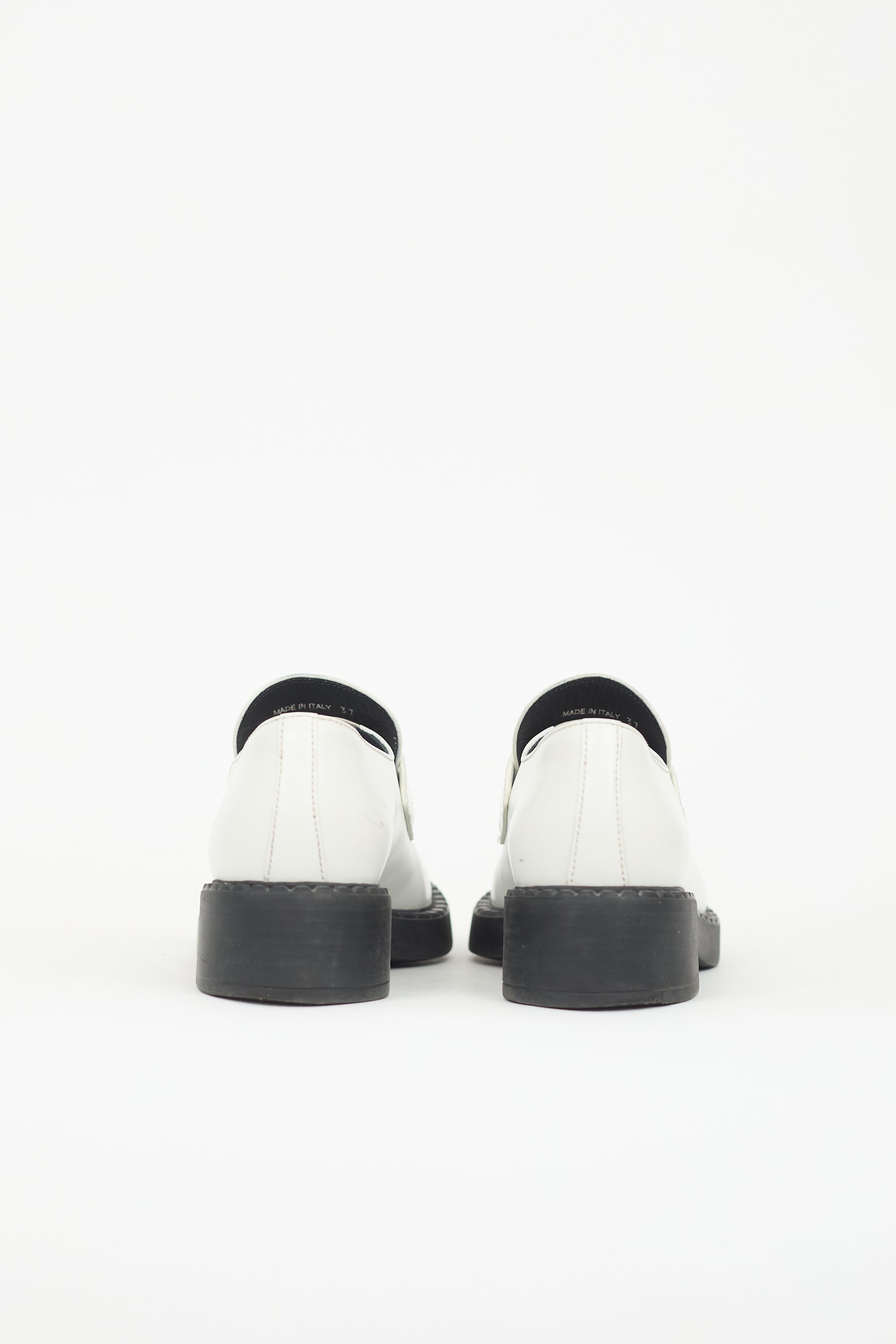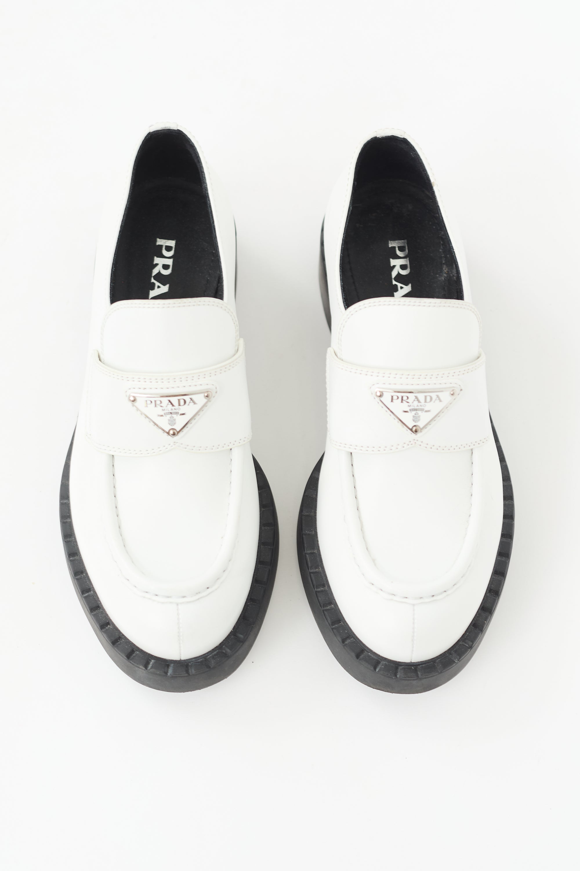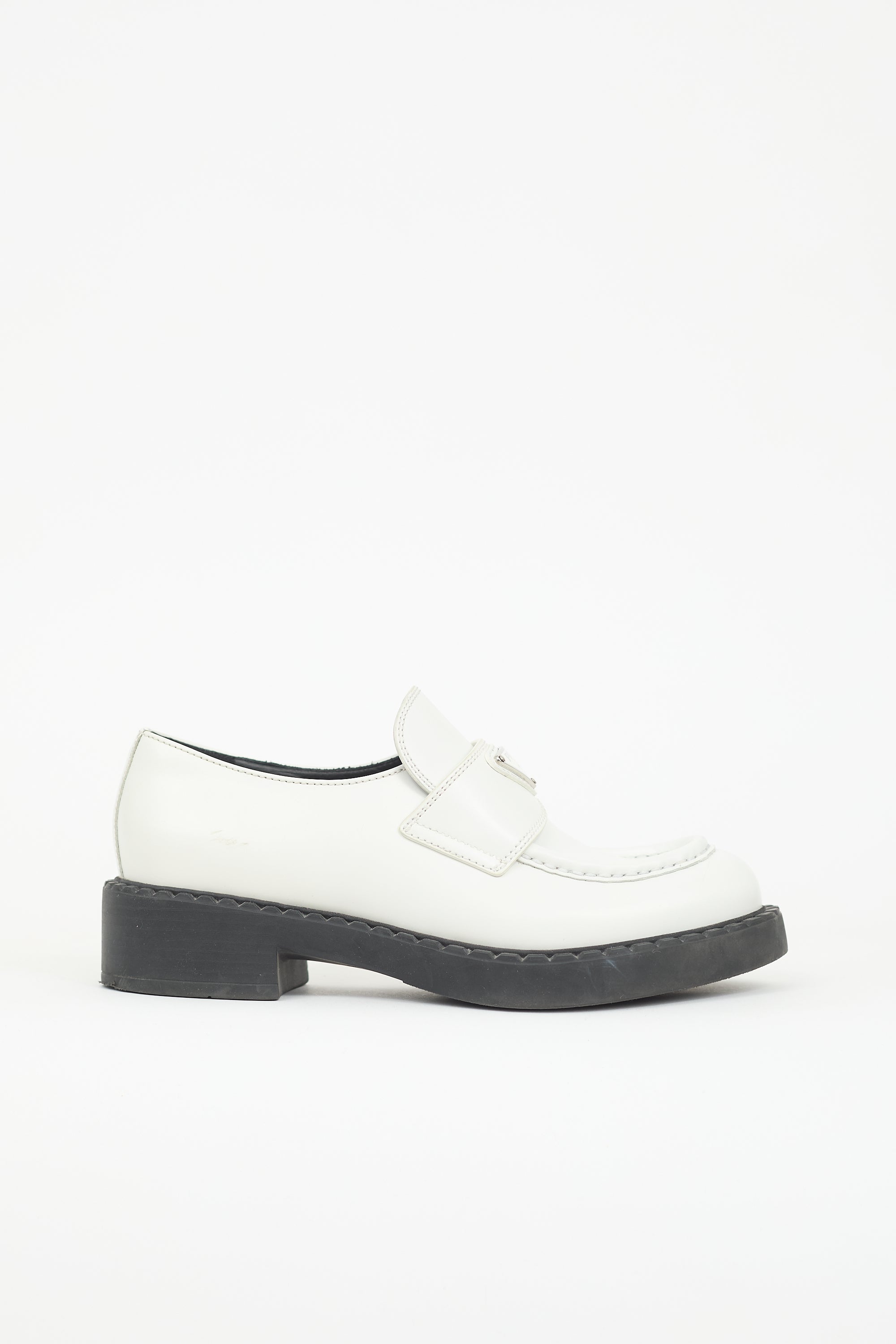 Pre-owned Prada white leather loafers featuring a rounded toe, strap across vamp with silver tone enameled triangle logo plaque, notched topline, and a stacked rubber block heel