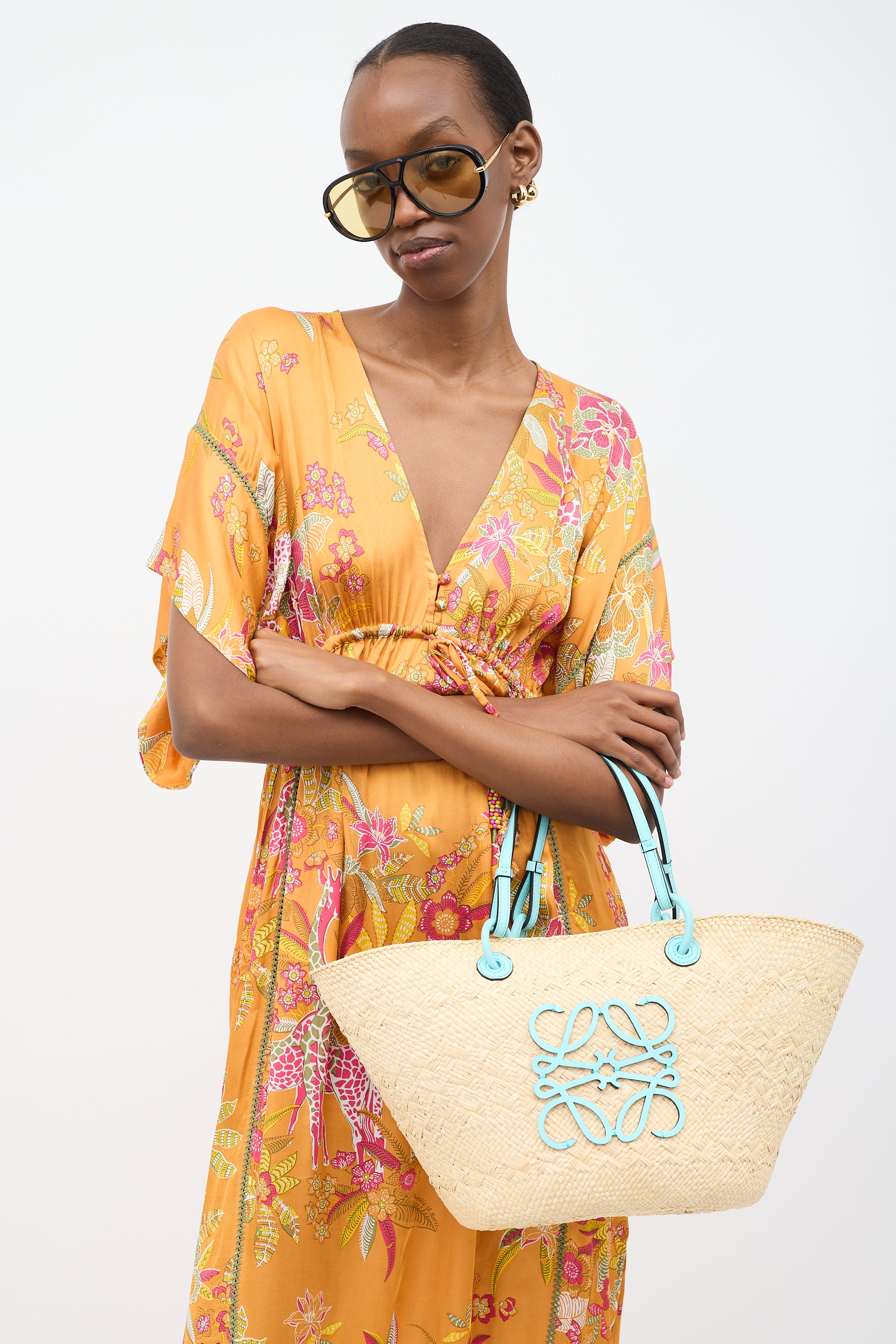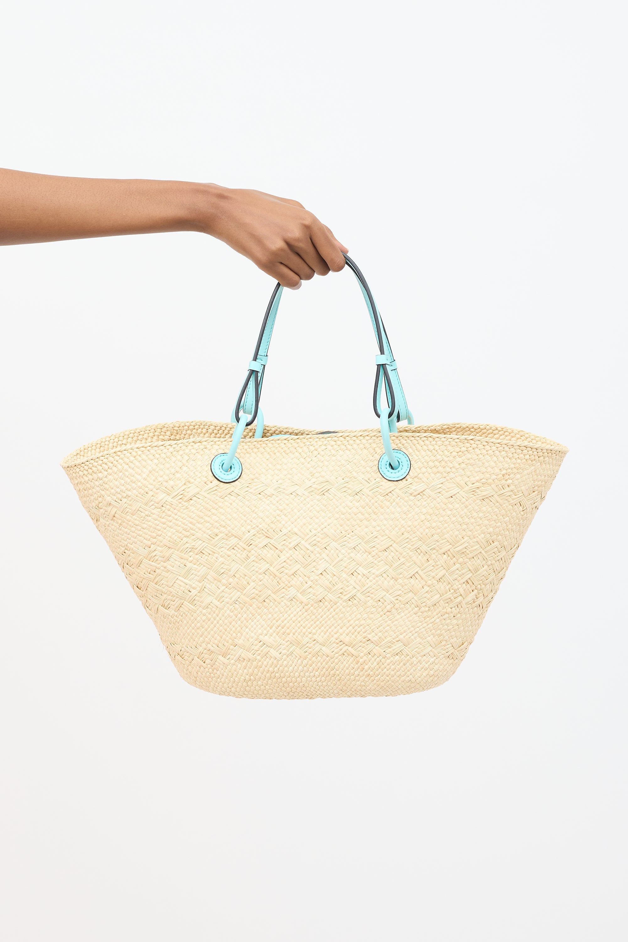 Pre-owned Loewe beige basket bag featuring woven straw body, blue leather accents, front Anagram patch at front, dual rolled and flat top handles, tie top closure, and one main compartment.