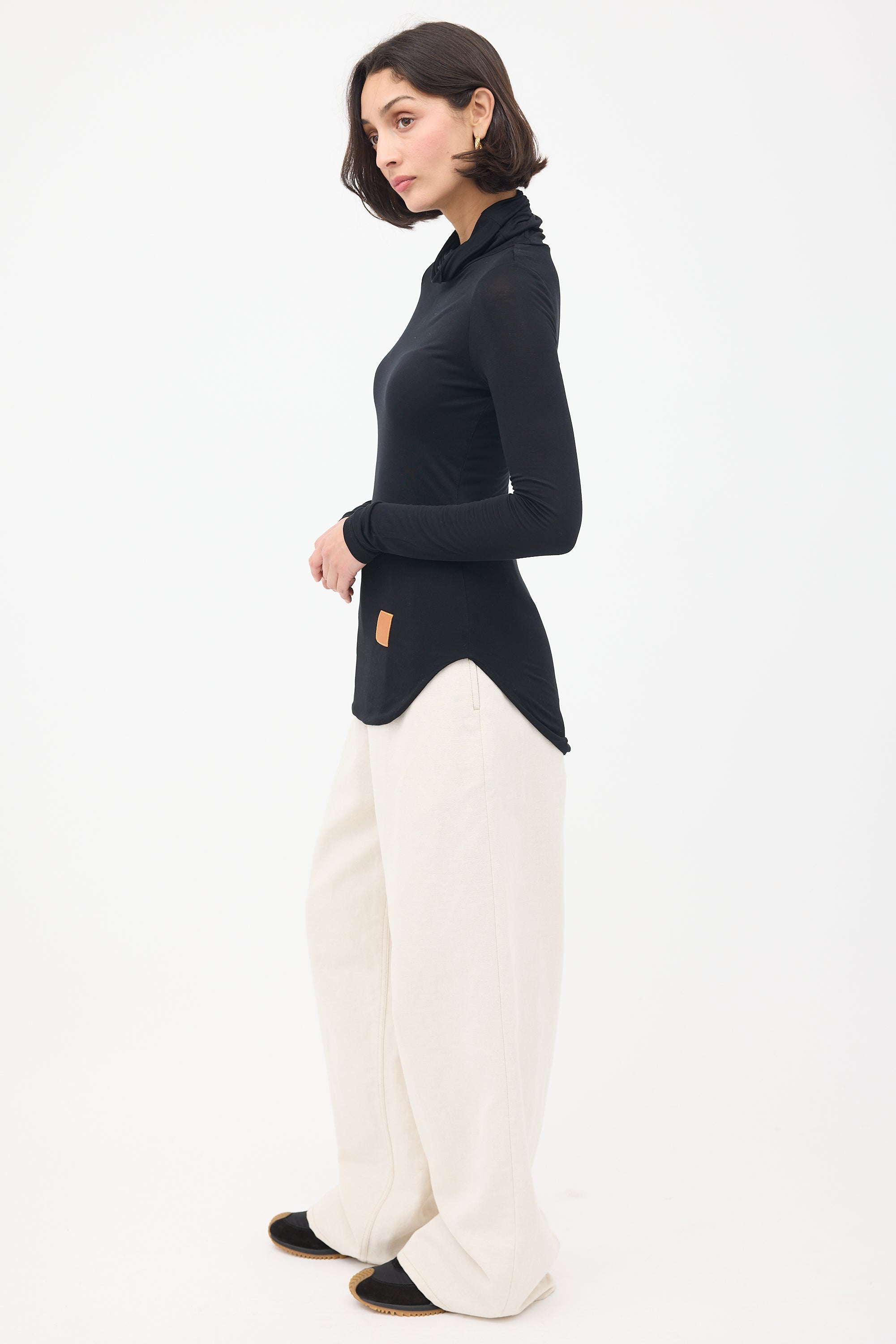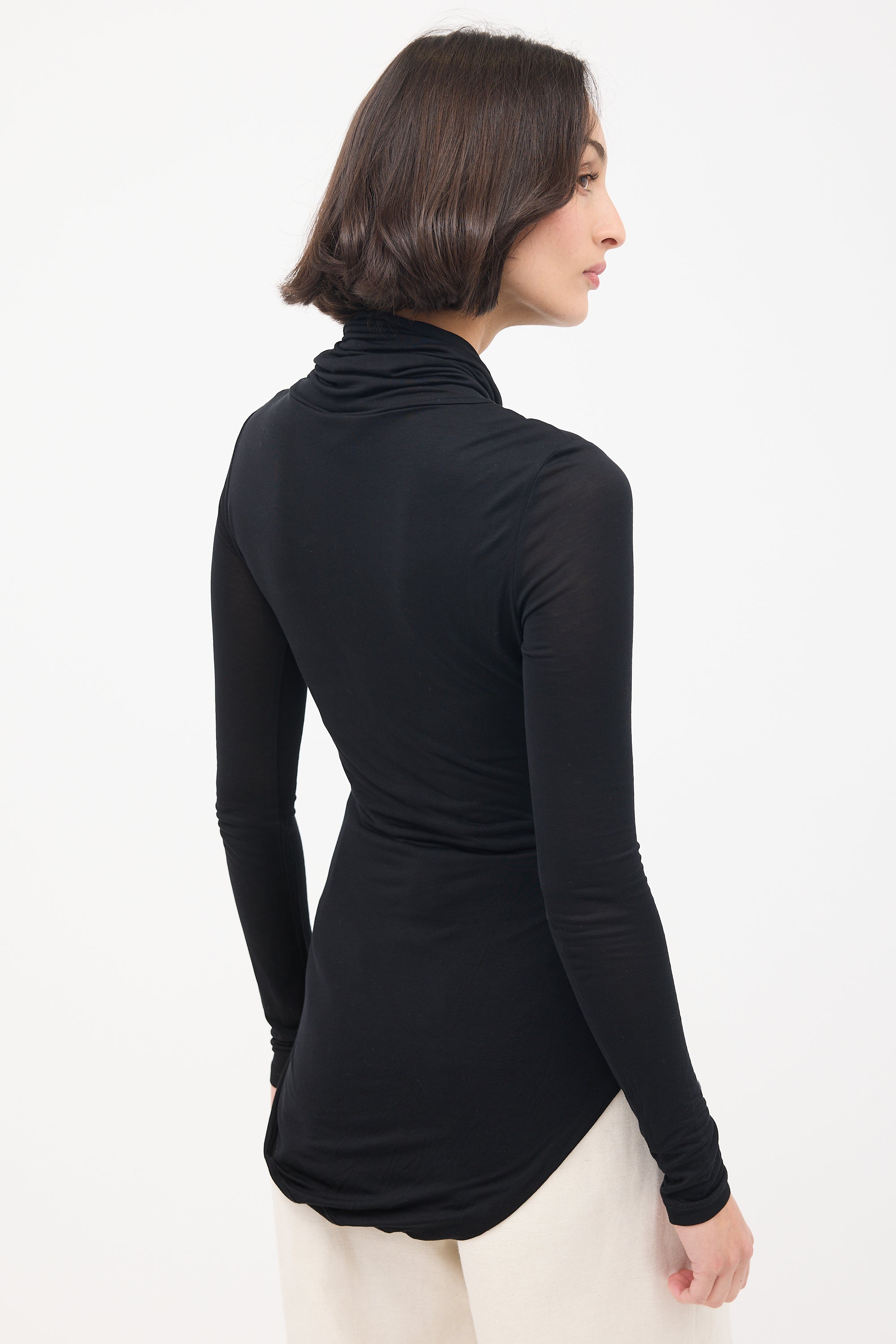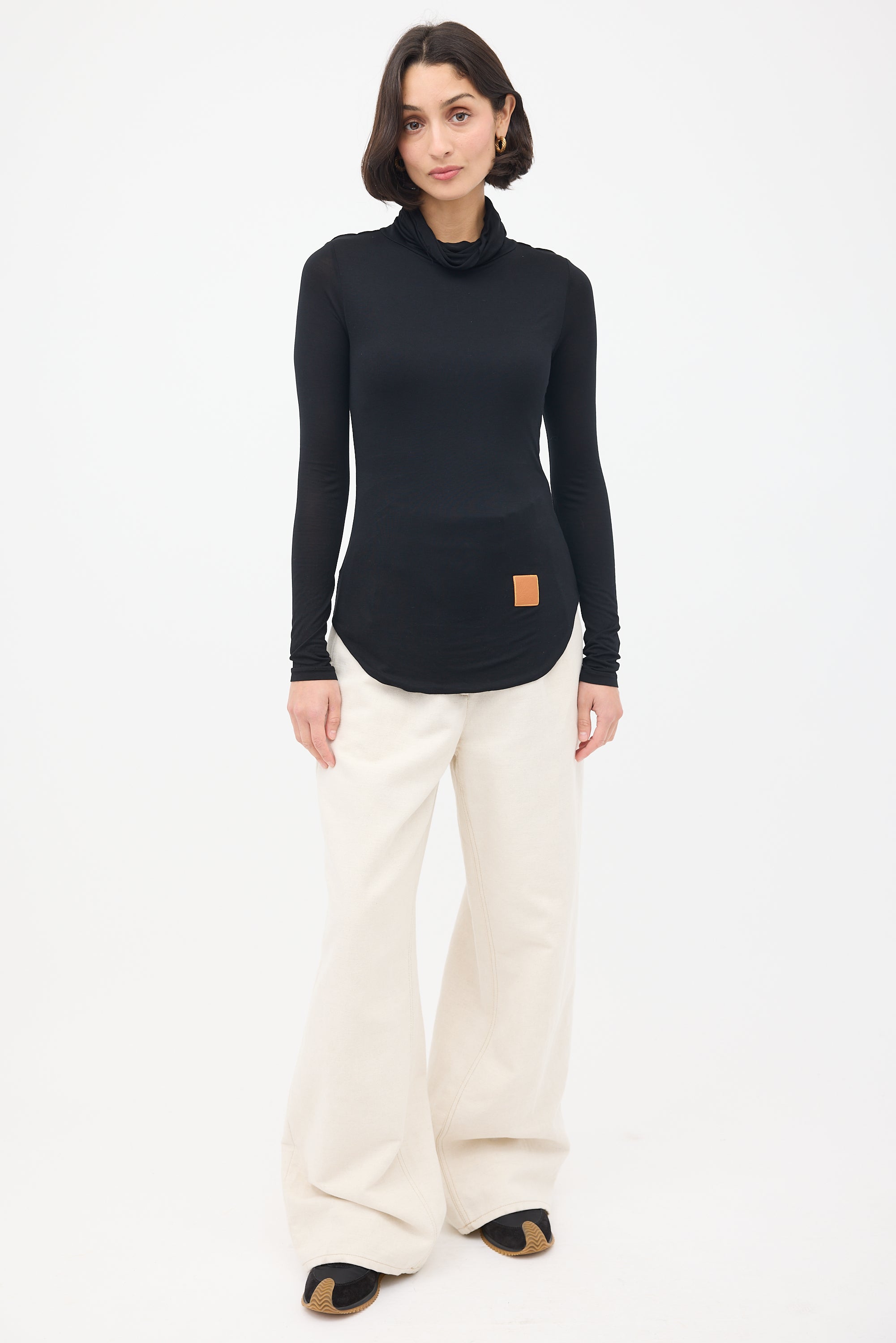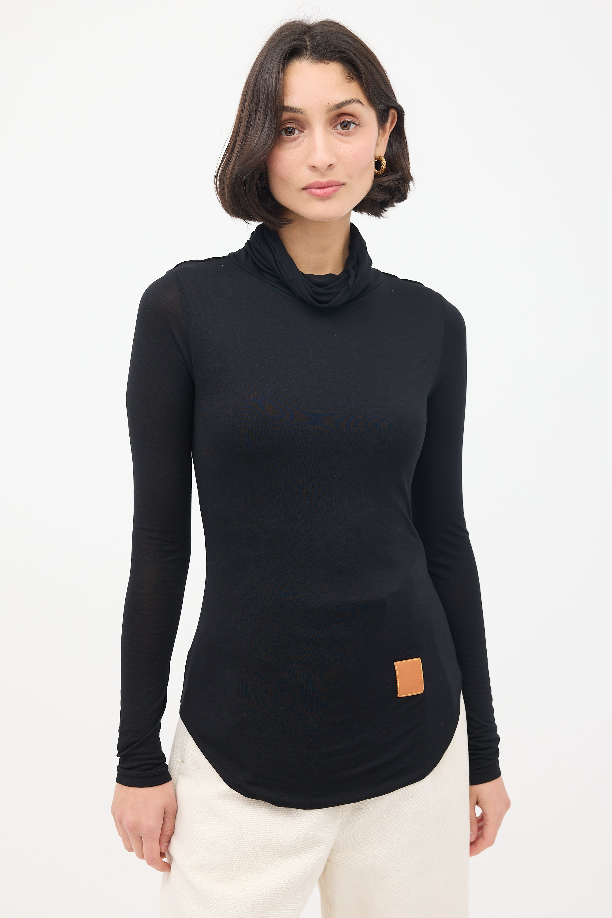 Pre-owned Loewe black silk blend top featuring a high turtleneck with raw edge, brown leather debossed logo patch at lower left, curved hem, and long sleeves.