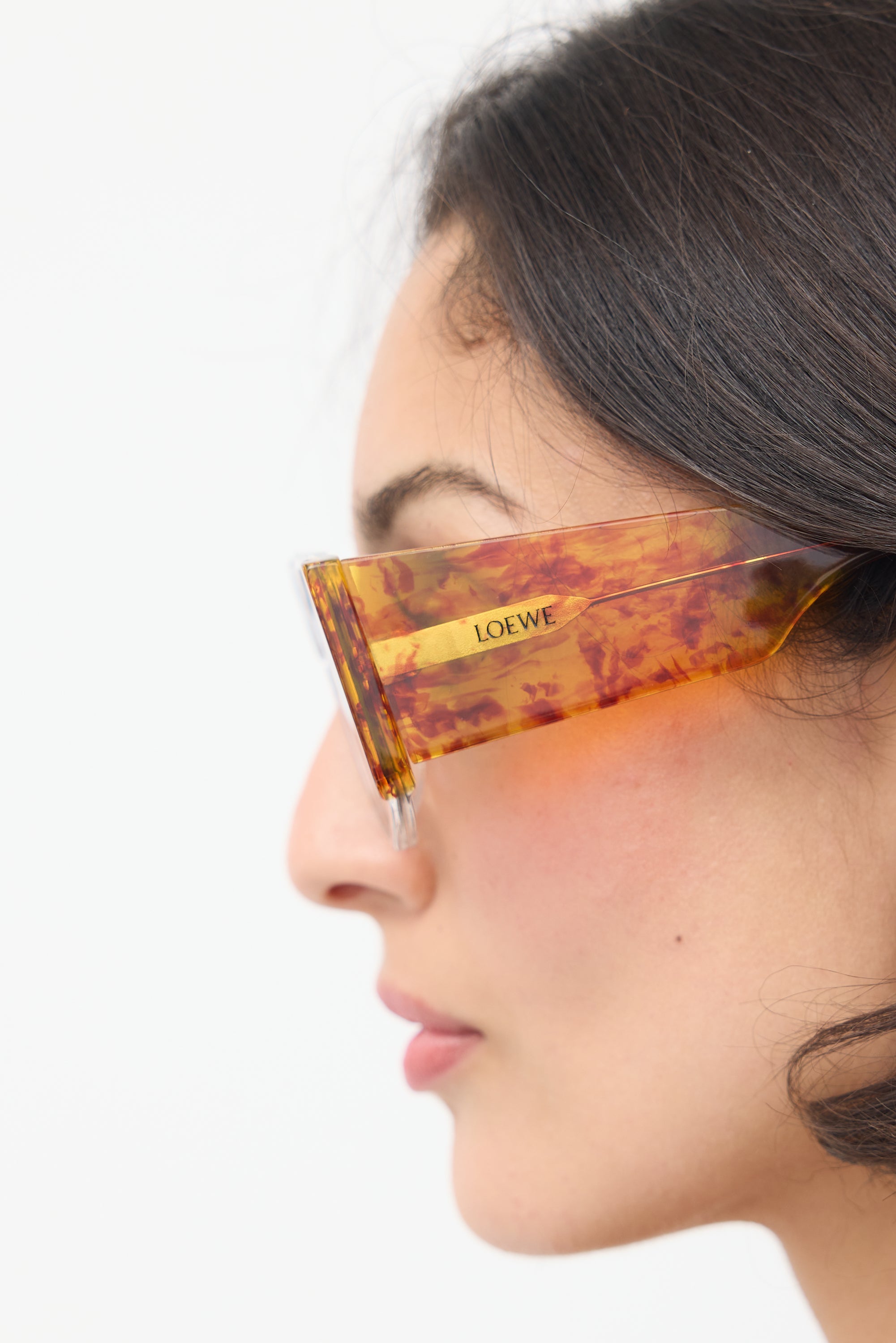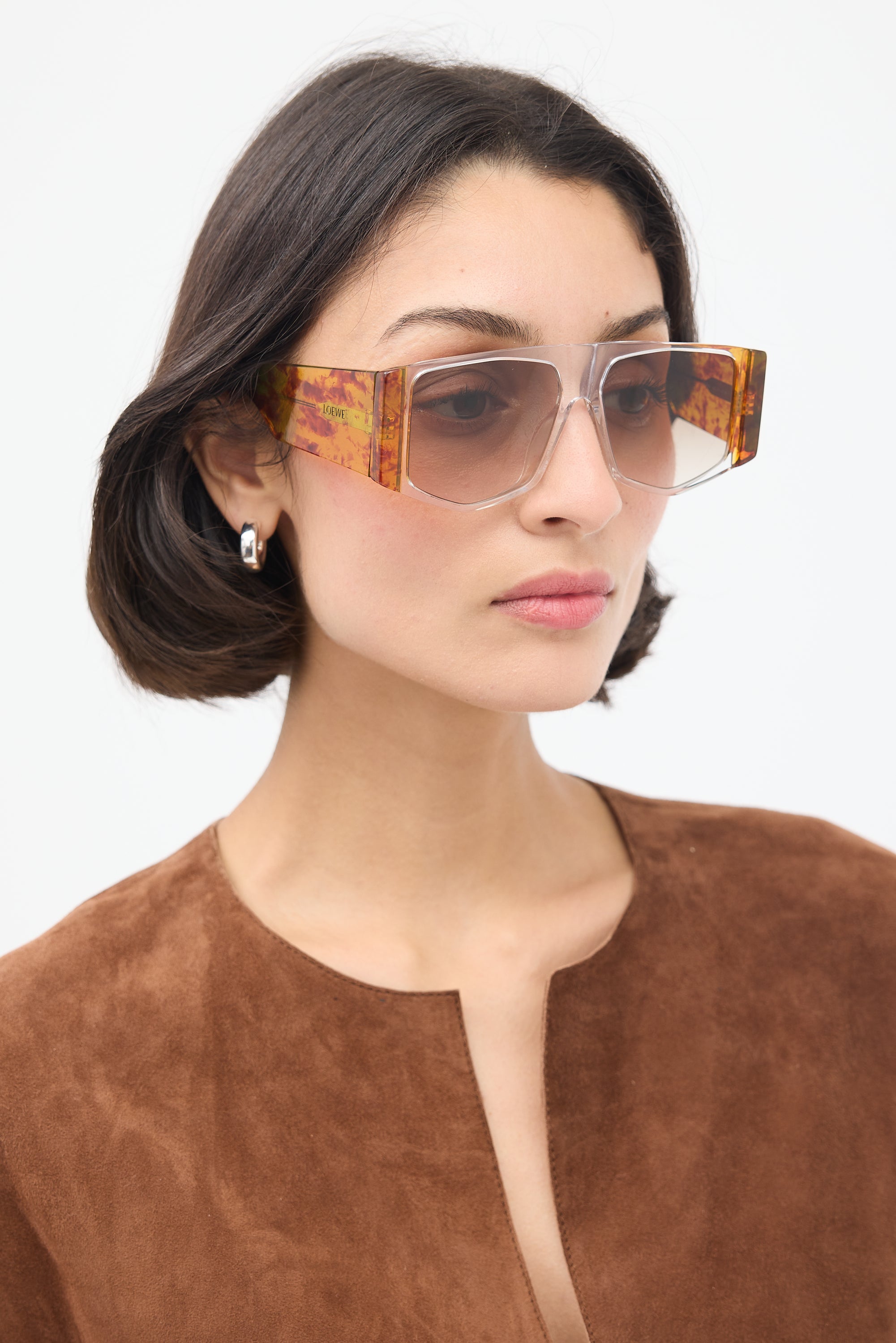 Pre-owned Loewe LW40026U sunglasses featuring grey gradient tinted lenses, transparent angular square frame, brown marbled arms, etched anagram logo at temples, and etched logo at arm tips. Comes with original case.