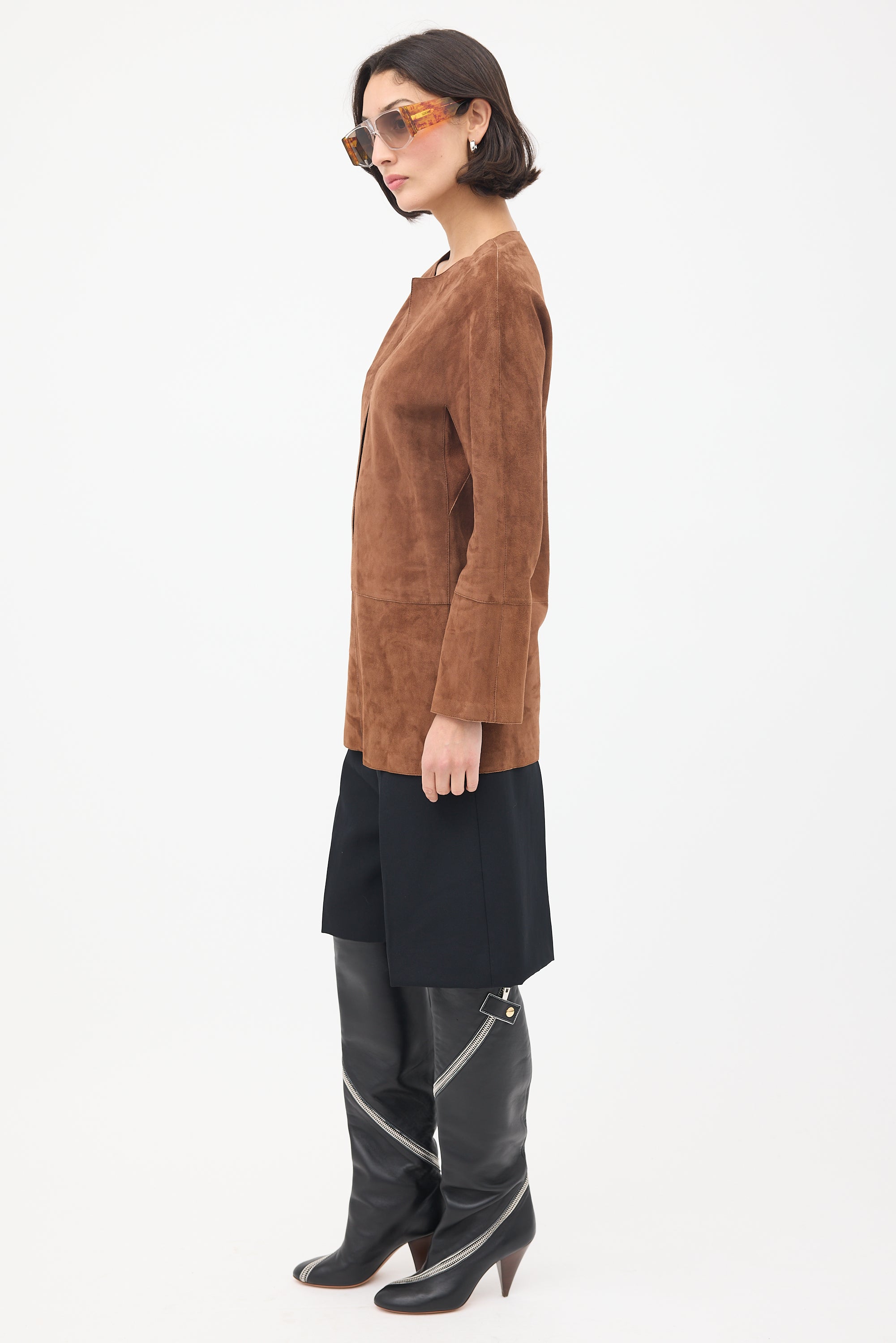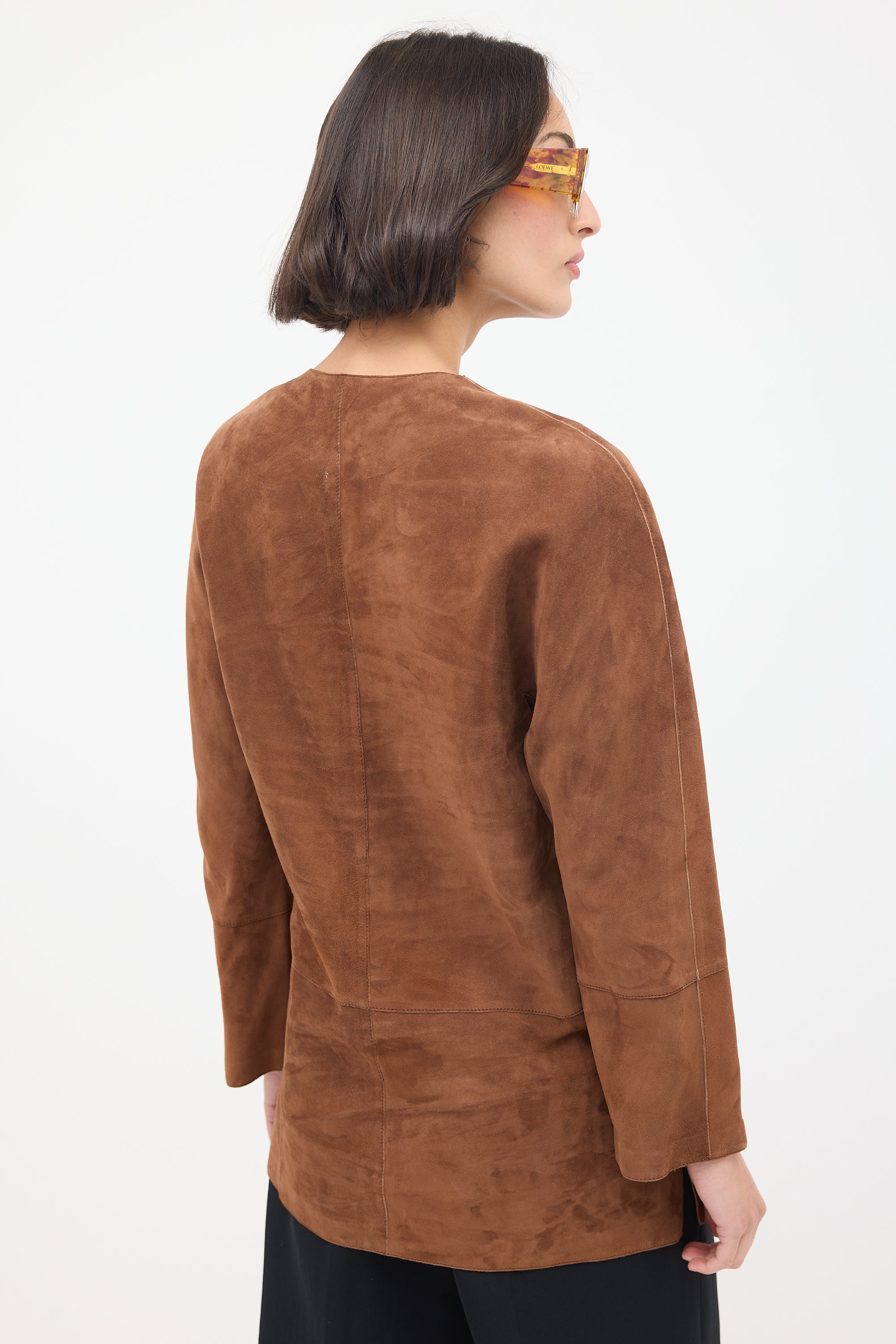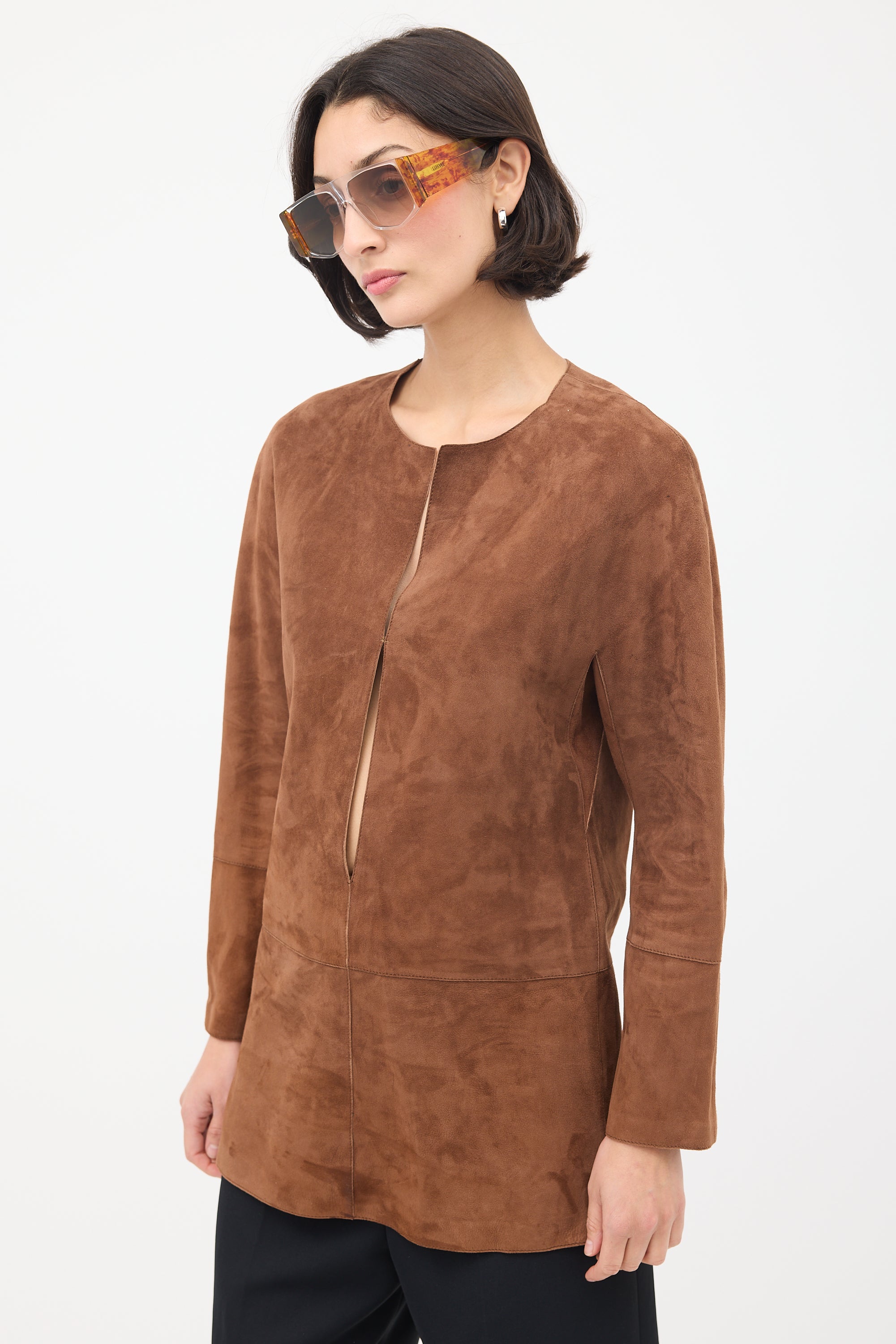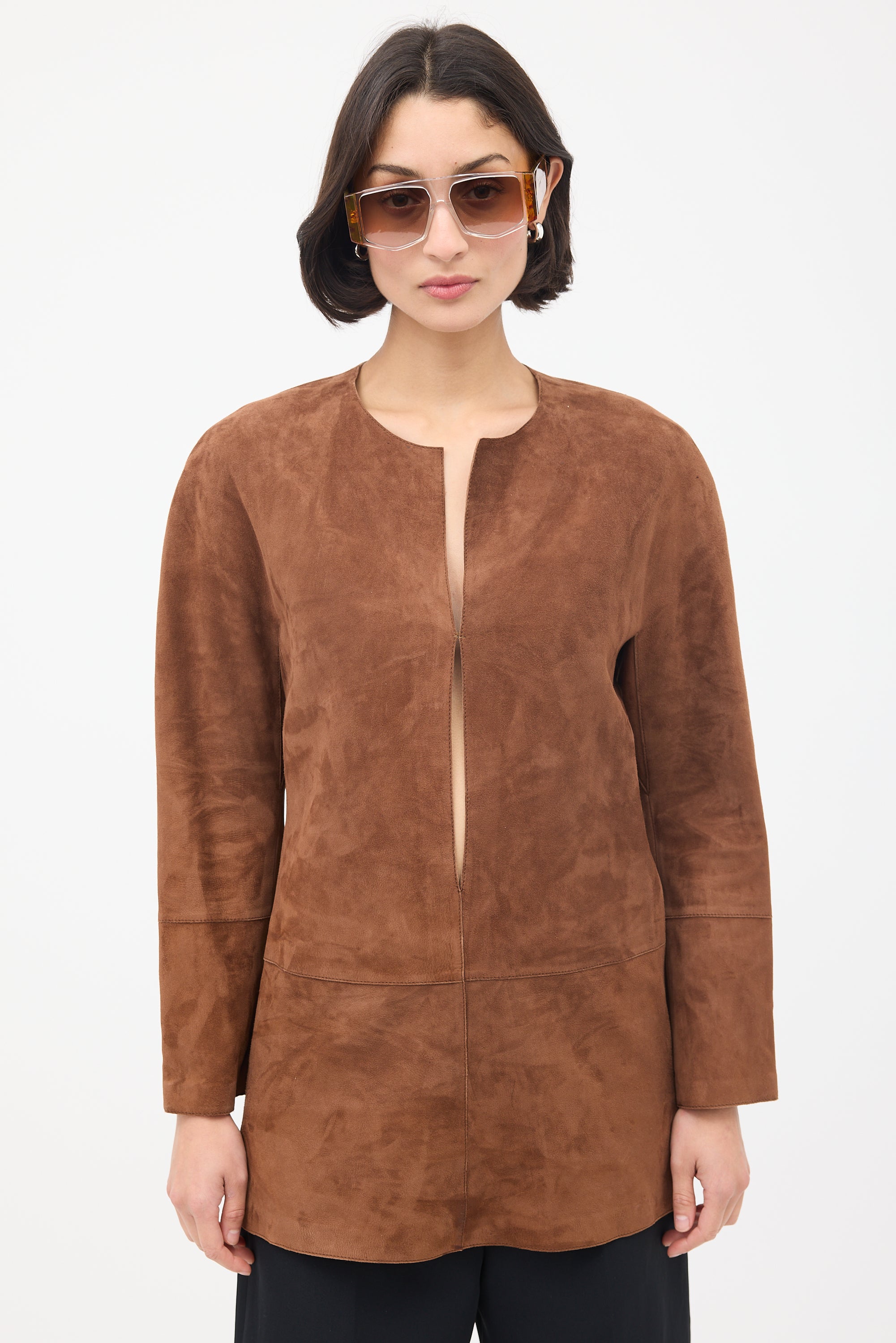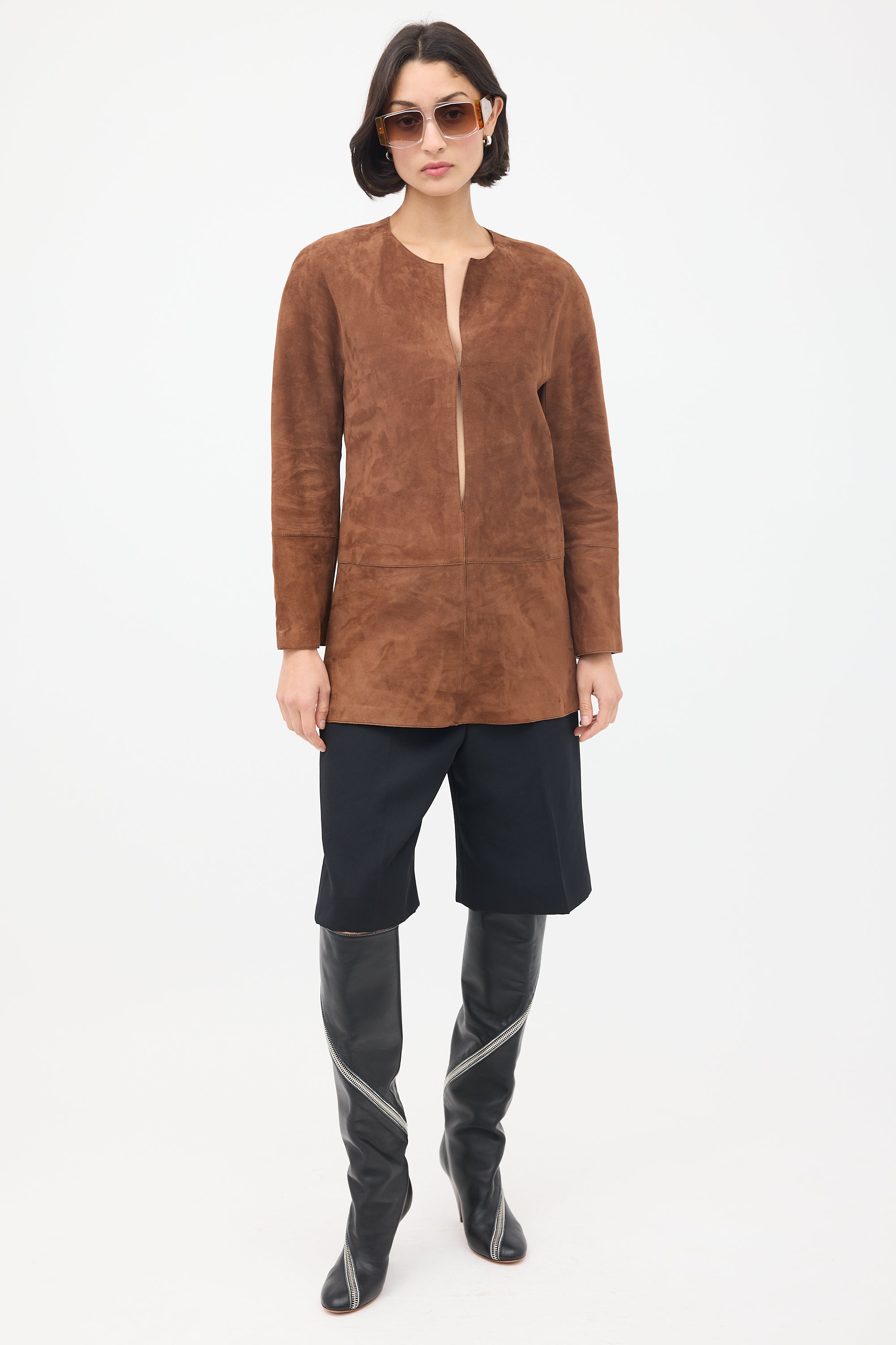 Pre-owned Loewe brown suede tunic top featuring a round neckline with stitched deep V-cutout, paneled construction, side slits, and long sleeves.