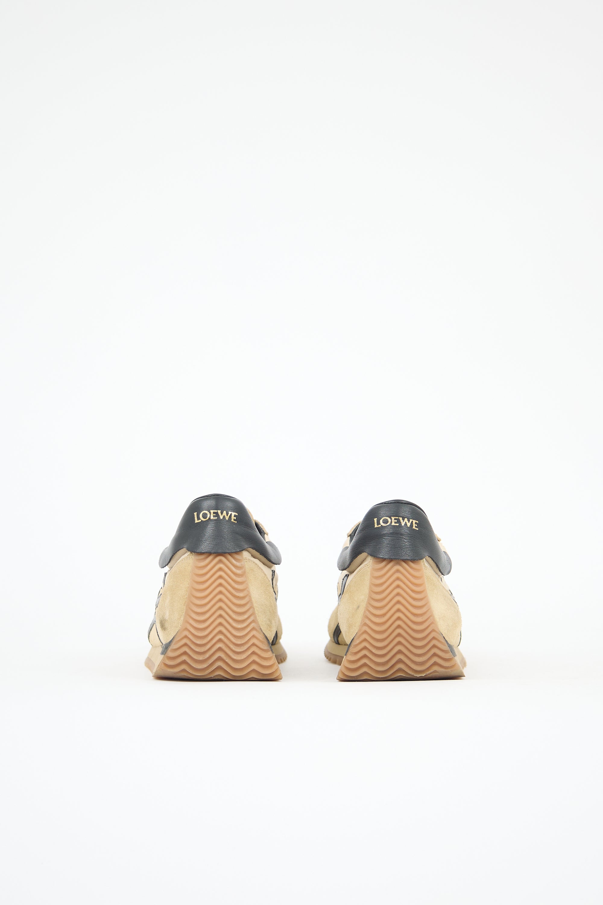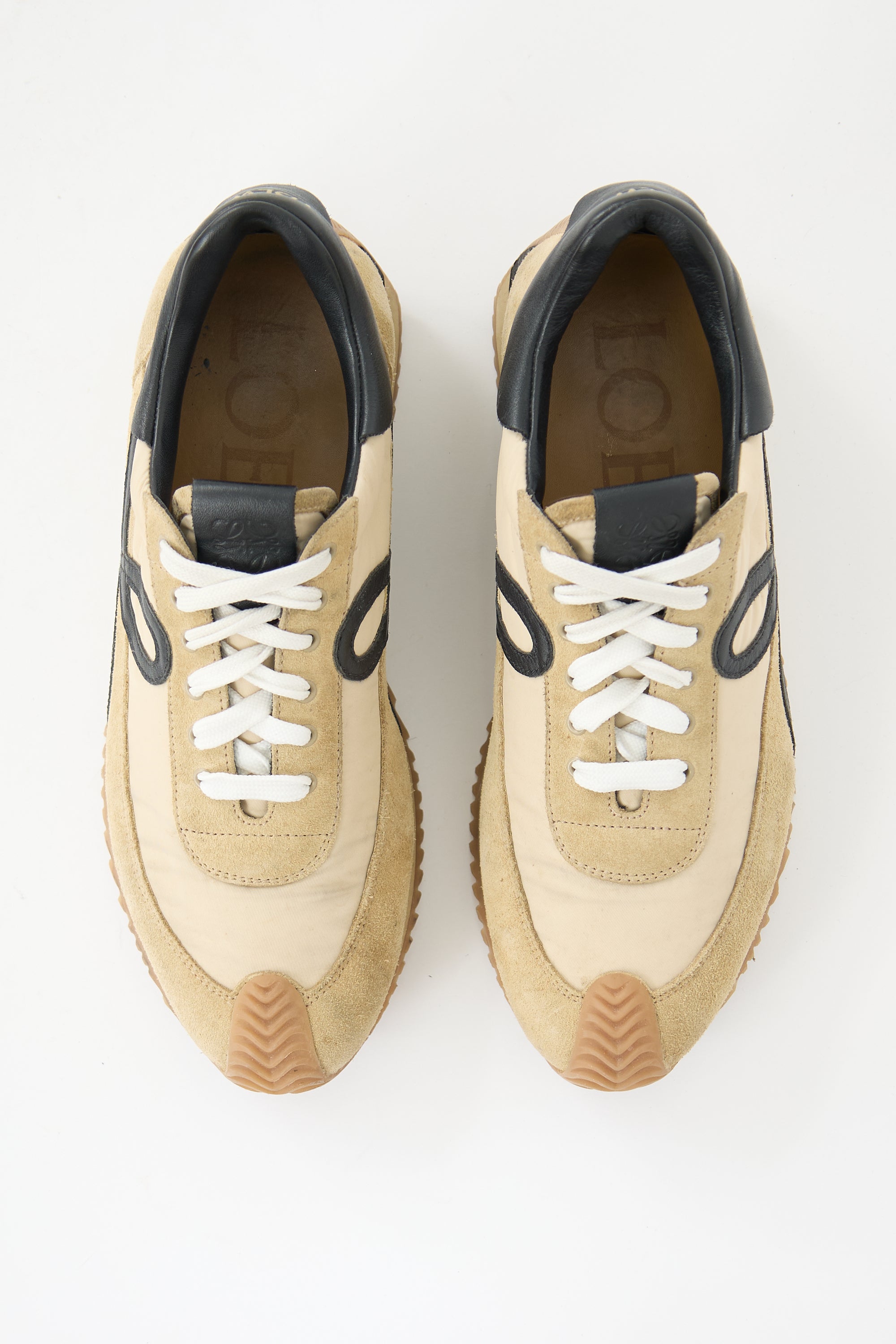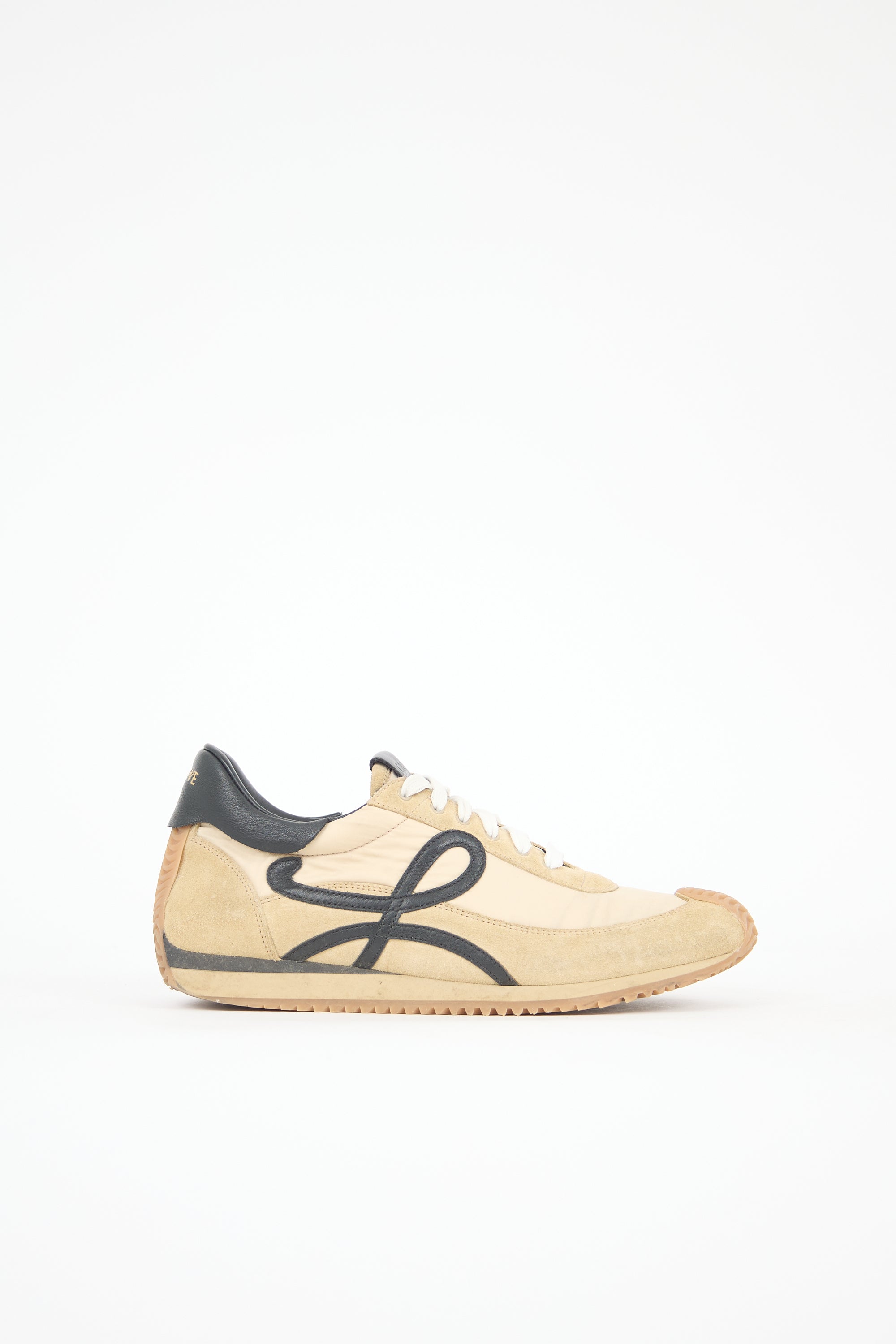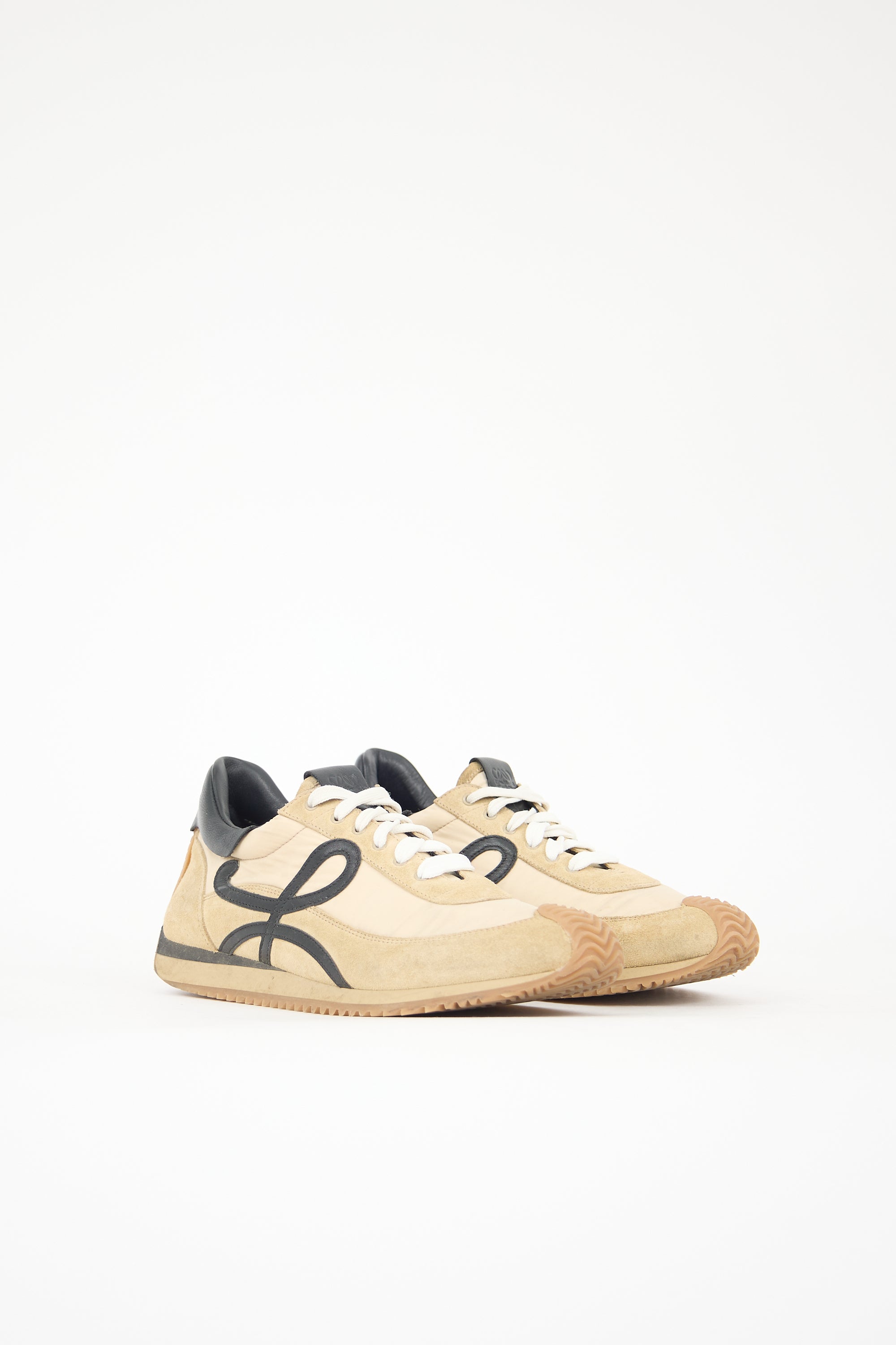 Pre-owned Loewe beige and black Flow Runners featuring a rounded toe, suede and nylon uppers, lace up vamp, debossed Anagram logo tab at tongue, stamped gold tone logo at leather counter, signature L logo at sides, and wavy gum sole.