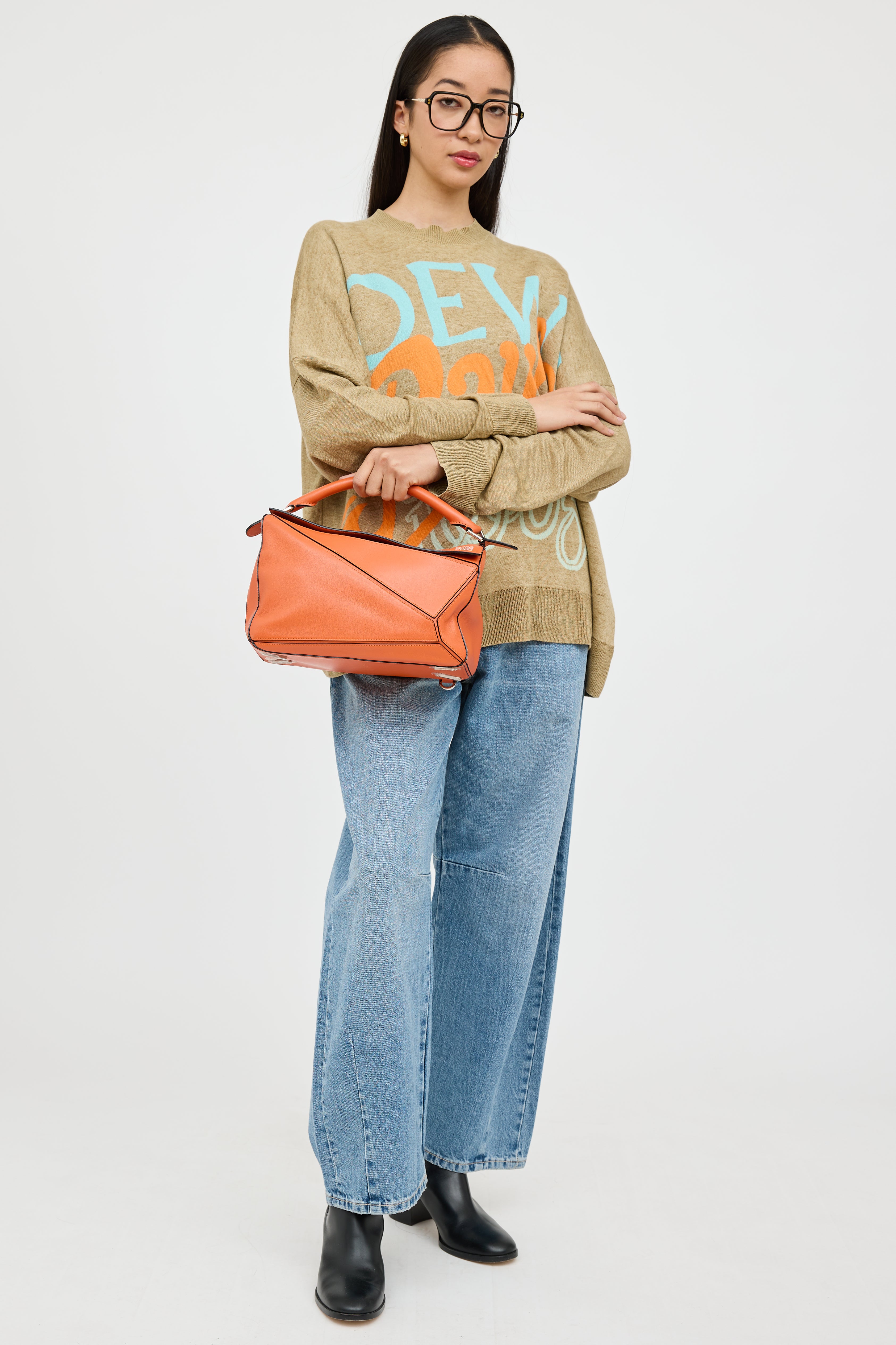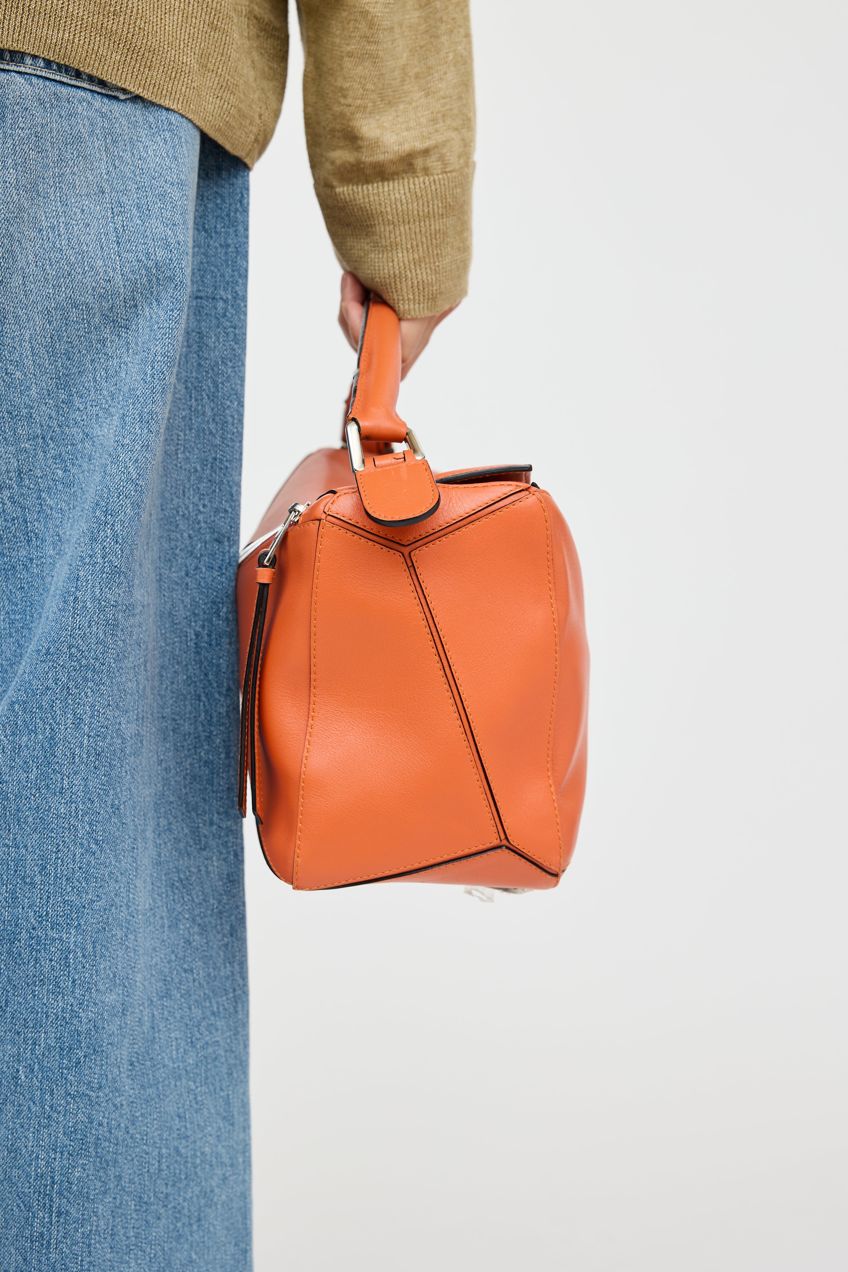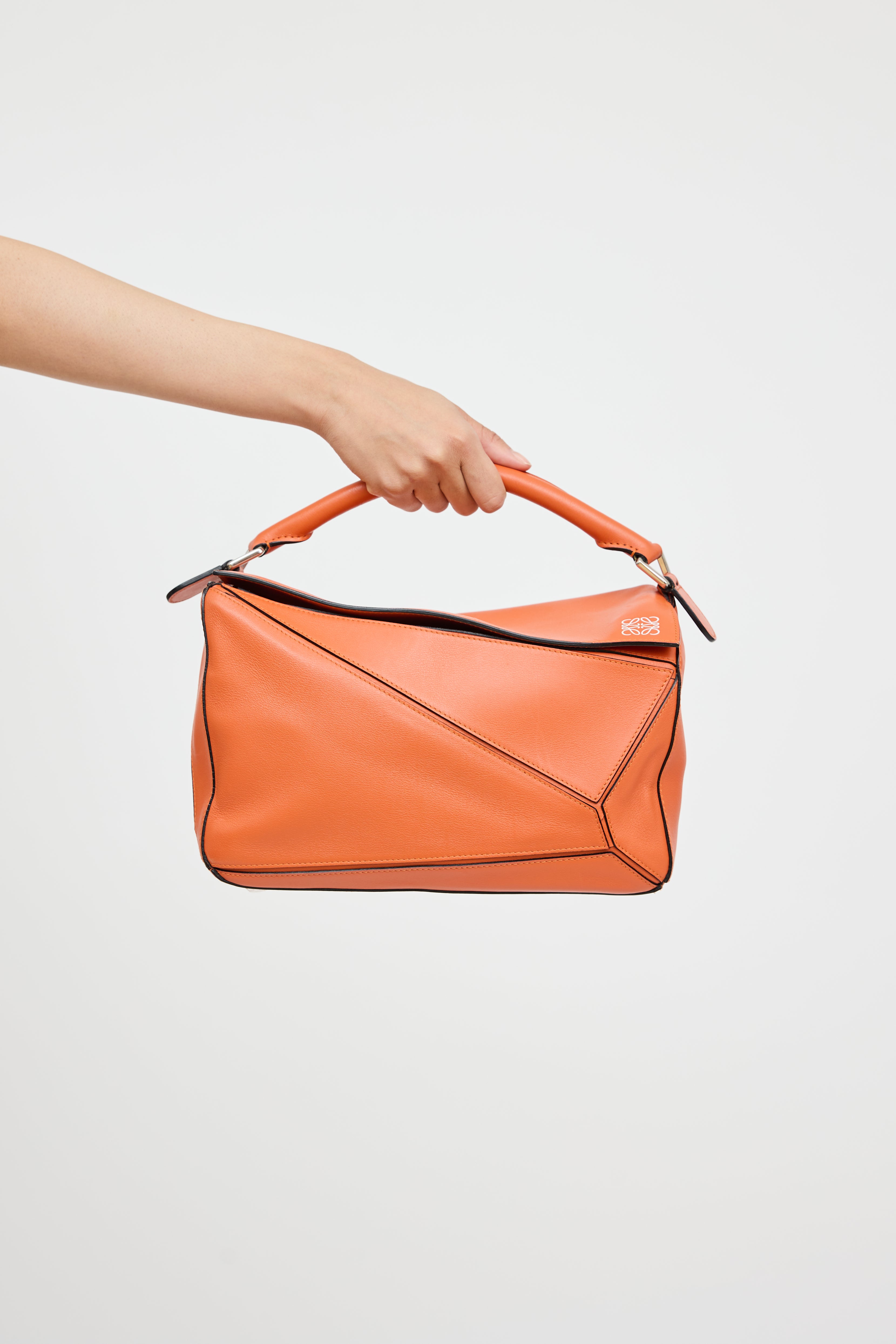 Pre-owned Loewe orange leather medium Puzzle bag featuring tonal stitching silver tone hardware, four protective feet at base, panel design, one zip pocket and D ring at back side, single rolled top handle, detachable and adjustable shoulder strap, top flap with white stamped logo, concealed top zip closure with long leather pull tab, and one canvas lined main compartment with two slip pockets.
