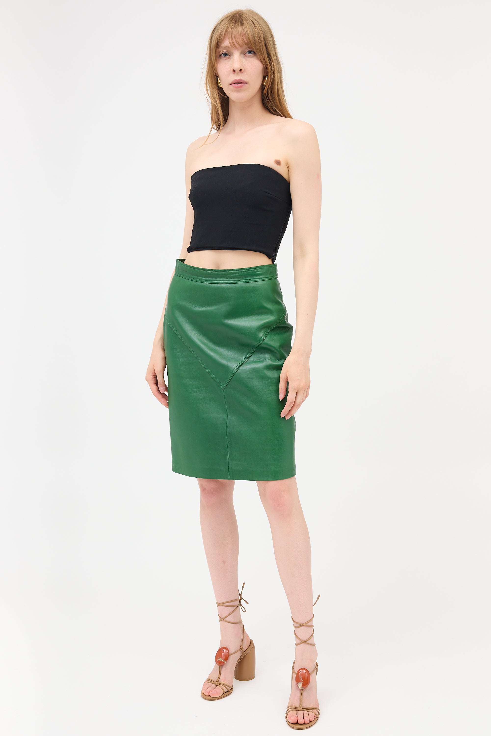 Pre-owned Loewe vintage green leather skirt featuring a high waist, back zip closure with leather Anagram covered button fastening, and tonal top seams.