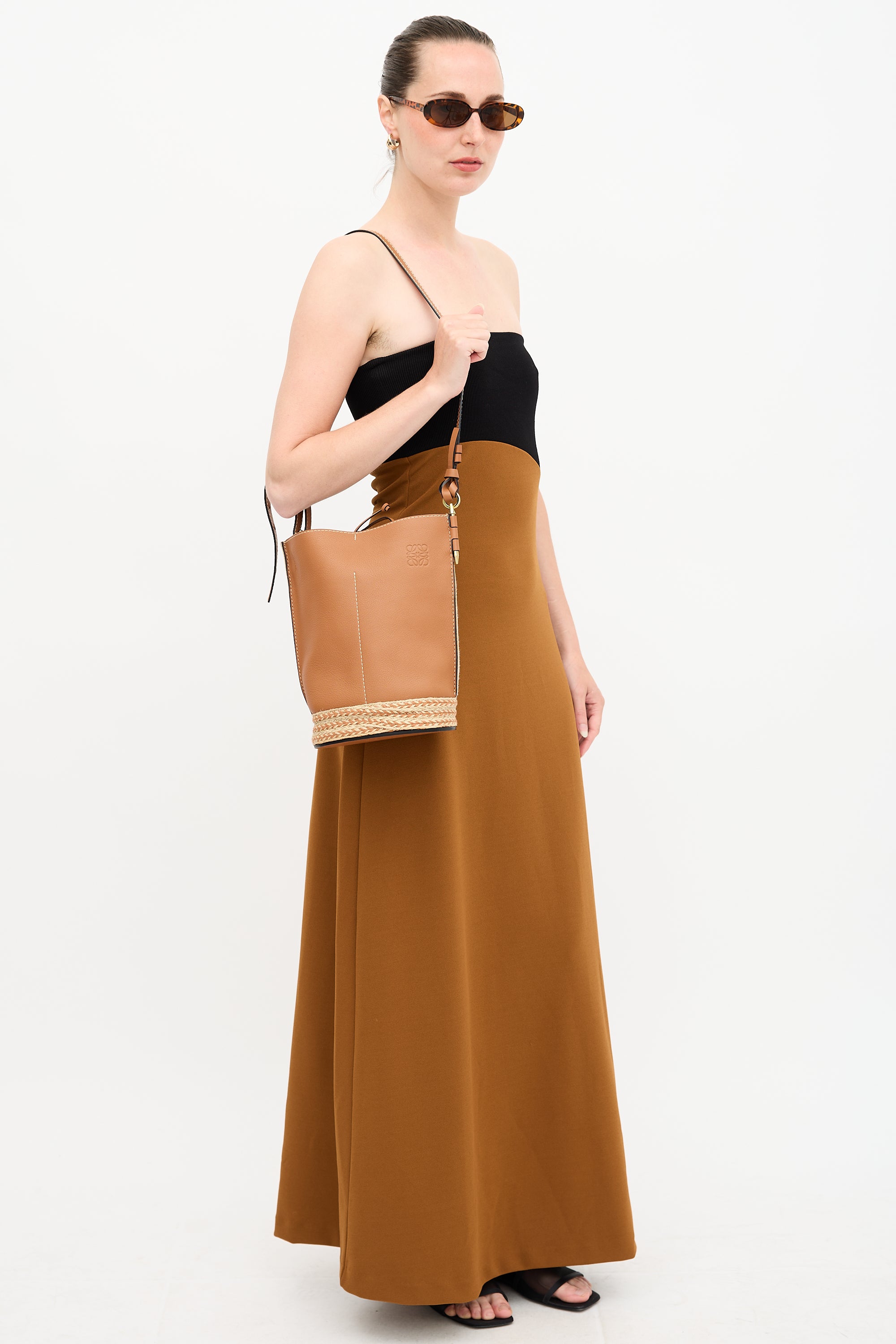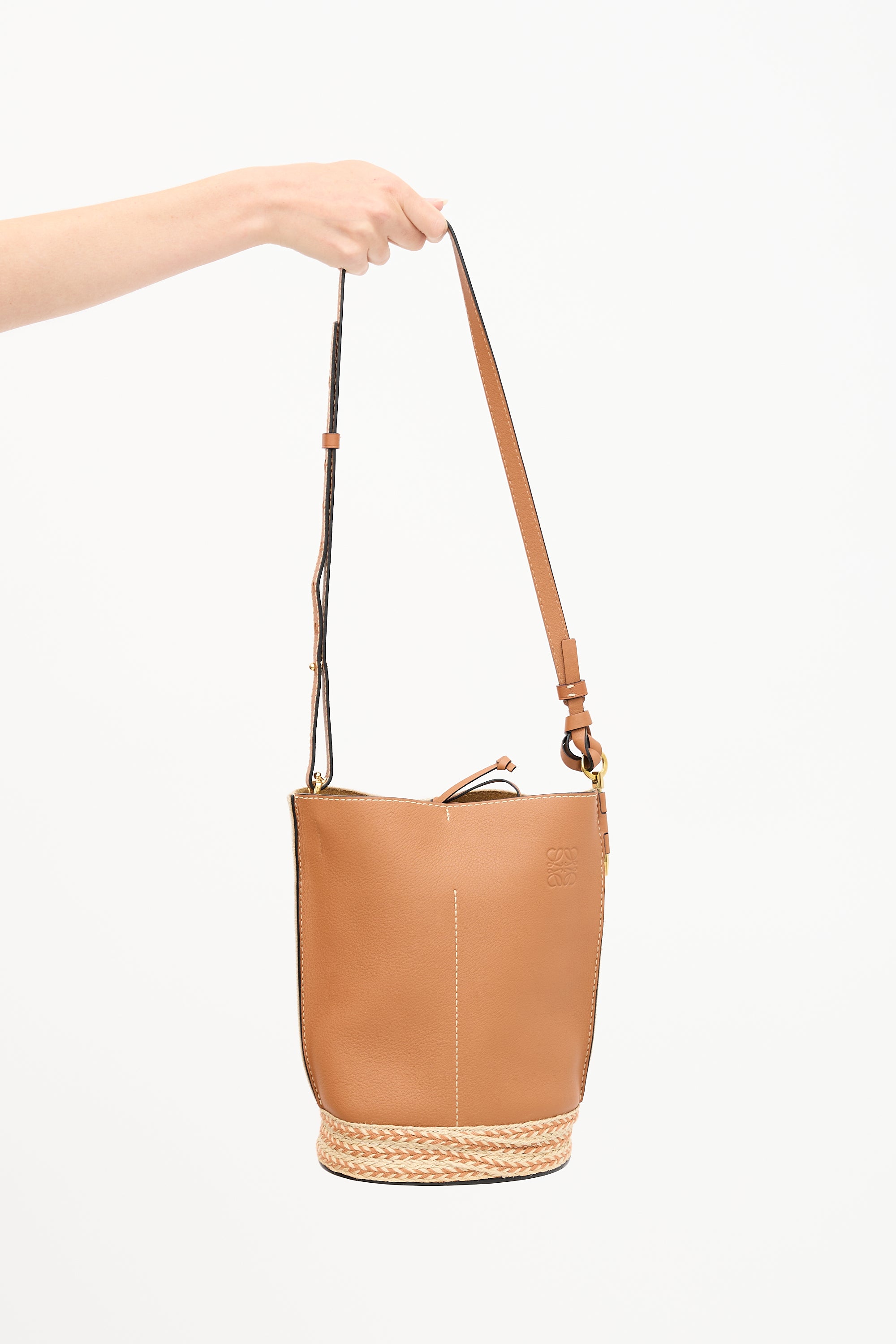 Pre-owned Loewe X Paula's Ibiza brown leather Gate bucket bag featuring gold tone hardware, adjustable leather shoulder strap, debossed logo at face, beige canvas back panel, woven jute base, top tie closure, and one main compartment with two slip pockets.
