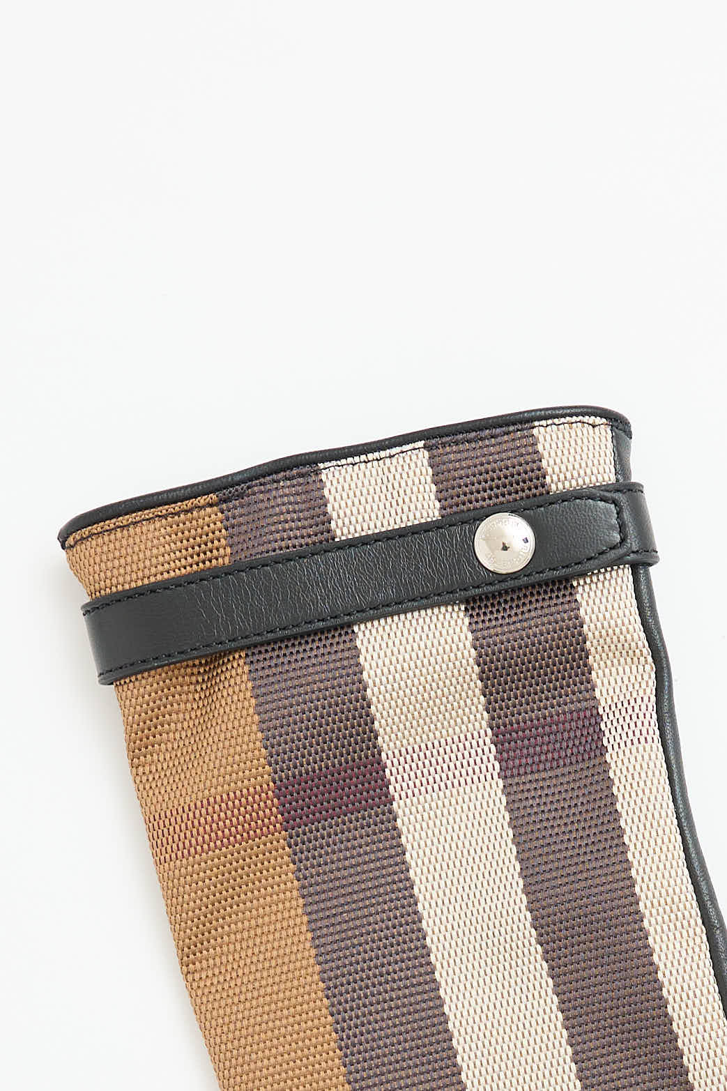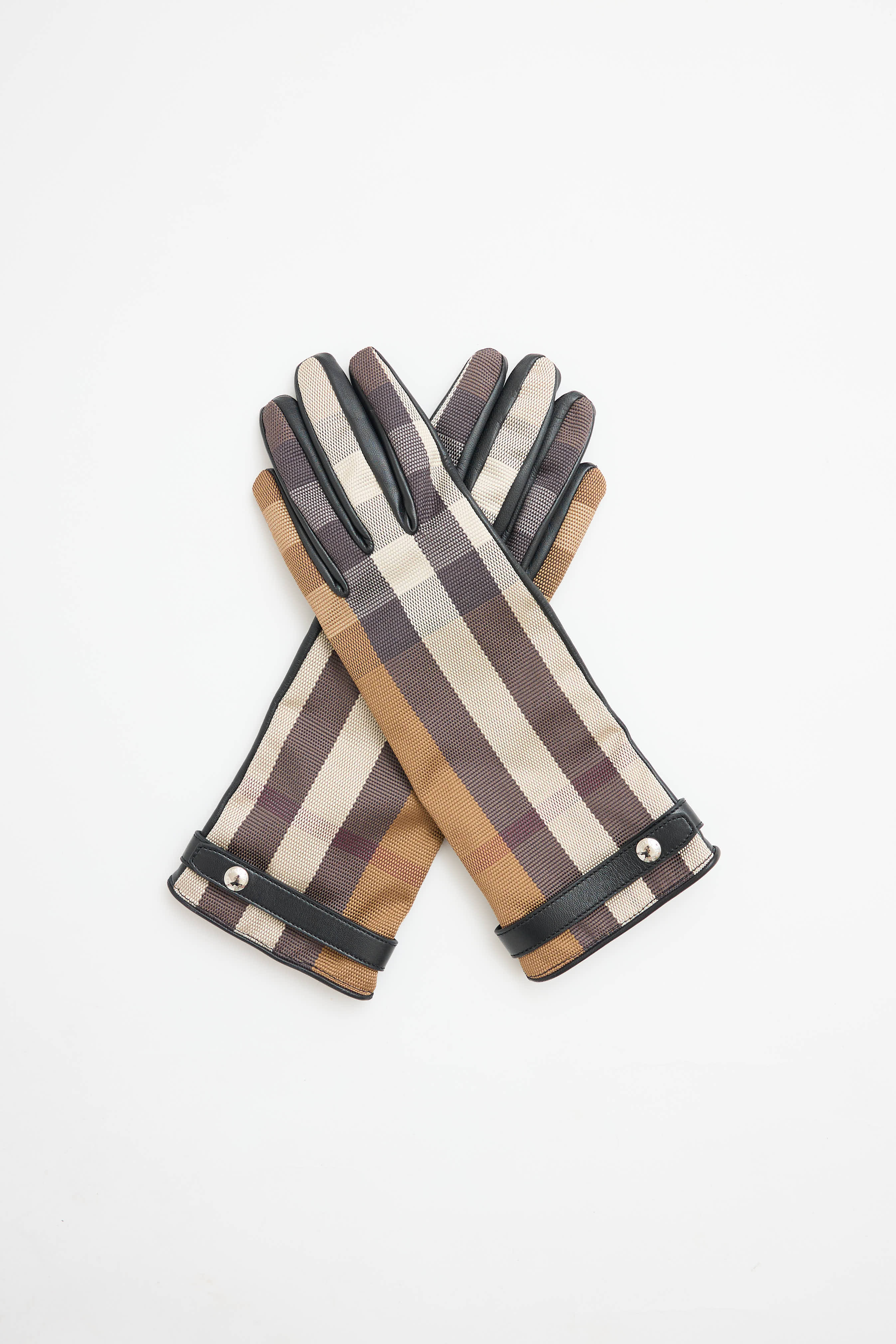 Pre-owned Burberry beige and black canvas and leather gloves featuring signature check, extended cuff, and strap at wrist with snap closure. Lined.