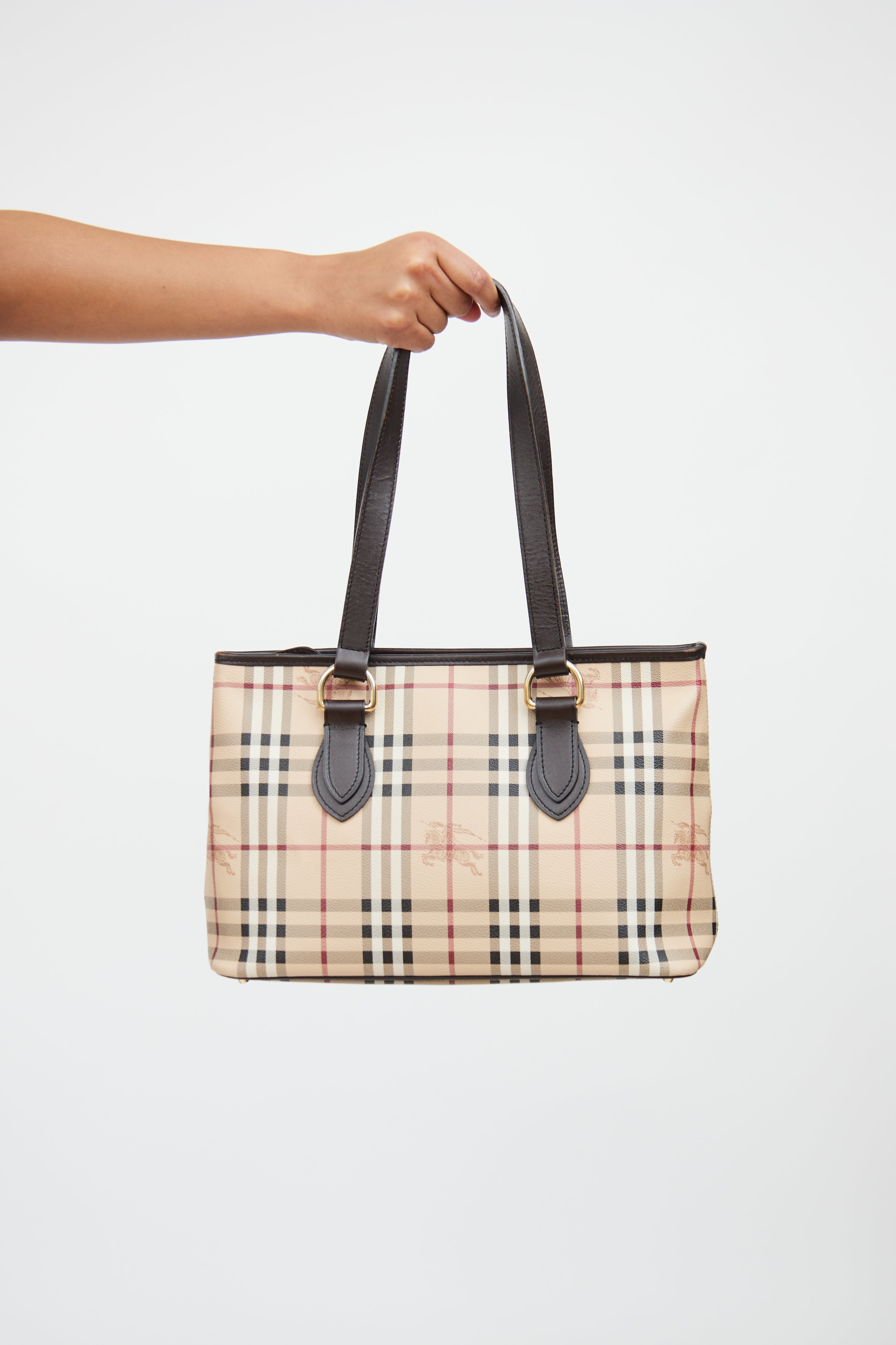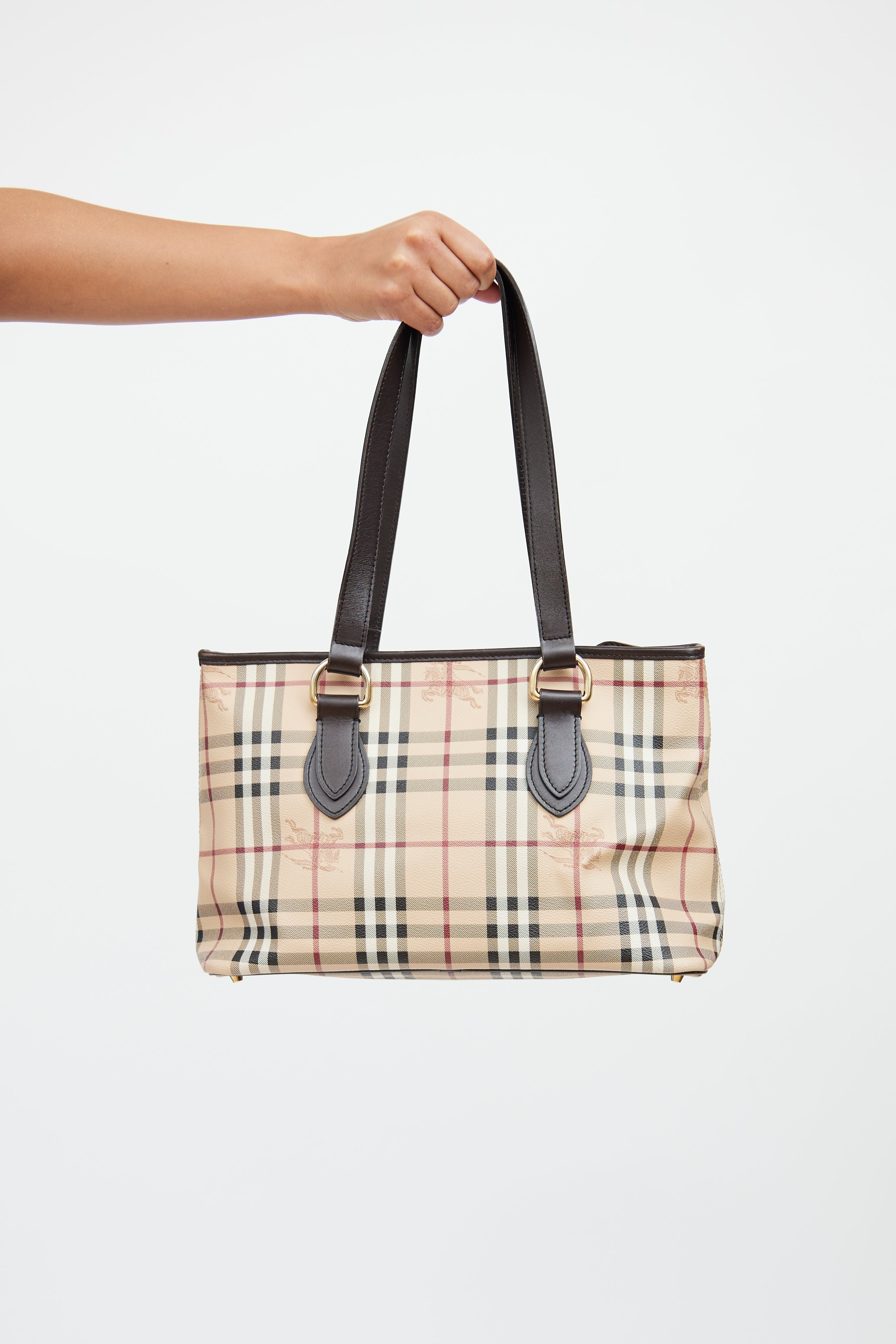Pre-owned Burberry Regent tote bag featuring Haymarket coated canvas, brown leather trim, gold tone hardware, dual top handles, metal protective feet, zip top closure, canvas lining, two interior slip pockets and single interior zip pocket with logo tab.