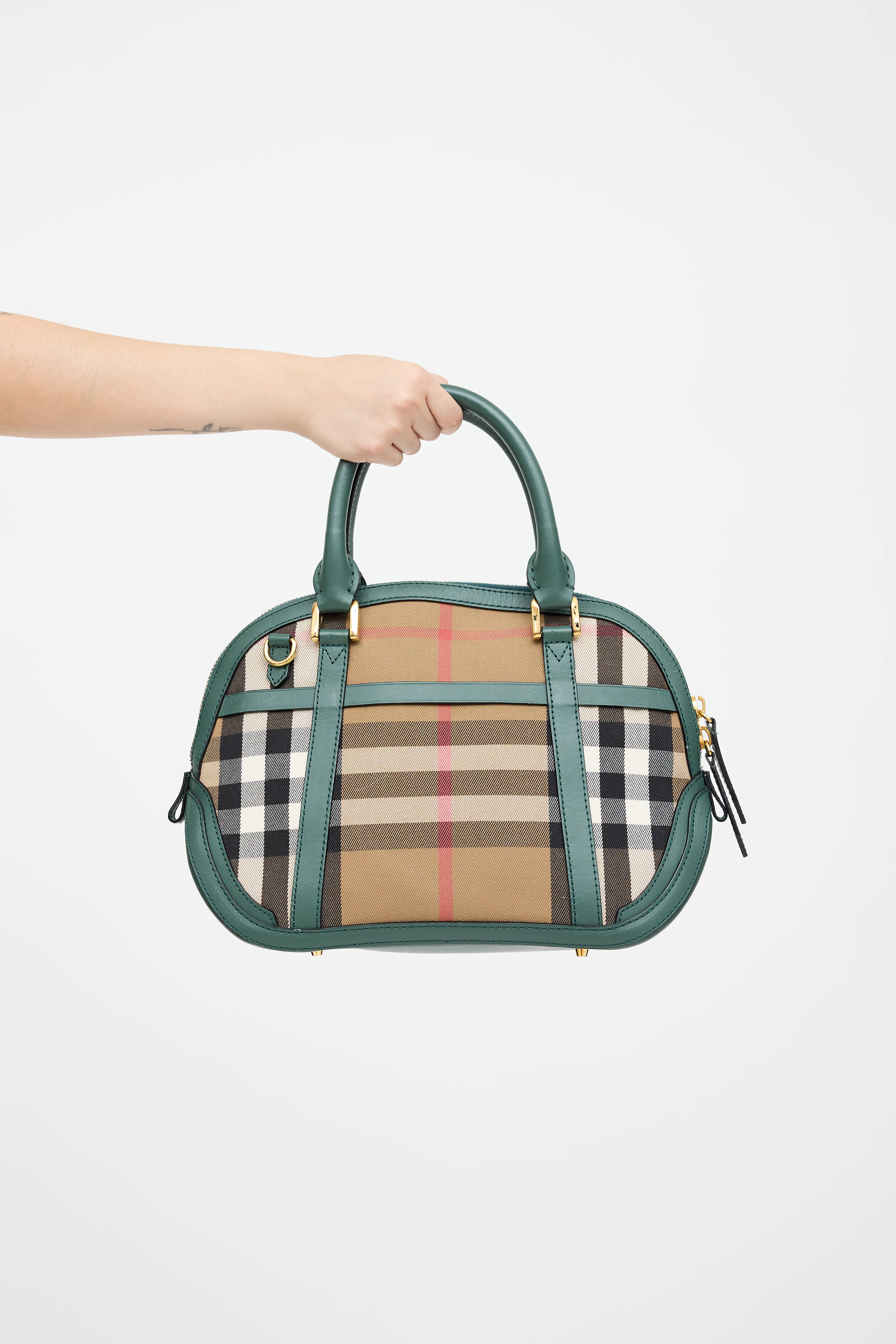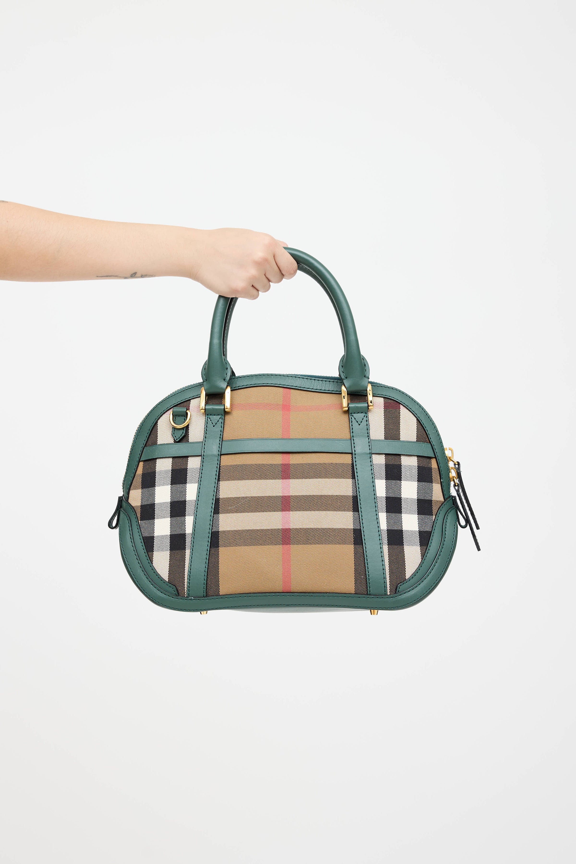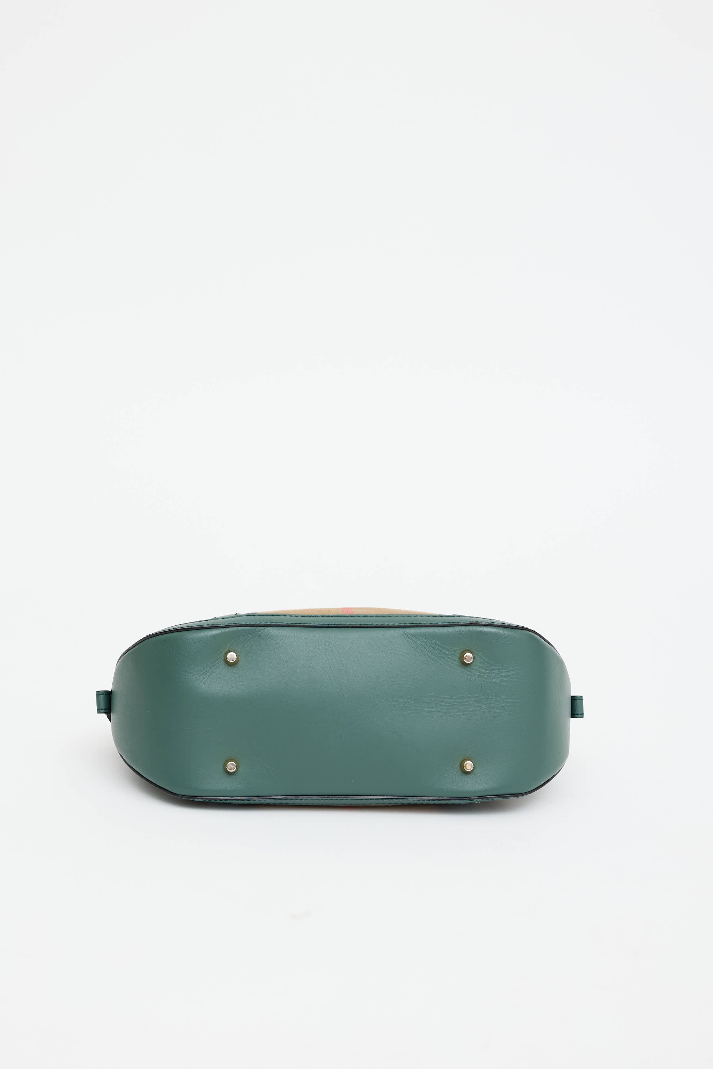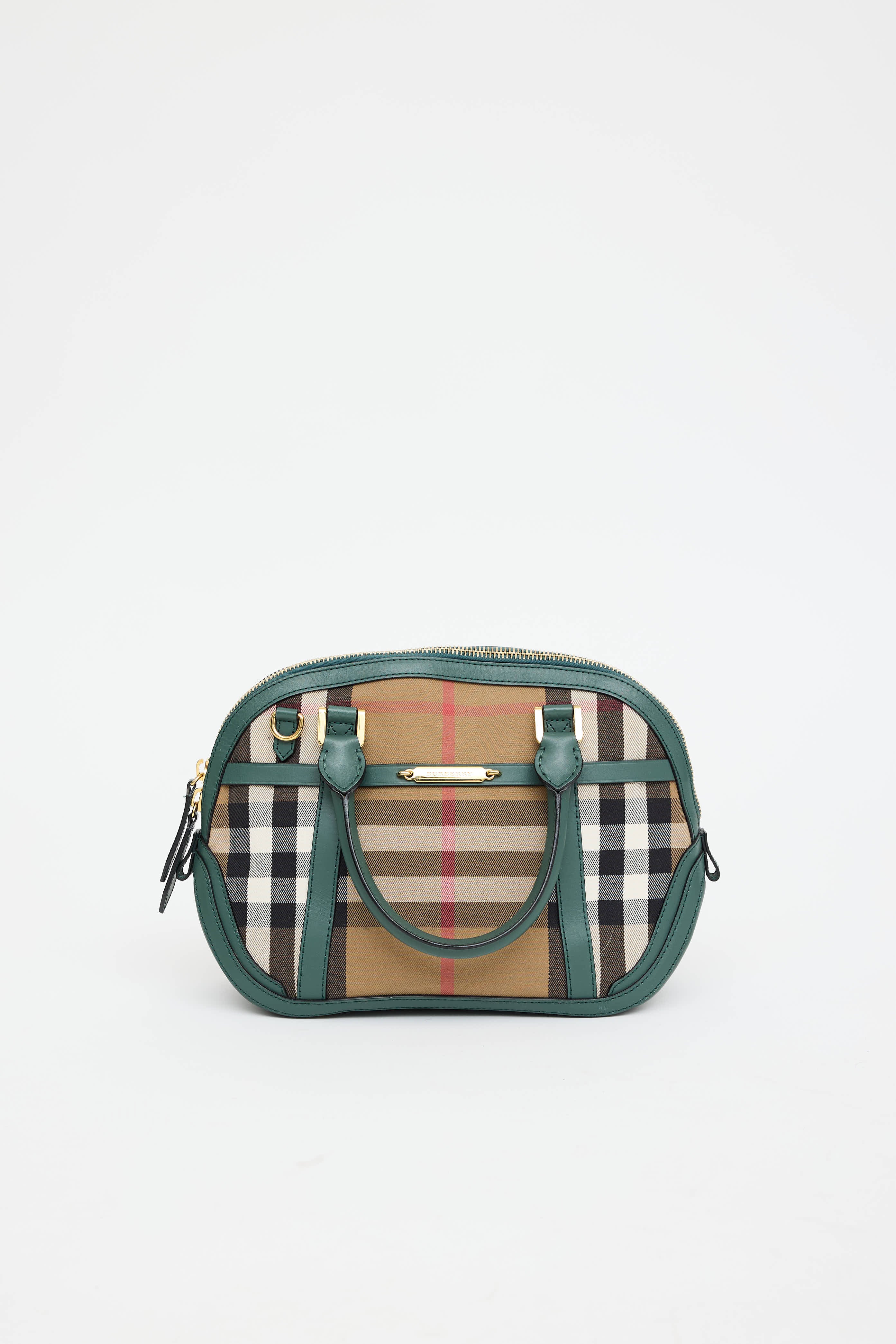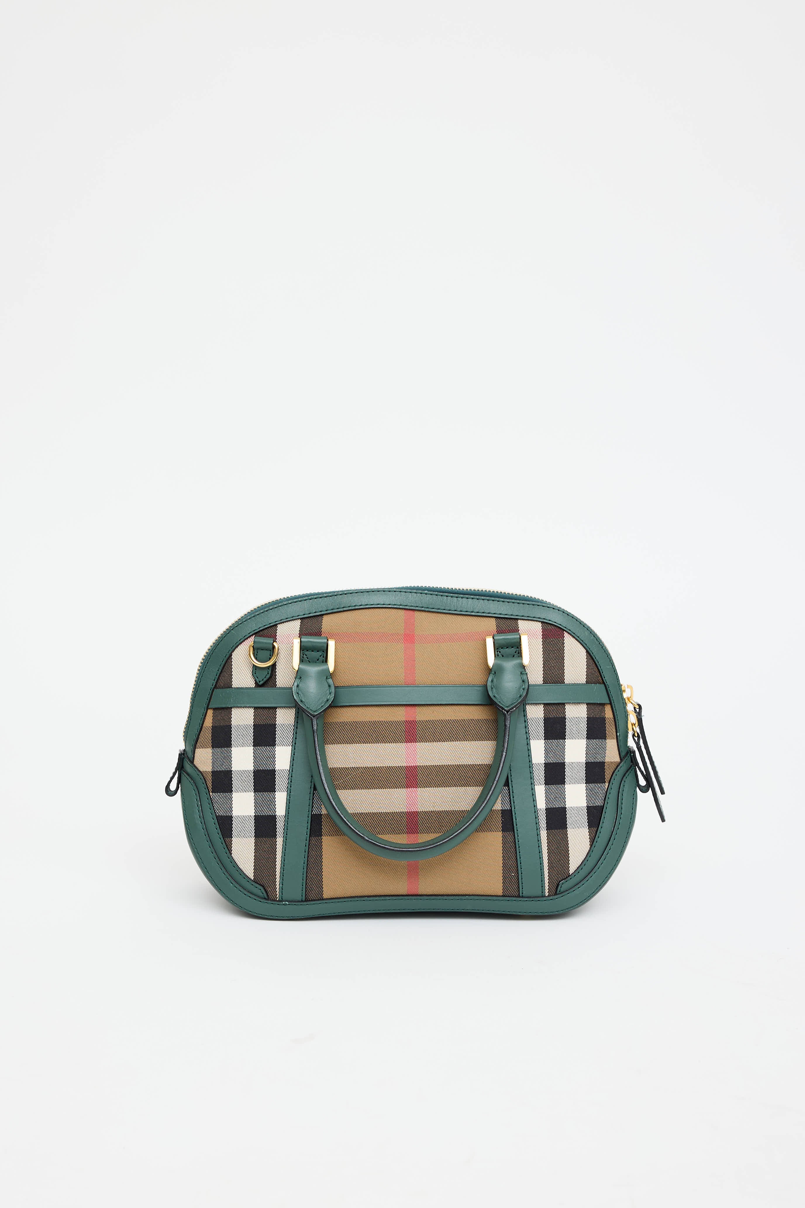 Pre-owned Burberry multicolour Orchard bag featuring signature House Check canvas with green leather trims, gold tone logo plate at front, protective feet at bottom, two rolled top handles, optional adjustable crossbody strap and zip closure. Interior features black canvas lined main compartment, zip pocket with leather pull tab and two slip pockets with leather trims.