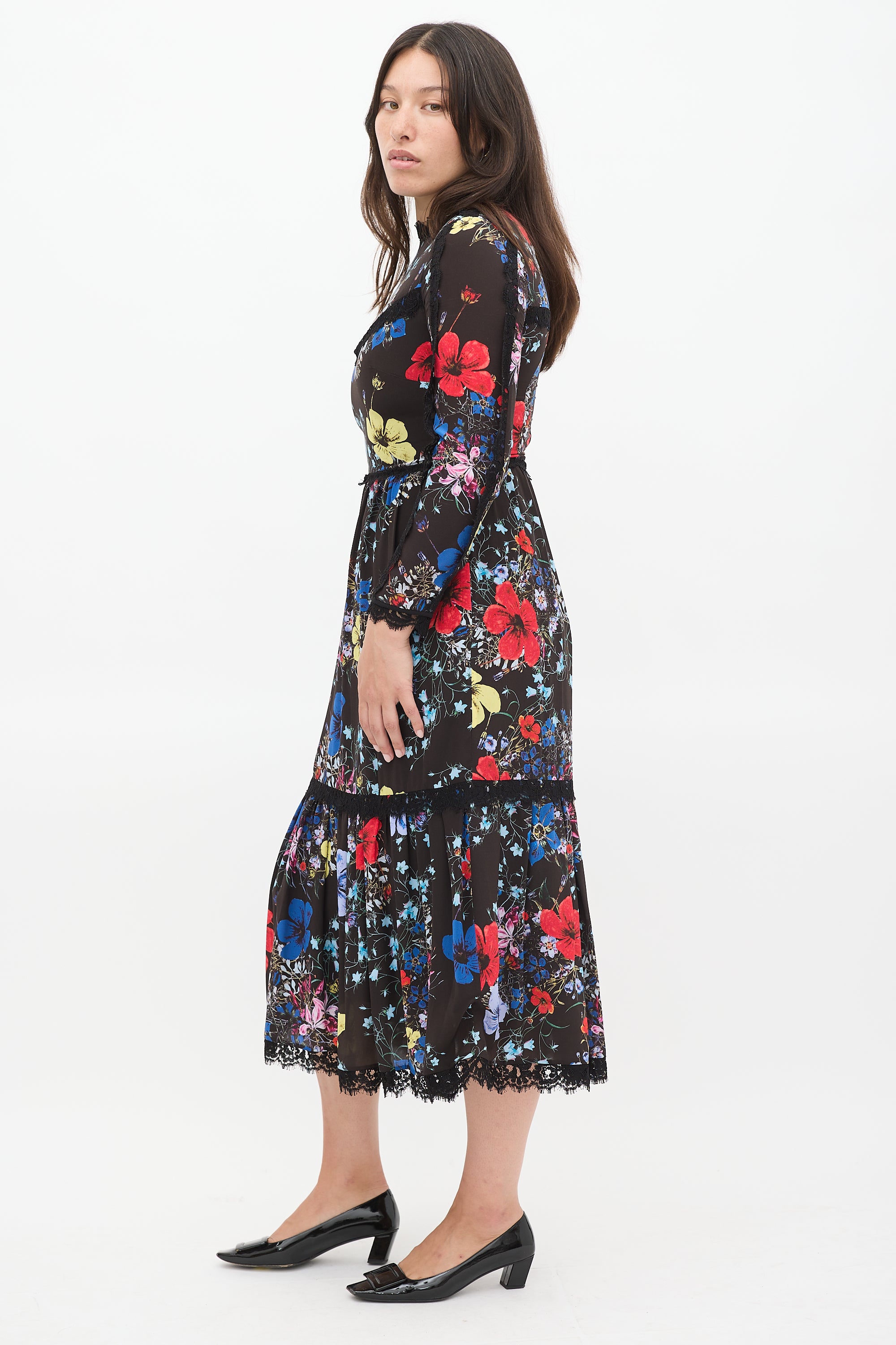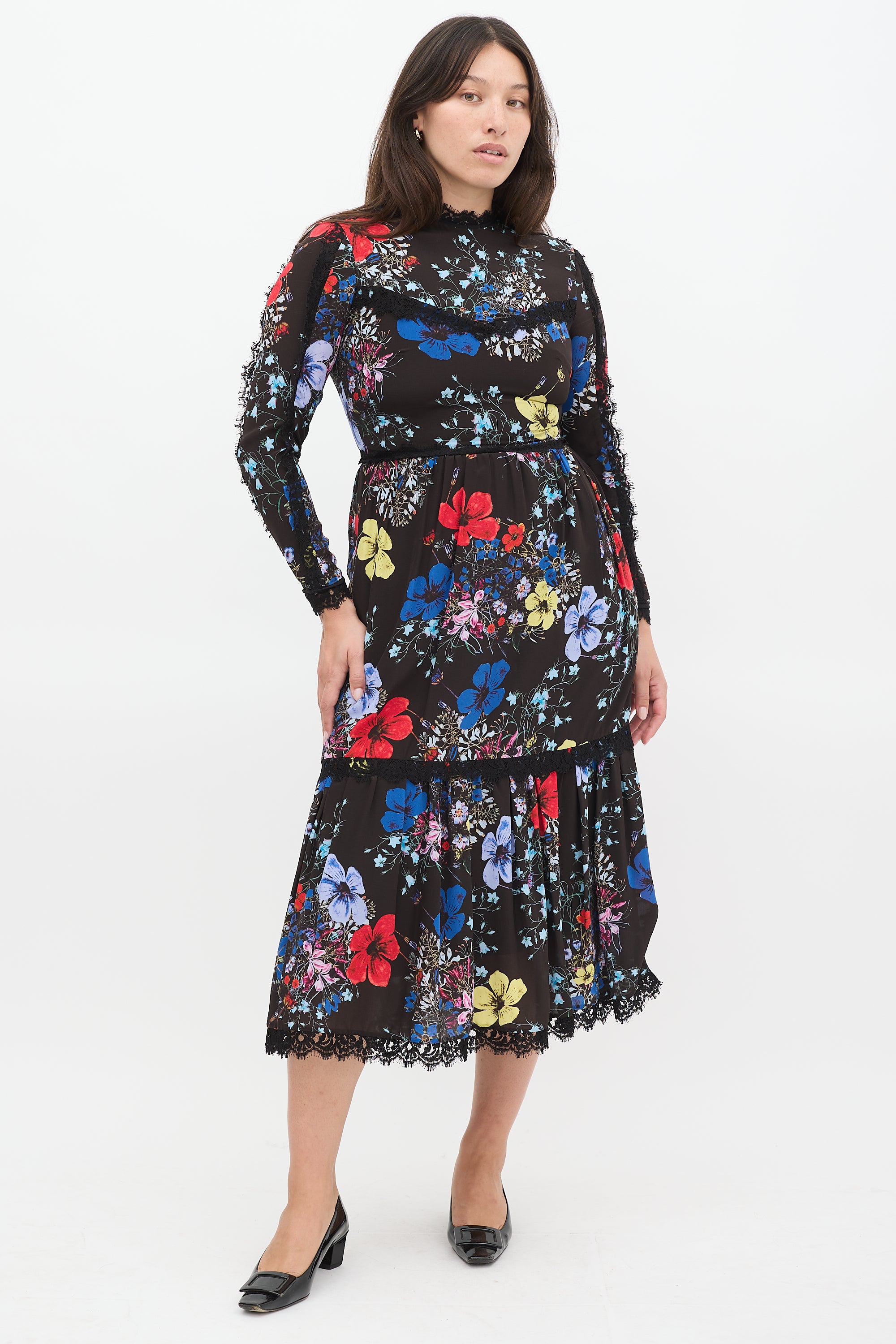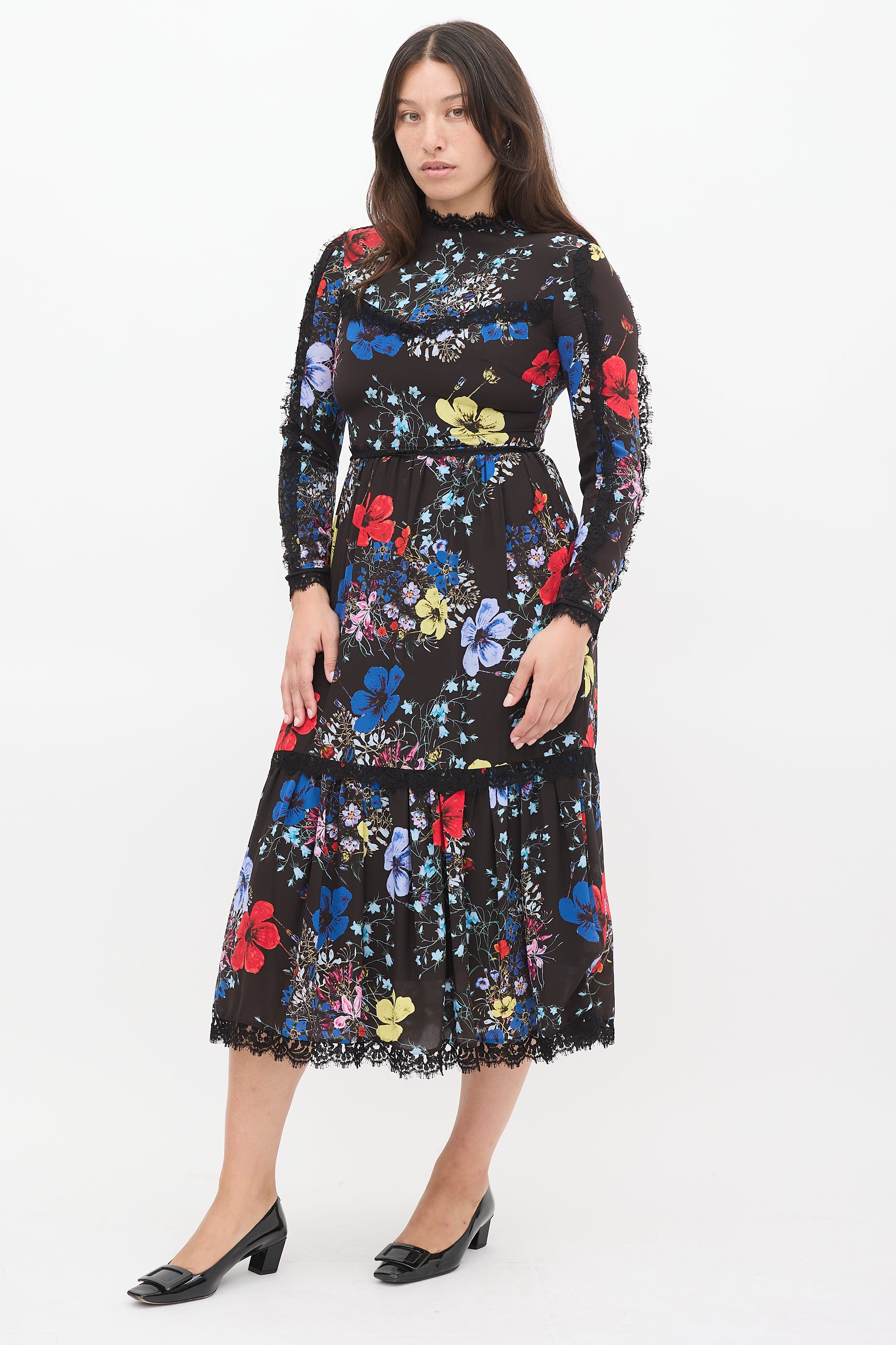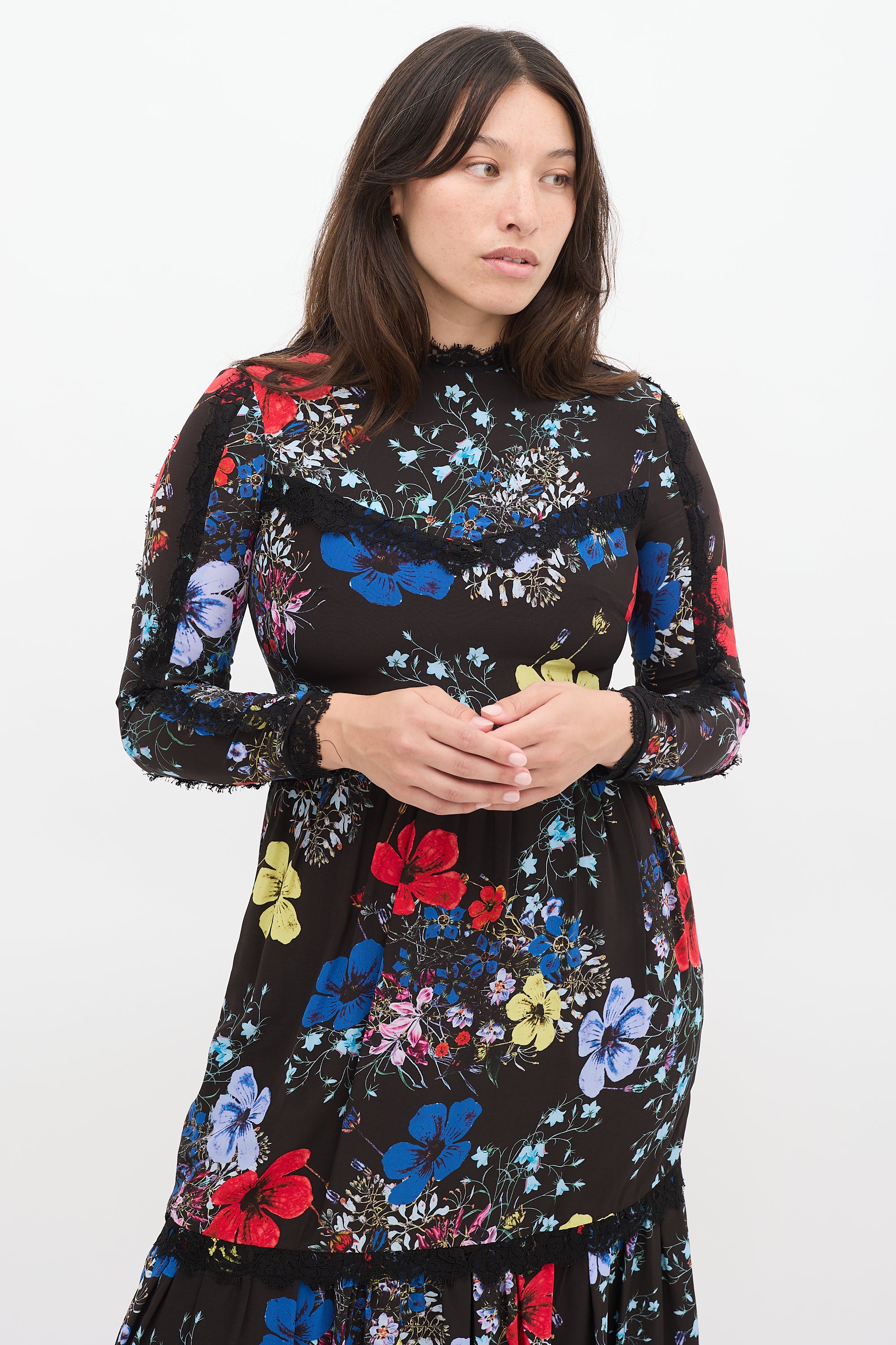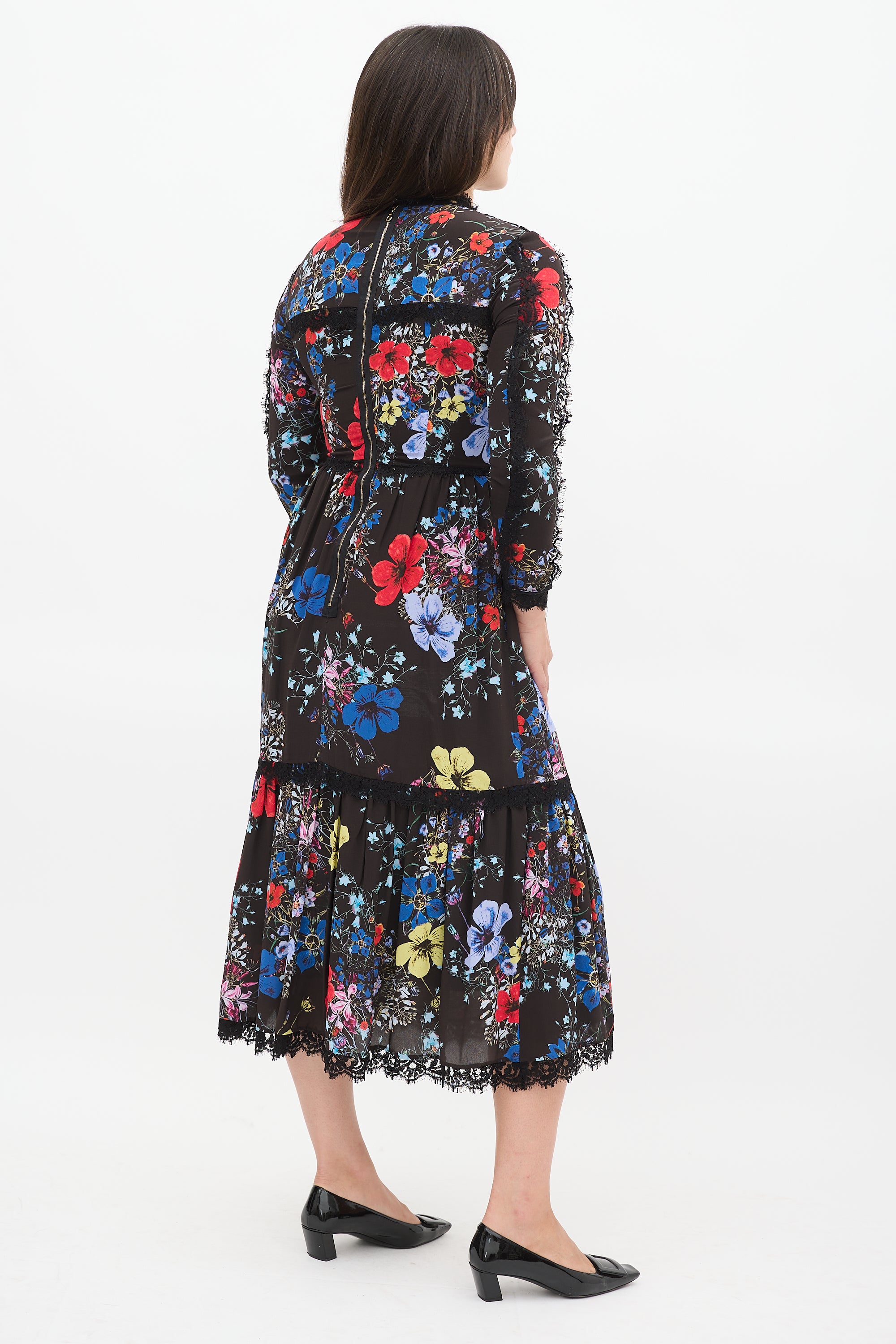 Pre-owned Erdem black and multicolour silk Georgie maxi dress featuring a round neckline, floral print throughout, tiered construction, in seam pockets, long sleeves, black floral lace trim throughout, and gold tone back zip. Partially lined.