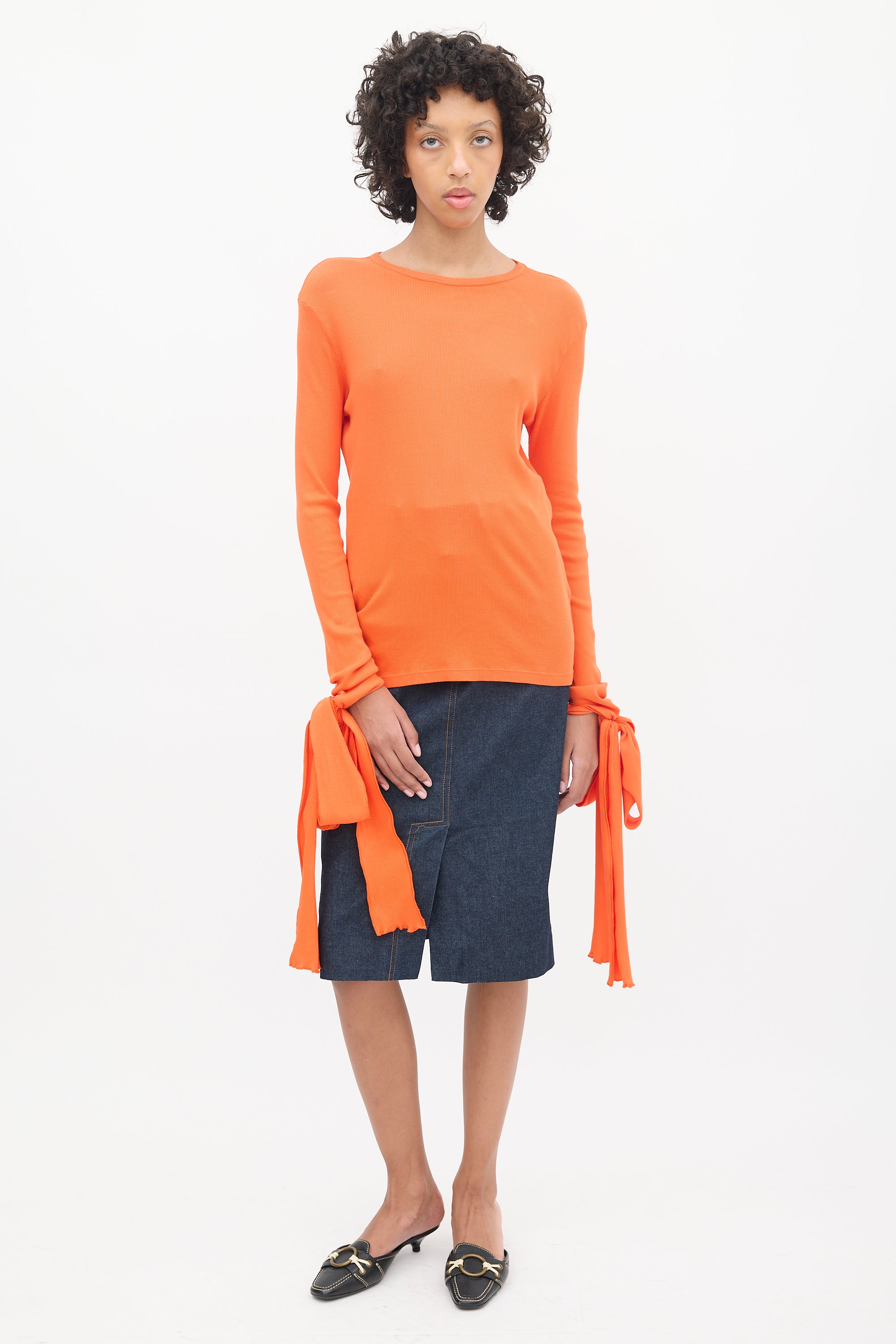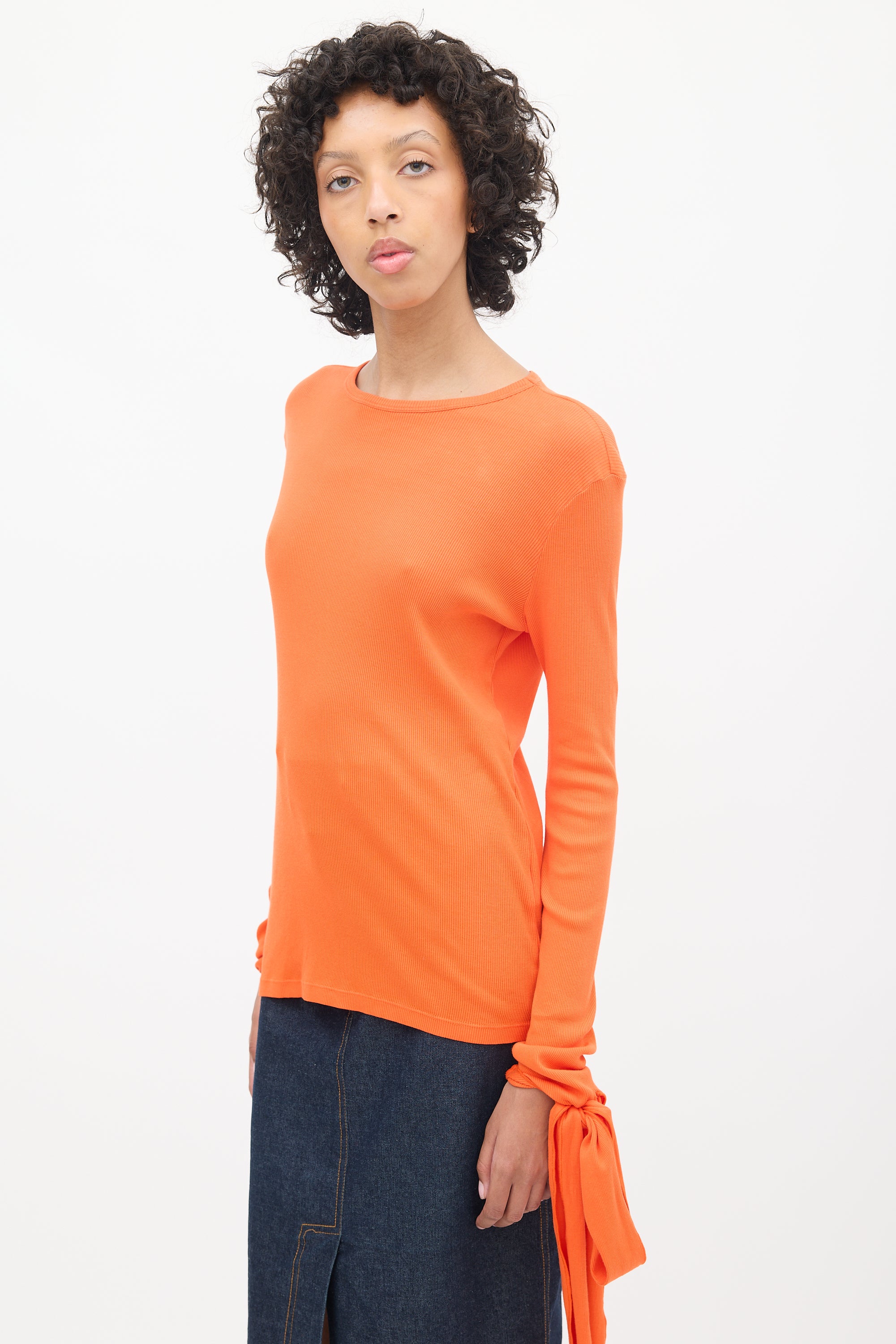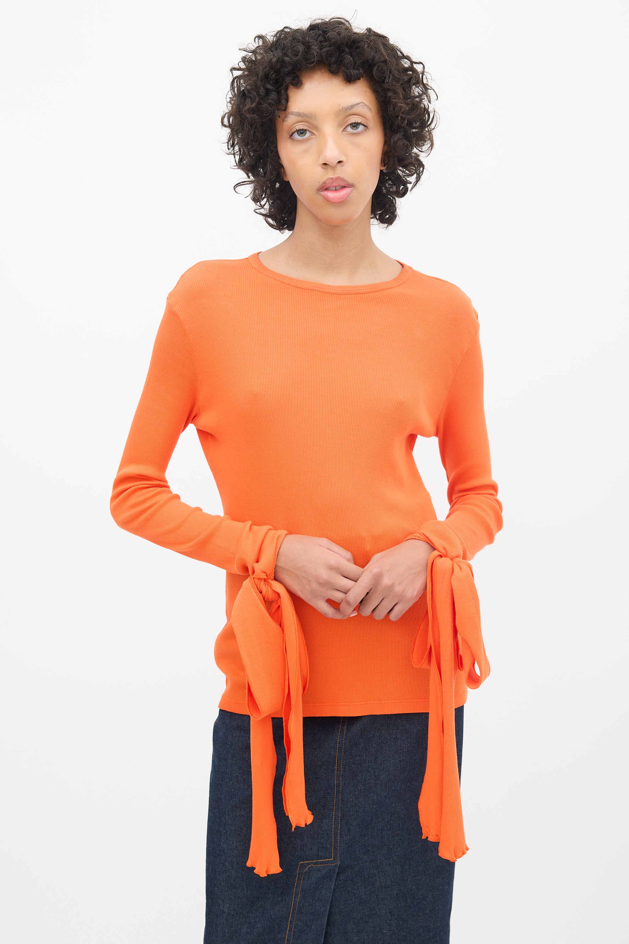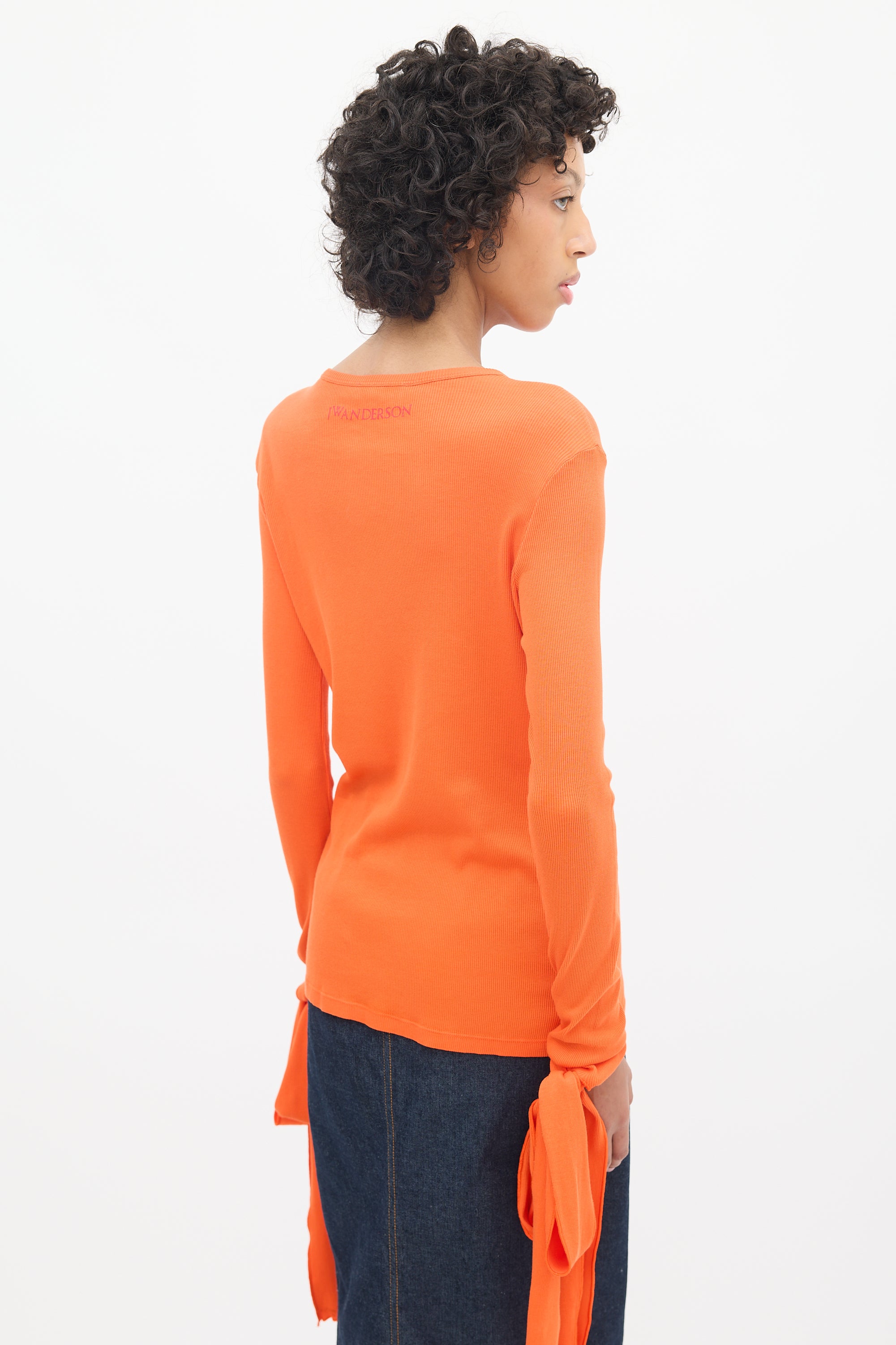 Pre-owned JW Anderson orange ribbed top featuring a round neck, printed logo at upper back, even hem, and long sleeves with tie cuffs.
