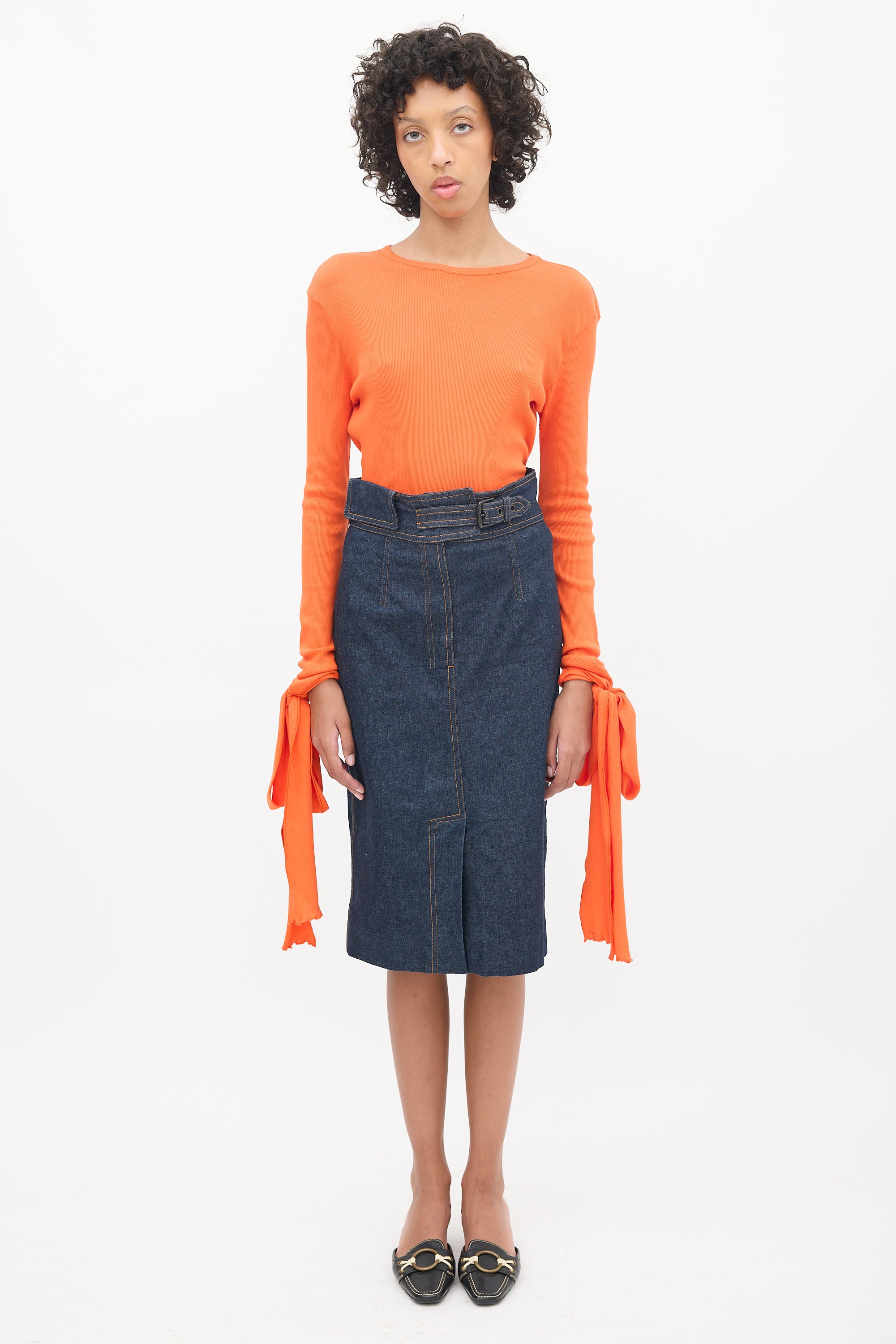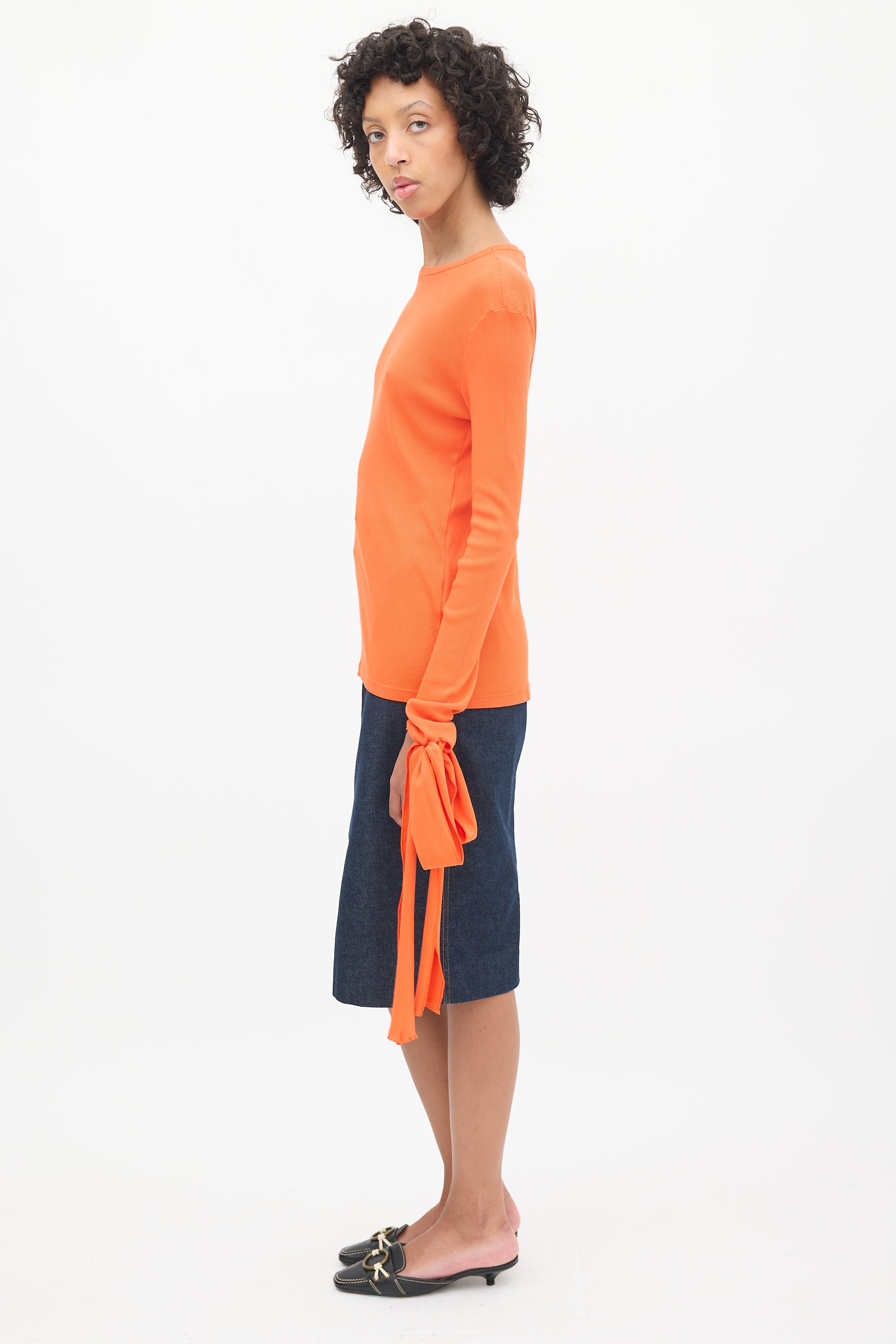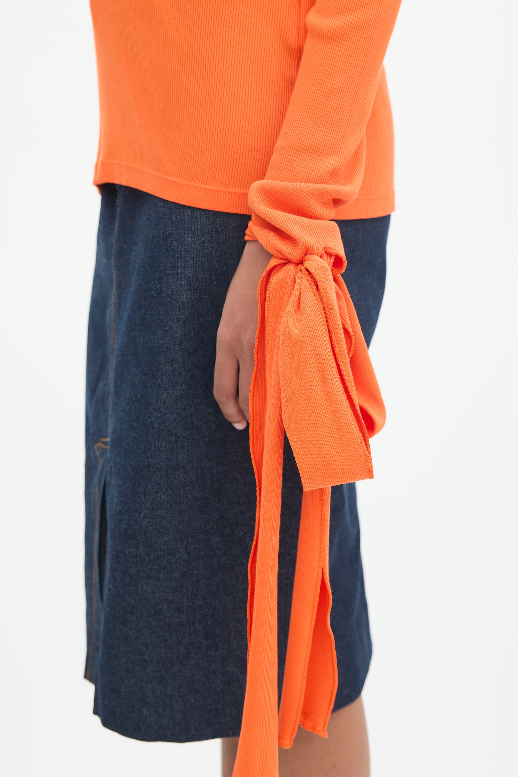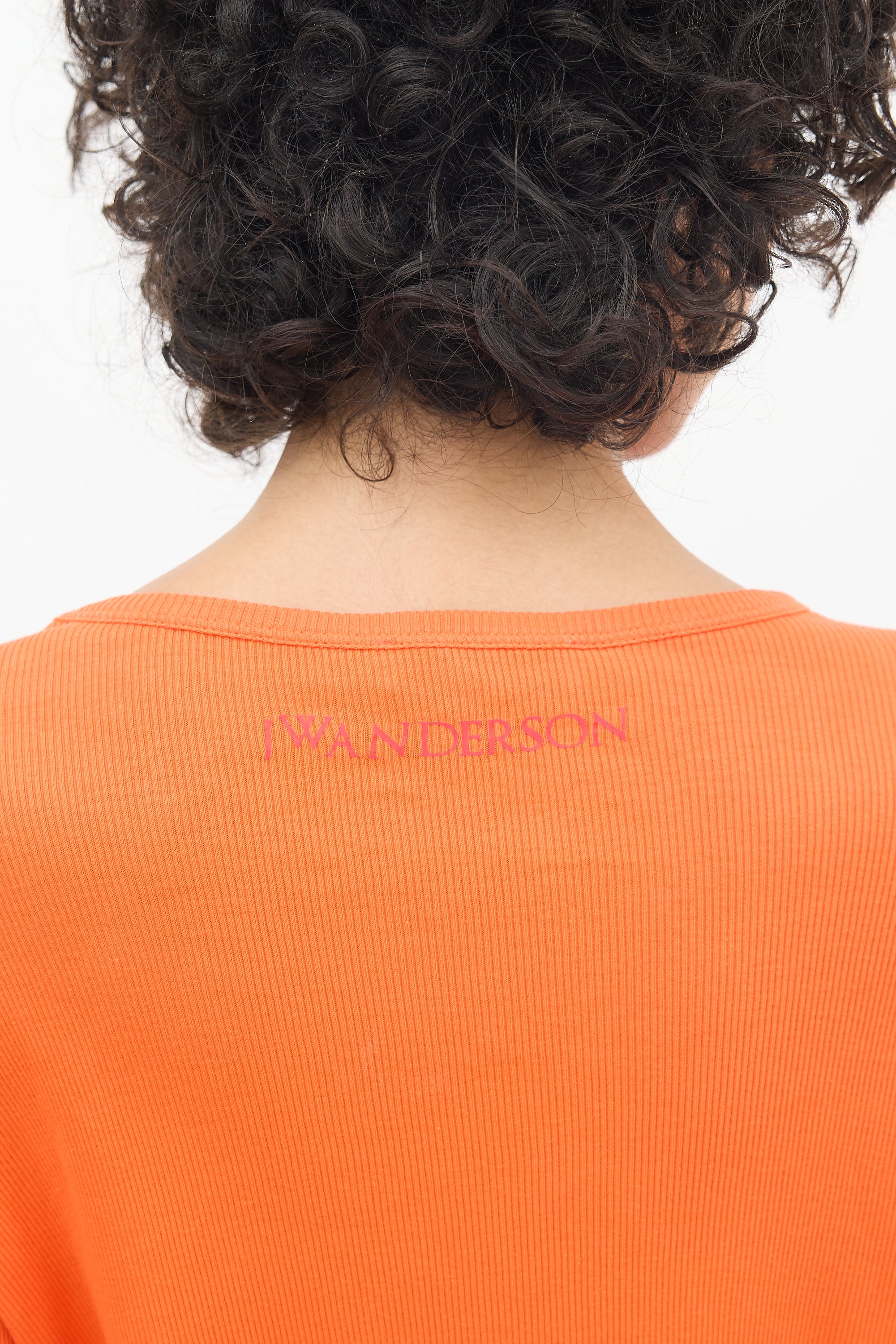Pre-owned JW Anderson orange ribbed top featuring a round neck, printed logo at upper back, even hem, and long sleeves with tie cuffs.