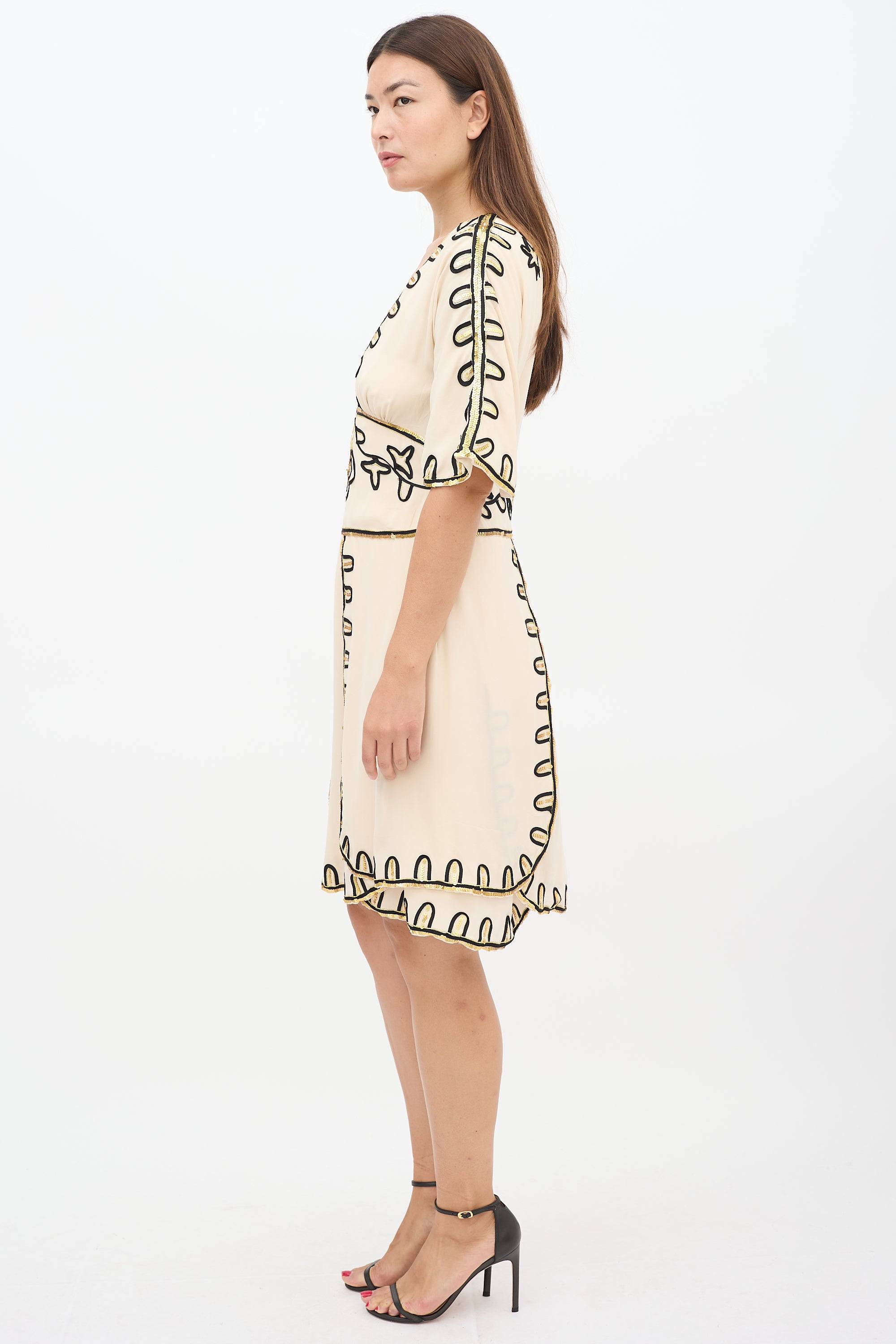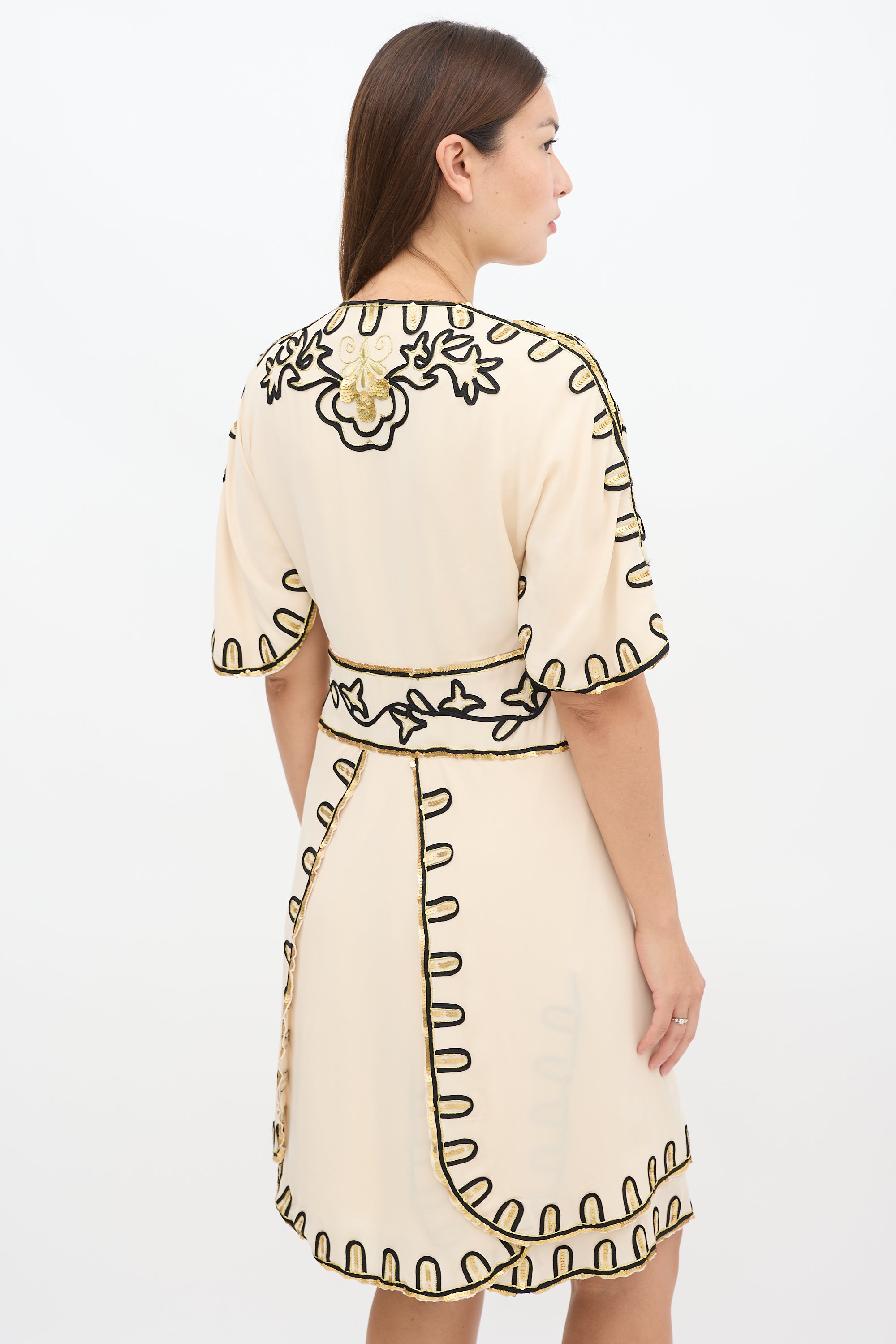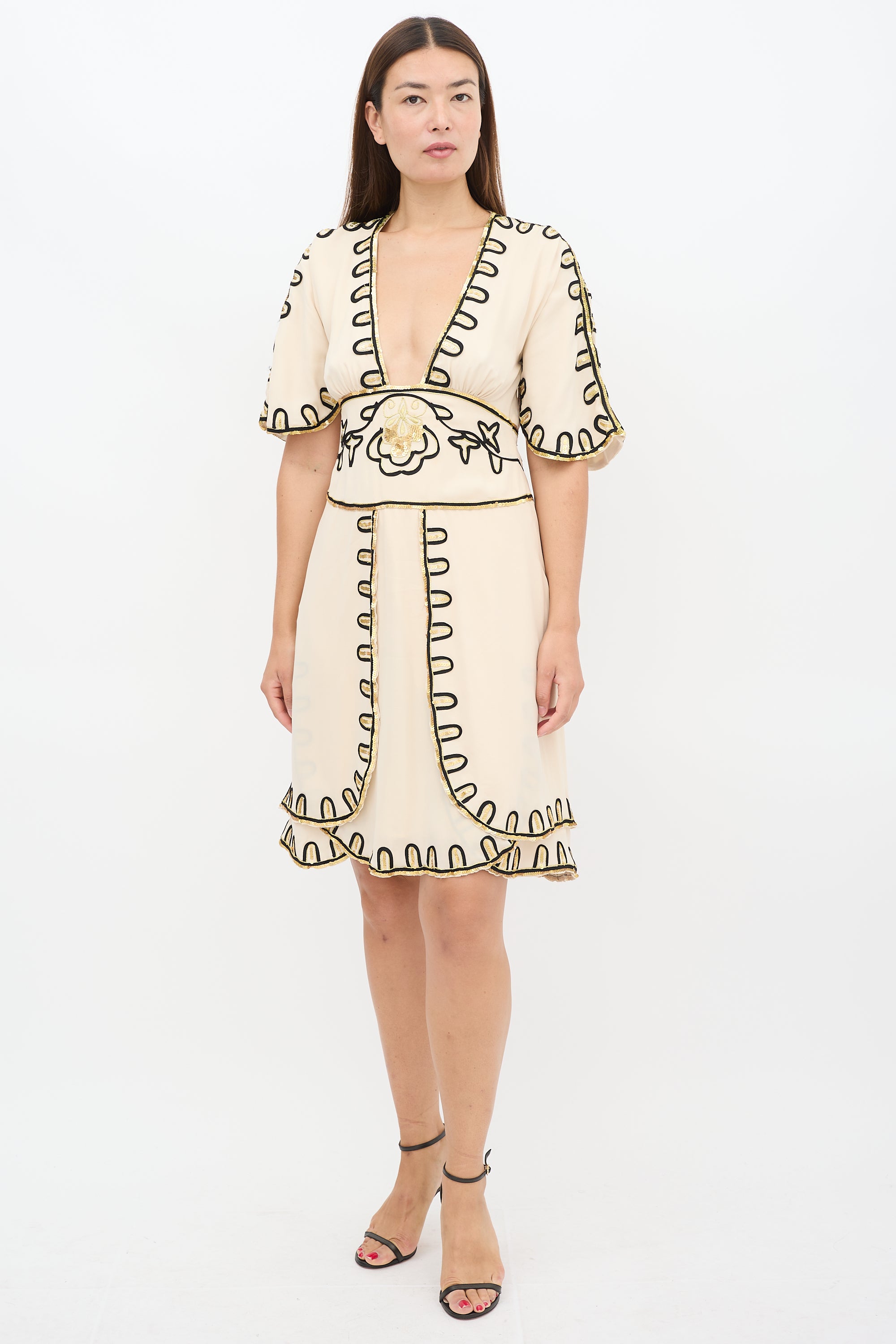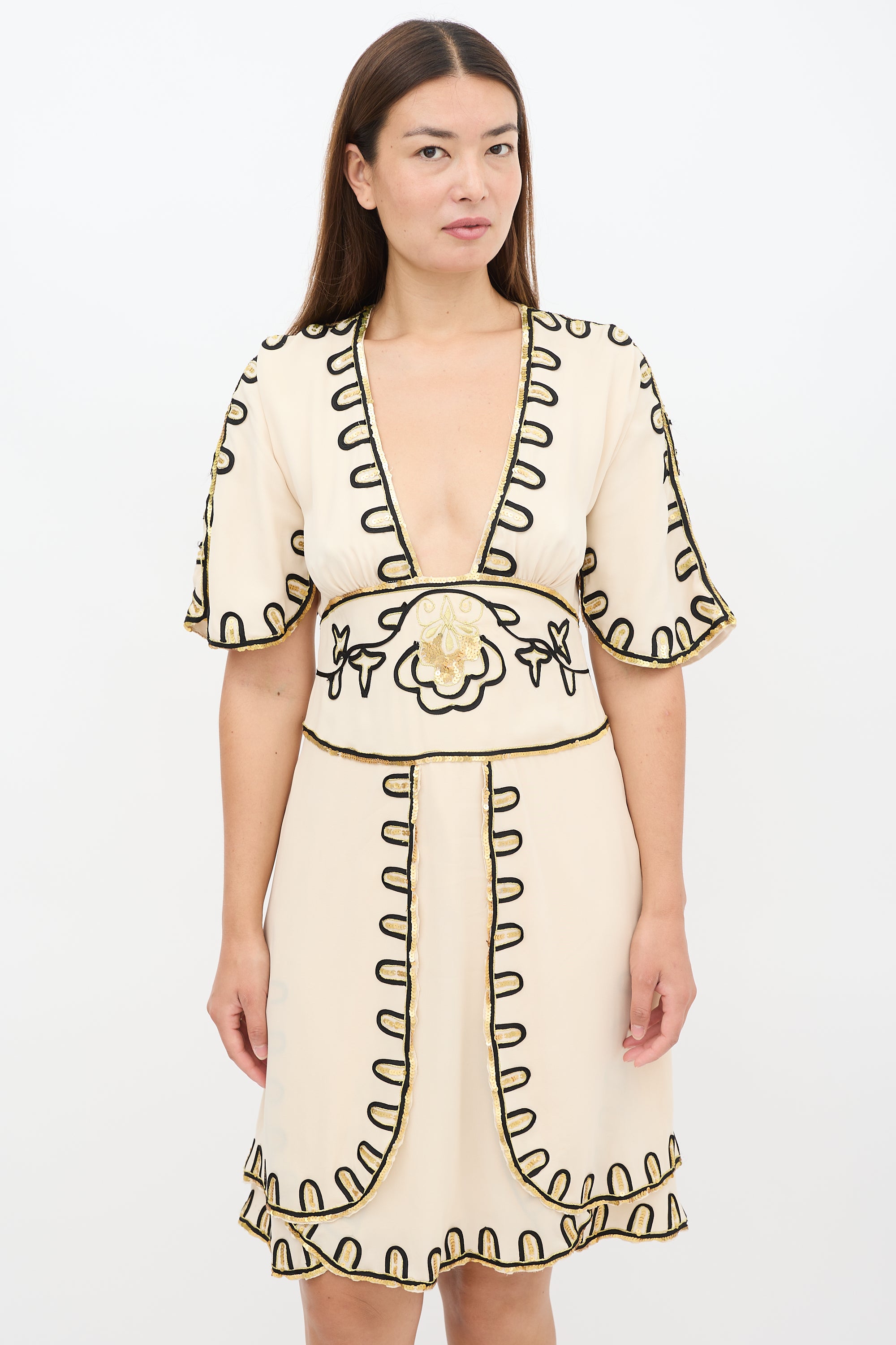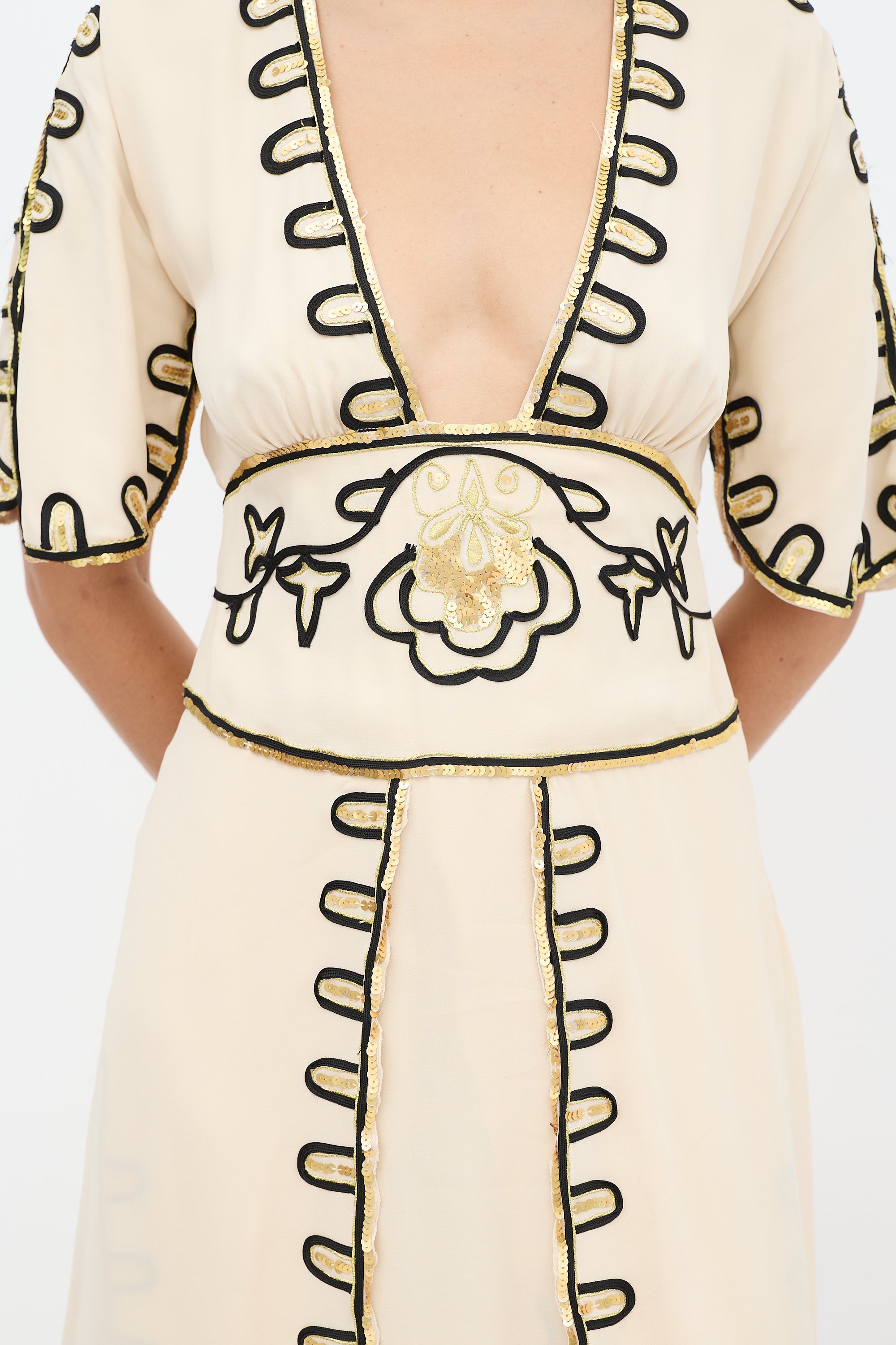 Pre-owned Temperley beige silk midi dress featuring a plunging neckline, gathering at bust, wide waist panel, layered skirt design, short petal sleeves, gold tone sequin and black trim detail throughout, and concealed side zip. Lined. Comes with extra sequins.