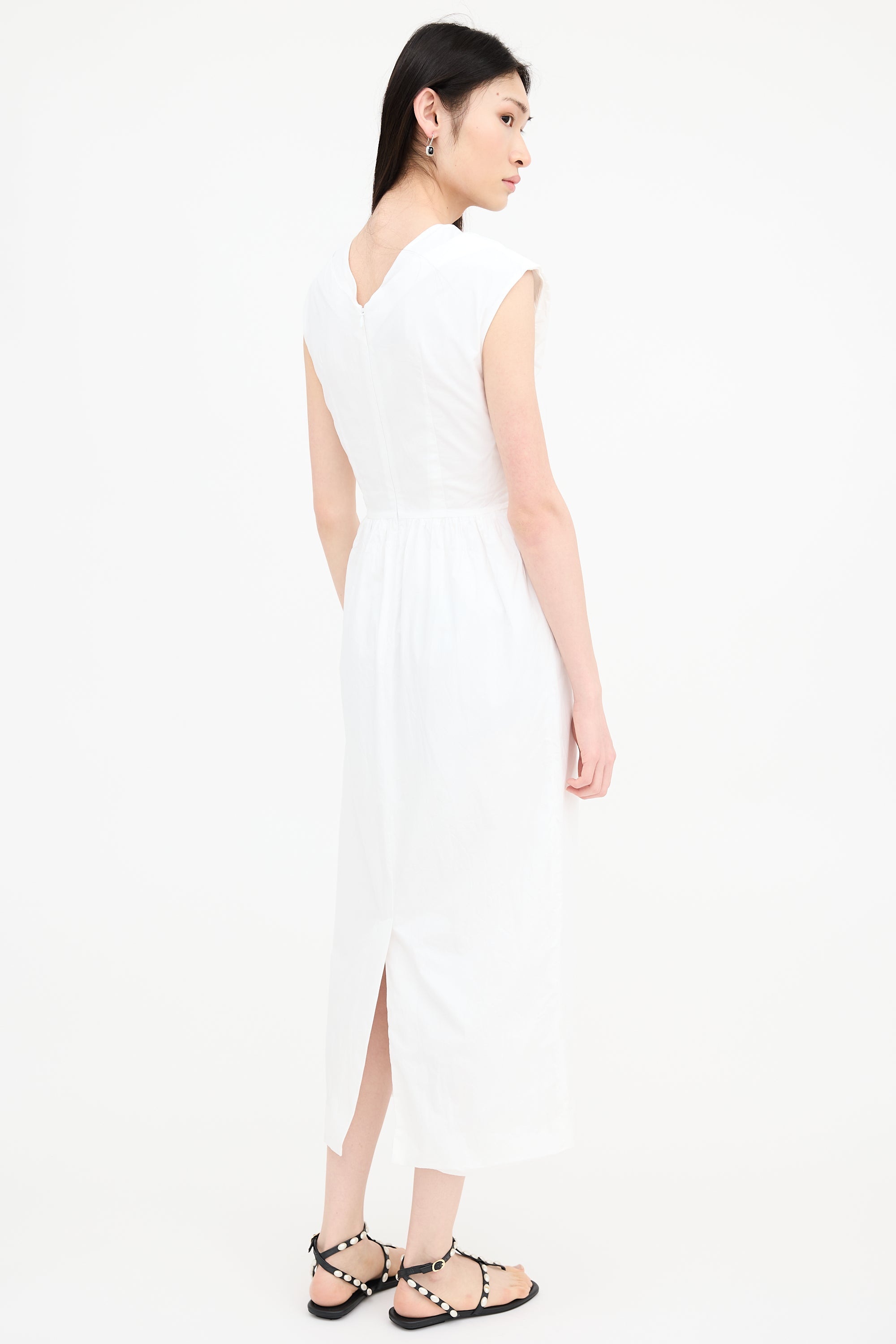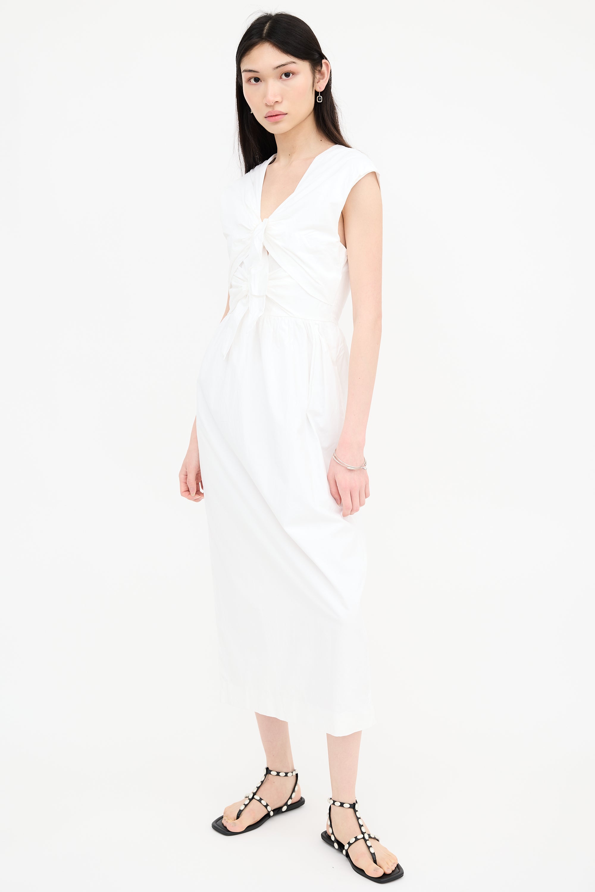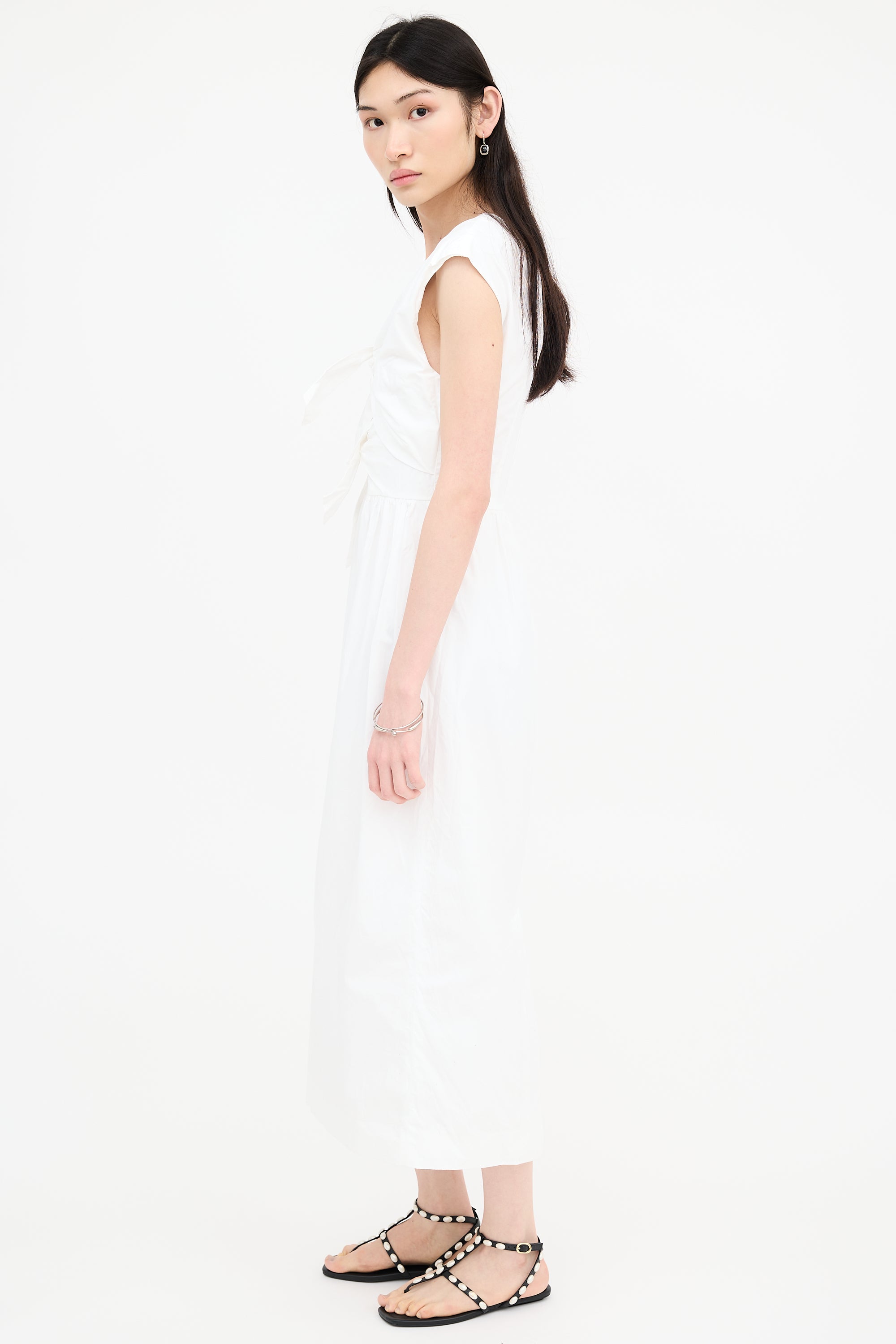 Pre-owned Tove white Nina dress featuring plunge neckline with double fabric ties, ruched waist, and concealed back zip. Lined.