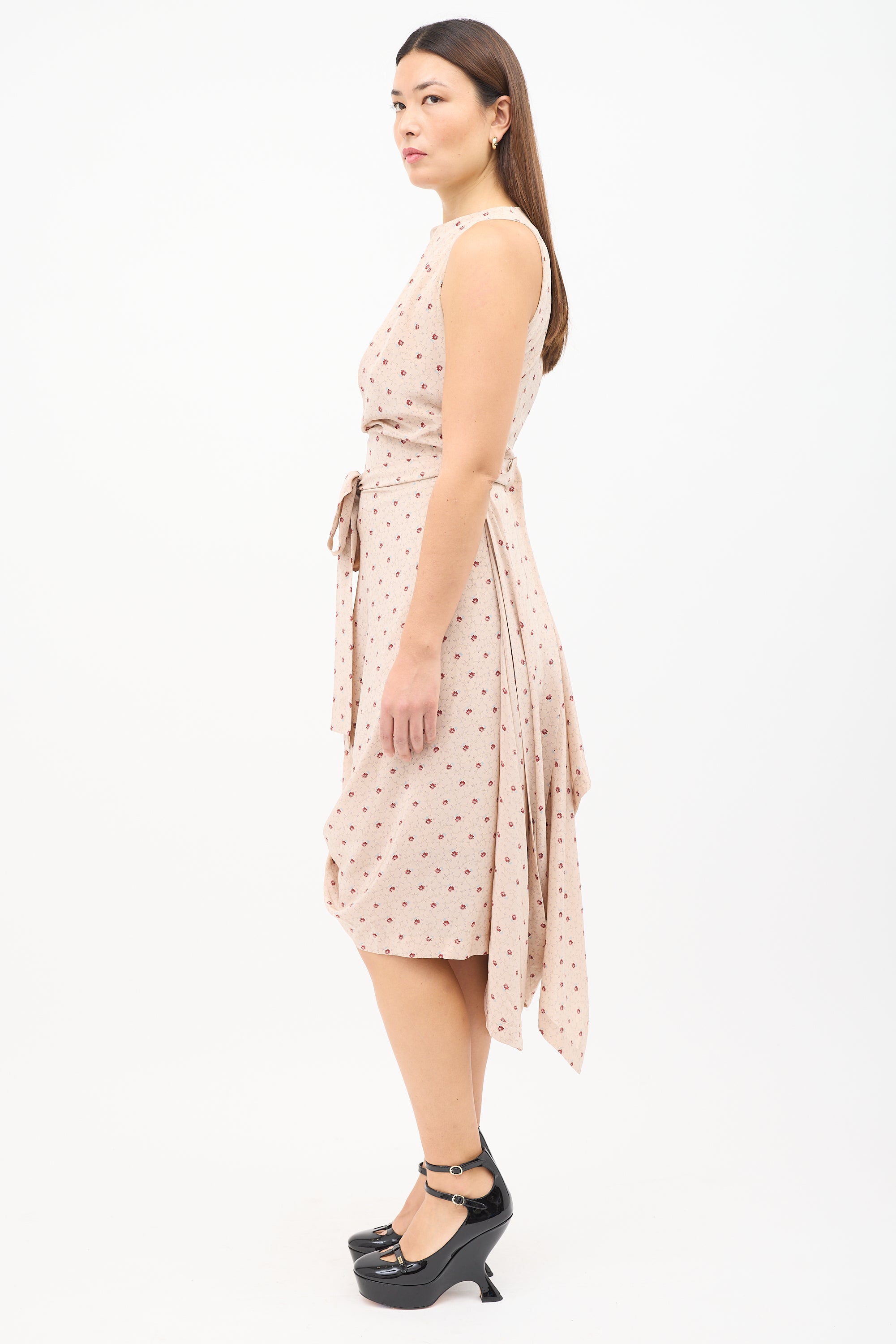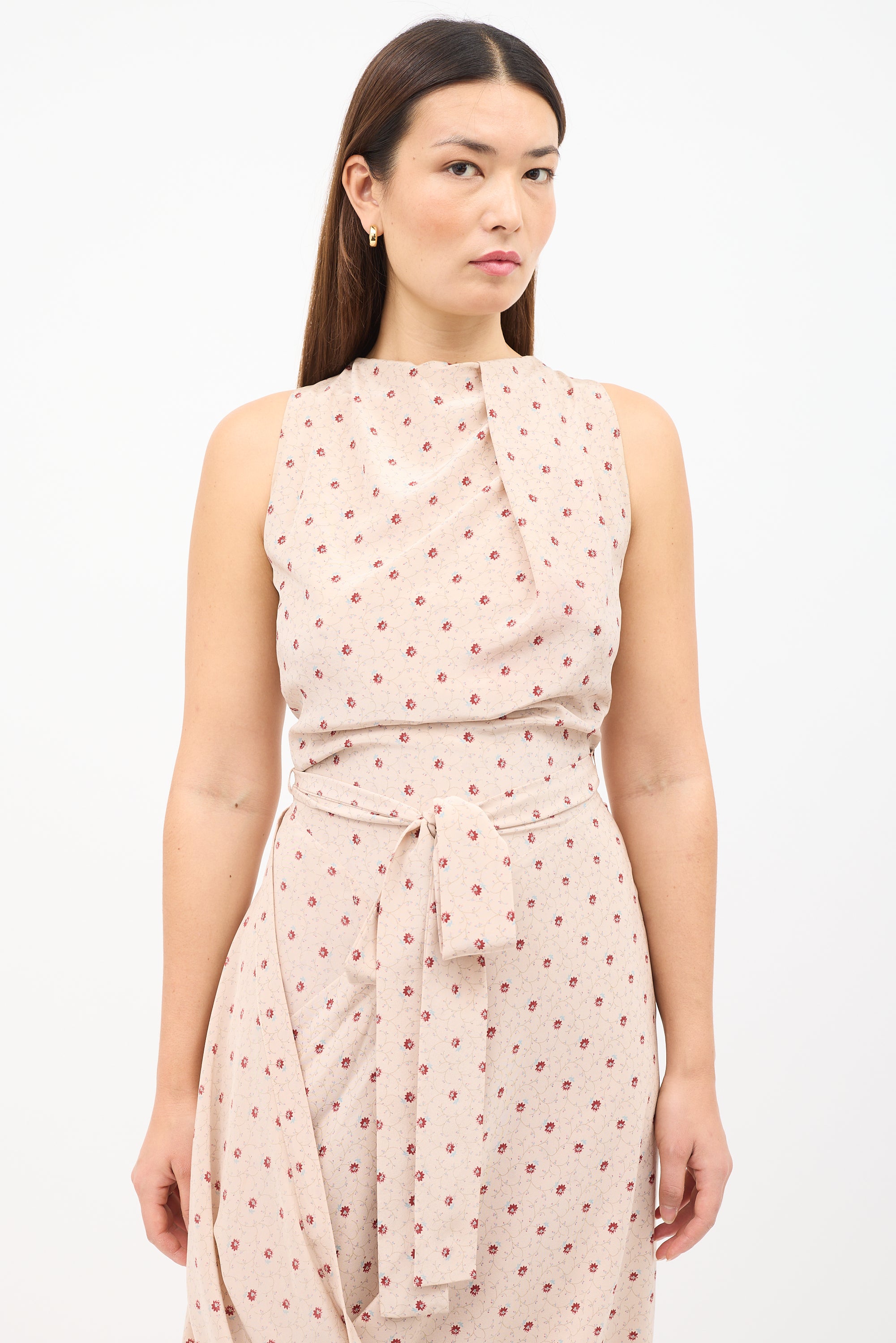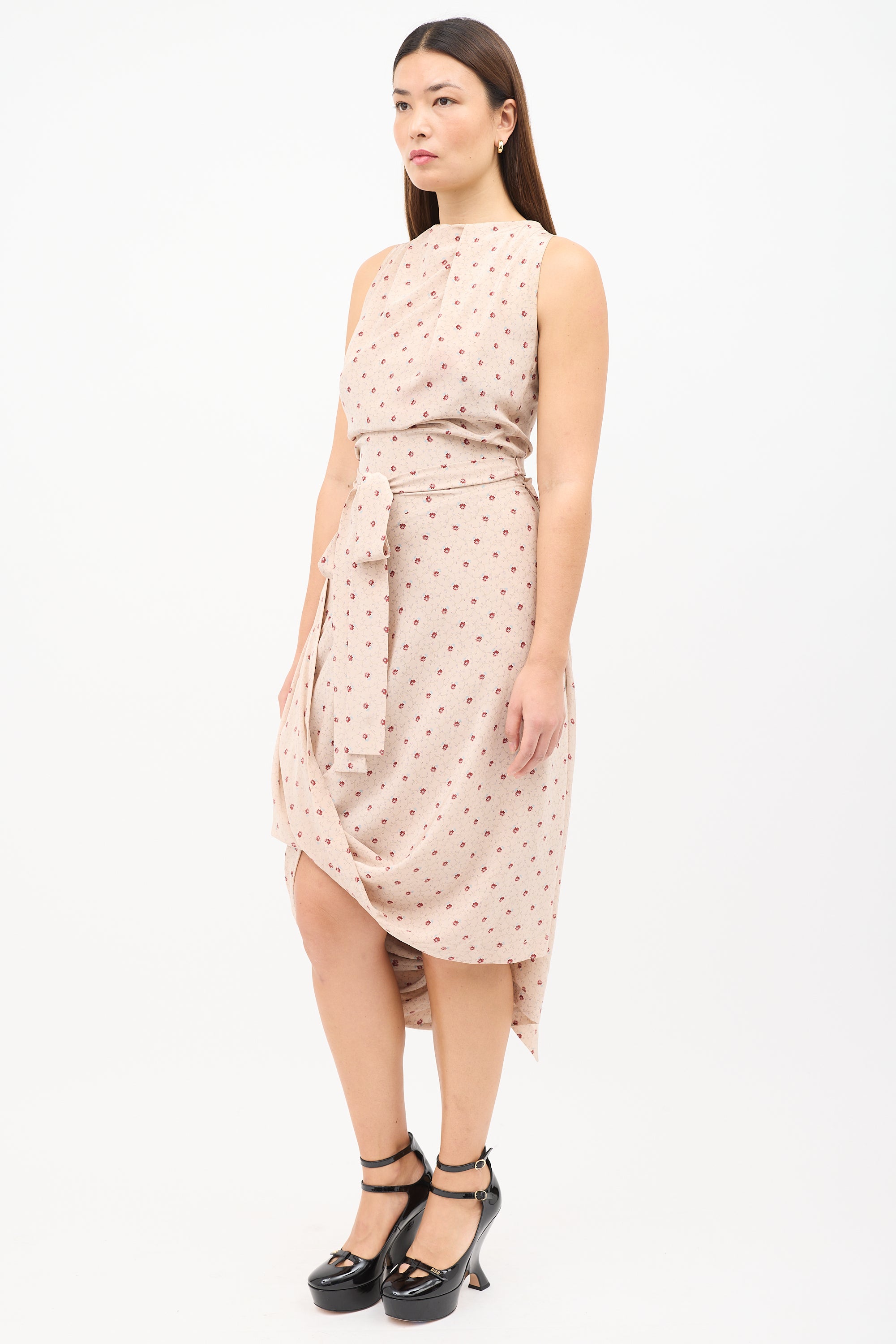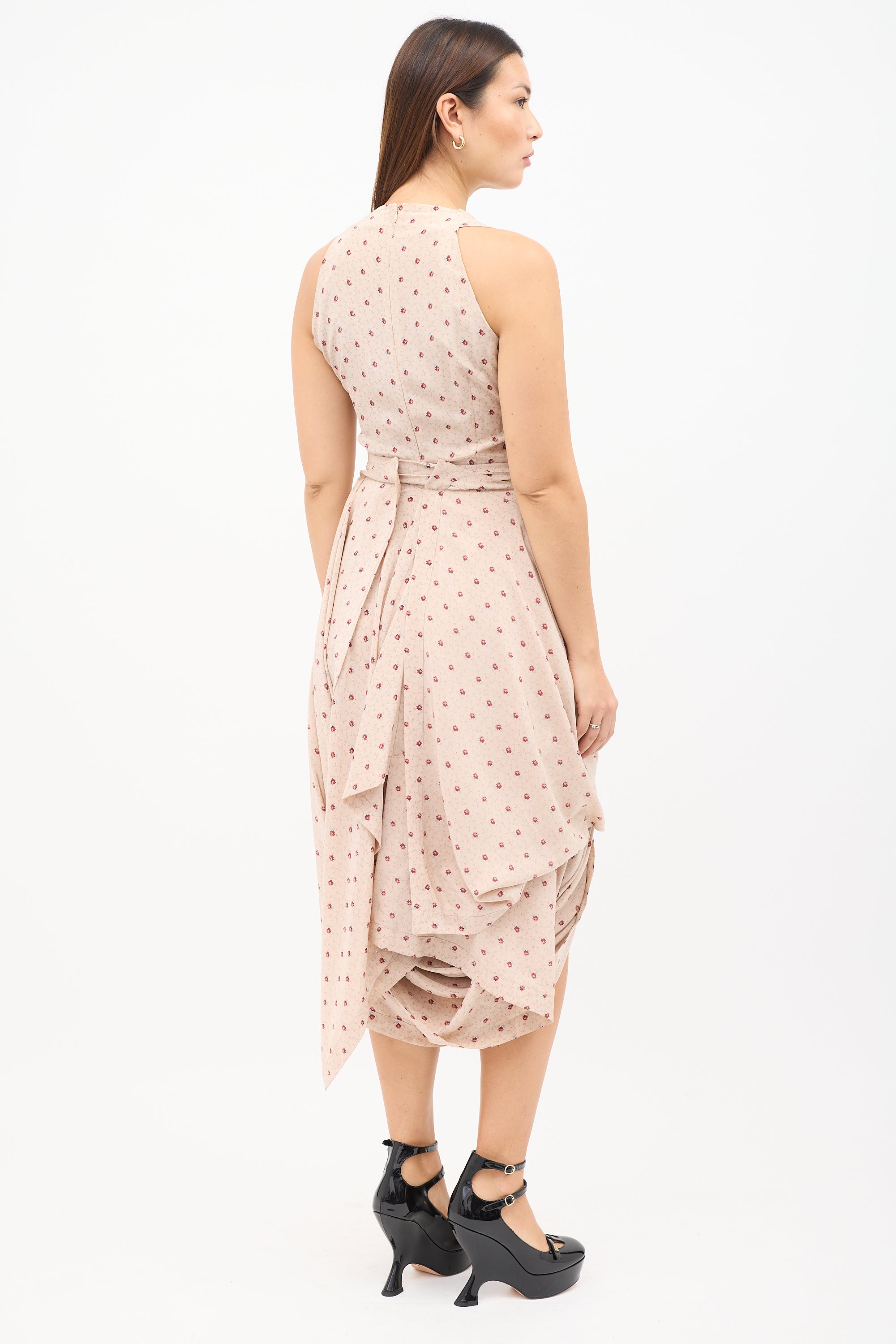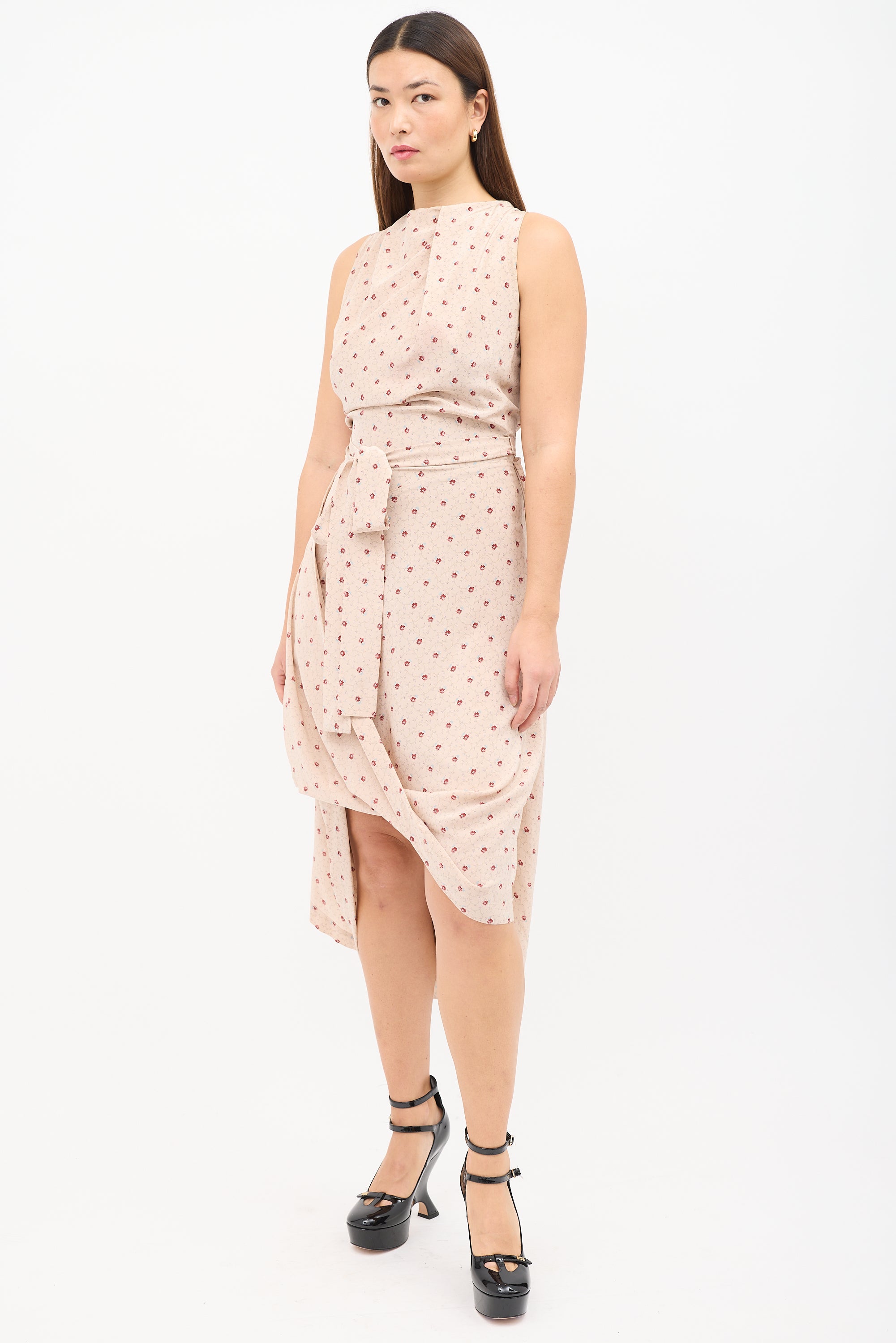 Pre-owned Vivienne Westwood pink and red silk dress featuring round neckline, floral print, asymmetrical ruching throughout, zip closure at back, belt loops, and self tie waist belt. Lined.