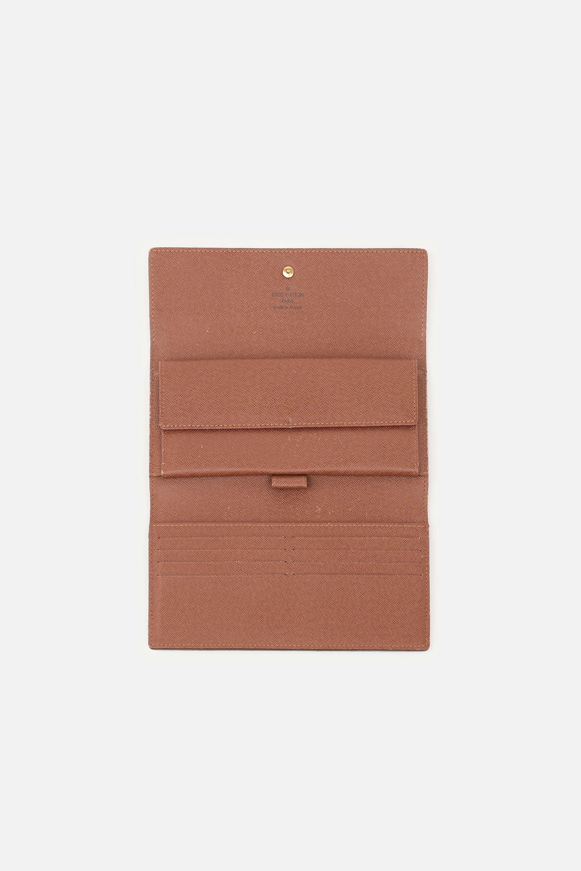 Pre-owned Louis Vuitton 2006 brown Porte Tresor International wallet featuring a signature monogram coated canvas, front flap with snap closure, two slip pockets, two bill slots, eight card slots, and one snap pocket.