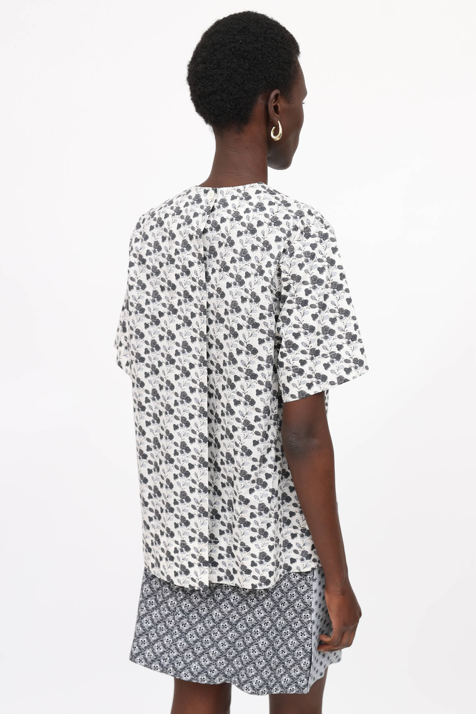 Pre-owned Louis Vuitton grey and white short sleeve top featuring round neckline, pleated chest, and button closure at back.