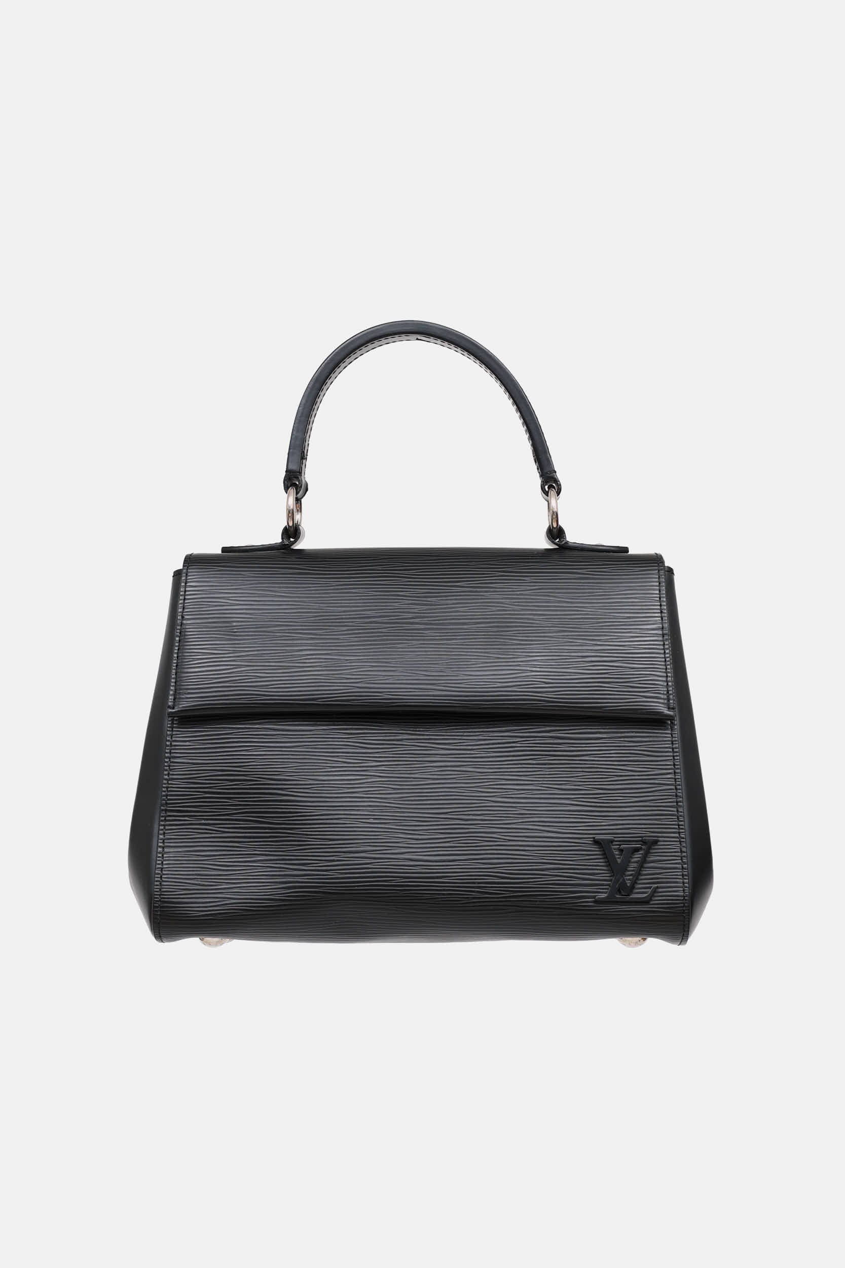 Pre-owned Louis Vuitton black Cluny bag featuring Epi leather, single leather top handle, silver tone hardware, four metal feet, tonal logo plaque at front, snap buttons at sides, concealed snap button closure and detachable shoulder strap. Suede lined interior featuring one zip compartment and two slip pockets.