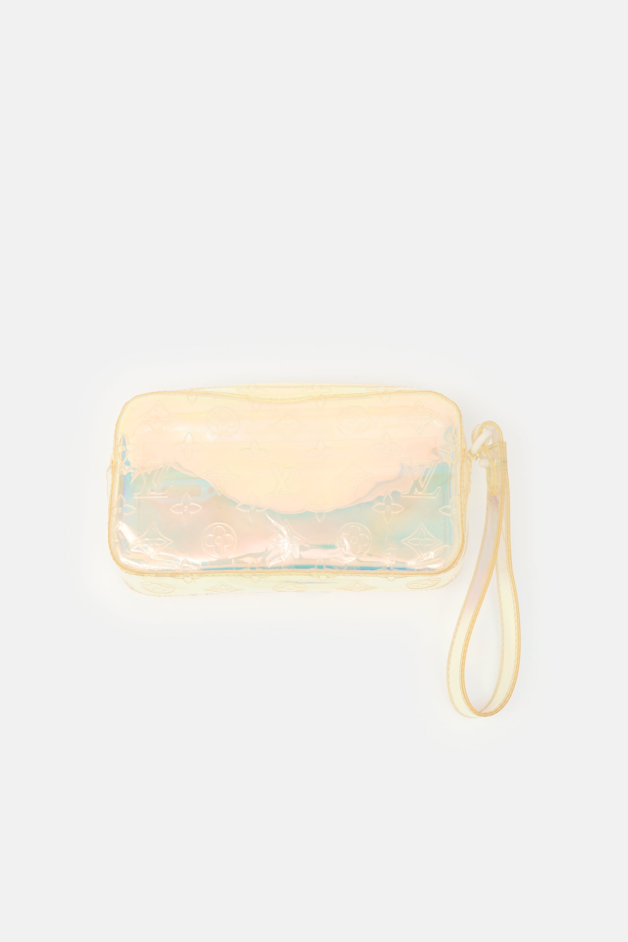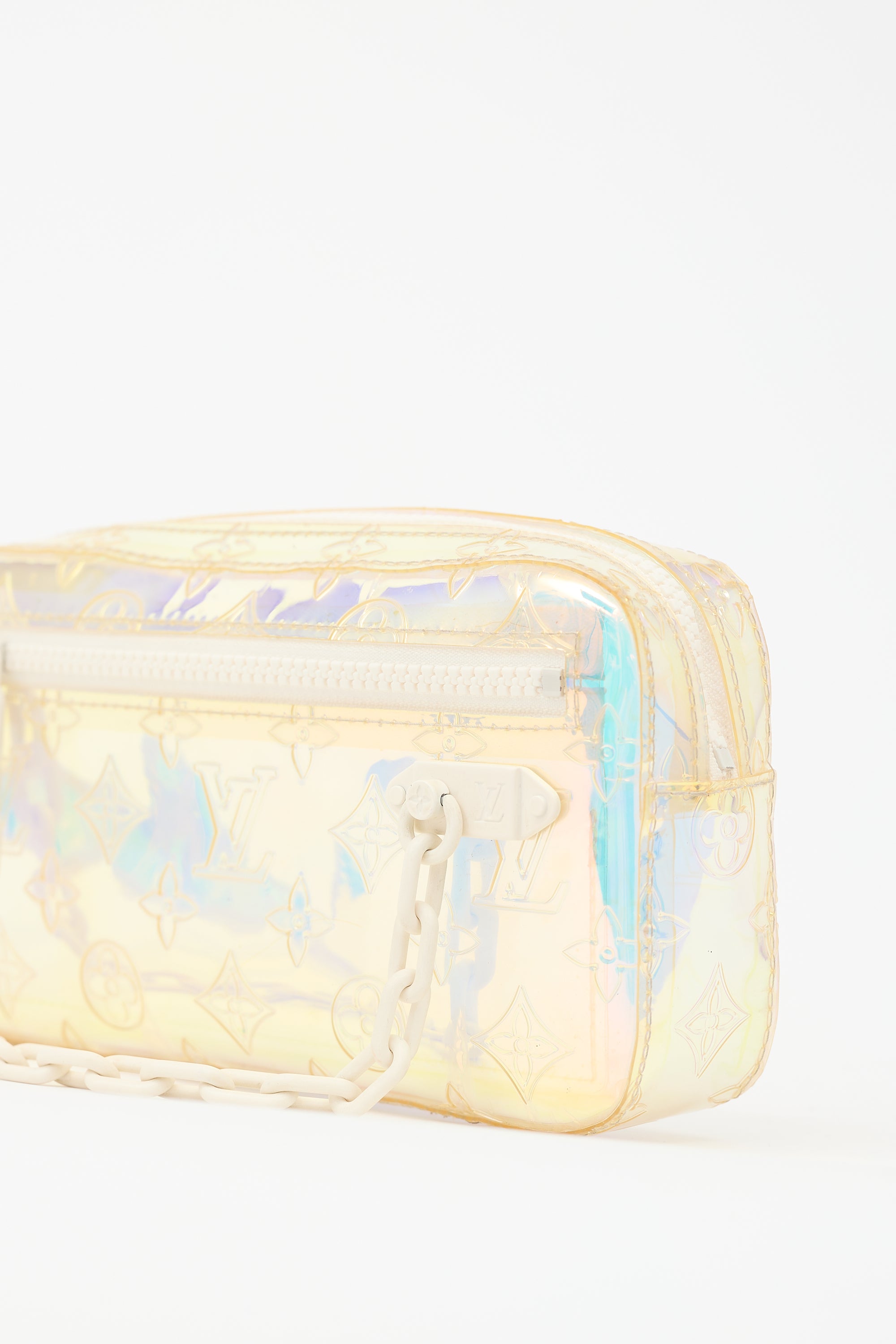 Pre-owned Louis Vuitton Fall/Winter 2019 Volga Prism pochette clutch featuring an iridescent signature monogram debossed vinyl, white hardware, wristlet strap, exterior zip pocket, top zip closure, and one main compartment. Comes with original dust bag. Virgil Abloh era design.