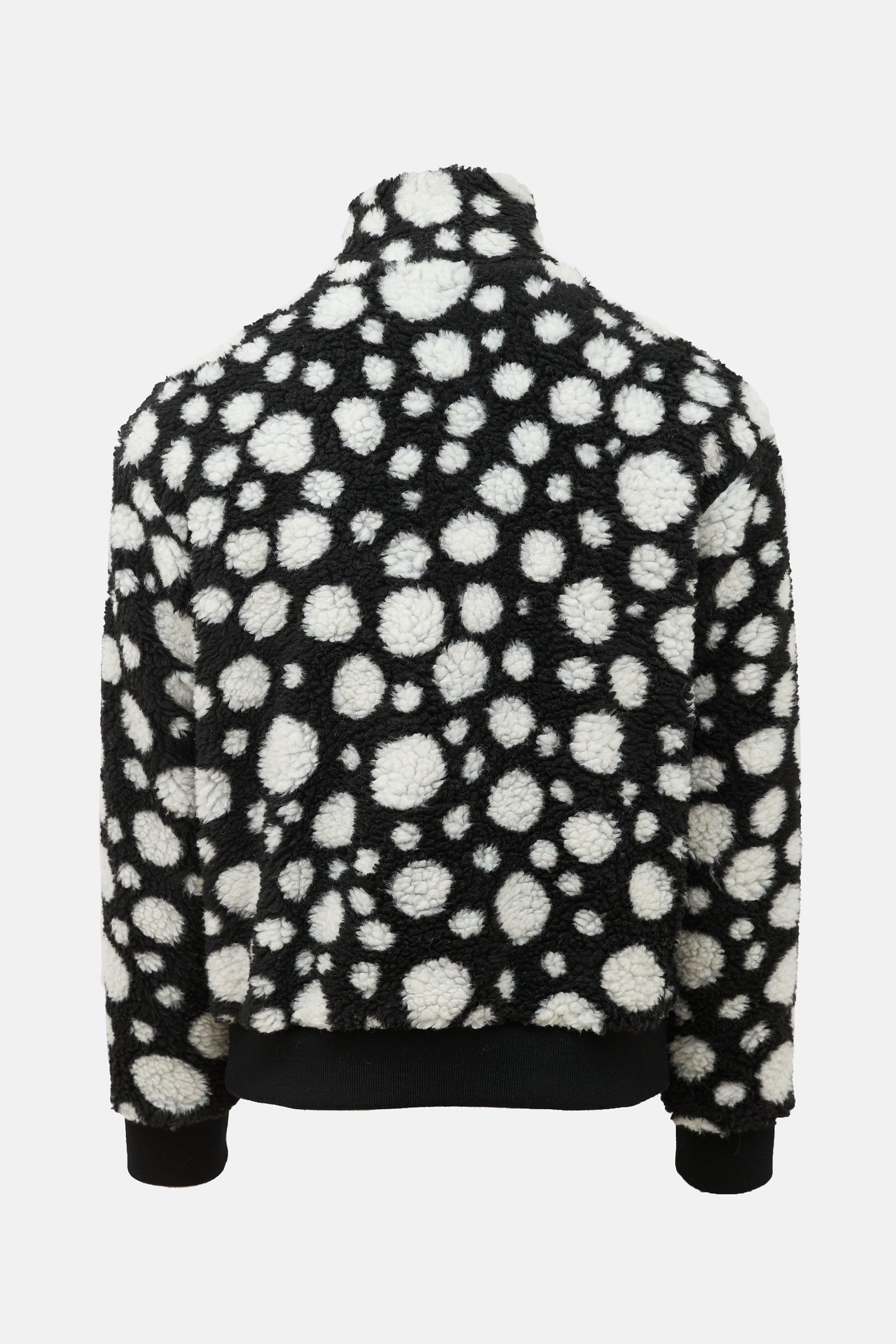 Pre-owned Louis Vuitton x Yayoi Kusama fleece jacket featuring a black and white Infinity Dots pattern, stand collar, front zip, in seam pockets, and black logo hardware at front hem.