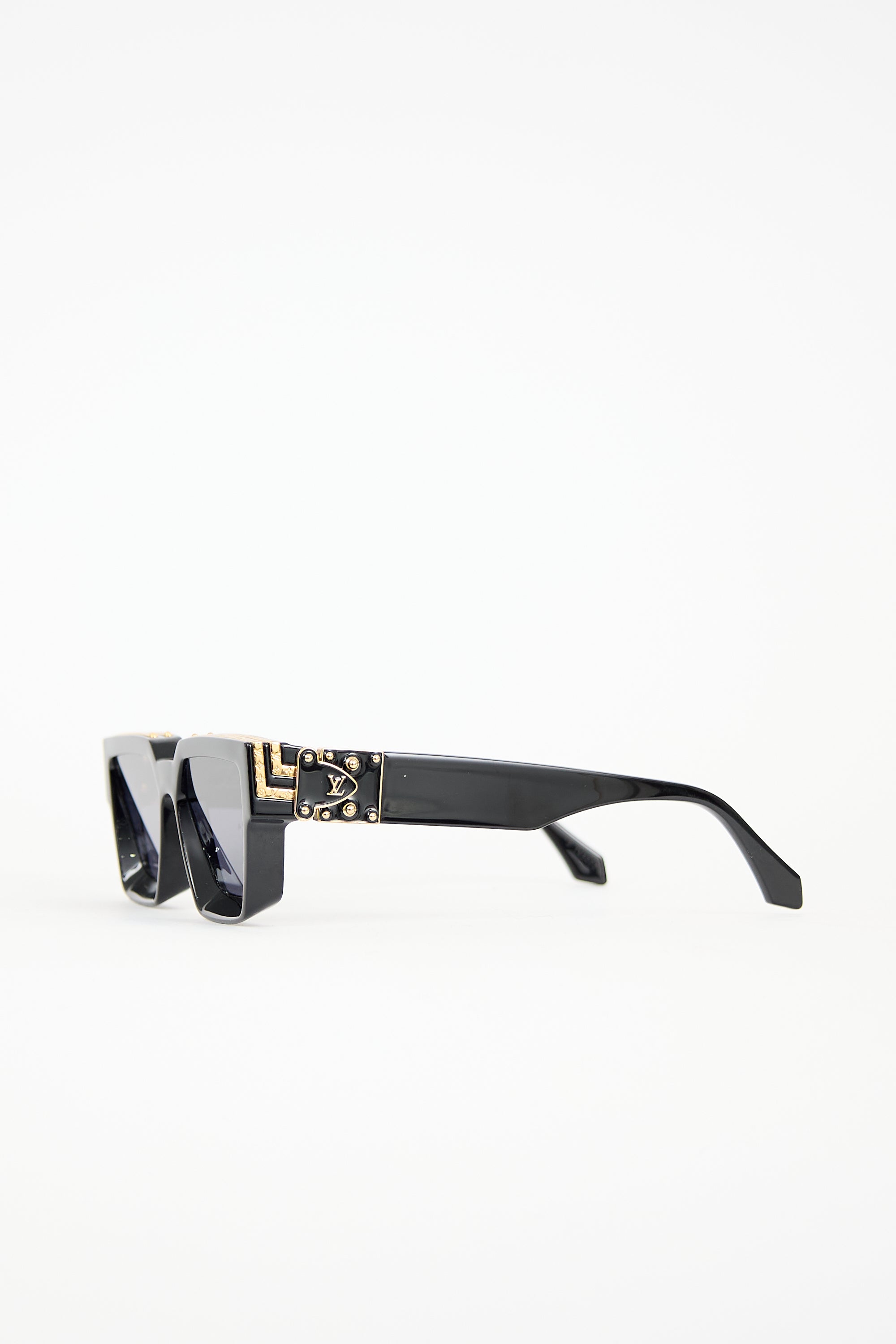 Pre-owned Louis Vuitton Z1165W sunglasses featuring grey tinted lenses, black acetate square frame, striped topline, and black enamel and gold tone logo hardware accent at temples. Comes with original case and dust bag.