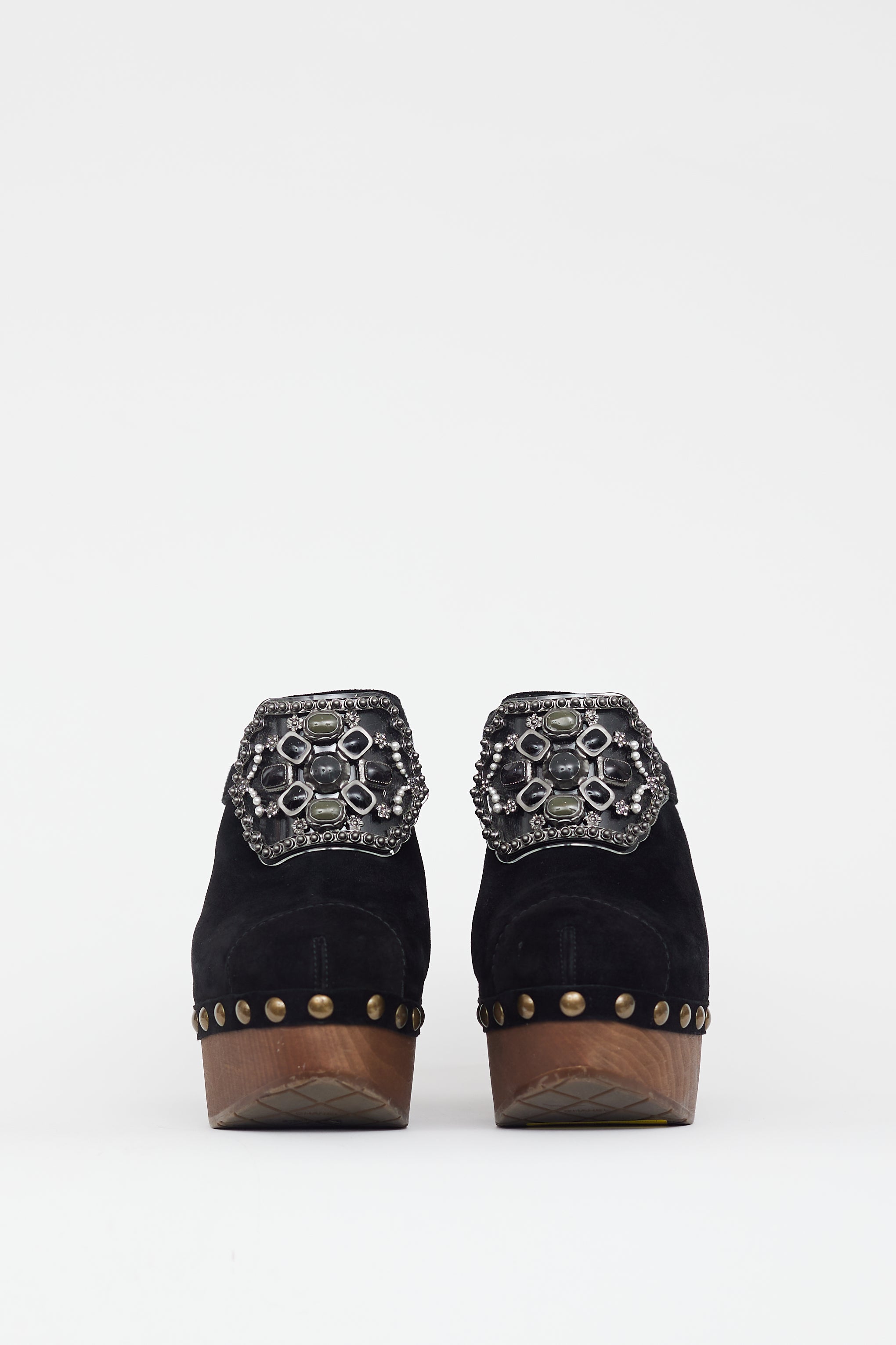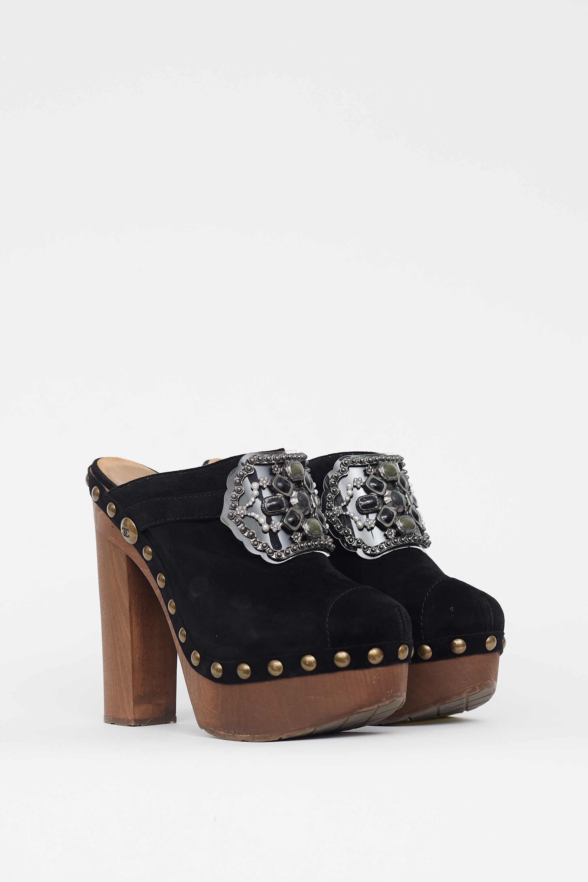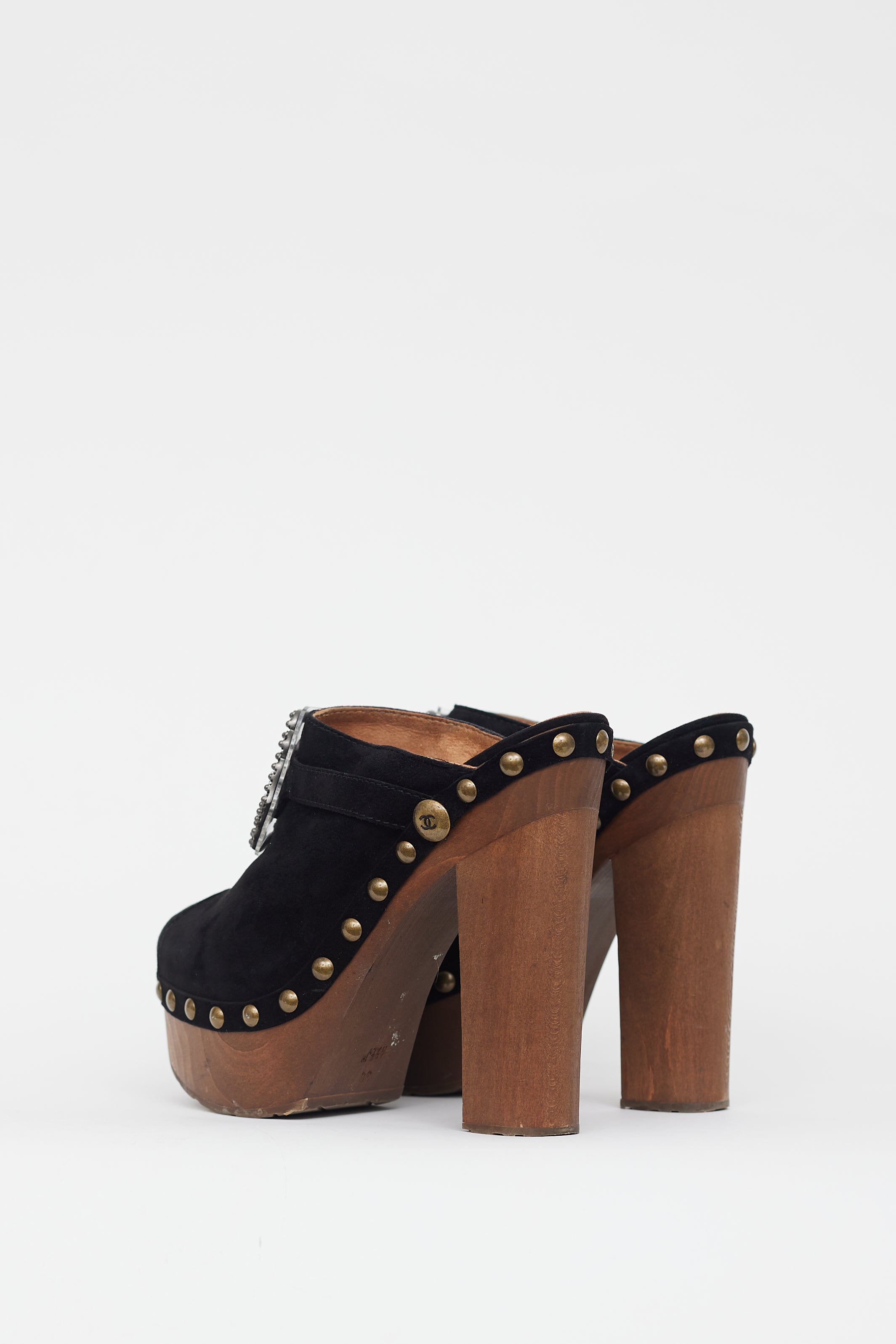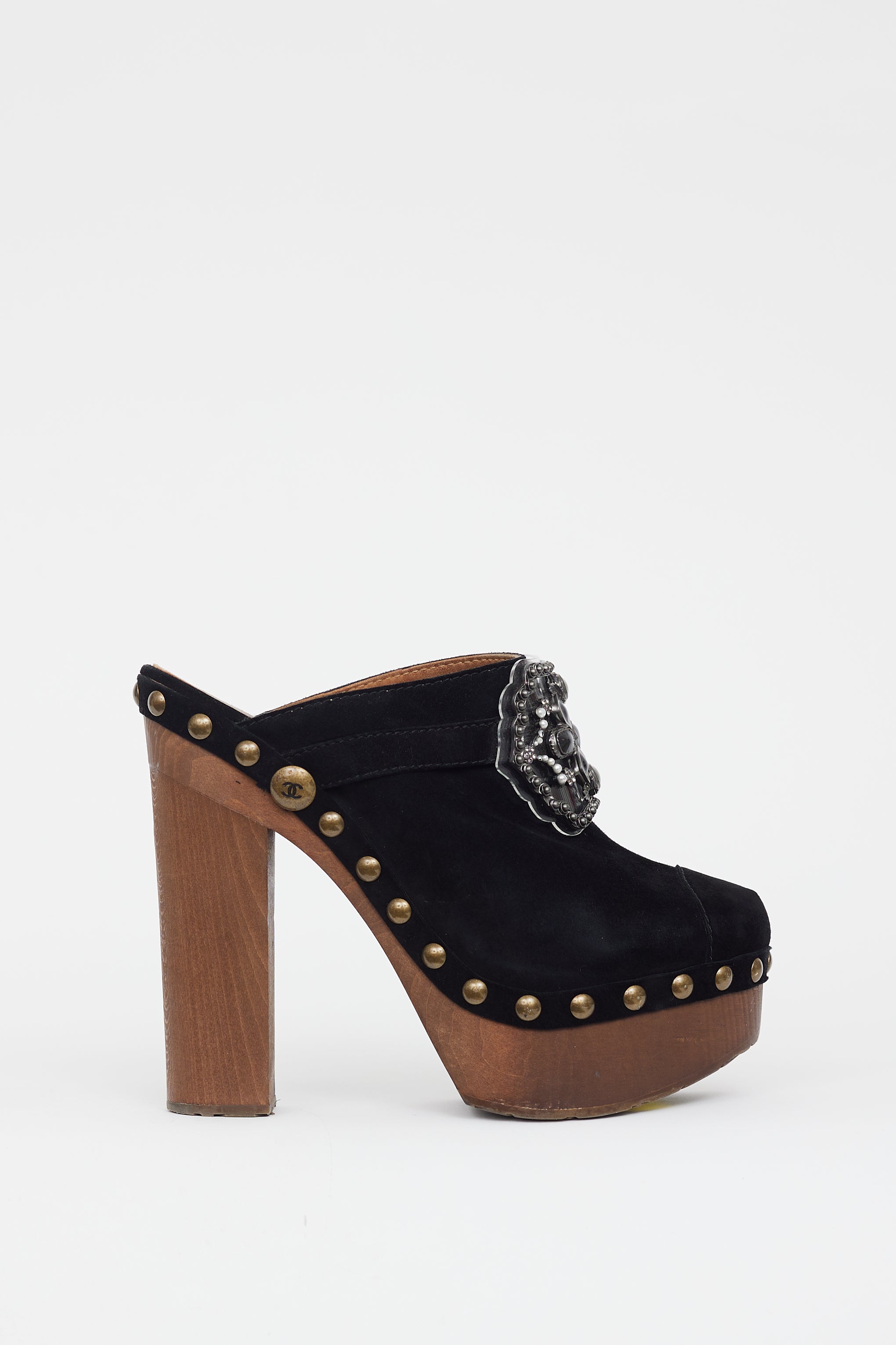 Pre-owned Chanel black suede clogs featuring a round toe, platform midsole, jewel embellished detail at upper, brown wooden block heel, studded detailing, and slip on entry. Comes with original box.