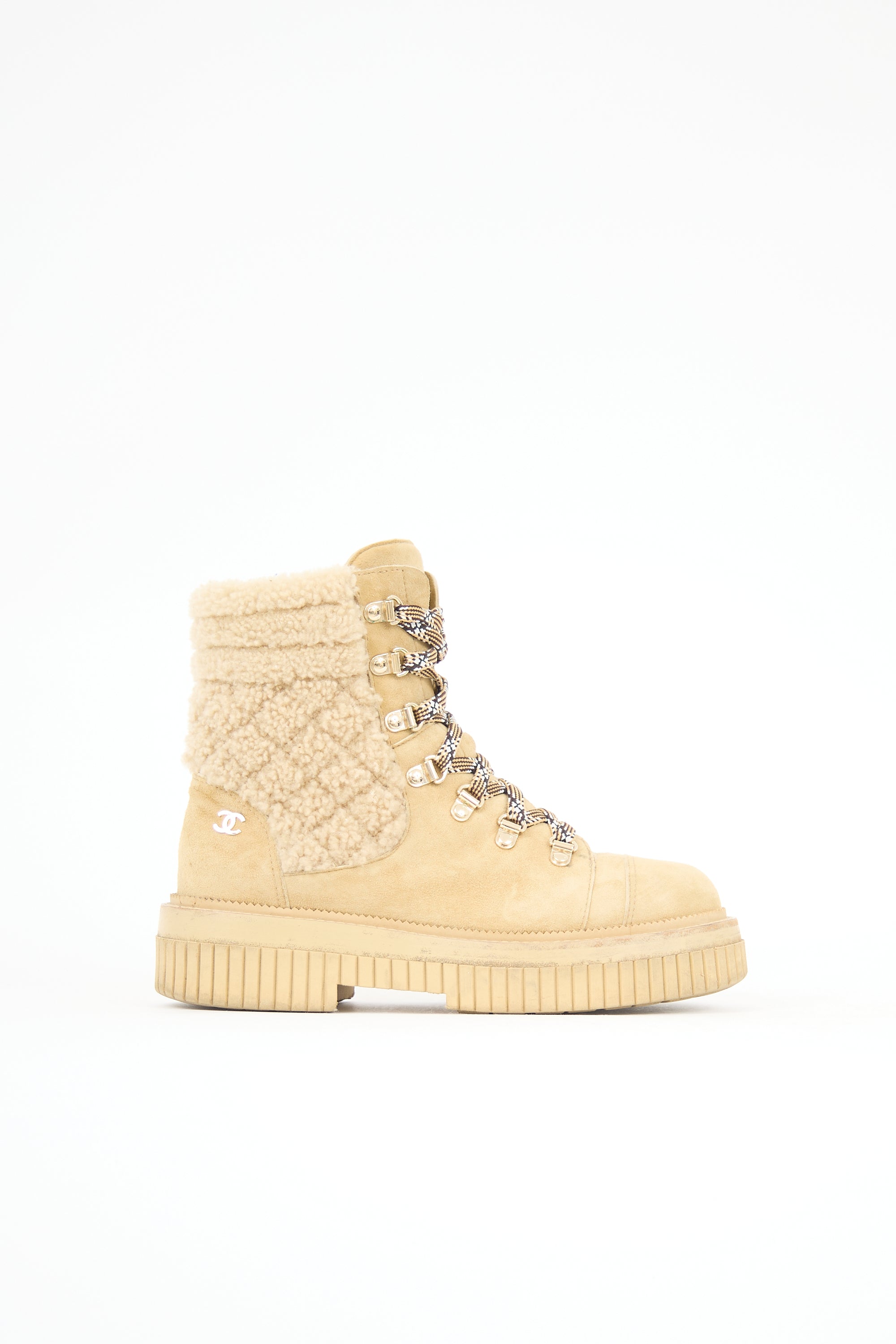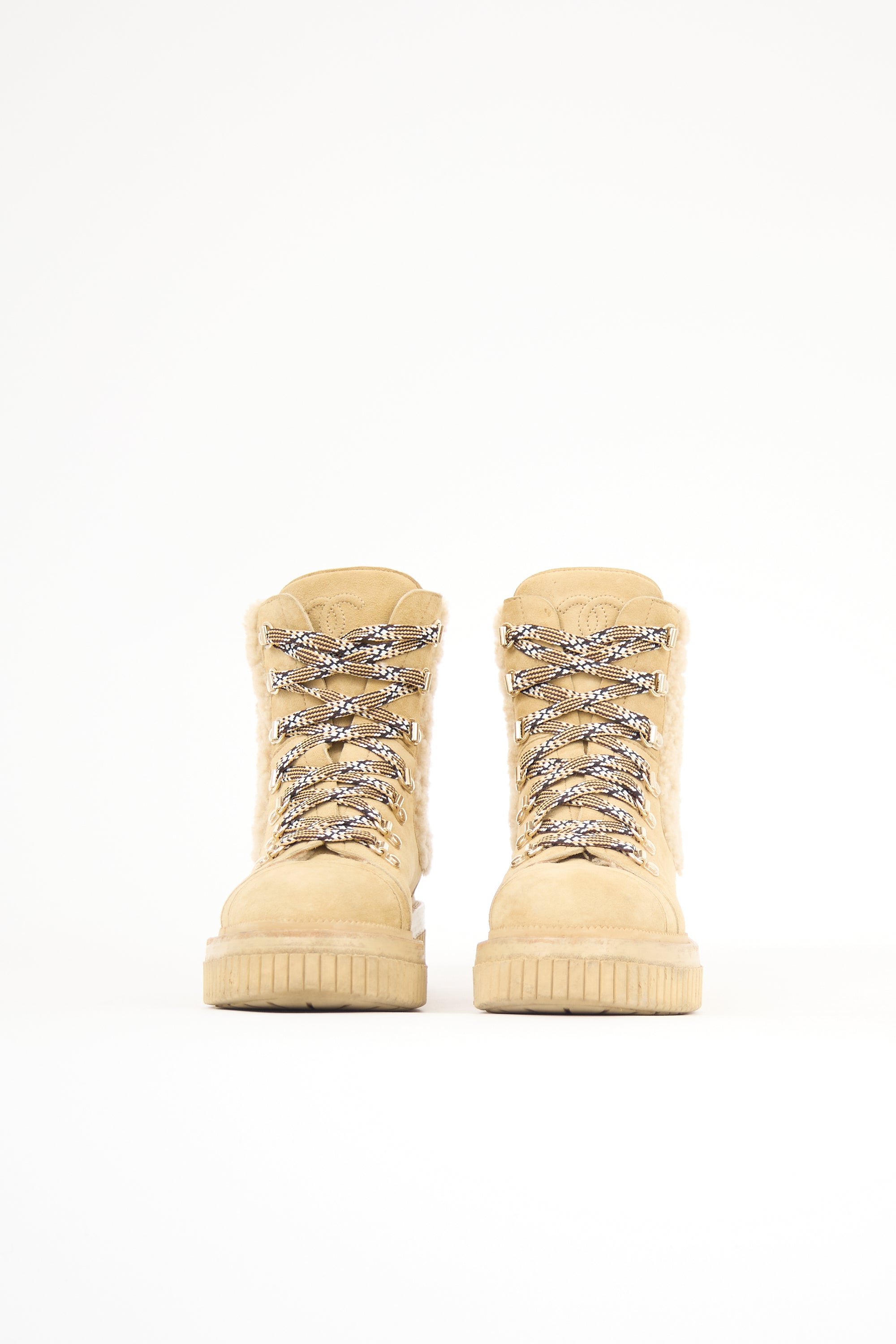 Pre-owned Chanel beige suede combat boots featuring a rounded toe, lace up front, quilted shearling sides, stitched CC logo at tongue, gold tone CC logo at side, and textured rubber sole. Comes with original box.