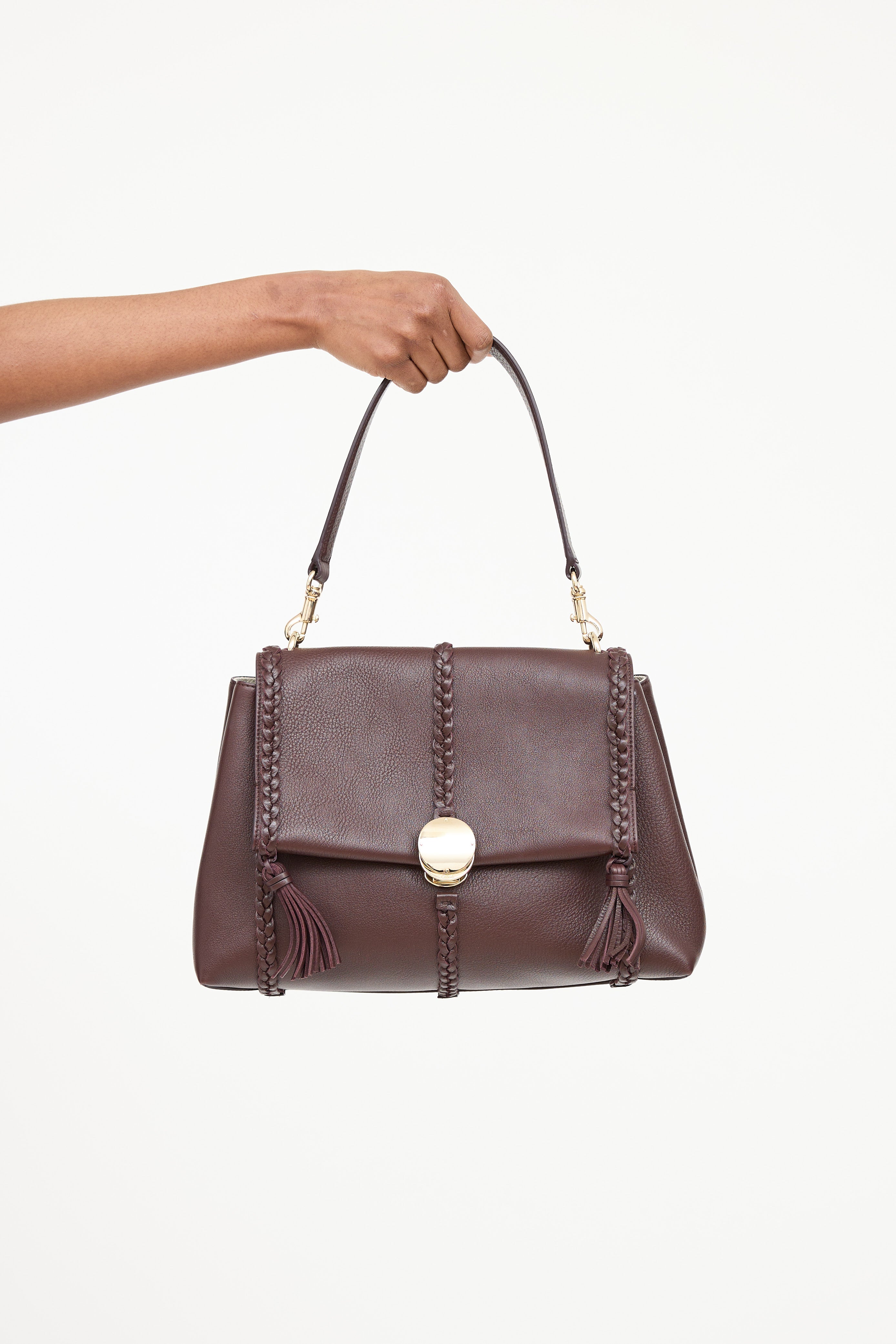 Pre-owned Chloé burgundy Penelope soft shoulder bag featuring removeable single flat top handle, silver tone hardware, pebbled leather, braided trim, top flap with tassels and logo push button pendant closure on top flap. Canvas lined main compartment, single zip pocket, and strap underlayer of top flap.