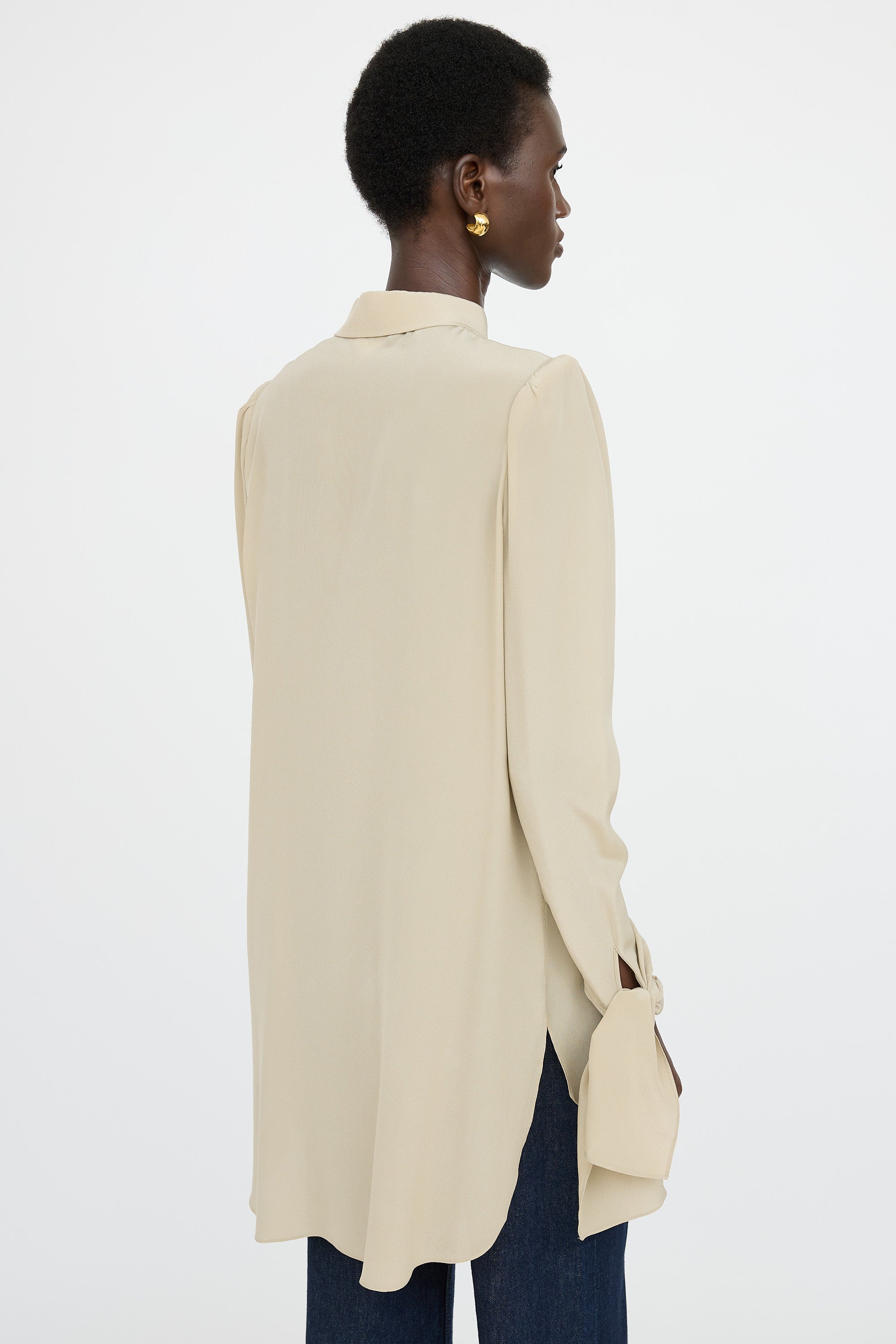 Pre-owned Chloé beige silk long sleeve shirt featuring round collar, concealed button front, shoulder pads, draped tie bell sleeves, and high low hemline with side slits.
