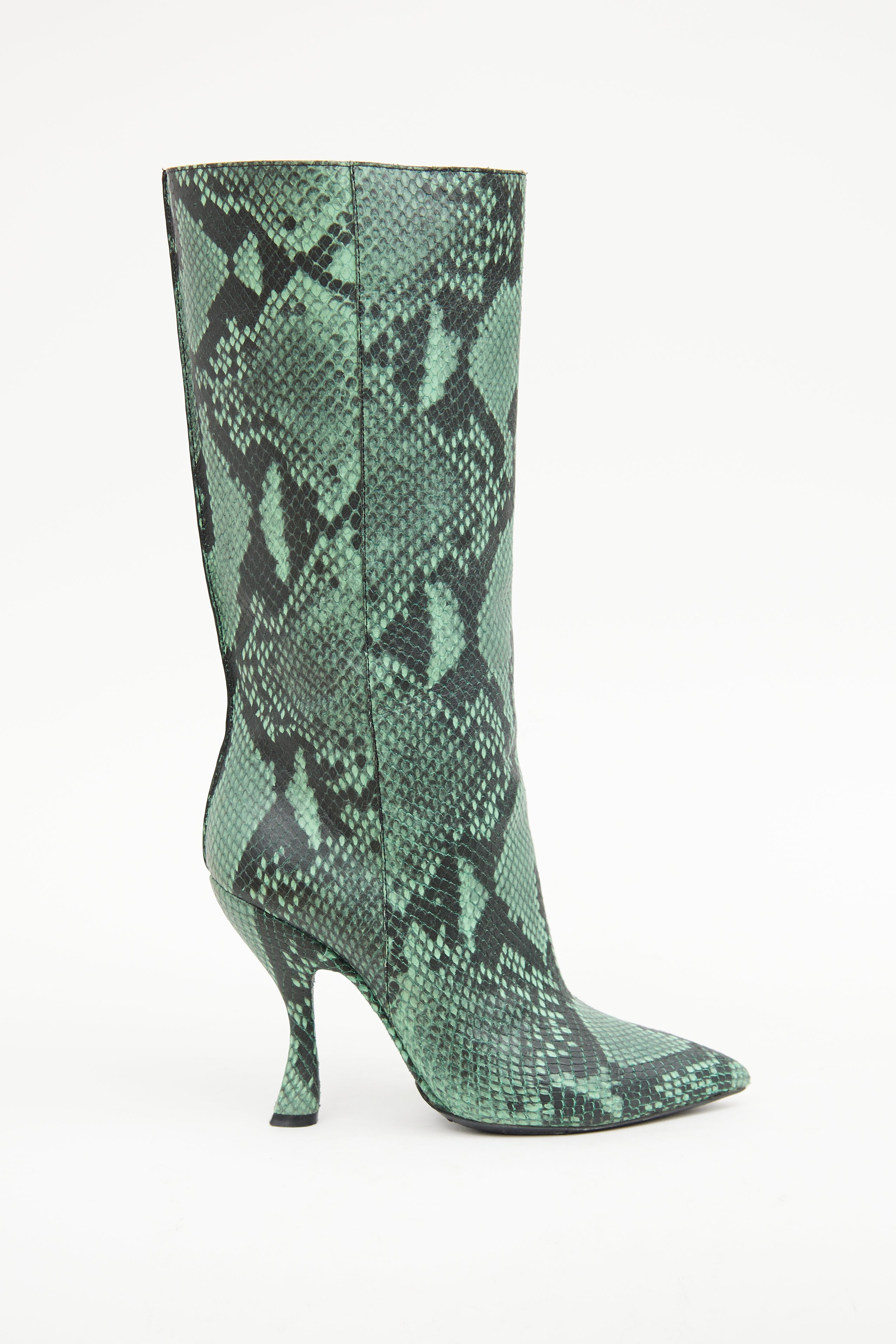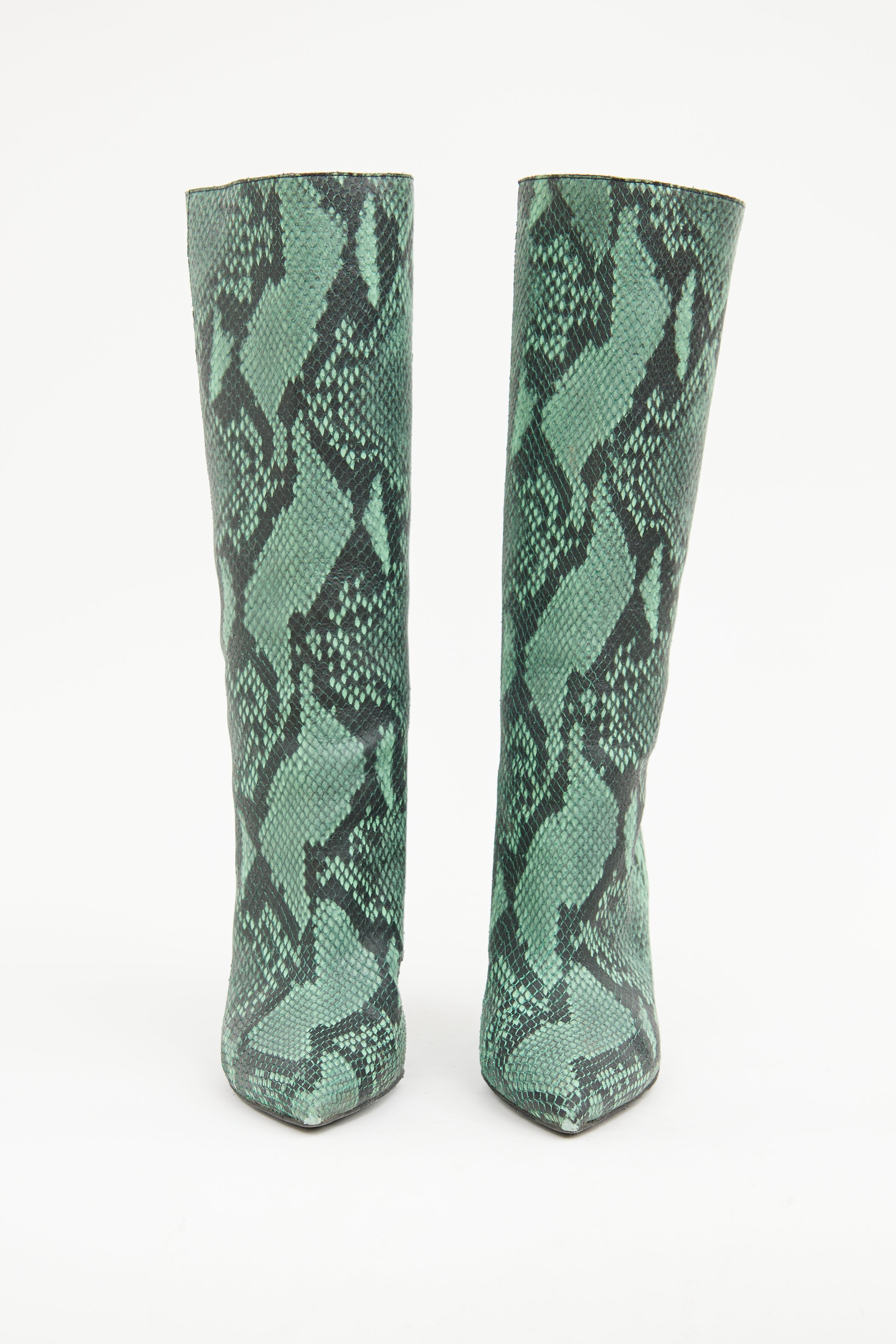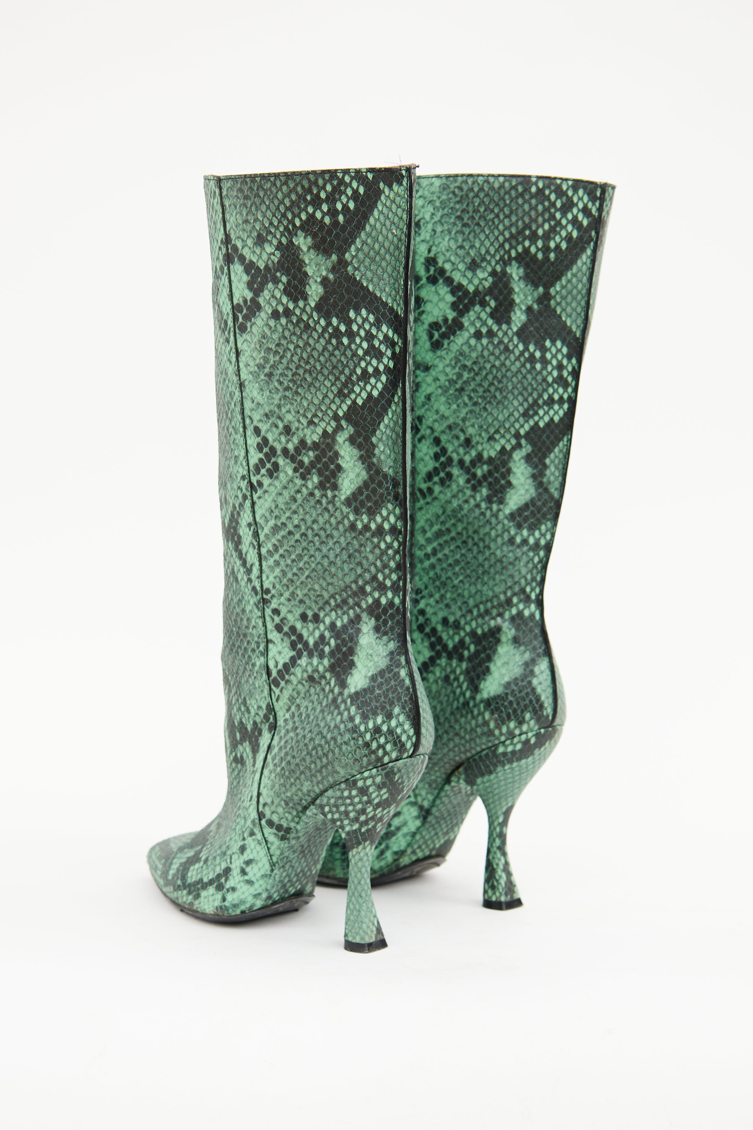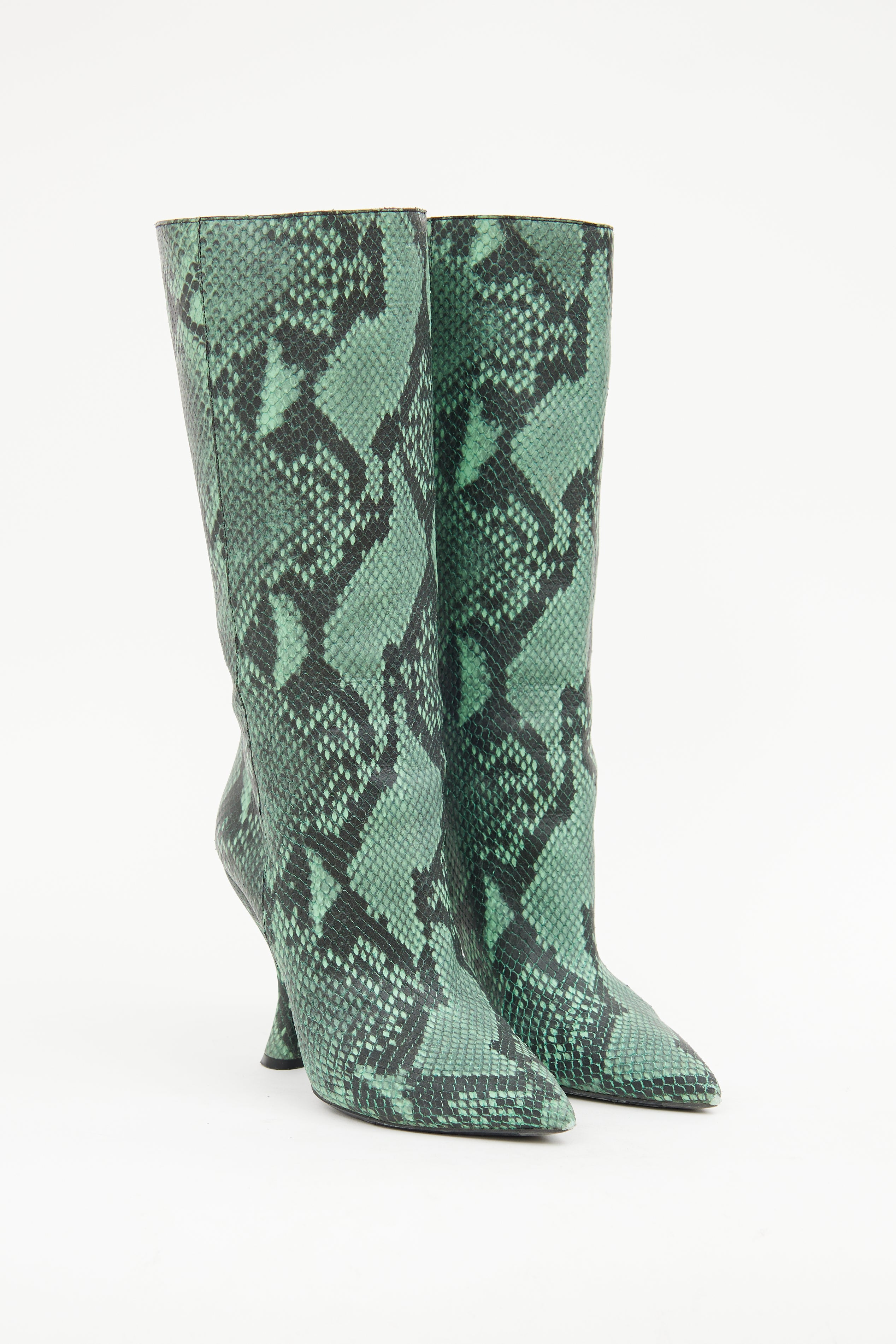 Pre-owned Dries Van Noten green embossed snake print knee high boots featuring pointed toe, pull on styling and covered geometric heel.