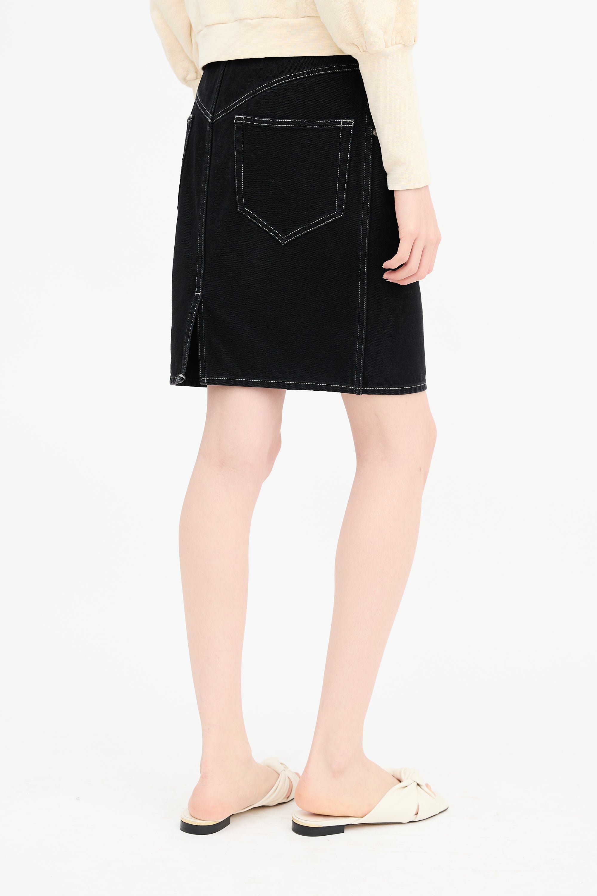 Pre-owned Isabel Marant black denim Lorine skirt featuring high waist, zip fly, four pocket styling, and back vent.